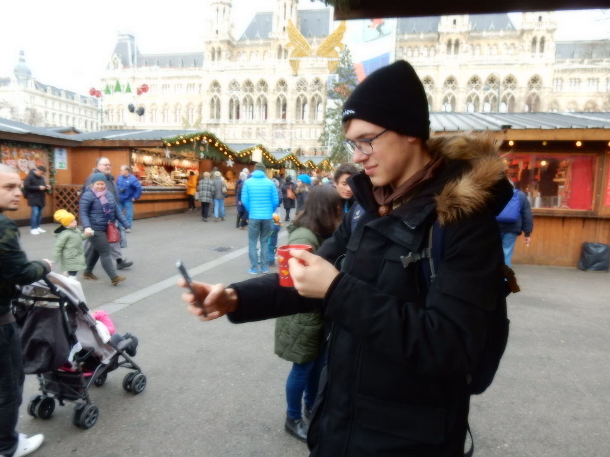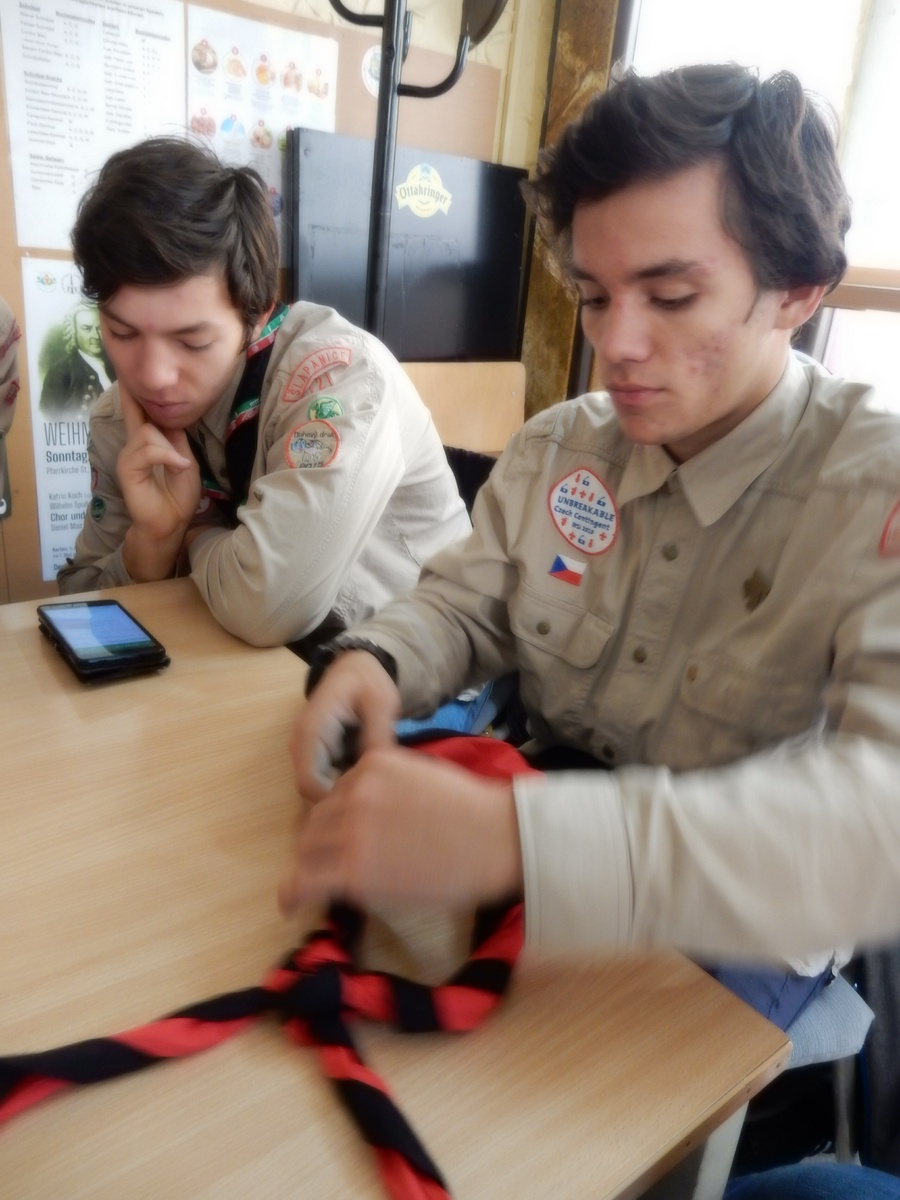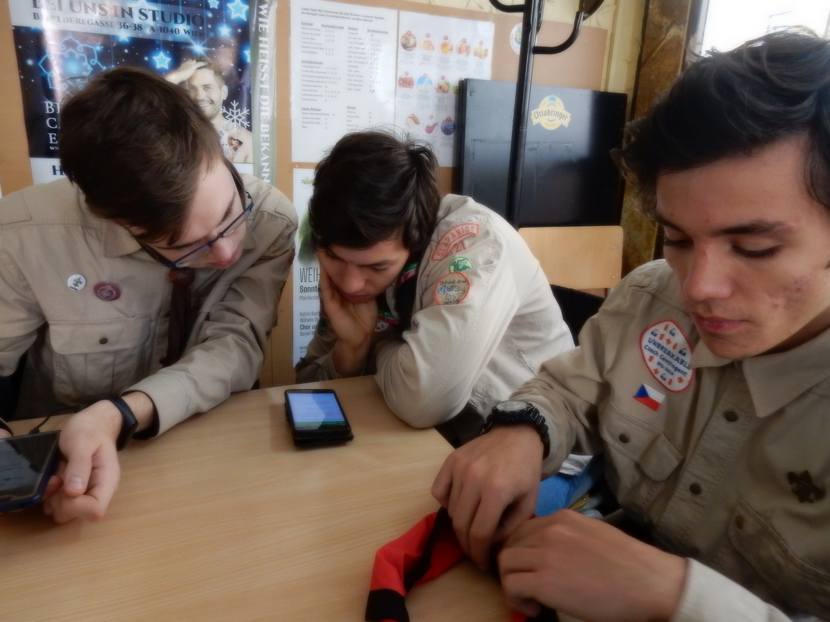 Chřipky řádí, taky nás jelo jen 22 místo původně přihlášených 28. Většina účastníků nocovala na Boudě, kde nás autobus ráno kolem 7:00 nabral. Někdy kolem půl desáté nás vyložil u kostela na Kinzerplatz. Čas od mše využily družinky každá po svém - někdo brázdil vánoční trhy, jiný zase památky, někdo se ve šnyclárně cpal řízkama (že jo Draci:-)... Ve 13:30 jsem se setkali před kostelem, kde už byly veliké davy skautů ze všech koutů Evropy. Než započala mše, stihli jsme dvě bojovky. První by se mohla jmenovat "Směň žlutý/hnědý šátek co máš za jakýkoliv jiný". V té obzvláště excelovala Lvíče z Veverek i když ani ostatní se nedali zahanbit. Druhá by mohla nést název "Dostaň do střeženého prostoru (kostela) 22 lidí na 10 pásků" (víc jsme jich nedostali). V té jsme vyhráli všichni. Po mši jsme zapálili lampičku a po krátkých zmatcích s autobusem se i s Betlémským světýlkem dopravili zpět na Boudu. Tam světýlko svítí a bude svítit až do štědrého dne, takže kdo máte zájem, klidně se zastavte... Jura
