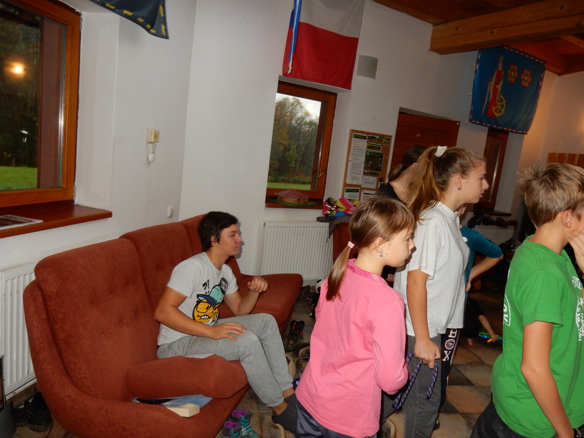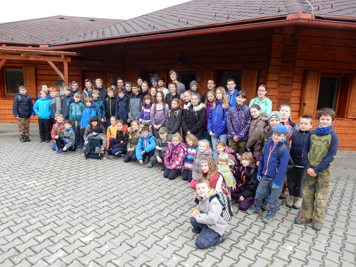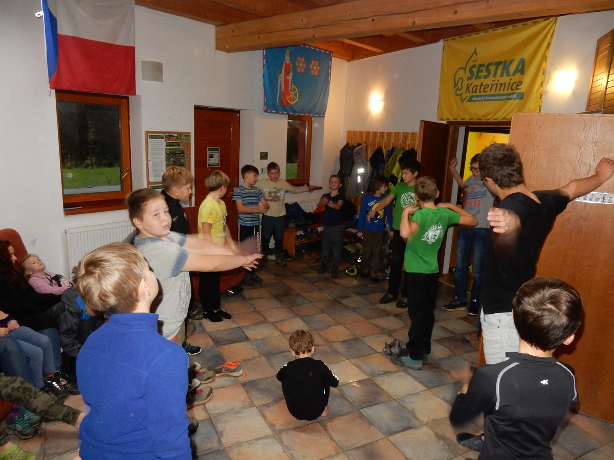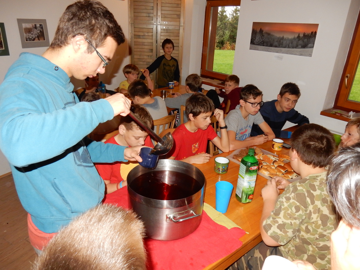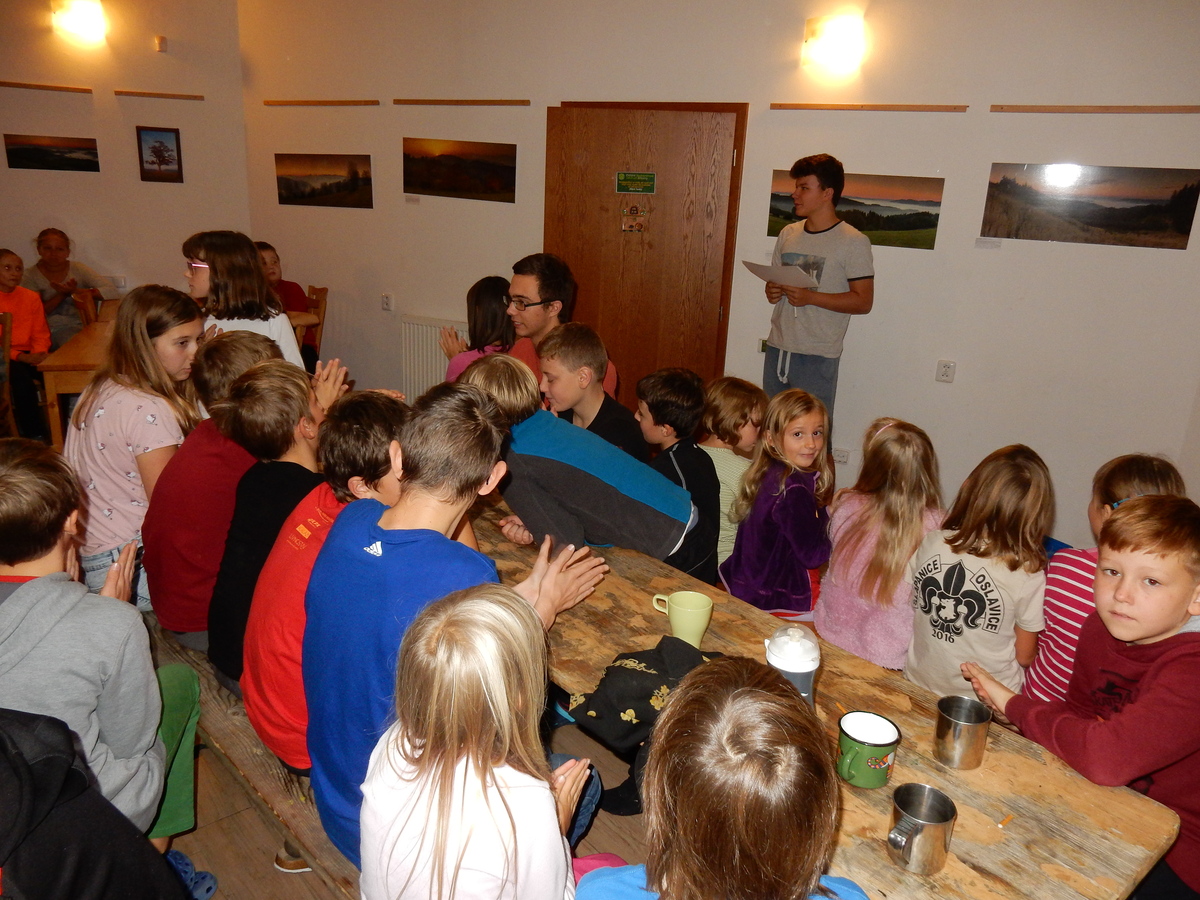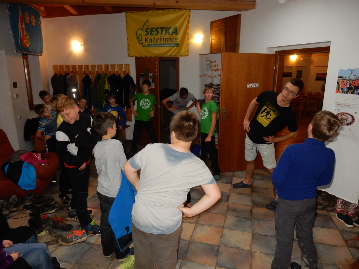 Je čtvrtek 26.10., 8:30 ráno. Zatímco dospělí míří za svými pracovními povinnostmi, školákům začíná první den podzimních prázdnin. A druhooddíláci se začínají pomalu ale jistě scházet na základně. Něco po tři čtvrtě na 9 přijíždí autobus, v tu chvíli už je na Boudě docela živo. Straší skauti skládají batohy do zavazadlového prostoru, Renča odškrtává seznam účastníků. 56 fajfek v seznamu, poslední zamávání rodičům a můžeme vyrazit směr Hostýnské vrchy. Sluníčko svítí a na palubě autobusu je (i díky "osvědčenému" řidiči Michalovi) skvělá atmosféra. V Kroměříži máme zastávku. Zatímco autobus parkuje kdesi na předměstí, my jdeme přímo do centra na historické náměstí. Petr účastníky dělí do 6 skupin po 8, každá skupina obdrží list s 8 úkoly a můžou vyrazit. Cílem zjišťovací soutěže je navštívit ta nejhezčí místa, která Kroměříž nabízí a zde něco zjistit. Je na to 45 minut a zvládají to všichni. Následuje hodinový rozchod. Cukrárna, zrcadlové bludiště, ZOOkoutek v zámecké zahradě, muzeum čokolády...to je jen několik málo z mnoha cílů, kam zvídaví členové oddílu míří. Dál pokračujeme cestou autobusem. Jedeme do Kateřinic, což je vesnice kousek od Vsetína. Nejhorší je úsek mezi Bystřicí a Hošťálkovou, kde je spousta semaforů... Na základně se všichni nejprve ubytují. Veverky v klubovně v levé části stavby, Draci s Pumami v levé zadní místnosti, Vlci s Tygry v pravé zadní místnosti, Kudlanky, Kobry a Sršni v podkroví. Následuje klasika jako vybírání účastnických poplatků, společného jídla... A protože je venku hezky, další etapa celovýpravové hry na sebe nedá dlouho čekat. Hraje se za slunečného počasí a její téma je pašování (co jiného také můžou ZBOJNÍCI dělat :-). Na večeři máme polévku s chlebem a před spaním se ještě hraje několik kol hry NA SARDELE. Kdo tu hru nezná, ten má těžkou mezeru ve vzdělání :-). V průběhu hry přijíždí autem čtveřice dalších vedoucích, kterým povinnosti neumožnily jet s námi už ráno autobusem: Brácha, Babů, Kanec a Kačka. No a kolem desáté se páše hygiena a uléhá k spánku. Někteří mladší mají trošku problém pochopit, co se skrývá pod pojmem "noční klid", hrozba noční hlídky venku ve tmě je však nakonec silnější než touha mluvit. A tak později již velkou místností zní jen tichý zpěv vedoucích a ještě později jen slastné oddechování spících skautíků a skautic. Páteční ráno začíná rozcvičkou. Petr s Kancem to berou poctivě i když se jim nad hlavou houfují temné černé mraky. Babů s Veverkami zatím chystají společnou snídaní. Po ní šestníci fasují pro svoje družiny jídlo na cestu, balíme se a připravujeme k odchodu směr Pržno a rozhledna u Holáňů. Pohled z okna nám ale plány poněkud hatí - začíná pršet a v momentě leje jako z konve. No a následný pohled na displej chytrého telefonu není o nic optimističtější než pohled z okna. Má pršet celý den. Tak se zase pěkně vybalujeme a Kloub rozjíždí další etapu celovýpravovky. Skupiny zbojníků v ní se zavázanýma očima hledají v místnosti rozmístěné předměty a skládají je do batůžku. Je zajímavé sledovat, jak o úspěchu rozhoduje nejen náhoda, ale mnohdy spíše schopnost fungovat jako tým a navzájem spolu komunikovat. V kuchyni zatím Kiki s Hihňou připravují oběd (který mel být původně večeří po návratu) a to těstoviny s omáčkou a sýrem. Po jídle se počasí malinko lepší, mraky se rozestupují a dokonce vykoukne i sluníčko. Vyrážíme tedy alespoň na necelé dva kilometry vzdálenou rozhlednu U Holáňů. Cesta vede do pěkného kopce, rozhledna je pak součástí přilehlé hospůdky, kde vládne vlídný a pohodový personál. Mrňousci se posilují sladkostmi, vedoucí jakbysmet. A rozhled je odtud opravdu skvělý. Na zpáteční cestě hrajeme na louce u lesa další etapu. I zbojnické děti musí umět počítat, podstatou hry je štafetové hledání lístků s čísly podle určitých pravidel. I zde hraje roli spolupráce, rychlá reakce a dobrá paměť. Která skupina zvítězila si už moc nepamatuju, ale co si pamatuju dobře je skutečnost, že mnohdy mladší vlčata i světlušky uspěli proti starším skautům či skautkám. Než se vrátíme zpět na základnu, začíná opět pršet. Náladu nám zlepšuje několik tácků s chleby se salámem a horký čaj. A po večeři rozjíždí Petr, Babů a Kiki další etapu AKTIVITY. Před spaním stíháme ještě jedno kolo oblíbených SARDELÍ, po hygieně a následné večerce se zpívá a radí. Sobotní ráno začíná tradičně rozcvičkou, tentokráte v režii Klouba a Kosti. Na snídani jsou buchty všeho druhu s čajem. Šestníci doplňují u Cyrila zásoby na cestu, společné foto před odchodem a může se jít. Dnes nás Pržno nemine! Cestou pozorujeme krásné barvy podzimu a taky nespočet druhů hub v lese. A někteří digitální maniaci pozorují displej svého mobilu. První (a poslední) výprava, kdy jsme vsadili na přirozenou inteligenci členů oddílu a nezakázali mobily. Výsledek? Špatná sázka. Většina je v pohodě, ale najdou se vyslovení závisláci. Když si jeden z Tygrů pustí hlasitou skřehotavou hudbu v lese, vybavím si vtipy a povídky z poloviny minulého století. Tehdy si "mastňáci" nosili do lesa pro změnu tranzistorová rádia k veliké nelibosti normálních lidí. Jak se nám ta historie opakuje... Obchůdek v Pržnu je bohužel zavřený, paní vedoucí ctí i bez Bublanova dementního zákona státní svátek. Do vzdálenější Jablůnky, kde obchodují Vietnamci, se nám nechce a tak kroky stáčíme do kopců směr Holáňovi. Cestou na louce se hraje etapa RUKA NOHA, kterou organizuje Kiki. Všichni se p