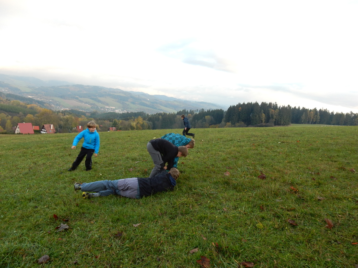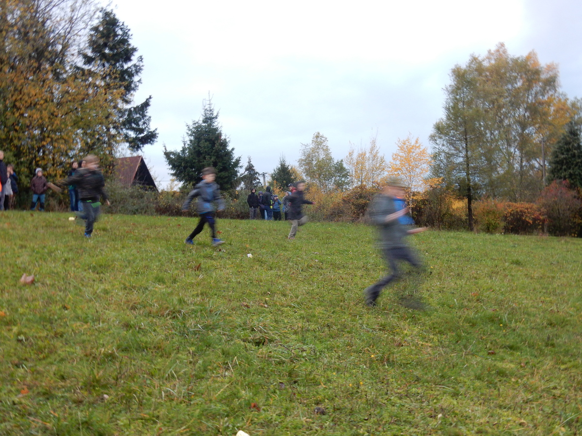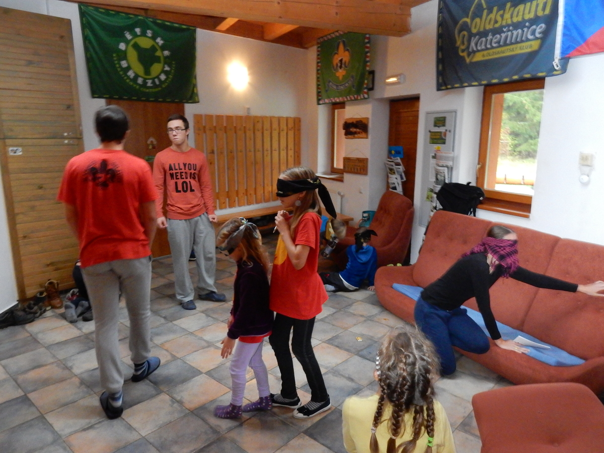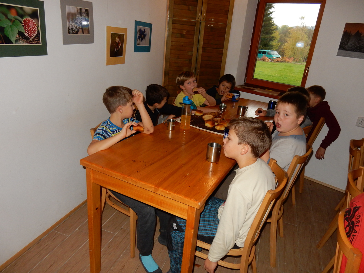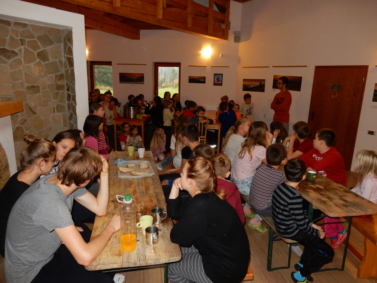 Je čtvrtek 26.10., 8:30 ráno. Zatímco dospělí míří za svými pracovními povinnostmi, školákům začíná první den podzimních prázdnin. A druhooddíláci se začínají pomalu ale jistě scházet na základně. Něco po tři čtvrtě na 9 přijíždí autobus, v tu chvíli už je na Boudě docela živo. Straší skauti skládají batohy do zavazadlového prostoru, Renča odškrtává seznam účastníků. 56 fajfek v seznamu, poslední zamávání rodičům a můžeme vyrazit směr Hostýnské vrchy. Sluníčko svítí a na palubě autobusu je (i díky "osvědčenému" řidiči Michalovi) skvělá atmosféra. V Kroměříži máme zastávku. Zatímco autobus parkuje kdesi na předměstí, my jdeme přímo do centra na historické náměstí. Petr účastníky dělí do 6 skupin po 8, každá skupina obdrží list s 8 úkoly a můžou vyrazit. Cílem zjišťovací soutěže je navštívit ta nejhezčí místa, která Kroměříž nabízí a zde něco zjistit. Je na to 45 minut a zvládají to všichni. Následuje hodinový rozchod. Cukrárna, zrcadlové bludiště, ZOOkoutek v zámecké zahradě, muzeum čokolády...to je jen několik málo z mnoha cílů, kam zvídaví členové oddílu míří. Dál pokračujeme cestou autobusem. Jedeme do Kateřinic, což je vesnice kousek od Vsetína. Nejhorší je úsek mezi Bystřicí a Hošťálkovou, kde je spousta semaforů... Na základně se všichni nejprve ubytují. Veverky v klubovně v levé části stavby, Draci s Pumami v levé zadní místnosti, Vlci s Tygry v pravé zadní místnosti, Kudlanky, Kobry a Sršni v podkroví. Následuje klasika jako vybírání účastnických poplatků, společného jídla... A protože je venku hezky, další etapa celovýpravové hry na sebe nedá dlouho čekat. Hraje se za slunečného počasí a její téma je pašování (co jiného také můžou ZBOJNÍCI dělat :-). Na večeři máme polévku s chlebem a před spaním se ještě hraje několik kol hry NA SARDELE. Kdo tu hru nezná, ten má těžkou mezeru ve vzdělání :-). V průběhu hry přijíždí autem čtveřice dalších vedoucích, kterým povinnosti neumožnily jet s námi už ráno autobusem: Brácha, Babů, Kanec a Kačka. No a kolem desáté se páše hygiena a uléhá k spánku. Někteří mladší mají trošku problém pochopit, co se skrývá pod pojmem "noční klid", hrozba noční hlídky venku ve tmě je však nakonec silnější než touha mluvit. A tak později již velkou místností zní jen tichý zpěv vedoucích a ještě později jen slastné oddechování spících skautíků a skautic. Páteční ráno začíná rozcvičkou. Petr s Kancem to berou poctivě i když se jim nad hlavou houfují temné černé mraky. Babů s Veverkami zatím chystají společnou snídaní. Po ní šestníci fasují pro svoje družiny jídlo na cestu, balíme se a připravujeme k odchodu směr Pržno a rozhledna u Holáňů. Pohled z okna nám ale plány poněkud hatí - začíná pršet a v momentě leje jako z konve. No a následný pohled na displej chytrého telefonu není o nic optimističtější než pohled z okna. Má pršet celý den. Tak se zase pěkně vybalujeme a Kloub rozjíždí další etapu celovýpravovky. Skupiny zbojníků v ní se zavázanýma očima hledají v místnosti rozmístěné předměty a skládají je do batůžku. Je zajímavé sledovat, jak o úspěchu rozhoduje nejen náhoda, ale mnohdy spíše schopnost fungovat jako tým a navzájem spolu komunikovat. V kuchyni zatím Kiki s Hihňou připravují oběd (který mel být původně večeří po návratu) a to těstoviny s omáčkou a sýrem. Po jídle se počasí malinko lepší, mraky se rozestupují a dokonce vykoukne i sluníčko. Vyrážíme tedy alespoň na necelé dva kilometry vzdálenou rozhlednu U Holáňů. Cesta vede do pěkného kopce, rozhledna je pak součástí přilehlé hospůdky, kde vládne vlídný a pohodový personál. Mrňousci se posilují sladkostmi, vedoucí jakbysmet. A rozhled je odtud opravdu skvělý. Na zpáteční cestě hrajeme na louce u lesa další etapu. I zbojnické děti musí umět počítat, podstatou hry je štafetové hledání lístků s čísly podle určitých pravidel. I zde hraje roli spolupráce, rychlá reakce a dobrá paměť. Která skupina zvítězila si už moc nepamatuju, ale co si pamatuju dobře je skutečnost, že mnohdy mladší vlčata i světlušky uspěli proti starším skautům či skautkám. Než se vrátíme zpět na základnu, začíná opět pršet. Náladu nám zlepšuje několik tácků s chleby se salámem a horký čaj. A po večeři rozjíždí Petr, Babů a Kiki další etapu AKTIVITY. Před spaním stíháme ještě jedno kolo oblíbených SARDELÍ, po hygieně a následné večerce se zpívá a radí. Sobotní ráno začíná tradičně rozcvičkou, tentokráte v režii Klouba a Kosti. Na snídani jsou buchty všeho druhu s čajem. Šestníci doplňují u Cyrila zásoby na cestu, společné foto před odchodem a může se jít. Dnes nás Pržno nemine! Cestou pozorujeme krásné barvy podzimu a taky nespočet druhů hub v lese. A někteří digitální maniaci pozorují displej svého mobilu. První (a poslední) výprava, kdy jsme vsadili na přirozenou inteligenci členů oddílu a nezakázali mobily. Výsledek? Špatná sázka. Většina je v pohodě, ale najdou se vyslovení závisláci. Když si jeden z Tygrů pustí hlasitou skřehotavou hudbu v lese, vybavím si vtipy a povídky z poloviny minulého století. Tehdy si "mastňáci" nosili do lesa pro změnu tranzistorová rádia k veliké nelibosti normálních lidí. Jak se nám ta historie opakuje... Obchůdek v Pržnu je bohužel zavřený, paní vedoucí ctí i bez Bublanova dementního zákona státní svátek. Do vzdálenější Jablůnky, kde obchodují Vietnamci, se nám nechce a tak kroky stáčíme do kopců směr Holáňovi. Cestou na louce se hraje etapa RUKA NOHA, kterou organizuje Kiki. Všichni se p