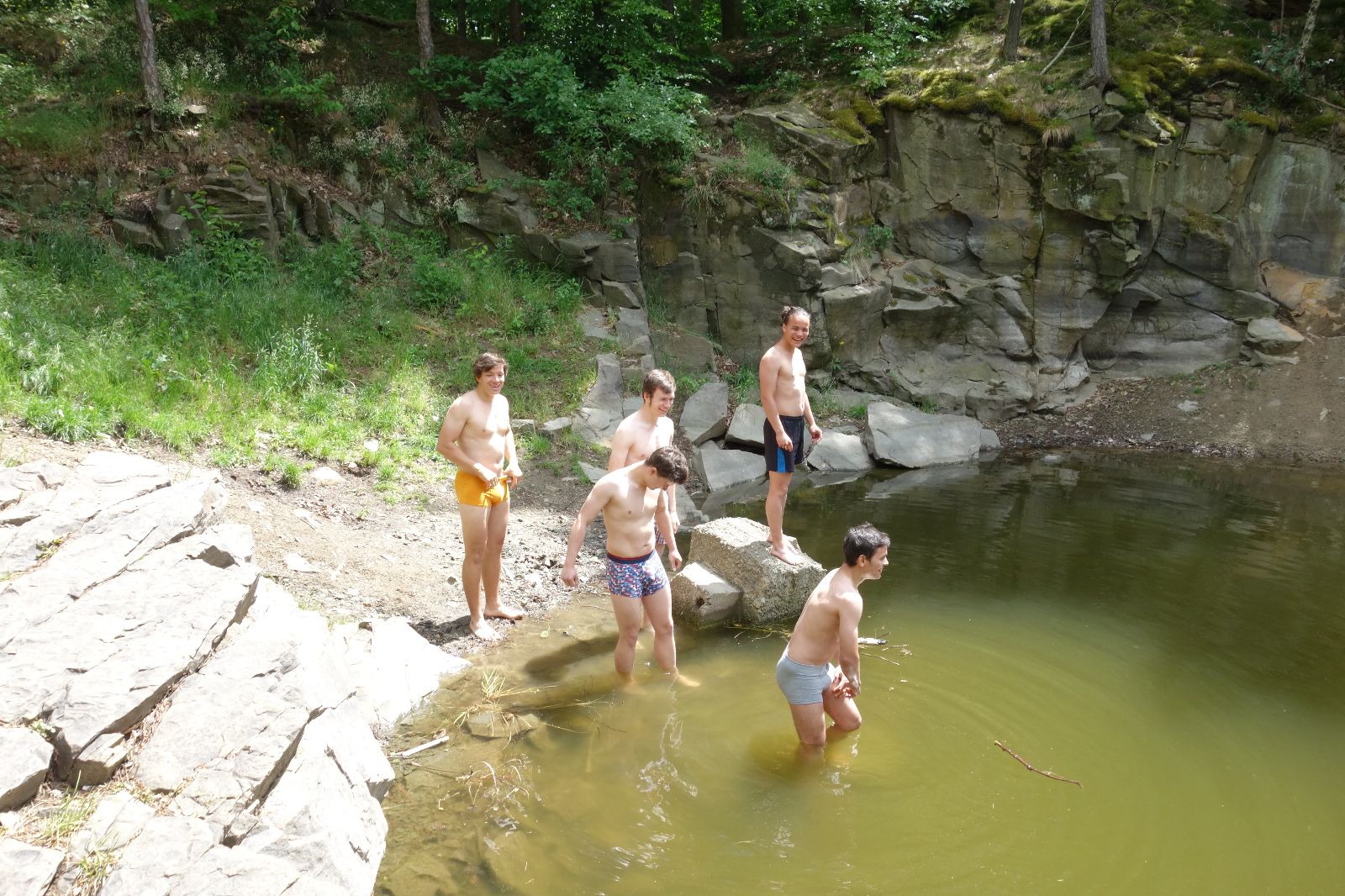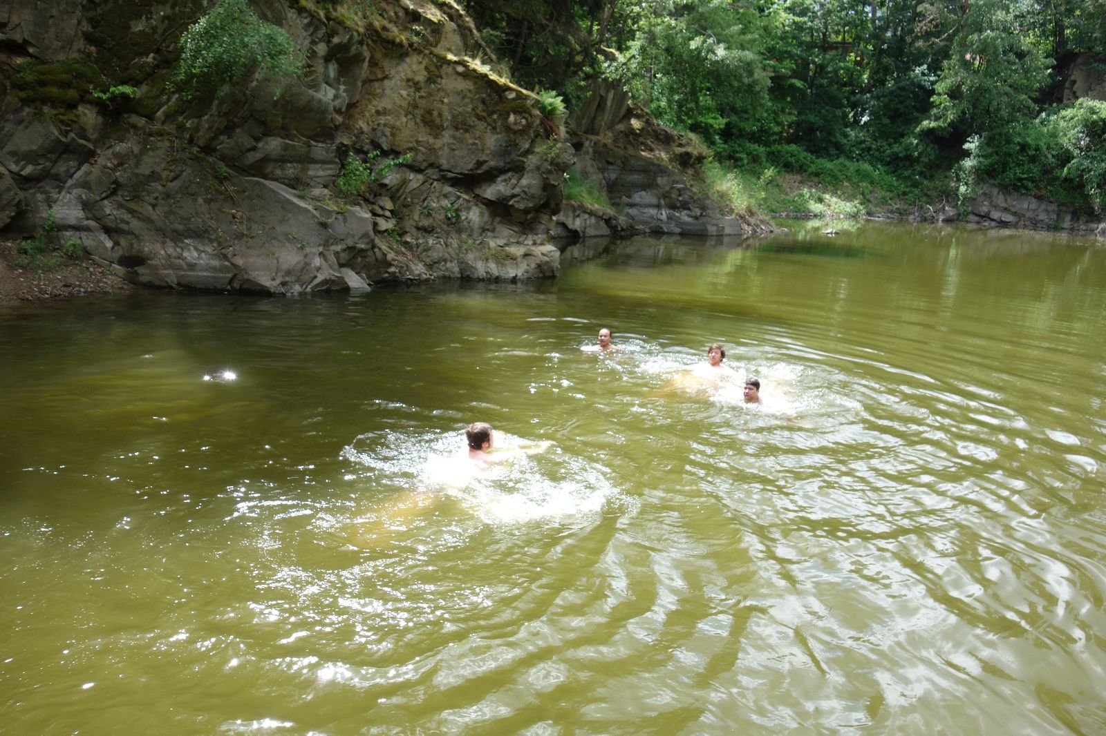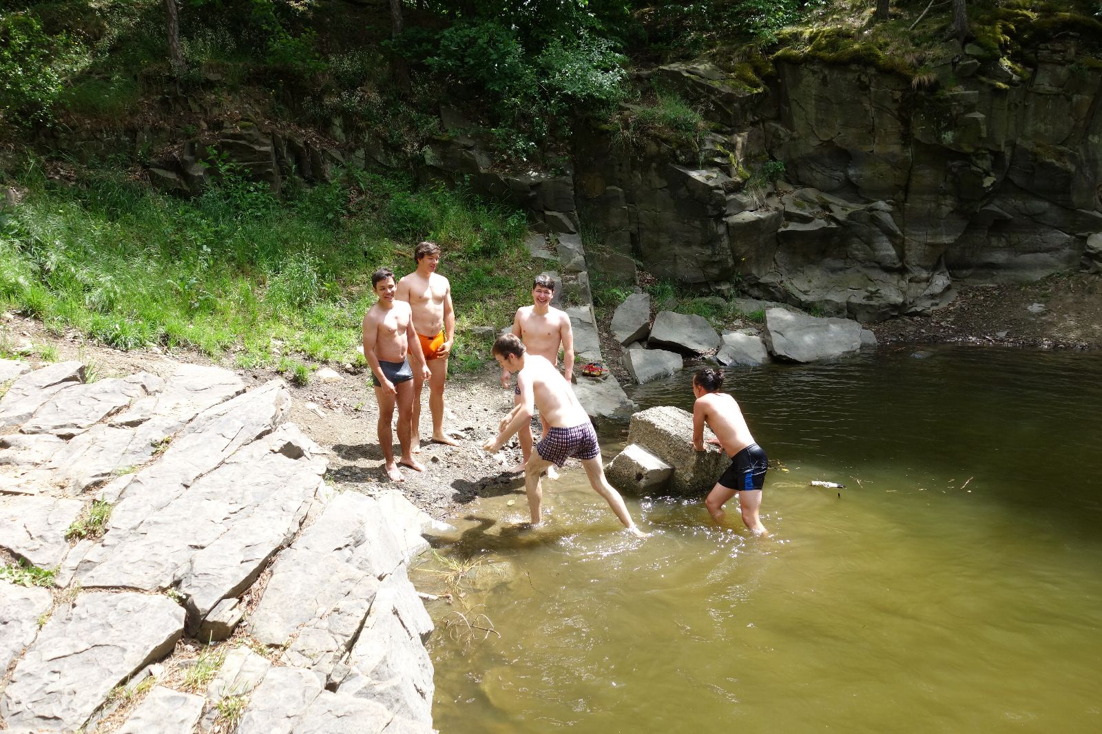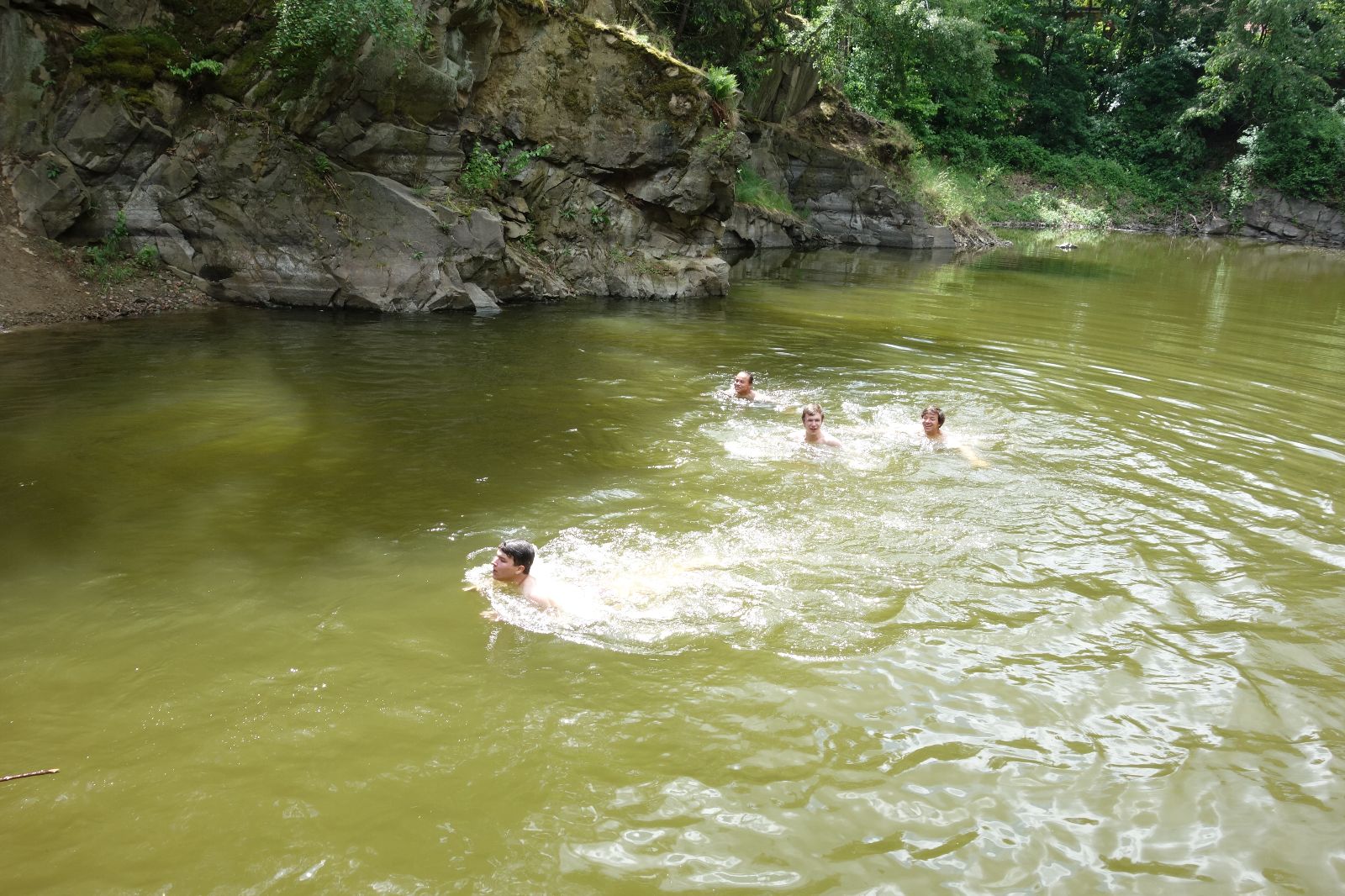 Nahoře nás čeká lom Hartlovka. Nikde nikdo, sluníčko. Kluci jdou do plavek a hurá do vody. Sam jako první, hned po něm Filíš. A ostatní. Paráda. Akorát to sluníčko rychle mizí a přichází déšť. Když se přeháňka přežene, jedeme dál po červené do údolí a pak nahoru ke Třem Javorům. Super krpál, 4,5 km dlouhý, převýšení 238 metrů. Odtud už je to jen kousíček na Kalečník, kde máme další pauzu. Kluci ve vrcholové knize hledají Zubničkův zápis z předloňské výpravy, nacházejí však pouze Love story milovníka Dušana. V tom se přižene další mrak a začnou dokonce padat i malé kroupy. Ještě že jsme nevyrazili!