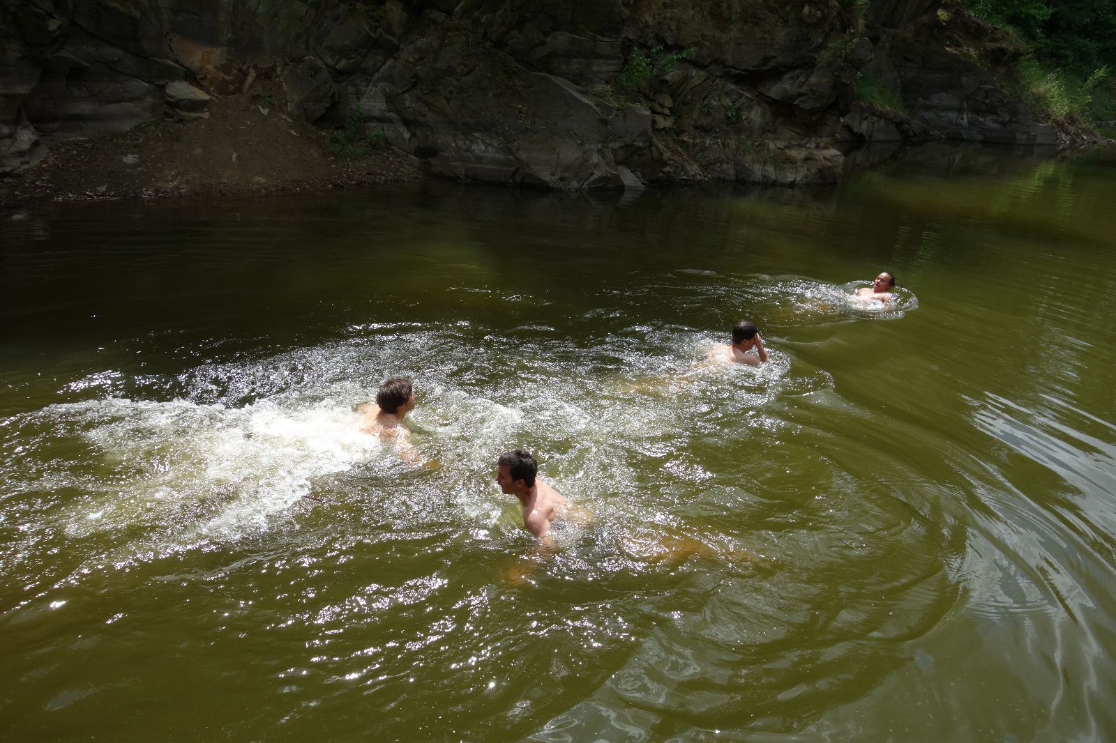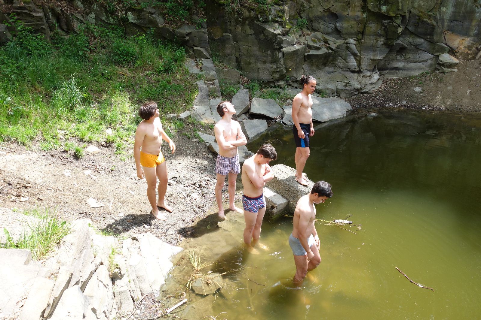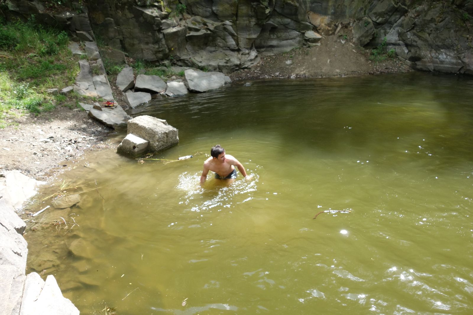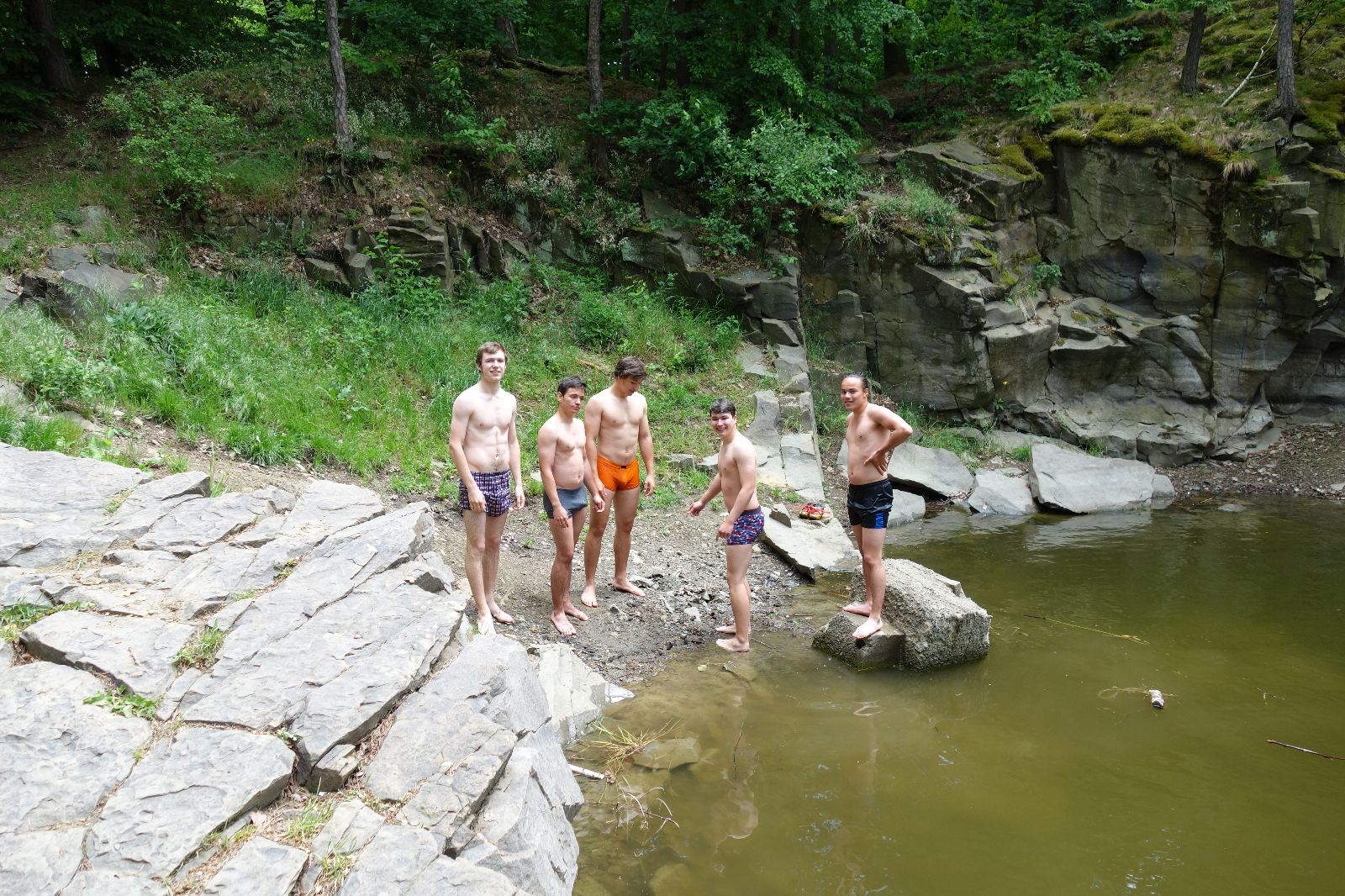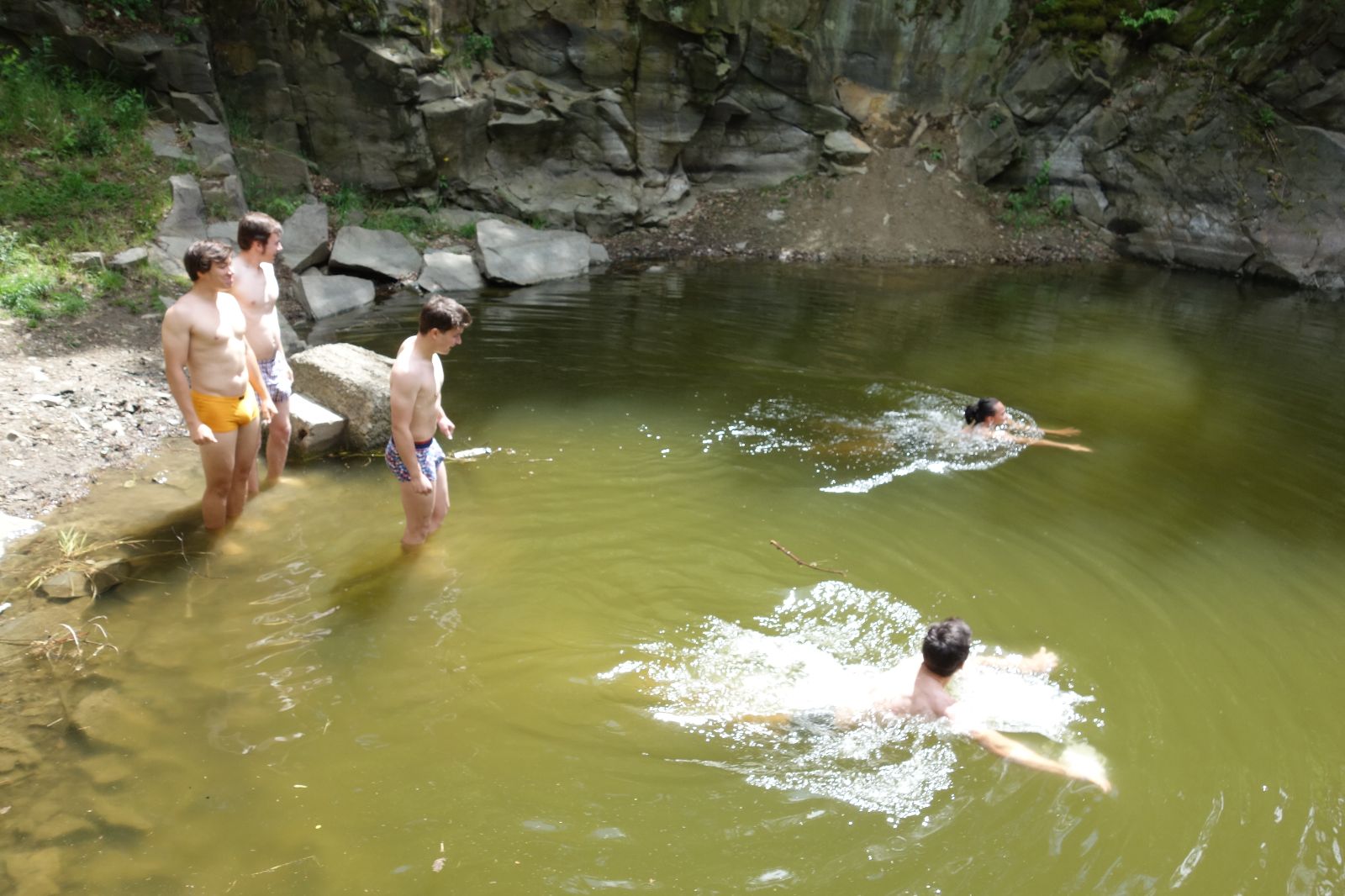 Nahoře nás čeká lom Hartlovka. Nikde nikdo, sluníčko. Kluci jdou do plavek a hurá do vody. Sam jako první, hned po něm Filíš. A ostatní. Paráda. Akorát to sluníčko rychle mizí a přichází déšť. Když se přeháňka přežene, jedeme dál po červené do údolí a pak nahoru ke Třem Javorům. Super krpál, 4,5 km dlouhý, převýšení 238 metrů. Odtud už je to jen kousíček na Kalečník, kde máme další pauzu. Kluci ve vrcholové knize hledají Zubničkův zápis z předloňské výpravy, nacházejí však pouze Love story milovníka Dušana. V tom se přižene další mrak a začnou dokonce padat i malé kroupy. Ještě že jsme nevyrazili!