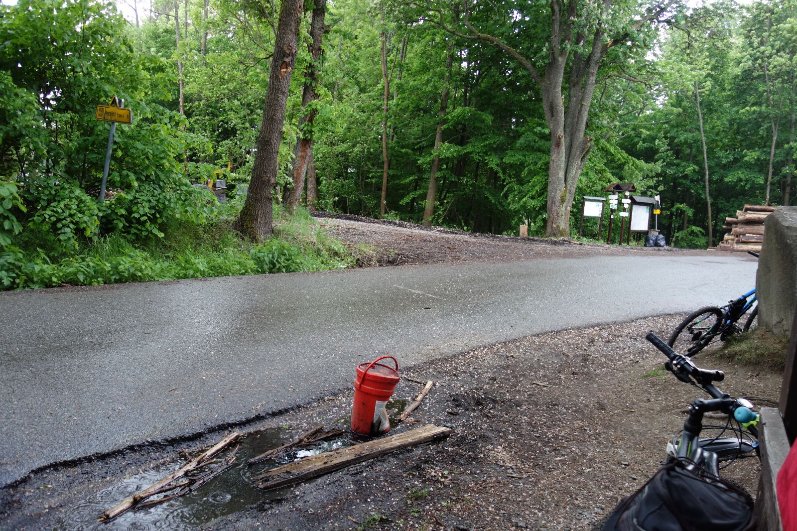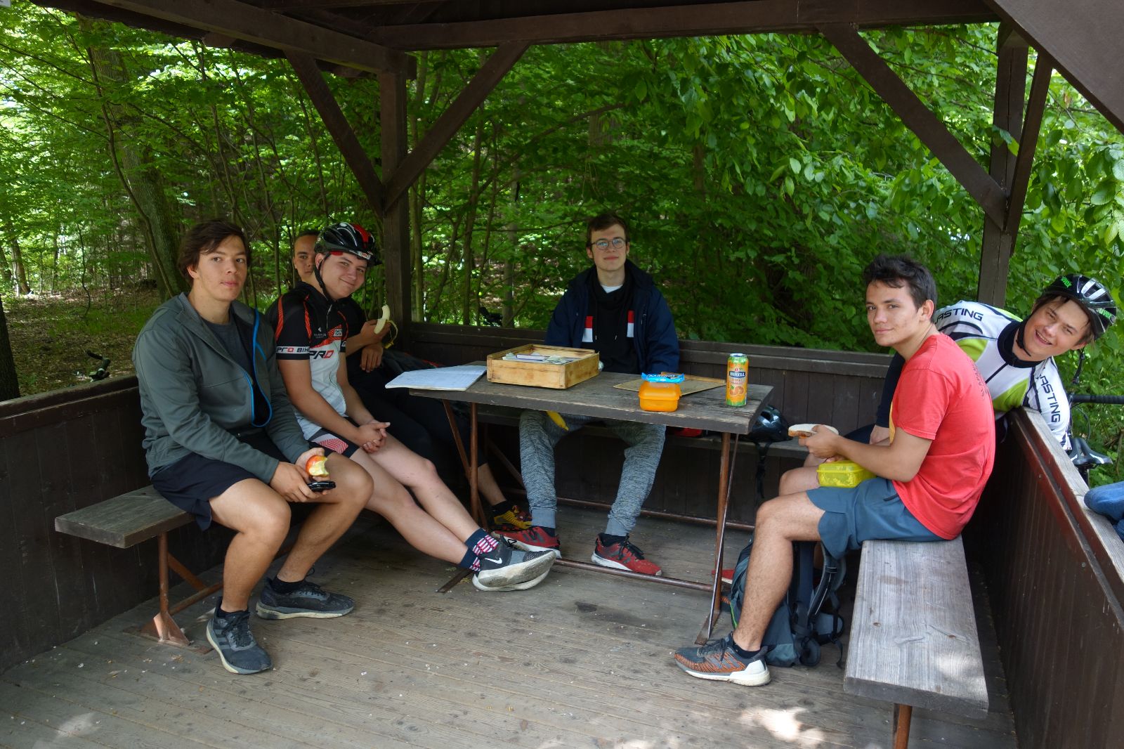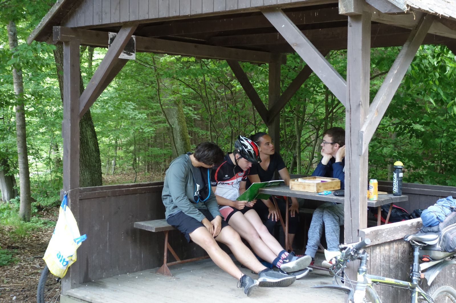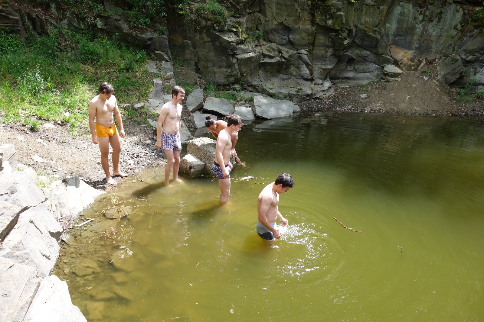 Nahoře nás čeká lom Hartlovka. Nikde nikdo, sluníčko. Kluci jdou do plavek a hurá do vody. Sam jako první, hned po něm Filíš. A ostatní. Paráda. Akorát to sluníčko rychle mizí a přichází déšť. Když se přeháňka přežene, jedeme dál po červené do údolí a pak nahoru ke Třem Javorům. Super krpál, 4,5 km dlouhý, převýšení 238 metrů. Odtud už je to jen kousíček na Kalečník, kde máme další pauzu. Kluci ve vrcholové knize hledají Zubničkův zápis z předloňské výpravy, nacházejí však pouze Love story milovníka Dušana. V tom se přižene další mrak a začnou dokonce padat i malé kroupy. Ještě že jsme nevyrazili!