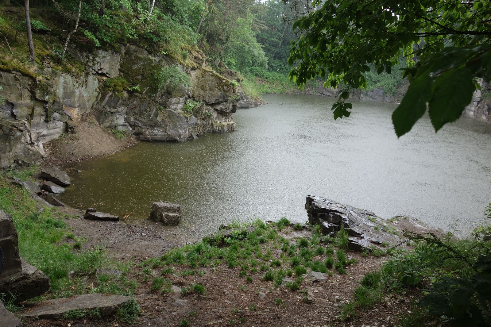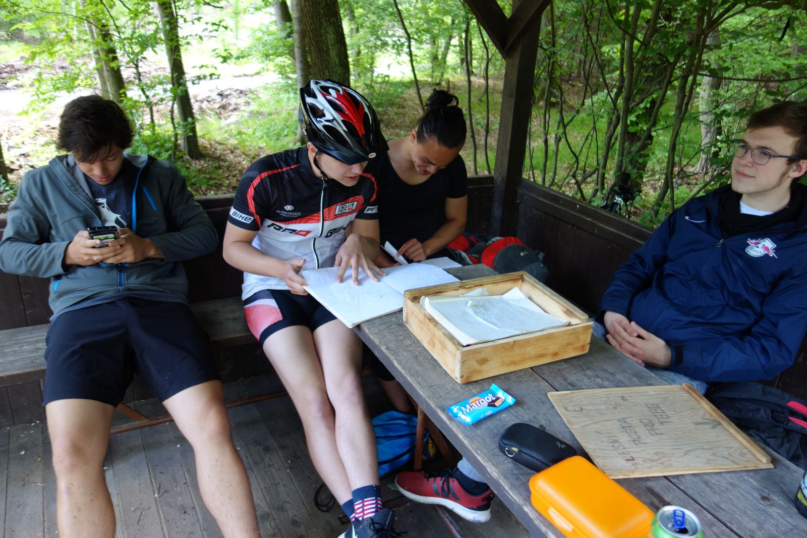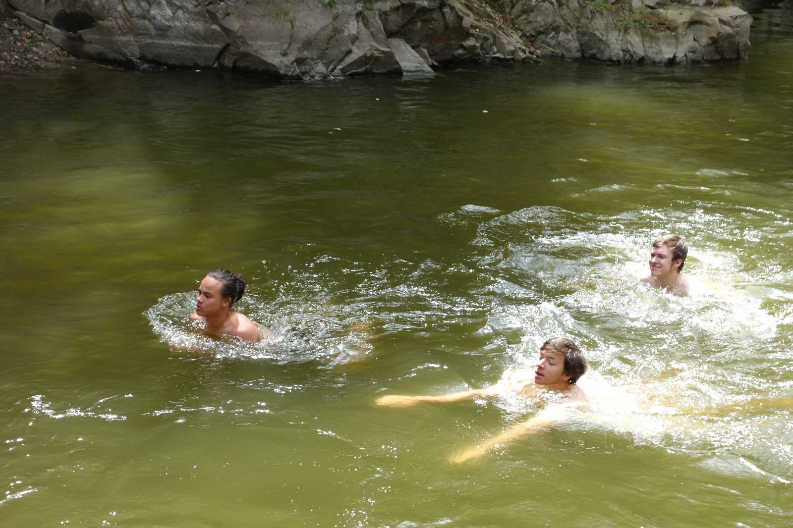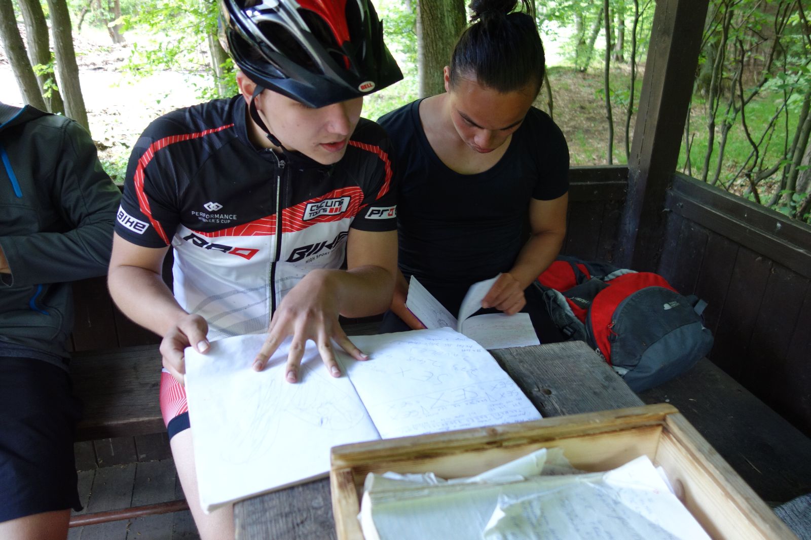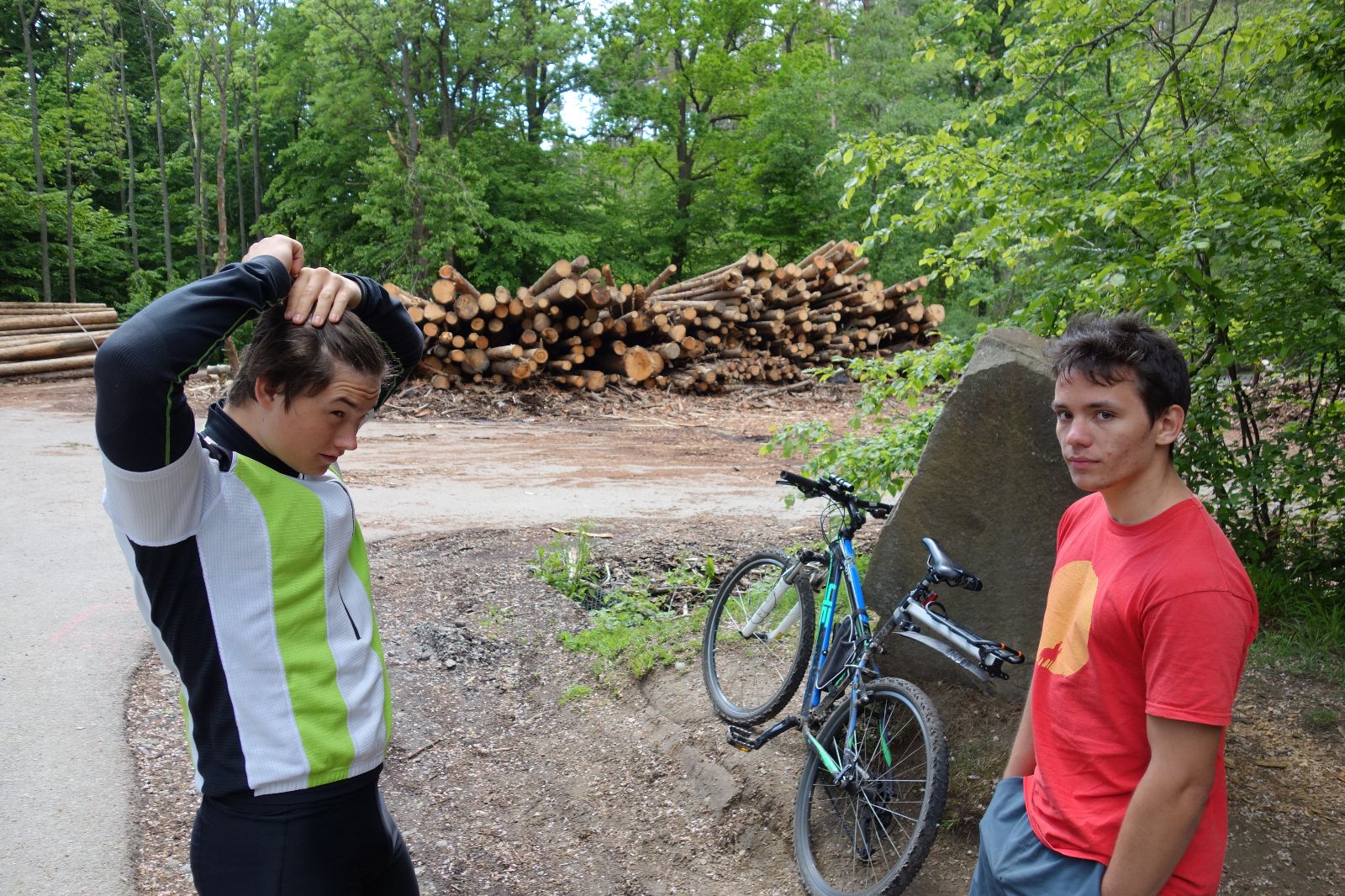 Nahoře nás čeká lom Hartlovka. Nikde nikdo, sluníčko. Kluci jdou do plavek a hurá do vody. Sam jako první, hned po něm Filíš. A ostatní. Paráda. Akorát to sluníčko rychle mizí a přichází déšť. Když se přeháňka přežene, jedeme dál po červené do údolí a pak nahoru ke Třem Javorům. Super krpál, 4,5 km dlouhý, převýšení 238 metrů. Odtud už je to jen kousíček na Kalečník, kde máme další pauzu. Kluci ve vrcholové knize hledají Zubničkův zápis z předloňské výpravy, nacházejí však pouze Love story milovníka Dušana. V tom se přižene další mrak a začnou dokonce padat i malé kroupy. Ještě že jsme nevyrazili!