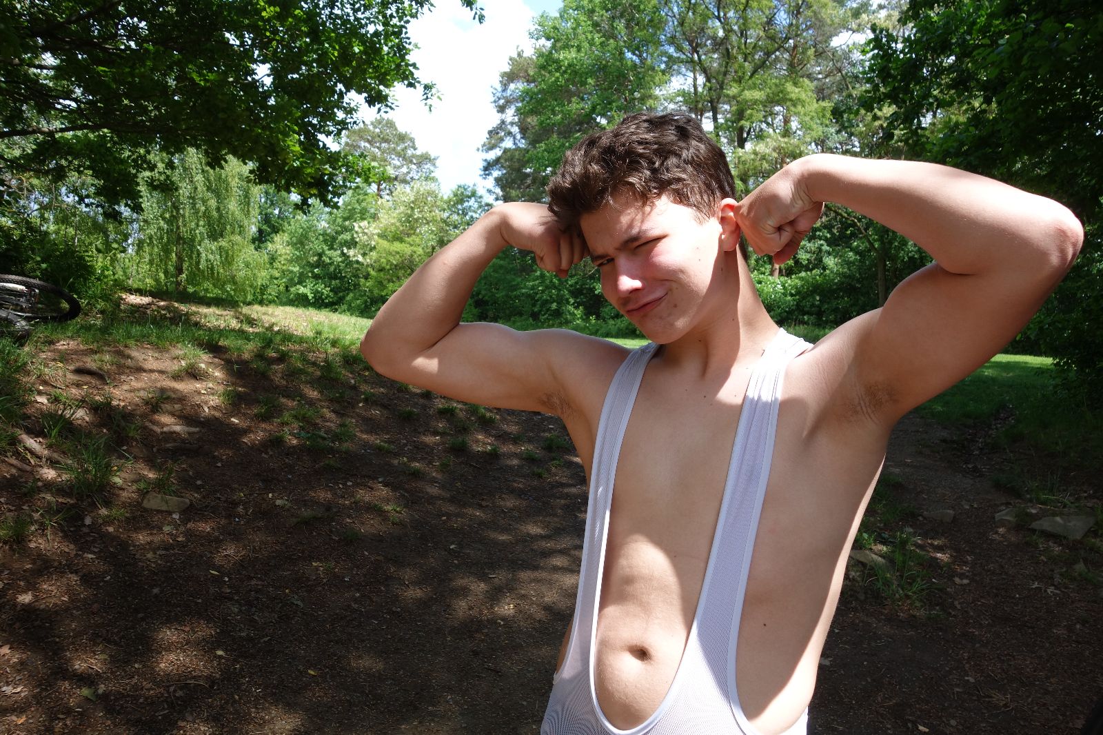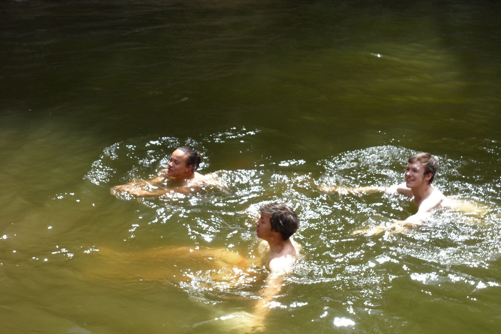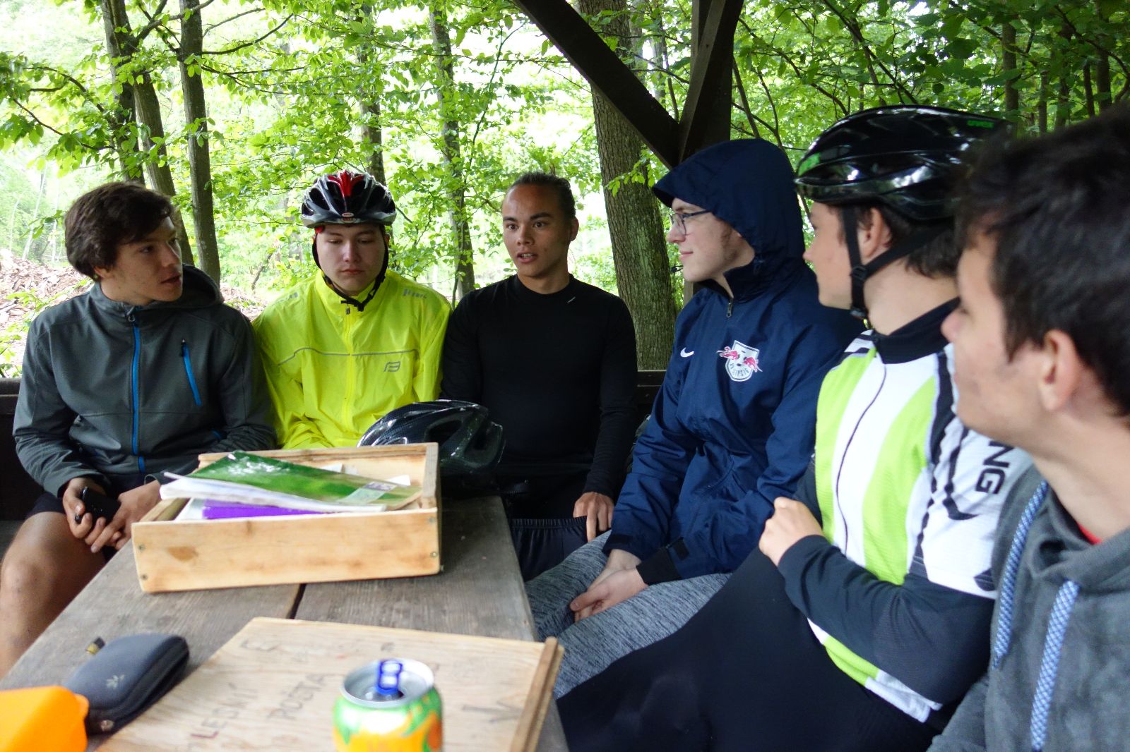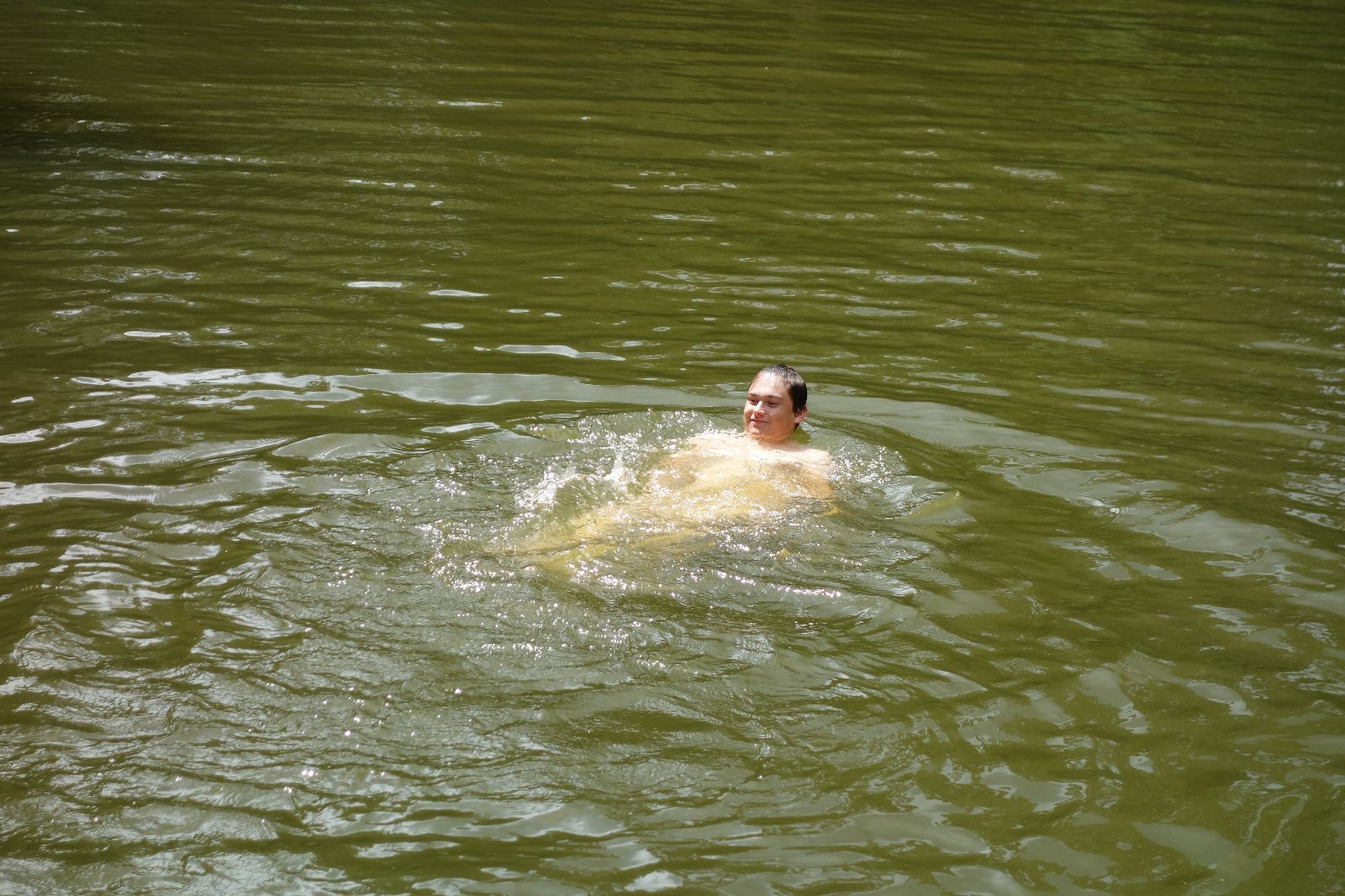 Nahoře nás čeká lom Hartlovka. Nikde nikdo, sluníčko. Kluci jdou do plavek a hurá do vody. Sam jako první, hned po něm Filíš. A ostatní. Paráda. Akorát to sluníčko rychle mizí a přichází déšť. Když se přeháňka přežene, jedeme dál po červené do údolí a pak nahoru ke Třem Javorům. Super krpál, 4,5 km dlouhý, převýšení 238 metrů. Odtud už je to jen kousíček na Kalečník, kde máme další pauzu. Kluci ve vrcholové knize hledají Zubničkův zápis z předloňské výpravy, nacházejí však pouze Love story milovníka Dušana. V tom se přižene další mrak a začnou dokonce padat i malé kroupy. Ještě že jsme nevyrazili!