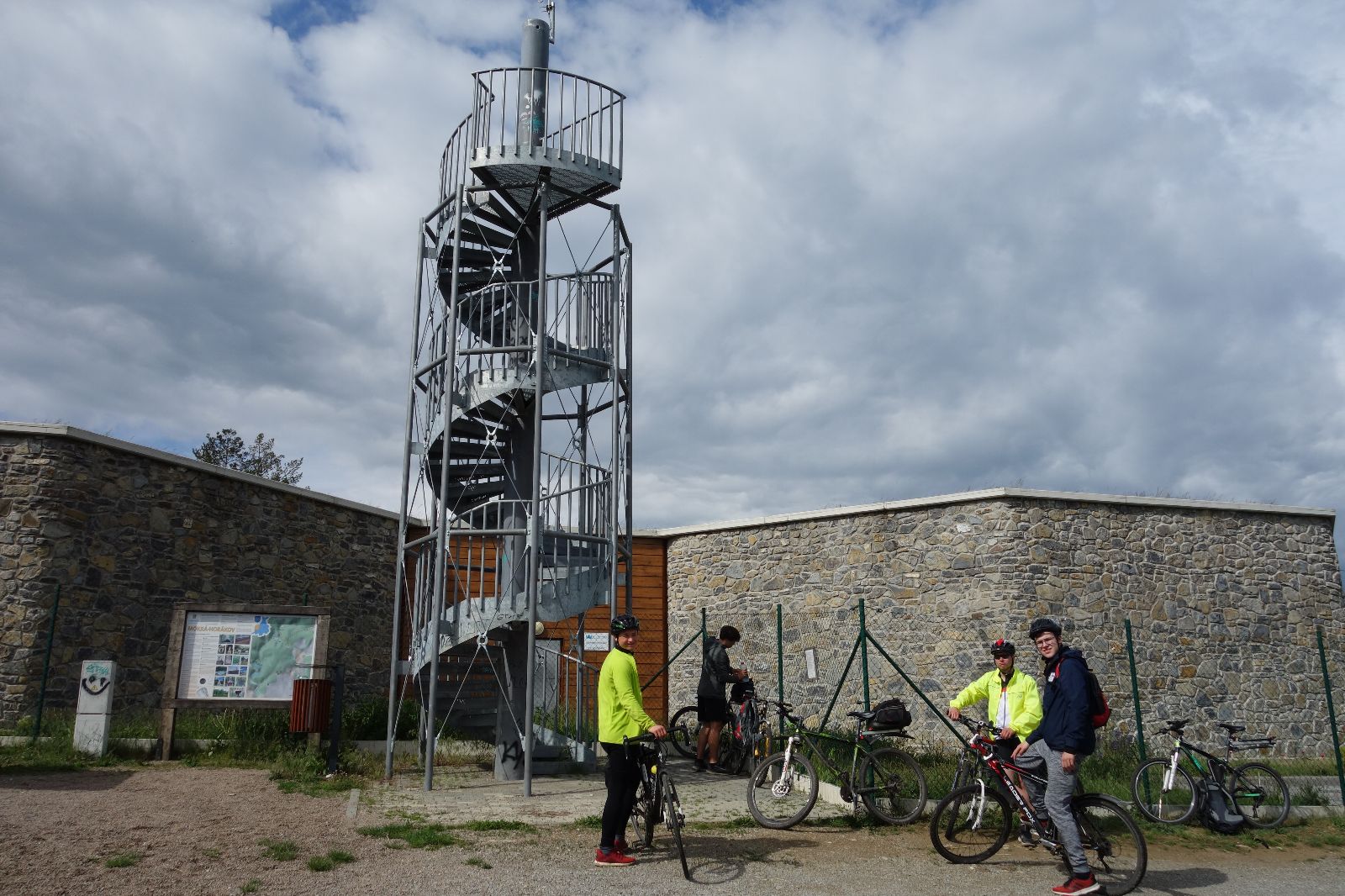 Po dešti jedeme směr Jelenice, Hostěnice a Mokerská rozhledna. Je docela zima. Na rozhledně opět chvíli kempujeme, vidět je odtud pěkně, akorát rozhledna je malilinkatá. Spíš by se jí mělo říkat rozhlednička.