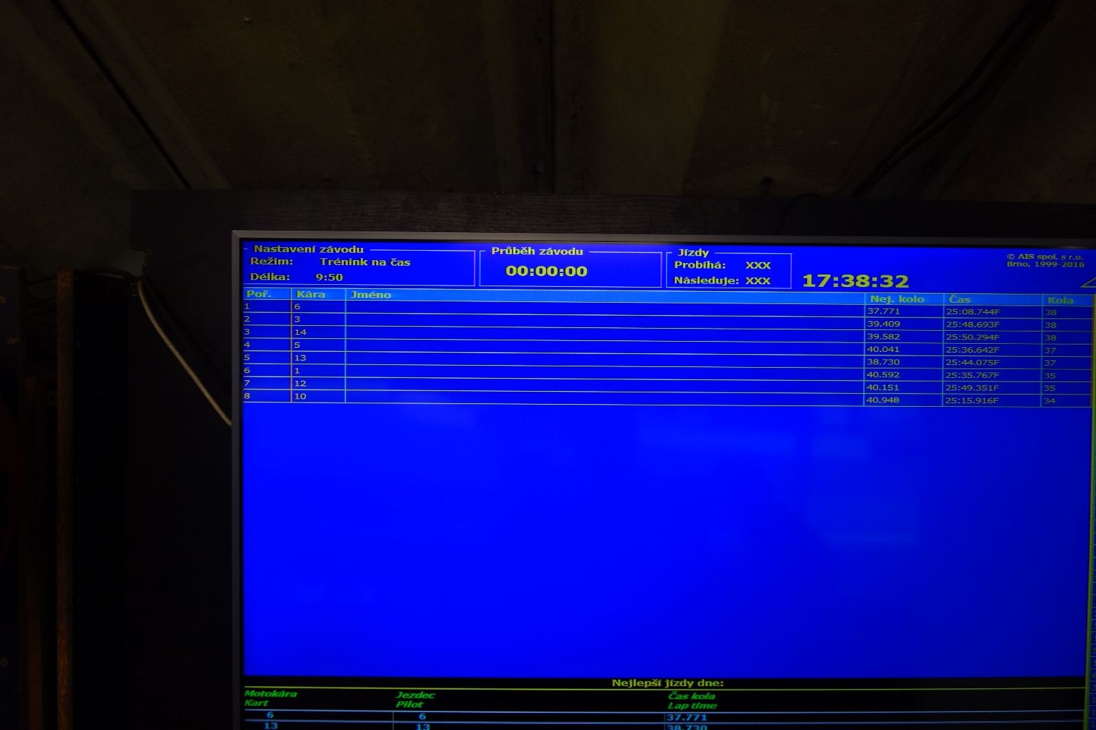 V pauze se kecalo, popíjelo, baštilo a taky jsme našli návod, jak trať optimálně projet. No a šlo se na to. Ostrý start. Po dvou kolech předjíždím Krysaříka, pak Fildu, zaparkovaného ve svodidlech. Pak ještě někoho- nejspíš Vítka. No celkem jsem jich předjel pět a mě nikdo. 25 minut uteklo jak voda a všichni se (zpocení jako po sprintu) upnuli k hodnotící tabuli. První místo je jasné – Roxy. Ne už o parník, ale pořád s přehledem. Váca druhý, Kloub třetí. Bedna je jasná. Ale dál … k mému překvapení na čtvrtém místě září moje kára „pětka“. Tak bramborová medaile. Paráda! Za mnou je Filda, šestý a sedmý dojeli Vítek s Krysaříkem a osmý dojel náš host.