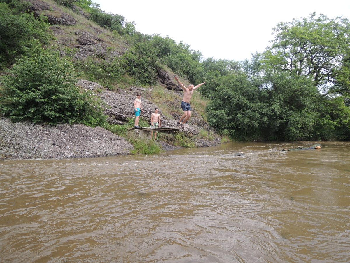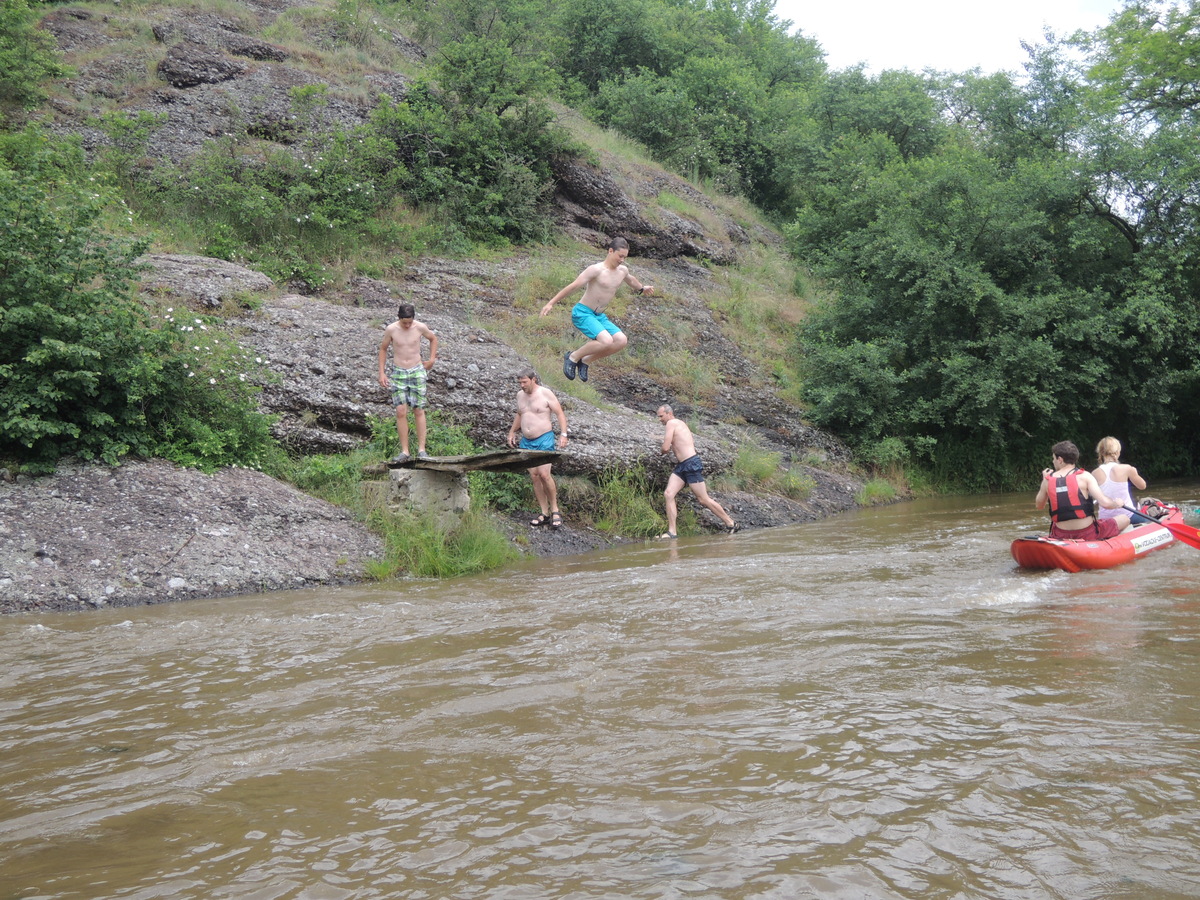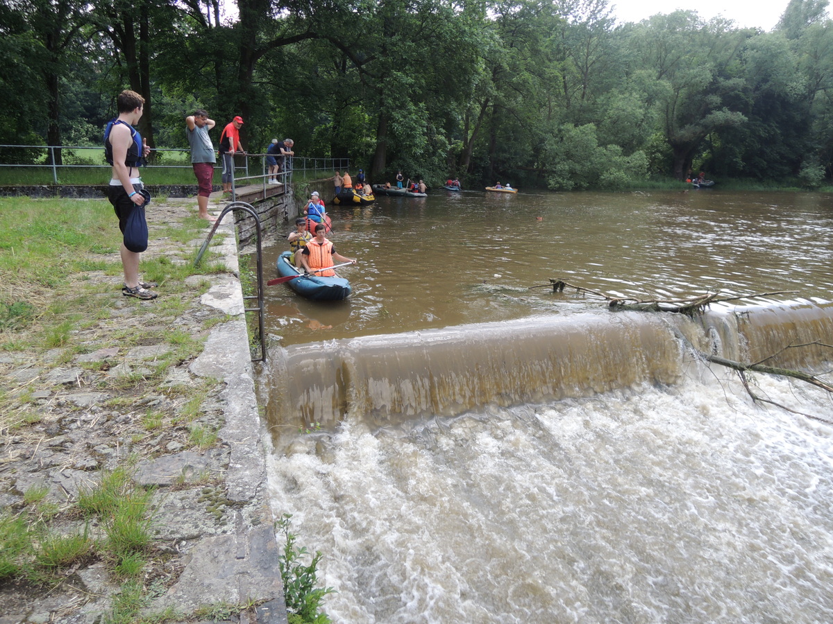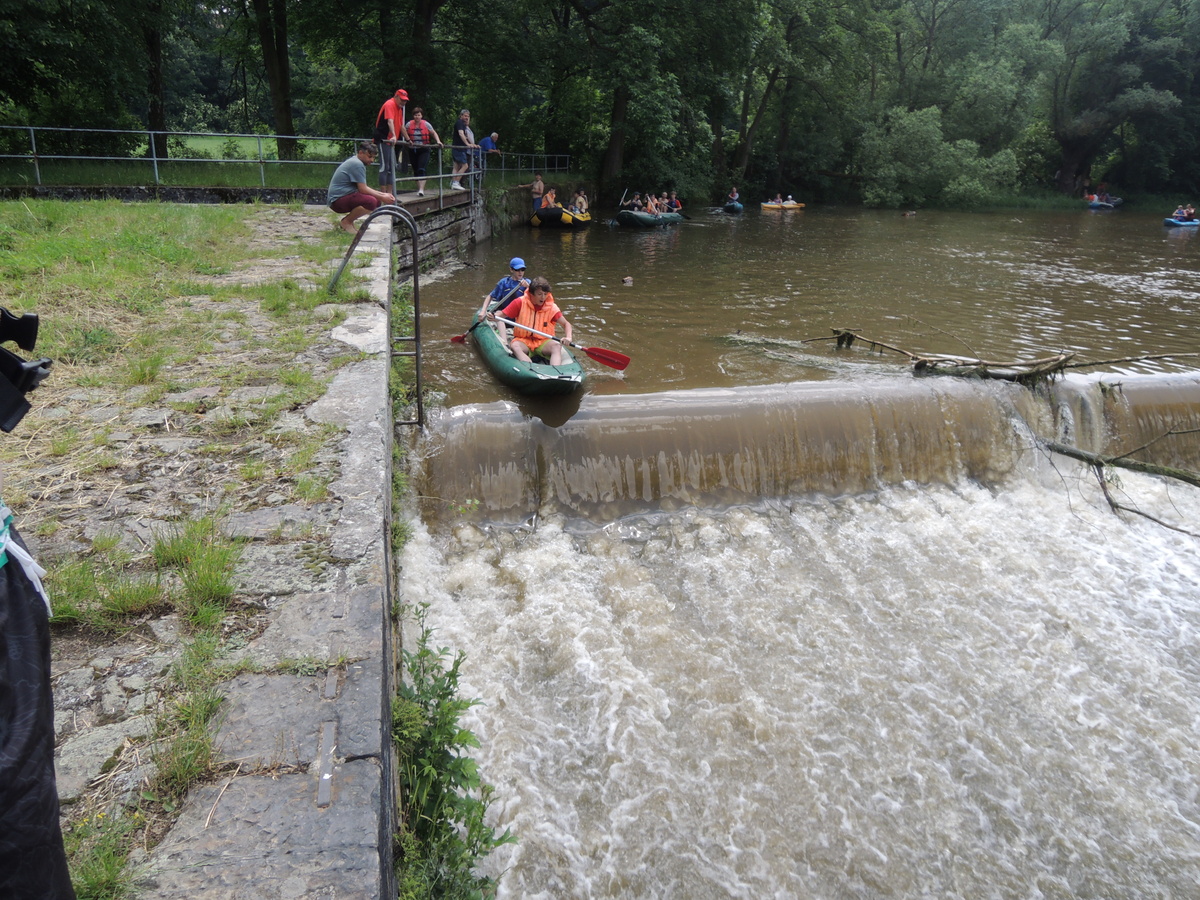 O prvním červnovém víkendu jsme se rozhodli vyrazit na vodáckou výpravu. Pohled do kalendáře nás navedl - bude se pouštět voda z přehrady Mohleno. Bylo tedy rozhodnuto. V sobotu kolem sedmé večer se sešlo na Boudě 12 Draků: Kloub, Filíš, Tobík, Petarda, Jára, Lukin, Vítek, Amád, Krysařík, Kostra a Honza + já. Připravili jsme vesty a další věci, chvíli si dali fotbálek a pak se tlupa hladových odsunula doplnit zásoby jídla do Alberta. Po večeři (převážně zmrzlinové :-)) jsem si dali Aktivity a docela se při tom pobavili. Přál bych vám vidět, jak gymnaziální mládež předvádí pantomimicky slovo "řeholnice" nebo "větrný mlýn". Spát jsme šli docela brzo, i když kravál, šířící se z Velkého parku, byl ukrutný... Ráno v 7:00 přijíždí nejprve červená oktávka s Kosťovic rodiči a sestřičkou, pak přijíždí Lukinův táta a jako poslední rozšiřuje naše řady Amádův táta. Tím je dán konečný počet účastníků zájezdu na 17. Malinko přerozdělujeme ekvipmenty do ostatních aut (večer jsem přivezl oba rafty, všechny tři Pálavy a pádla v jednom autě já), pak naskakují do aut i Draci a můžeme jet. V Ivančicích provádíme reorganizaci, suneme se do trojice aut a Amádovic stroj zůstává na břehu u mostu. To je luxus, nemusíme s auty složitě šachovat. A kluci jsou skladní... U Mohenského mostu asi 20 km proti proudu to vypadá jako v mraveništi. Parkujeme každý kde se dá a posádky se ujímají svých plavidel. Kosťovic family si fučí jednu Pálavu, Lukin s Vítkem druhou a Petarda s Tobíkem třetí. Raft Colorado si chystají Karel (jinak Lukinův táta), Jára, Kosťa a Kloub a raft Robfin připravujeme my s Radkem (jinak Amádovým tátou), Krysaříkem, Amádem, Honzou a Filíšem. Na vodu vyrážíme netradičně brzy a vypadá to tam skoro jako na břehu - všude samí vodáci. Míjíme několik pěkných peřejnatých úseků a jeden jez. Občas nám jízdu zpestřují kameny v řece a jindy zase spadané stromy a nízké větve. Je to super. Když na jednom kamenu uváznou Vítek s Lukinem a při vyprošťování se otočí, bavíme se přímo královsky. Naštěstí se blíží tábořiště pod Templštýnem a tam kromě stánků s občerstvením mají i oheň. Cpeme se grilovanými cigáry a dva mokrouši se trošku suší. To ještě netuší, že pár stovek metrů dál po proudu vypuknou takové líté boje mezi posádkami, že mokří budou úplně všichni a všechno... Boje začaly docela nevinně. Kdosi z některé Pálavy po nás z legrace stříknul a ujel. Oprášili jsme tudíž staré mušketýrské heslo "Jeden za všechny všichni za jednoho" s tím, že příště se do opovážlivce pustíme všichni. Netrvalo dlouho a komusi z naší posádky přistál na hlavě chomáč řas. Viník? Jako kobyly se chlámající pálaváři Tobík s Petardou. Přibližujeme se k nim a zahajujeme vodní útok. Řeknu vám, 6 pádel, to je obrovská palebná síla! Voda létá vzduchem, Tobík s Petradou se chabě brání a v tom jim připlouvá na pomoc posádka Colorada! Během chviličky jsme všichni durch, obzvláště když se do bojů zapojuje i druhá Pálava, na které se mezi tím ocitli Kloub s Kosťou. Ovšem i my máme trumf v rukávu v podobě živé střely Amád I. Občas jsme se tak zabrali do bojů, že jsme si nevšimli nízkých větví a málem došlo k tragédii! Ovšem taky jsme se výborně bavili a k tomu i spousta přihlížejících vodáků. Když nás boje omrzely, jeli jsme chvíli jen tak a najednou se na obzoru objevil legendární skokanský můstek. Přirazili jsme vpravo na mělčině, rozložili mokré věci, něco málo posvačili a padla otázka, kdo si jde zaskákat. Ruce se zvedly čtyři, moje, Karlova, Kloubova a Lukinova. Ostatní se hájili, že nemůžou, že voda je studená a oni měli předloni rýmu, nebo že se obávají lidožravých žab co tu prý určitě jsou a tak všelijak podobně. K protějšímu břehu jsem tedy vyrazili ve čtyřech. Do půlky řeky mělčina, pak dno strmě klesá a proud sílí. Ale zvládli jsme to. Karel jde příkladem a skáče první. Kolem projíždějící posádky na nás nevěřícně čumí, zbytek tlupy na břehu taky, jen Honza neúnavně fotí. Když jsem si dostatečně zaskákali, jelo se dál. Projeli jsme provalený jez, opodál zvládli i ten další (vody bylo hodně, mlýn žádnou nebral) a mysleli si,že už nás čeká jen klidný dojezd. To jsme se ale šeredně spletli. Nízké větve a silný proud nám připravily několik adrenalinových chvilek, z nichž jednu zakončili Kosťa s Kloubem v nánosu popadaných větví. Ještě že jim Radek pomohl vyprostit uvízlou Pálavu a Robfináři zatím zablokovali příjezd dalších plavidel do nebezpečného místa. Ale nebyli jsme v tom sami, koupalo se i dost jiných vodáků. Když jsme vypluli z vrbiček a olší, rozevřela se krajina a před námi byly Ivančice. Zleva se do Jihlavy vlila Oslava a o kousek dál už byl most. Zde naše plavba končí. Tátové se sunou pro auta, Draci čistí, vypouštějí a skládají plavidla. Ty pak na Boudě pěkně rozvěsíme, aby dokonale vyschly. Super akce, kdo nejel, může jenom litovat! Jura