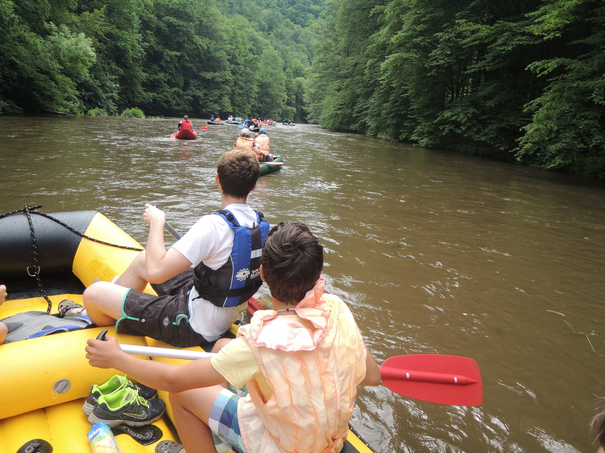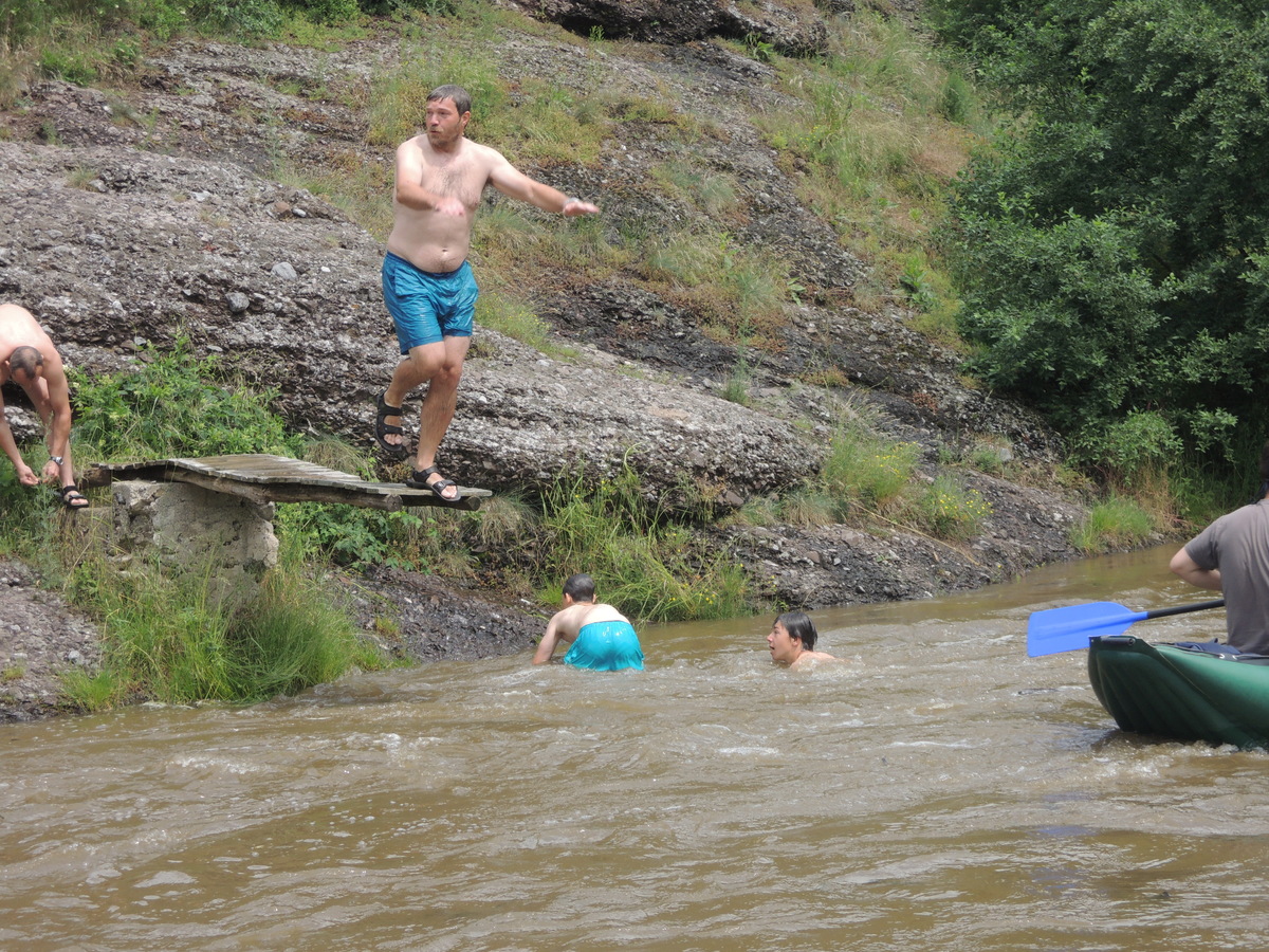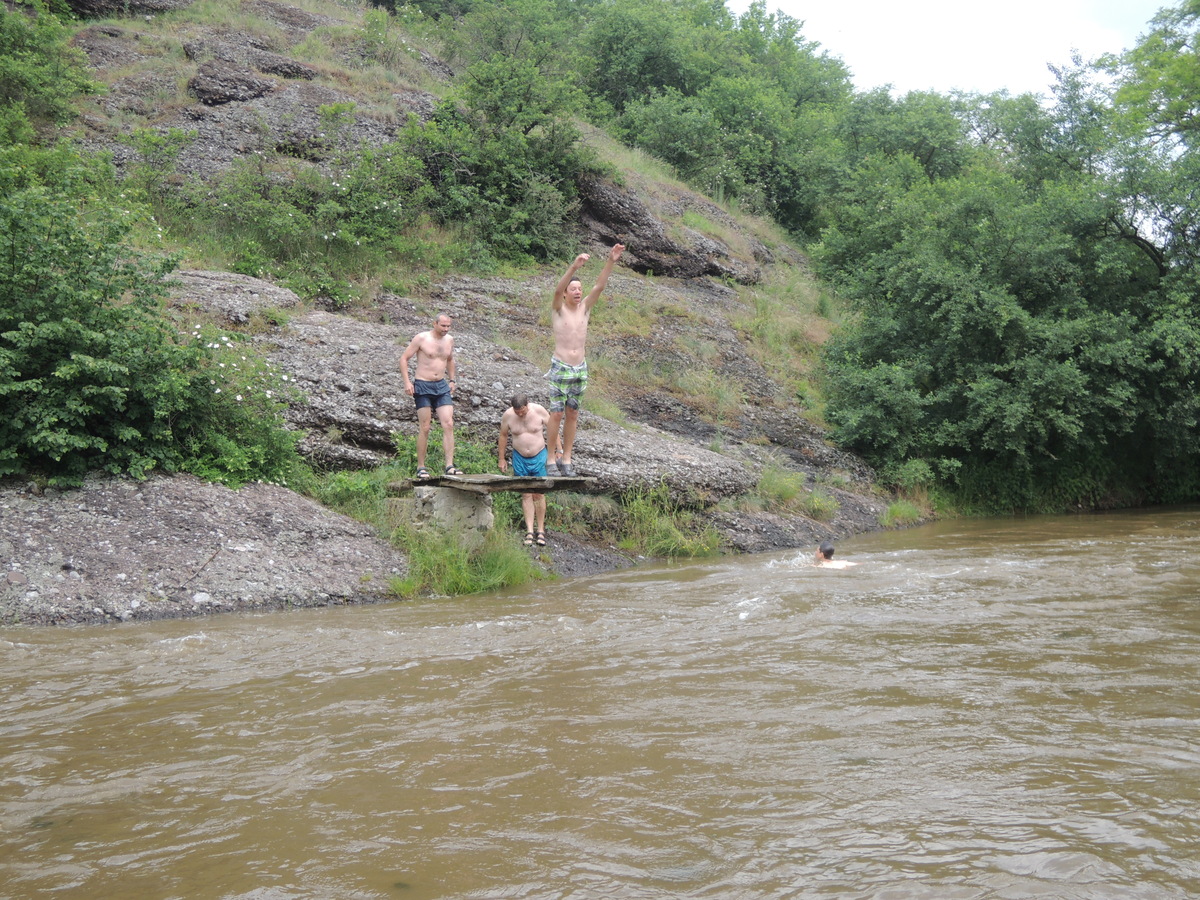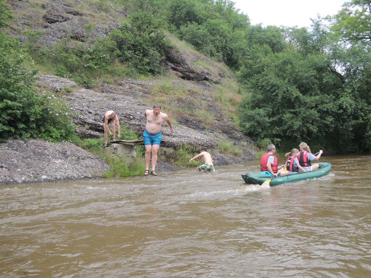 O prvním červnovém víkendu jsme se rozhodli vyrazit na vodáckou výpravu. Pohled do kalendáře nás navedl - bude se pouštět voda z přehrady Mohleno. Bylo tedy rozhodnuto. V sobotu kolem sedmé večer se sešlo na Boudě 12 Draků: Kloub, Filíš, Tobík, Petarda, Jára, Lukin, Vítek, Amád, Krysařík, Kostra a Honza + já. Připravili jsme vesty a další věci, chvíli si dali fotbálek a pak se tlupa hladových odsunula doplnit zásoby jídla do Alberta. Po večeři (převážně zmrzlinové :-)) jsem si dali Aktivity a docela se při tom pobavili. Přál bych vám vidět, jak gymnaziální mládež předvádí pantomimicky slovo "řeholnice" nebo "větrný mlýn". Spát jsme šli docela brzo, i když kravál, šířící se z Velkého parku, byl ukrutný... Ráno v 7:00 přijíždí nejprve červená oktávka s Kosťovic rodiči a sestřičkou, pak přijíždí Lukinův táta a jako poslední rozšiřuje naše řady Amádův táta. Tím je dán konečný počet účastníků zájezdu na 17. Malinko přerozdělujeme ekvipmenty do ostatních aut (večer jsem přivezl oba rafty, všechny tři Pálavy a pádla v jednom autě já), pak naskakují do aut i Draci a můžeme jet. V Ivančicích provádíme reorganizaci, suneme se do trojice aut a Amádovic stroj zůstává na břehu u mostu. To je luxus, nemusíme s auty složitě šachovat. A kluci jsou skladní... U Mohenského mostu asi 20 km proti proudu to vypadá jako v mraveništi. Parkujeme každý kde se dá a posádky se ujímají svých plavidel. Kosťovic family si fučí jednu Pálavu, Lukin s Vítkem druhou a Petarda s Tobíkem třetí. Raft Colorado si chystají Karel (jinak Lukinův táta), Jára, Kosťa a Kloub a raft Robfin připravujeme my s Radkem (jinak Amádovým tátou), Krysaříkem, Amádem, Honzou a Filíšem. Na vodu vyrážíme netradičně brzy a vypadá to tam skoro jako na břehu - všude samí vodáci. Míjíme několik pěkných peřejnatých úseků a jeden jez. Občas nám jízdu zpestřují kameny v řece a jindy zase spadané stromy a nízké větve. Je to super. Když na jednom kamenu uváznou Vítek s Lukinem a při vyprošťování se otočí, bavíme se přímo královsky. Naštěstí se blíží tábořiště pod Templštýnem a tam kromě stánků s občerstvením mají i oheň. Cpeme se grilovanými cigáry a dva mokrouši se trošku suší. To ještě netuší, že pár stovek metrů dál po proudu vypuknou takové líté boje mezi posádkami, že mokří budou úplně všichni a všechno... Boje začaly docela nevinně. Kdosi z některé Pálavy po nás z legrace stříknul a ujel. Oprášili jsme tudíž staré mušketýrské heslo "Jeden za všechny všichni za jednoho" s tím, že příště se do opovážlivce pustíme všichni. Netrvalo dlouho a komusi z naší posádky přistál na hlavě chomáč řas. Viník? Jako kobyly se chlámající pálaváři Tobík s Petardou. Přibližujeme se k nim a zahajujeme vodní útok. Řeknu vám, 6 pádel, to je obrovská palebná síla! Voda létá vzduchem, Tobík s Petradou se chabě brání a v tom jim připlouvá na pomoc posádka Colorada! Během chviličky jsme všichni durch, obzvláště když se do bojů zapojuje i druhá Pálava, na které se mezi tím ocitli Kloub s Kosťou. Ovšem i my máme trumf v rukávu v podobě živé střely Amád I. Občas jsme se tak zabrali do bojů, že jsme si nevšimli nízkých větví a málem došlo k tragédii! Ovšem taky jsme se výborně bavili a k tomu i spousta přihlížejících vodáků. Když nás boje omrzely, jeli jsme chvíli jen tak a najednou se na obzoru objevil legendární skokanský můstek. Přirazili jsme vpravo na mělčině, rozložili mokré věci, něco málo posvačili a padla otázka, kdo si jde zaskákat. Ruce se zvedly čtyři, moje, Karlova, Kloubova a Lukinova. Ostatní se hájili, že nemůžou, že voda je studená a oni měli předloni rýmu, nebo že se obávají lidožravých žab co tu prý určitě jsou a tak všelijak podobně. K protějšímu břehu jsem tedy vyrazili ve čtyřech. Do půlky řeky mělčina, pak dno strmě klesá a proud sílí. Ale zvládli jsme to. Karel jde příkladem a skáče první. Kolem projíždějící posádky na nás nevěřícně čumí, zbytek tlupy na břehu taky, jen Honza neúnavně fotí. Když jsem si dostatečně zaskákali, jelo se dál. Projeli jsme provalený jez, opodál zvládli i ten další (vody bylo hodně, mlýn žádnou nebral) a mysleli si,že už nás čeká jen klidný dojezd. To jsme se ale šeredně spletli. Nízké větve a silný proud nám připravily několik adrenalinových chvilek, z nichž jednu zakončili Kosťa s Kloubem v nánosu popadaných větví. Ještě že jim Radek pomohl vyprostit uvízlou Pálavu a Robfináři zatím zablokovali příjezd dalších plavidel do nebezpečného místa. Ale nebyli jsme v tom sami, koupalo se i dost jiných vodáků. Když jsme vypluli z vrbiček a olší, rozevřela se krajina a před námi byly Ivančice. Zleva se do Jihlavy vlila Oslava a o kousek dál už byl most. Zde naše plavba končí. Tátové se sunou pro auta, Draci čistí, vypouštějí a skládají plavidla. Ty pak na Boudě pěkně rozvěsíme, aby dokonale vyschly. Super akce, kdo nejel, může jenom litovat! Jura