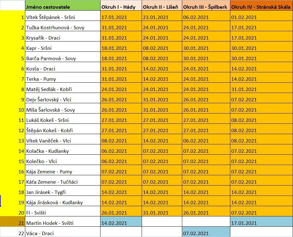 Včera nám skončila soutěž „Po stopách cestovatele Lišky II“. Celkem se do ní zapojilo 22 členů oddílu a 20 z nich dokázalo projít všechny 4 trasy. Čeká je tedy zlatá nášivka „Cestovatele lišky“, dostanou ji při nejbližší možné příležitosti. Tabulka a fotky v příloze tohoto zápisu. Pokud ani od března nebude možné pořádat pravidelné schůzky, můžete se už teď těšit na novou hru „Po stopách cestovatele Lišky III“.