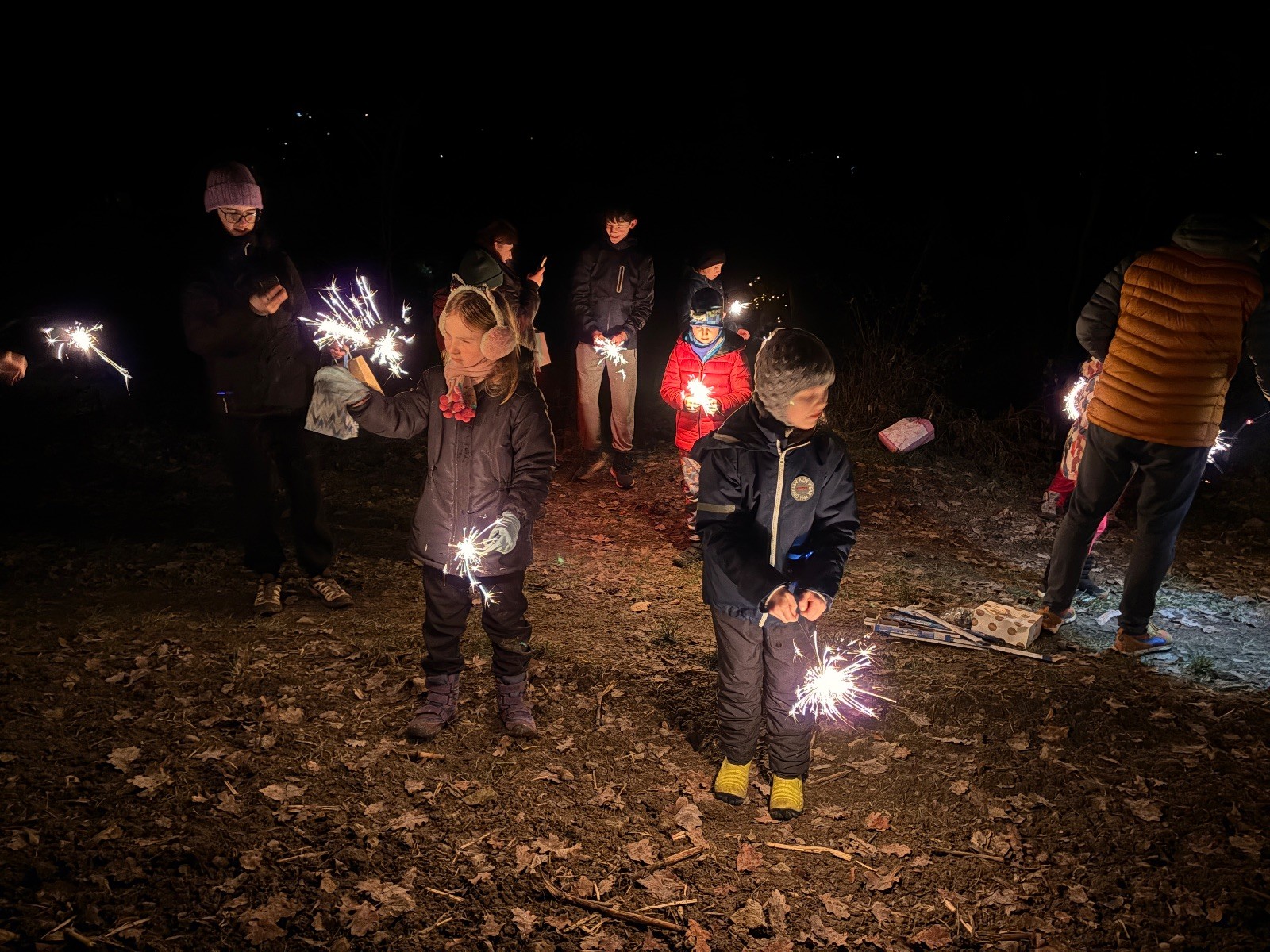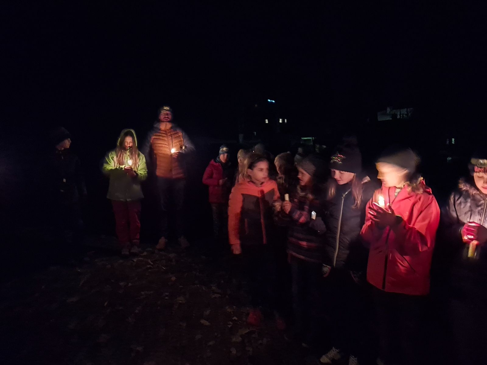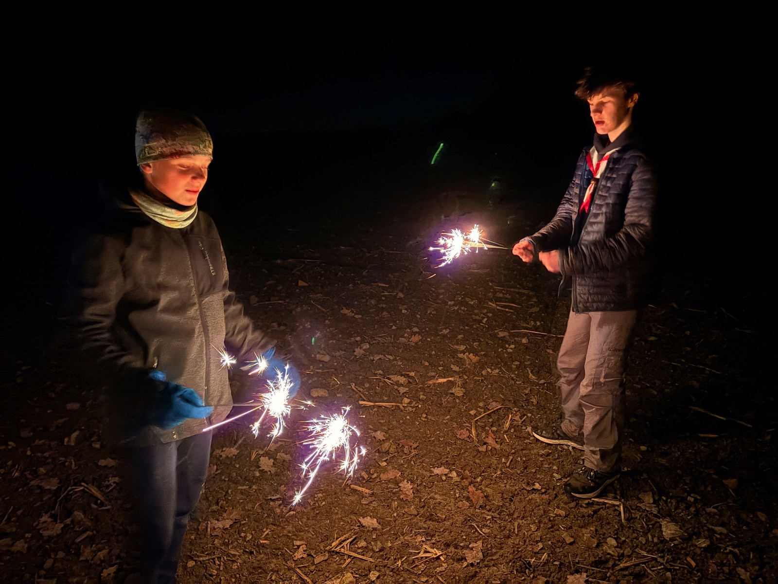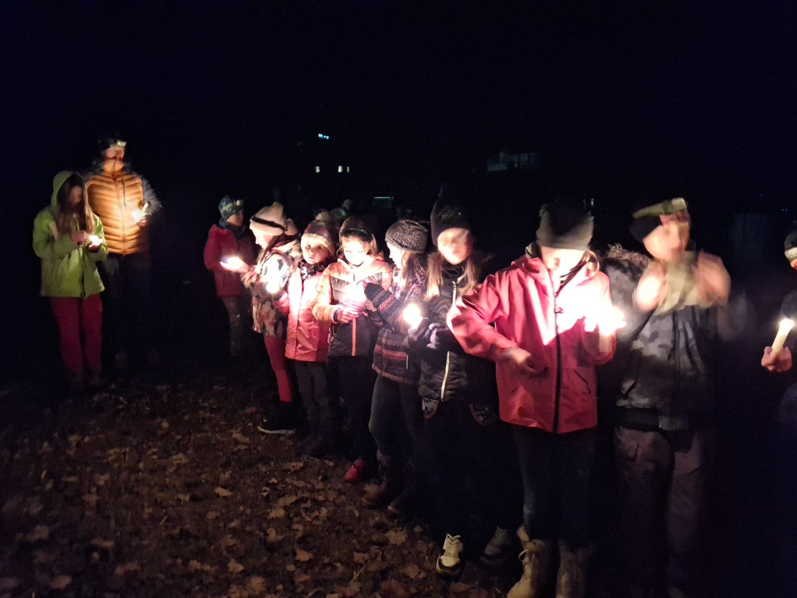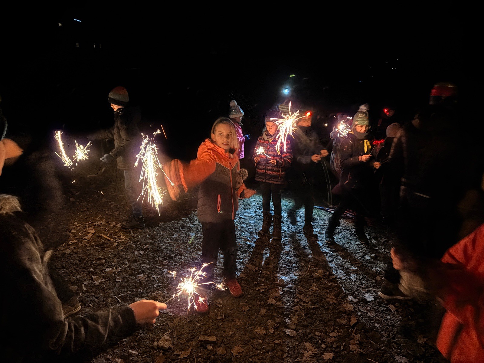 Okolo 17. hodiny se začínají slízat i ostatní členové družin. Setkáváme se v hojném počtu. Tak hojném, že bylo nad mé síly spočítat, kolik nás to vlastně bylo. I s vedoucími nás mohlo být přes 30, což je fajn účast. Mj. koukám i na svůj loňský zápis a zjišťuji, že jsem měl problém všechny sečíst i loni. Ne že bych měl problém se součty nad 30, ale vězte, že při stanovení počtu neustále se hemžící bandy skautů si nevystačíte s běžnou aritmetikou – tohle je spíš záležitost kvantové fyziky. Na rozjezd dáváme sfoukávanou. Docela to odsejpá, protože poměrně brzy zhasínají i ohnivci, kteří jako jediní mají pravomoc ostatním spoluhráčům odpalovat sfouknuté svíčky. Konečné skóre je 2:1 pro červené, kteří poslední kolo vyhrávají se slušnou přesilou. Pak se jdeme vyhřát do vytopené myslivny, kde nás čeká i cukroví od rodičů, babiček, dědečků a všech těch, co pečou. Obzvlášť velký dík patří paní Tončové, která nám tradičně poslala nálož skvělého medovníku s ořechy (OK, nevím, jestli to byl medovník, ale ořechy tam byly určitě a je to sakramentsky dobrý). A taky nevím, jestli je to tradice, ale rádi bychom z toho tradici udělali (mrk, mrk 🙂). Vyhlašujeme top účast a bodování, rozdáváme diplomy a ceny. Pak na sebe hážeme teplé oblečení a po světýlkách jdeme k vánočnímu stromku, kde každého člena čeká nějaký drobný dárek. Na poli zapalujeme prskavky a se svíčkami si dáváme kolečko přání, kde se nám daří být docela zticha, což je vzácný moment hodný zaznamenání. Pak zvedáme kotvy, míříme zpět k myslivně a rozprcháváme se domů.