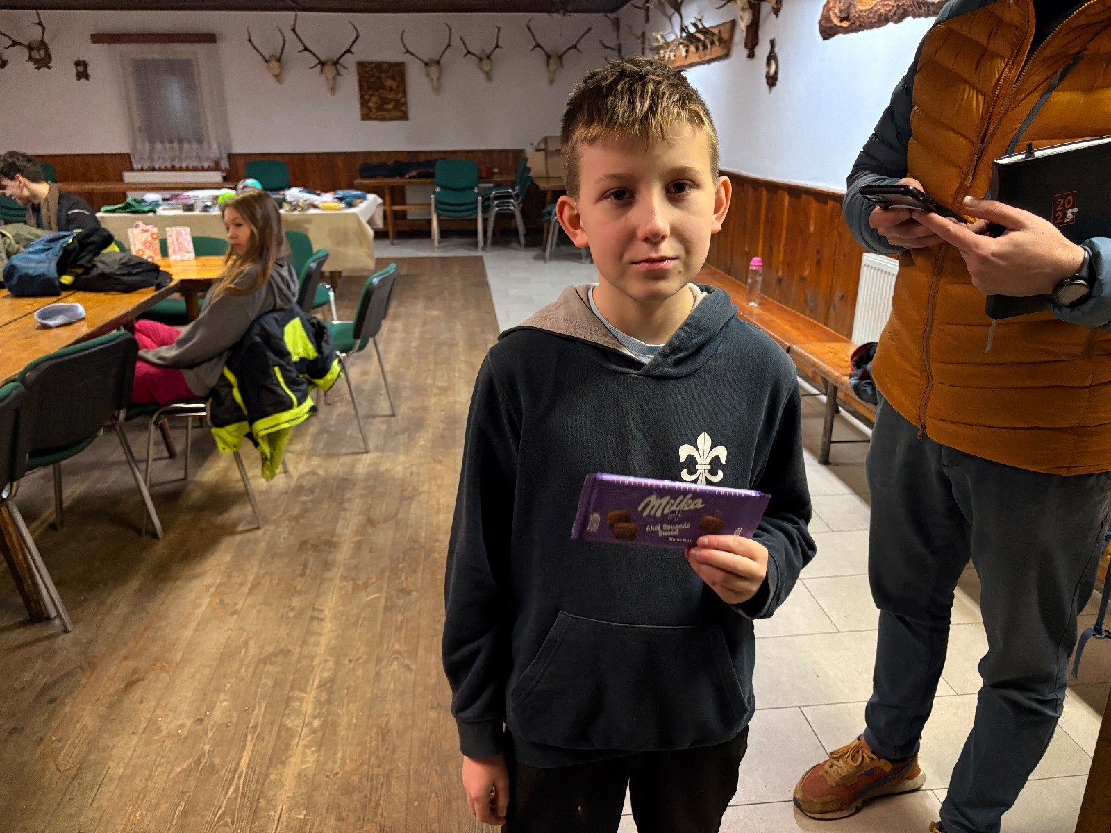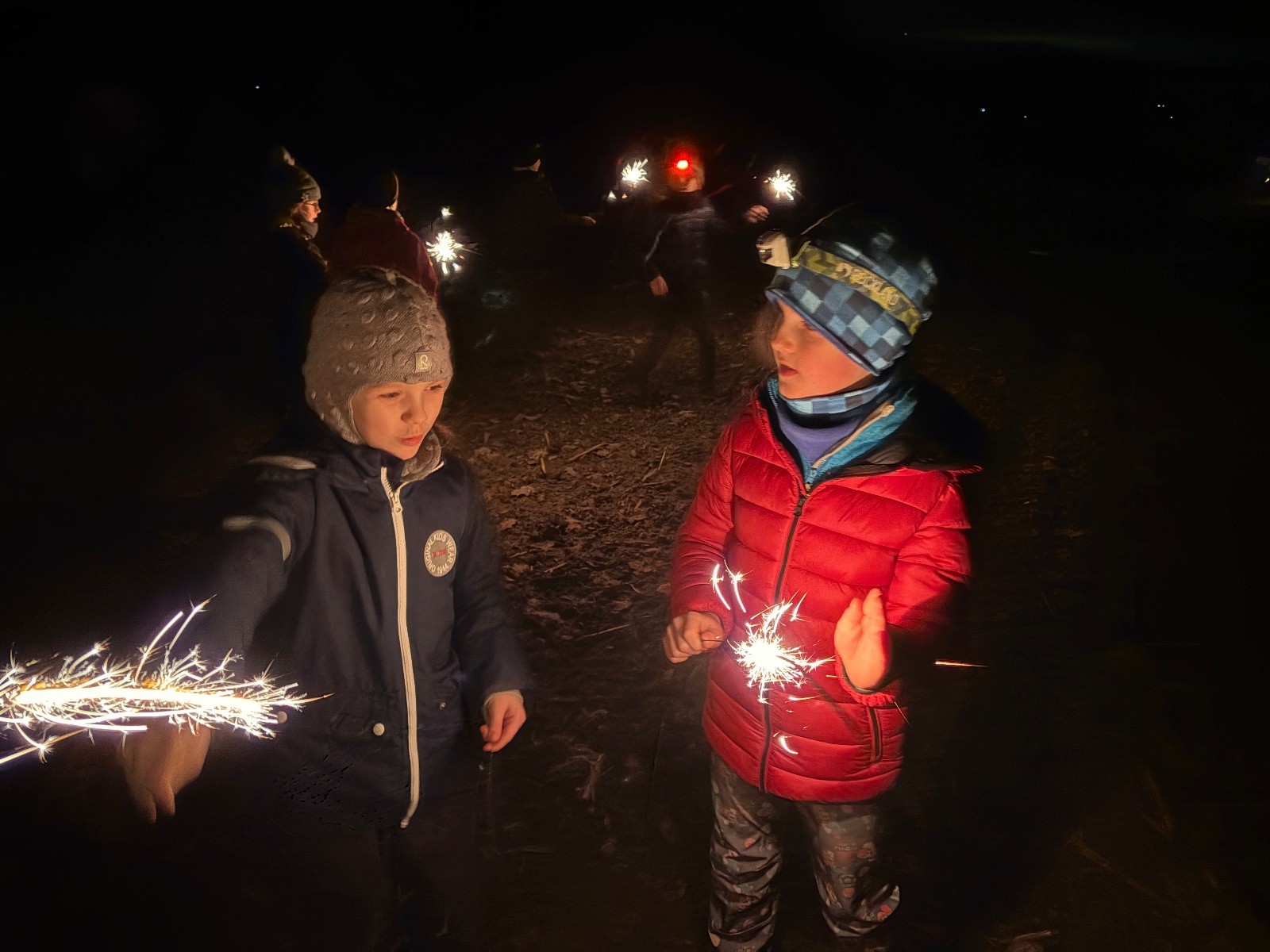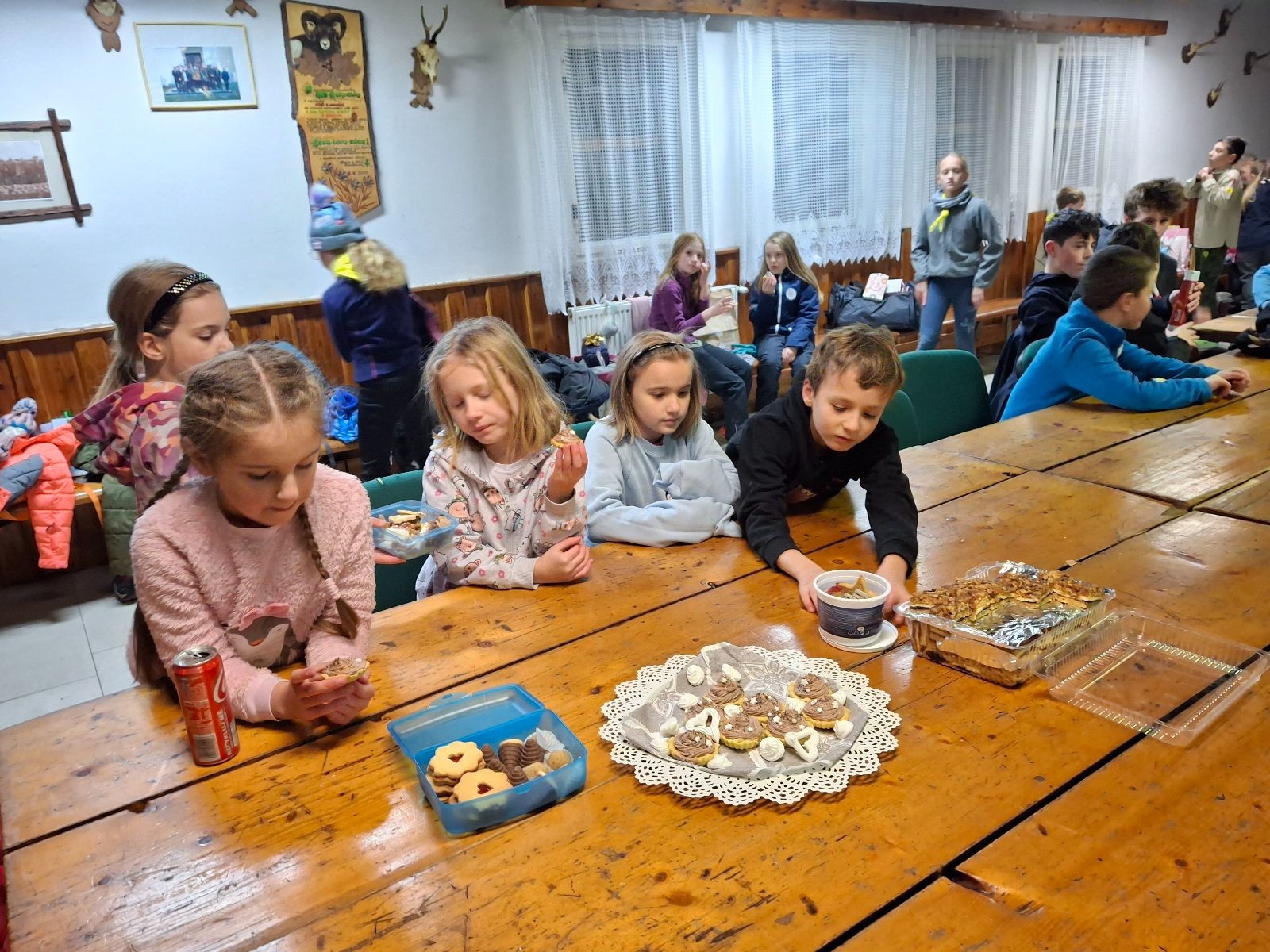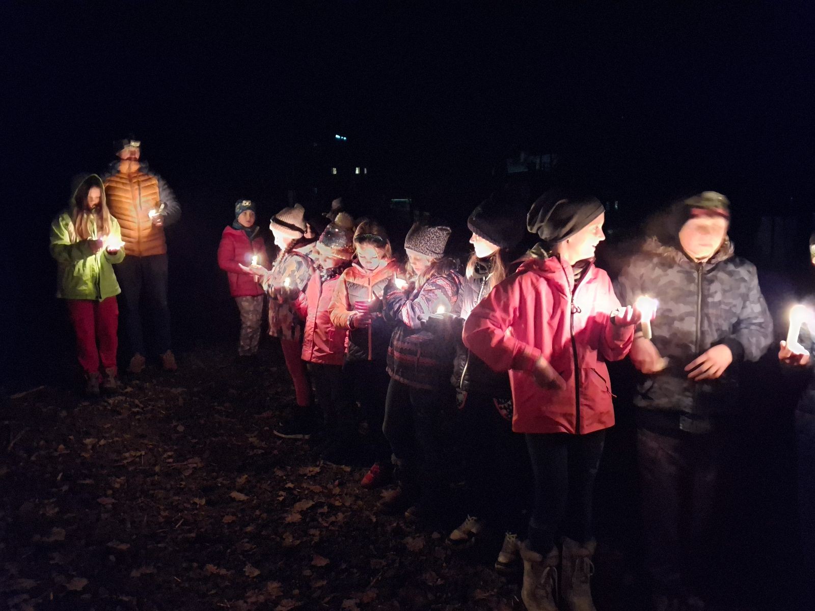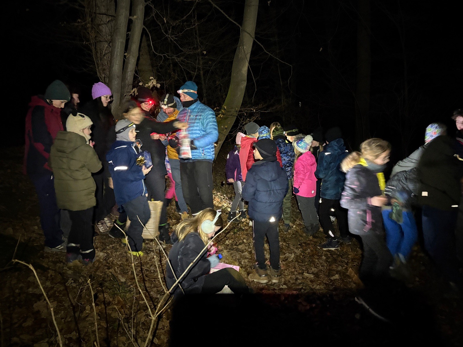 Okolo 17. hodiny se začínají slízat i ostatní členové družin. Setkáváme se v hojném počtu. Tak hojném, že bylo nad mé síly spočítat, kolik nás to vlastně bylo. I s vedoucími nás mohlo být přes 30, což je fajn účast. Mj. koukám i na svůj loňský zápis a zjišťuji, že jsem měl problém všechny sečíst i loni. Ne že bych měl problém se součty nad 30, ale vězte, že při stanovení počtu neustále se hemžící bandy skautů si nevystačíte s běžnou aritmetikou – tohle je spíš záležitost kvantové fyziky. Na rozjezd dáváme sfoukávanou. Docela to odsejpá, protože poměrně brzy zhasínají i ohnivci, kteří jako jediní mají pravomoc ostatním spoluhráčům odpalovat sfouknuté svíčky. Konečné skóre je 2:1 pro červené, kteří poslední kolo vyhrávají se slušnou přesilou. Pak se jdeme vyhřát do vytopené myslivny, kde nás čeká i cukroví od rodičů, babiček, dědečků a všech těch, co pečou. Obzvlášť velký dík patří paní Tončové, která nám tradičně poslala nálož skvělého medovníku s ořechy (OK, nevím, jestli to byl medovník, ale ořechy tam byly určitě a je to sakramentsky dobrý). A taky nevím, jestli je to tradice, ale rádi bychom z toho tradici udělali (mrk, mrk 🙂). Vyhlašujeme top účast a bodování, rozdáváme diplomy a ceny. Pak na sebe hážeme teplé oblečení a po světýlkách jdeme k vánočnímu stromku, kde každého člena čeká nějaký drobný dárek. Na poli zapalujeme prskavky a se svíčkami si dáváme kolečko přání, kde se nám daří být docela zticha, což je vzácný moment hodný zaznamenání. Pak zvedáme kotvy, míříme zpět k myslivně a rozprcháváme se domů.