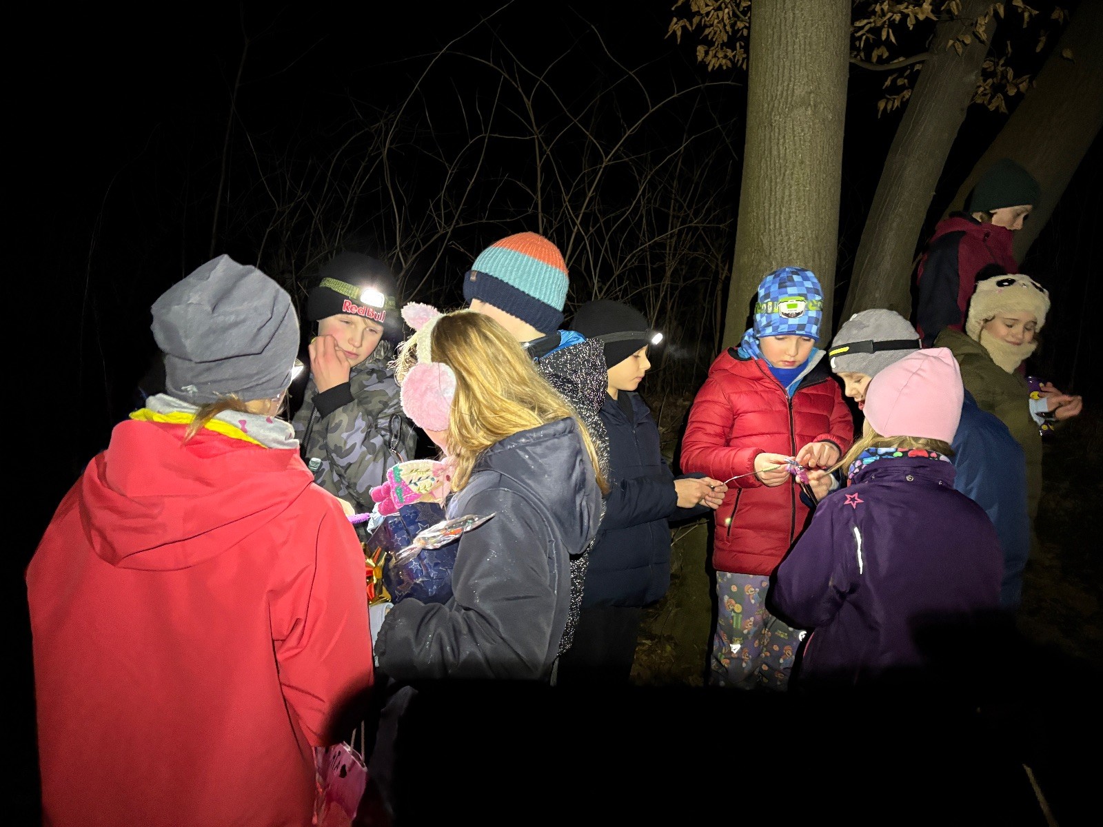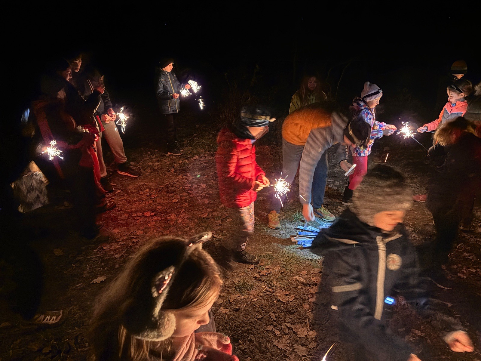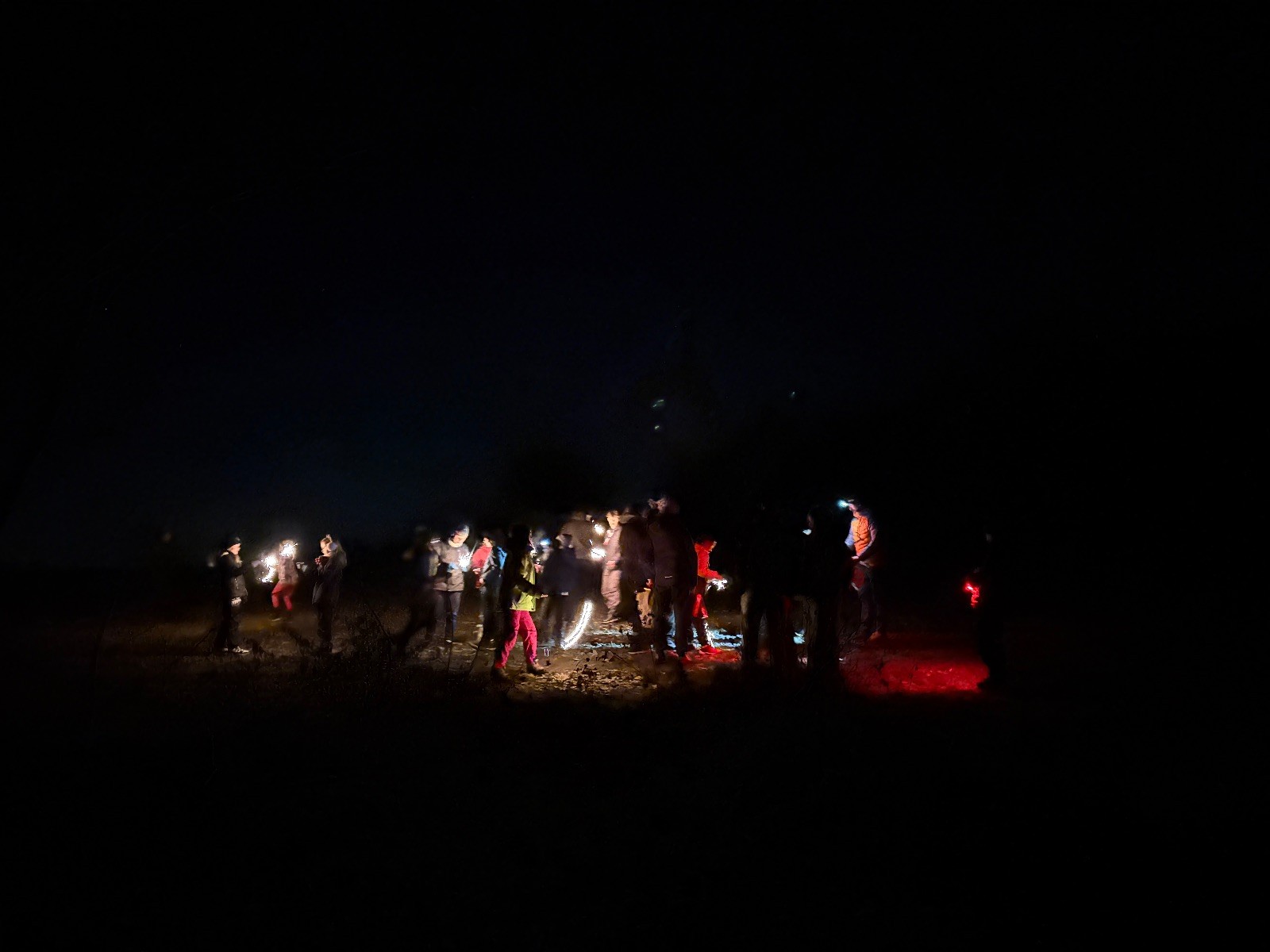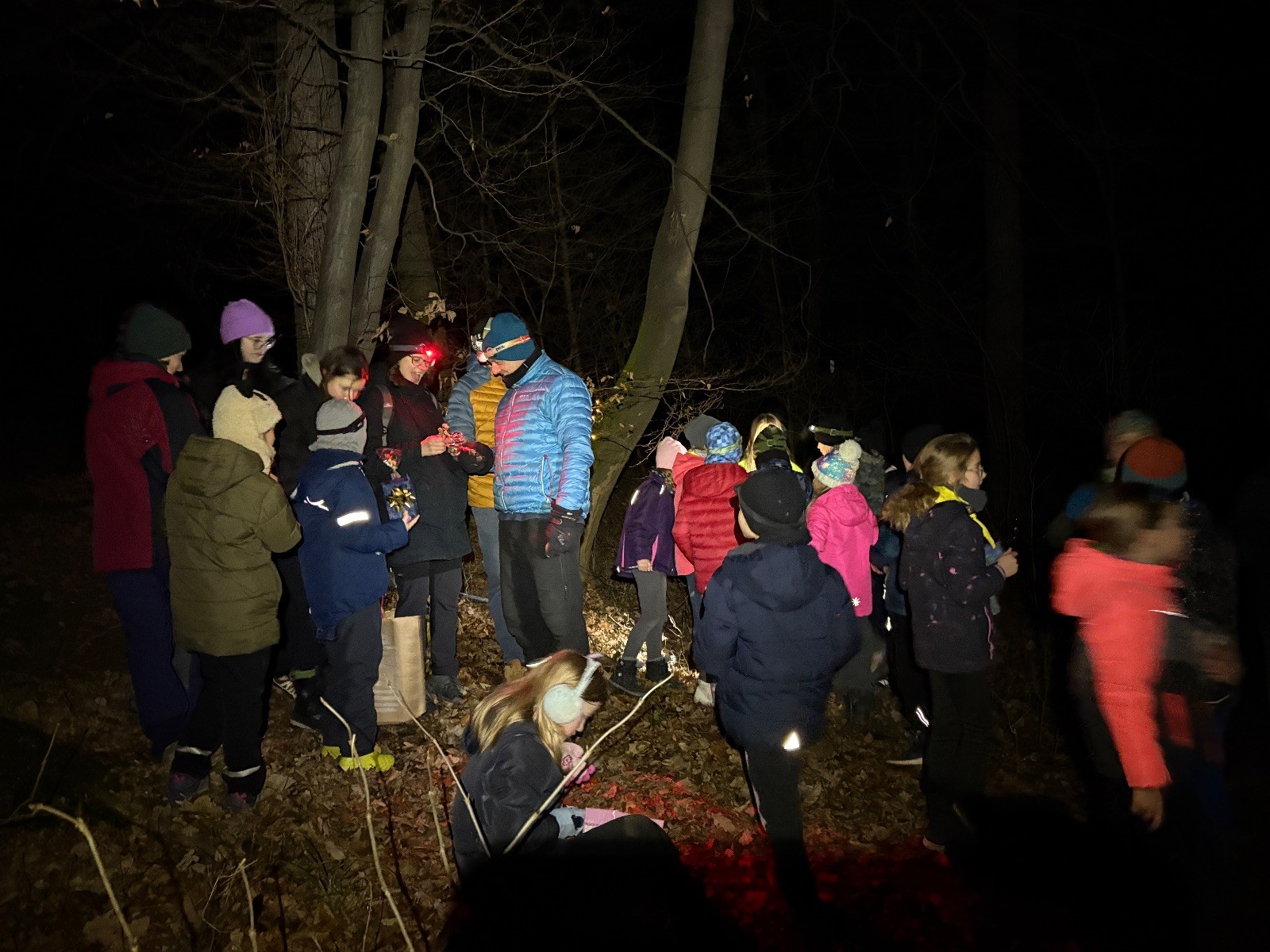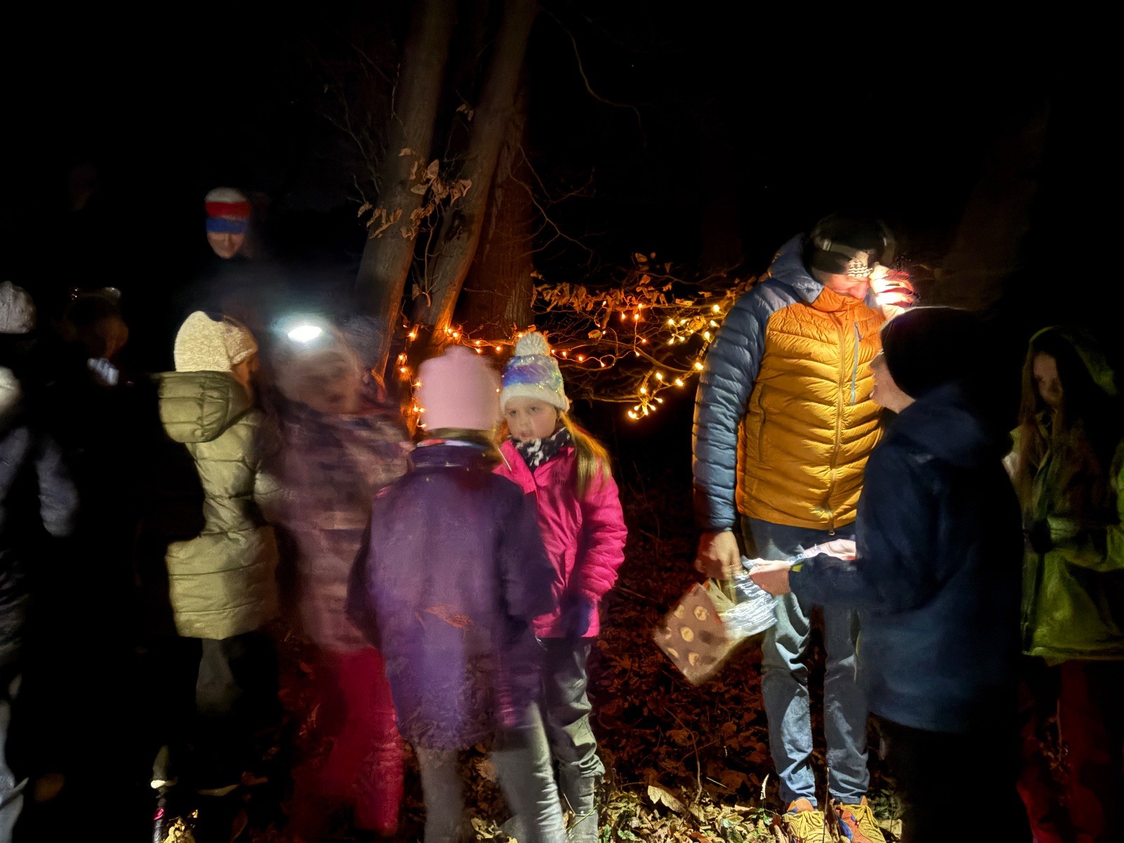 Okolo 17. hodiny se začínají slízat i ostatní členové družin. Setkáváme se v hojném počtu. Tak hojném, že bylo nad mé síly spočítat, kolik nás to vlastně bylo. I s vedoucími nás mohlo být přes 30, což je fajn účast. Mj. koukám i na svůj loňský zápis a zjišťuji, že jsem měl problém všechny sečíst i loni. Ne že bych měl problém se součty nad 30, ale vězte, že při stanovení počtu neustále se hemžící bandy skautů si nevystačíte s běžnou aritmetikou – tohle je spíš záležitost kvantové fyziky. Na rozjezd dáváme sfoukávanou. Docela to odsejpá, protože poměrně brzy zhasínají i ohnivci, kteří jako jediní mají pravomoc ostatním spoluhráčům odpalovat sfouknuté svíčky. Konečné skóre je 2:1 pro červené, kteří poslední kolo vyhrávají se slušnou přesilou. Pak se jdeme vyhřát do vytopené myslivny, kde nás čeká i cukroví od rodičů, babiček, dědečků a všech těch, co pečou. Obzvlášť velký dík patří paní Tončové, která nám tradičně poslala nálož skvělého medovníku s ořechy (OK, nevím, jestli to byl medovník, ale ořechy tam byly určitě a je to sakramentsky dobrý). A taky nevím, jestli je to tradice, ale rádi bychom z toho tradici udělali (mrk, mrk 🙂). Vyhlašujeme top účast a bodování, rozdáváme diplomy a ceny. Pak na sebe hážeme teplé oblečení a po světýlkách jdeme k vánočnímu stromku, kde každého člena čeká nějaký drobný dárek. Na poli zapalujeme prskavky a se svíčkami si dáváme kolečko přání, kde se nám daří být docela zticha, což je vzácný moment hodný zaznamenání. Pak zvedáme kotvy, míříme zpět k myslivně a rozprcháváme se domů.