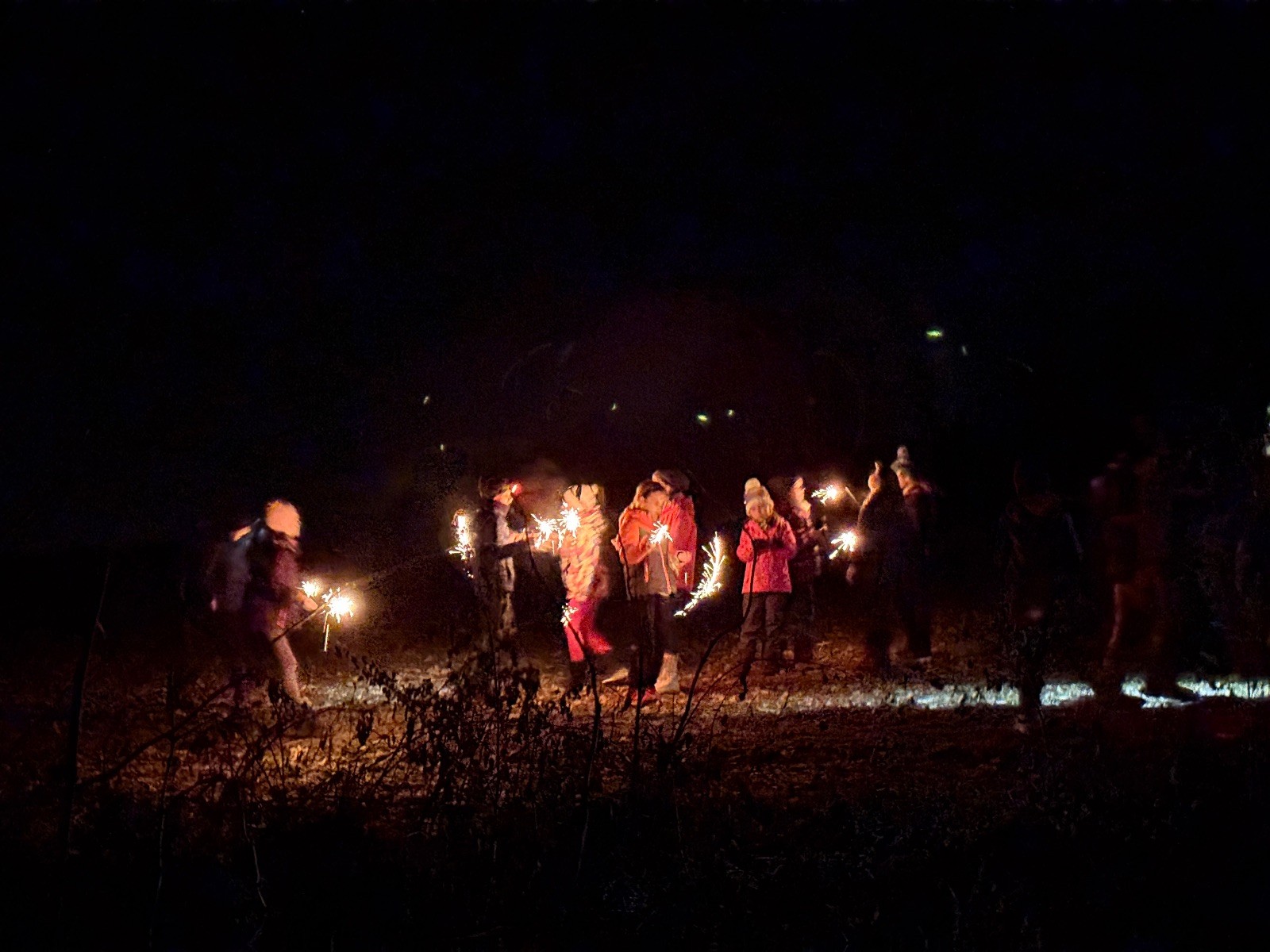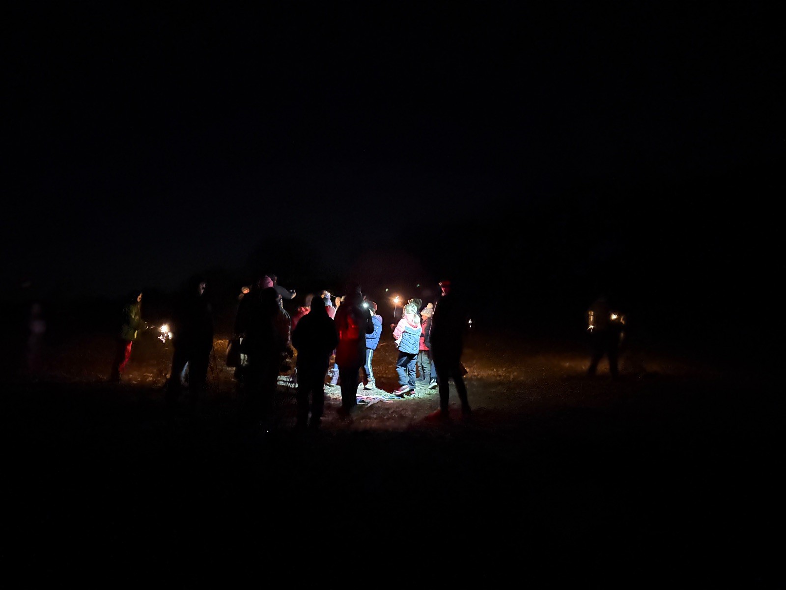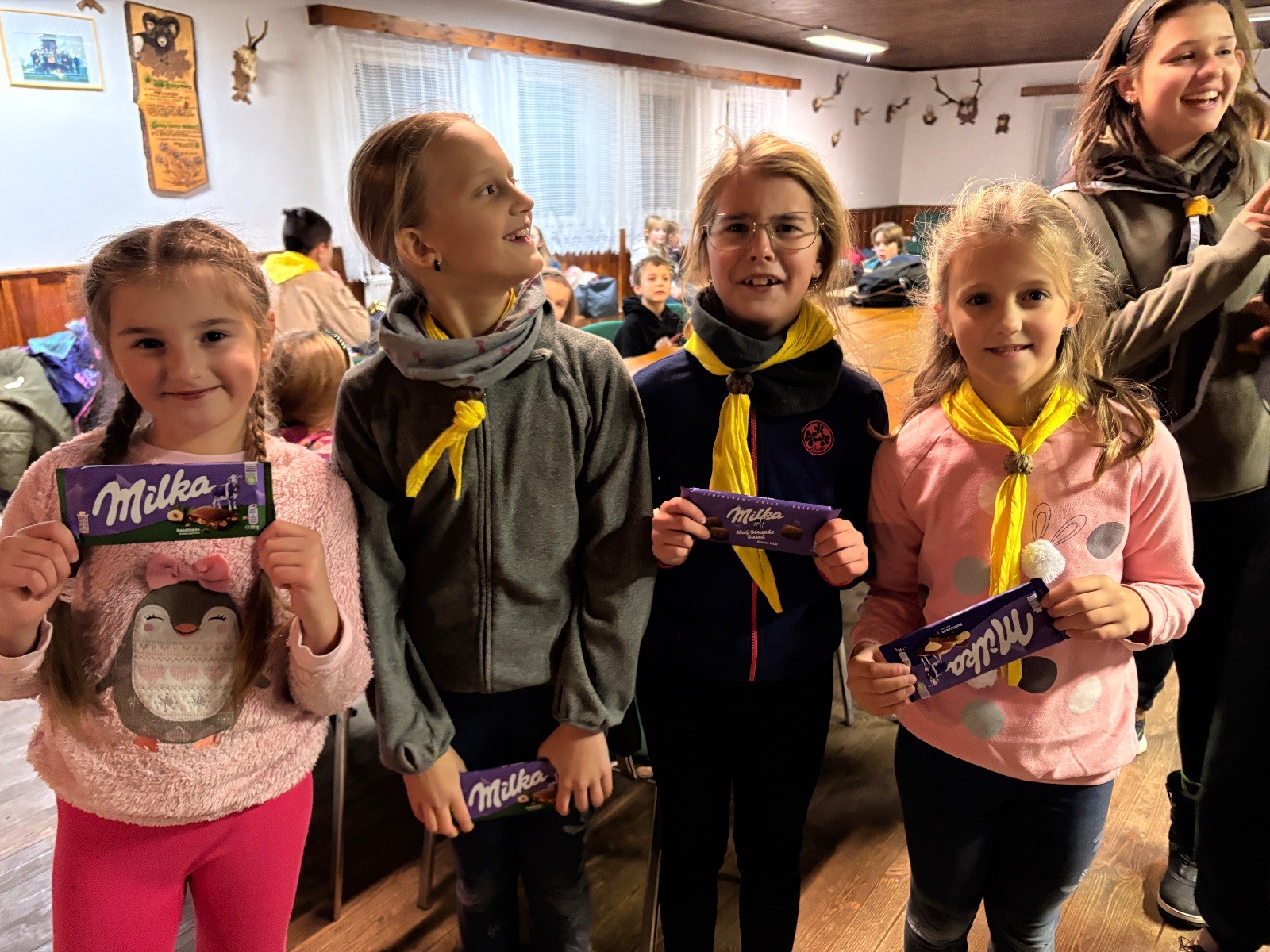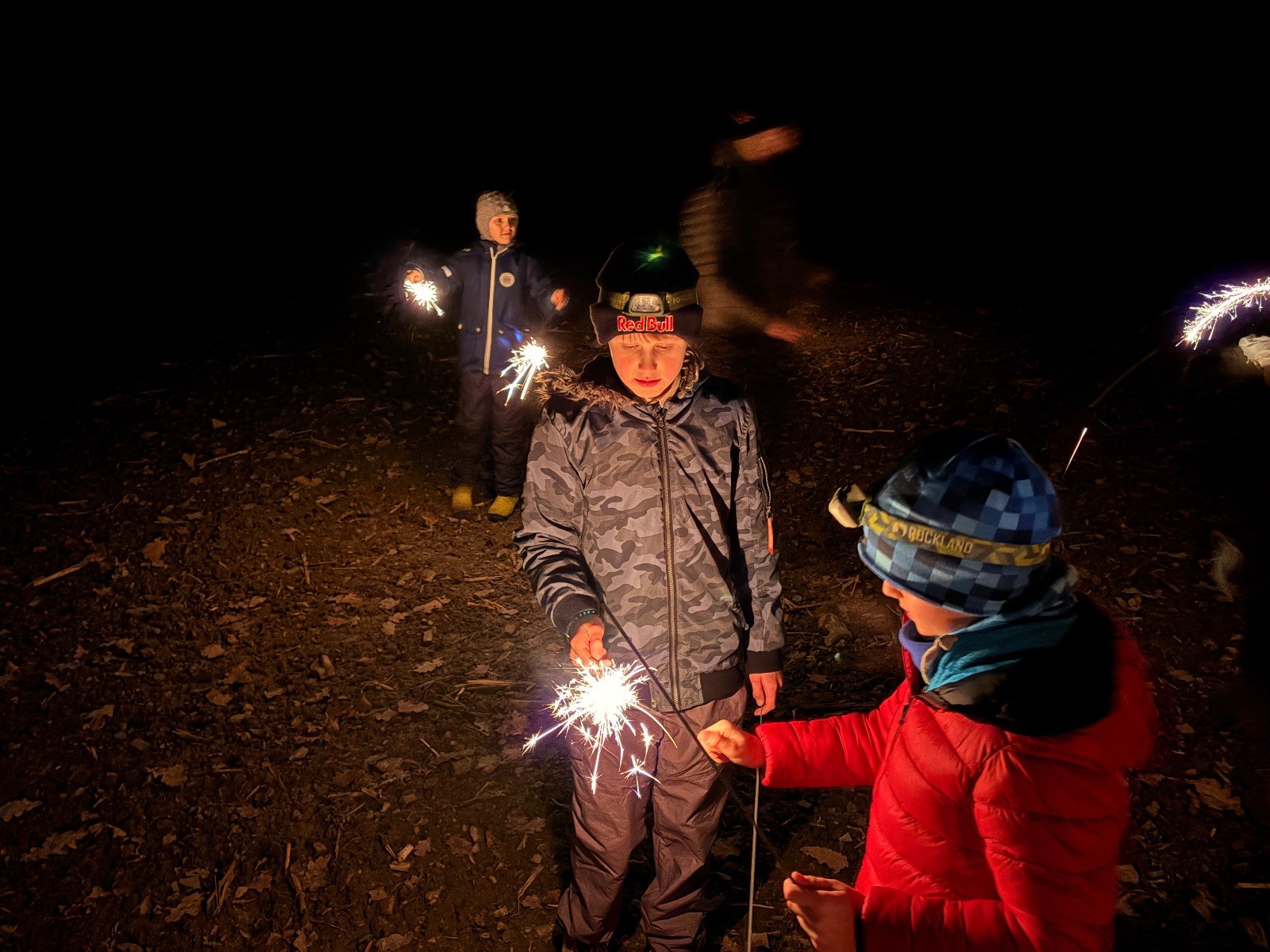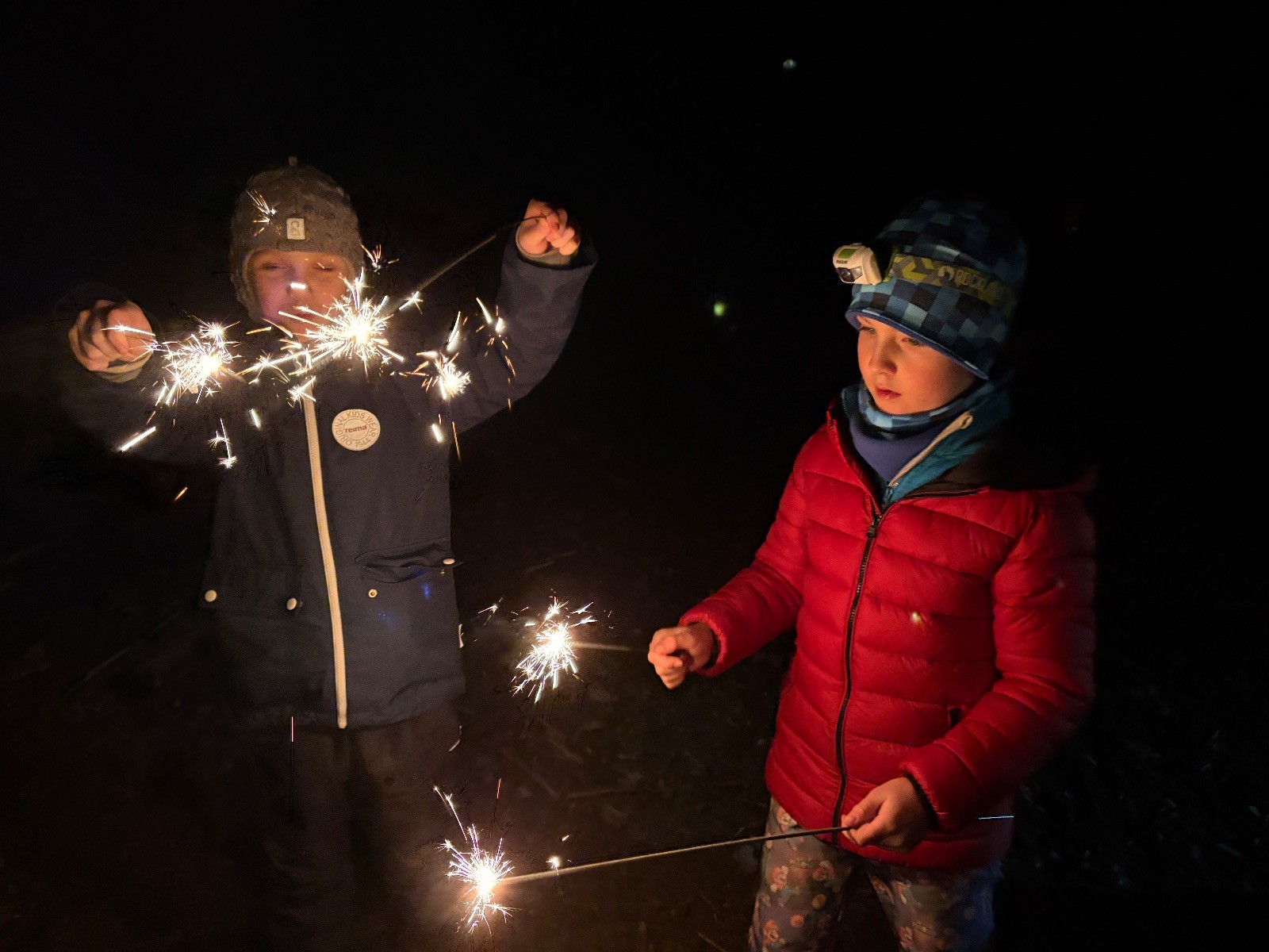 Okolo 17. hodiny se začínají slízat i ostatní členové družin. Setkáváme se v hojném počtu. Tak hojném, že bylo nad mé síly spočítat, kolik nás to vlastně bylo. I s vedoucími nás mohlo být přes 30, což je fajn účast. Mj. koukám i na svůj loňský zápis a zjišťuji, že jsem měl problém všechny sečíst i loni. Ne že bych měl problém se součty nad 30, ale vězte, že při stanovení počtu neustále se hemžící bandy skautů si nevystačíte s běžnou aritmetikou – tohle je spíš záležitost kvantové fyziky. Na rozjezd dáváme sfoukávanou. Docela to odsejpá, protože poměrně brzy zhasínají i ohnivci, kteří jako jediní mají pravomoc ostatním spoluhráčům odpalovat sfouknuté svíčky. Konečné skóre je 2:1 pro červené, kteří poslední kolo vyhrávají se slušnou přesilou. Pak se jdeme vyhřát do vytopené myslivny, kde nás čeká i cukroví od rodičů, babiček, dědečků a všech těch, co pečou. Obzvlášť velký dík patří paní Tončové, která nám tradičně poslala nálož skvělého medovníku s ořechy (OK, nevím, jestli to byl medovník, ale ořechy tam byly určitě a je to sakramentsky dobrý). A taky nevím, jestli je to tradice, ale rádi bychom z toho tradici udělali (mrk, mrk 🙂). Vyhlašujeme top účast a bodování, rozdáváme diplomy a ceny. Pak na sebe hážeme teplé oblečení a po světýlkách jdeme k vánočnímu stromku, kde každého člena čeká nějaký drobný dárek. Na poli zapalujeme prskavky a se svíčkami si dáváme kolečko přání, kde se nám daří být docela zticha, což je vzácný moment hodný zaznamenání. Pak zvedáme kotvy, míříme zpět k myslivně a rozprcháváme se domů.