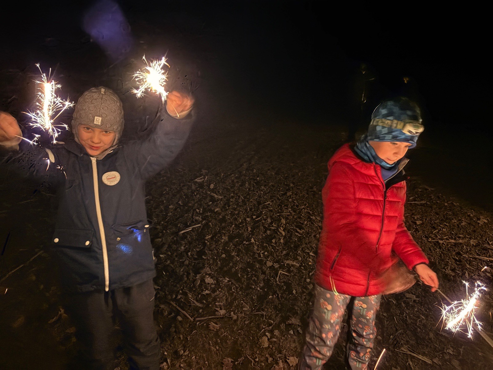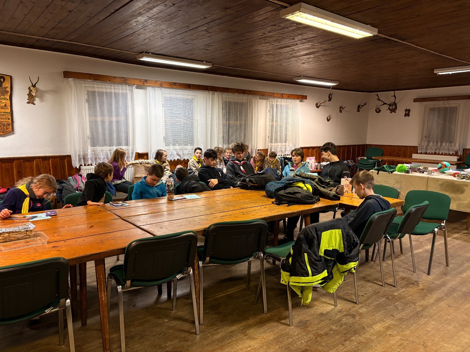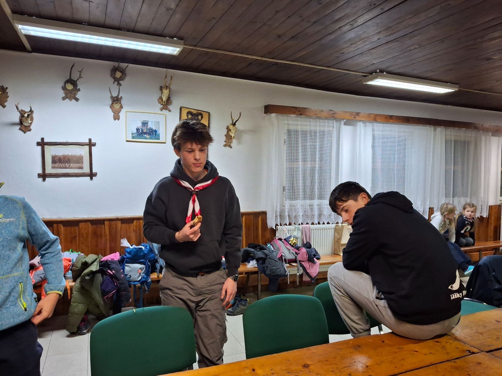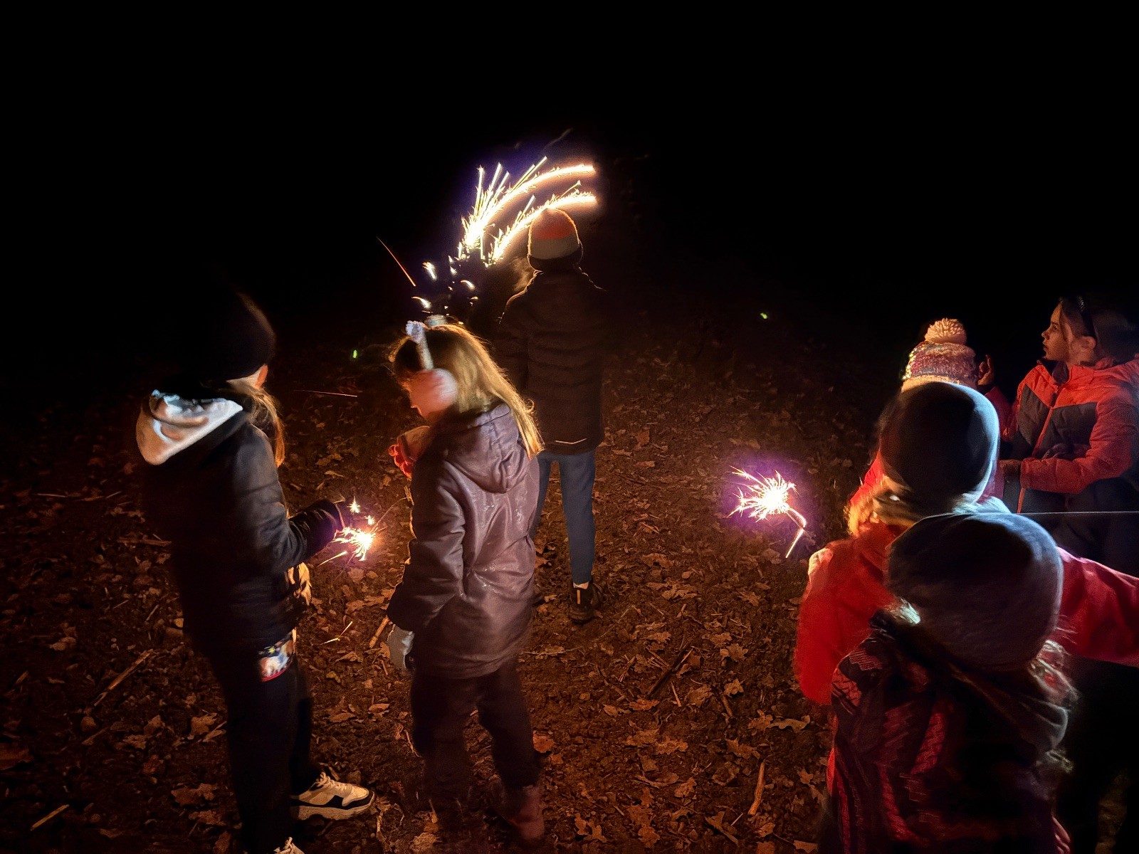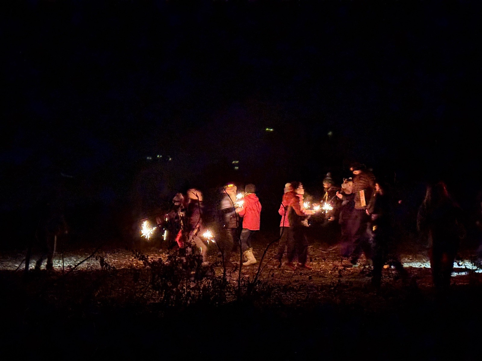 Okolo 17. hodiny se začínají slízat i ostatní členové družin. Setkáváme se v hojném počtu. Tak hojném, že bylo nad mé síly spočítat, kolik nás to vlastně bylo. I s vedoucími nás mohlo být přes 30, což je fajn účast. Mj. koukám i na svůj loňský zápis a zjišťuji, že jsem měl problém všechny sečíst i loni. Ne že bych měl problém se součty nad 30, ale vězte, že při stanovení počtu neustále se hemžící bandy skautů si nevystačíte s běžnou aritmetikou – tohle je spíš záležitost kvantové fyziky. Na rozjezd dáváme sfoukávanou. Docela to odsejpá, protože poměrně brzy zhasínají i ohnivci, kteří jako jediní mají pravomoc ostatním spoluhráčům odpalovat sfouknuté svíčky. Konečné skóre je 2:1 pro červené, kteří poslední kolo vyhrávají se slušnou přesilou. Pak se jdeme vyhřát do vytopené myslivny, kde nás čeká i cukroví od rodičů, babiček, dědečků a všech těch, co pečou. Obzvlášť velký dík patří paní Tončové, která nám tradičně poslala nálož skvělého medovníku s ořechy (OK, nevím, jestli to byl medovník, ale ořechy tam byly určitě a je to sakramentsky dobrý). A taky nevím, jestli je to tradice, ale rádi bychom z toho tradici udělali (mrk, mrk 🙂). Vyhlašujeme top účast a bodování, rozdáváme diplomy a ceny. Pak na sebe hážeme teplé oblečení a po světýlkách jdeme k vánočnímu stromku, kde každého člena čeká nějaký drobný dárek. Na poli zapalujeme prskavky a se svíčkami si dáváme kolečko přání, kde se nám daří být docela zticha, což je vzácný moment hodný zaznamenání. Pak zvedáme kotvy, míříme zpět k myslivně a rozprcháváme se domů.