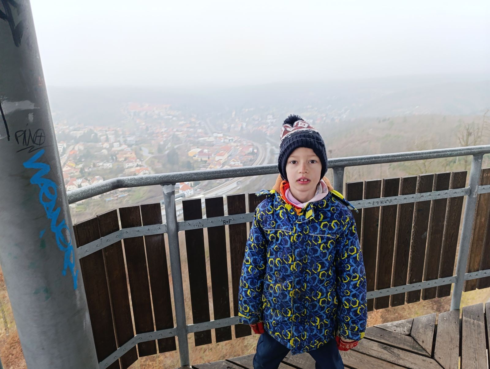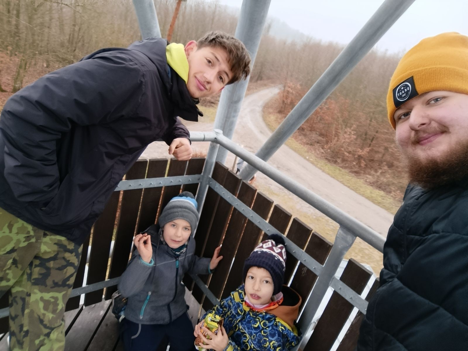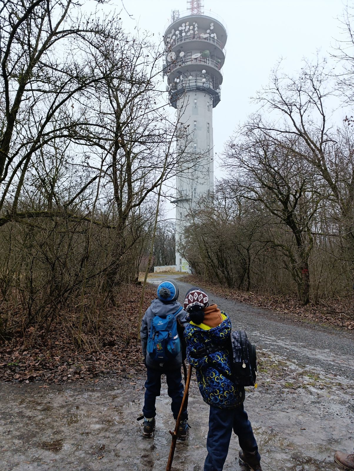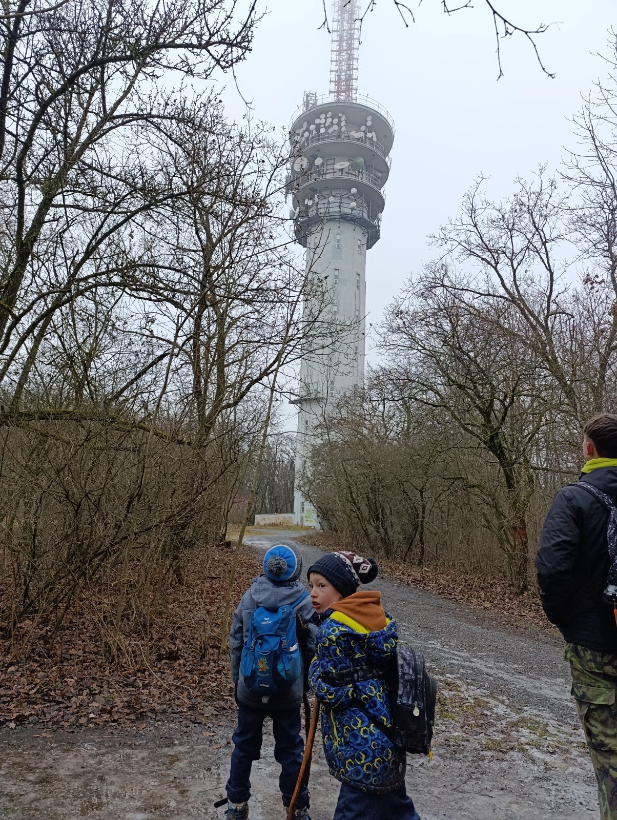 Ráno jsme se rychle sbalili, převlekli, nasnídali a vyrazili na trolejbus. Cesta trolejbusem uběhla rychle a hned jak jsme vystoupili tak jsme začali počítat, okolo kolika turistických značek projdeme. Před rozhlednou jsme měli jednu zastávku u studánky a druhou u altánku kde jsme měli svačinu. Když jsme dorazili na rozhlednu tak Ondra svižně vyběhl navrch. Jindra se ze začátku bál ale po obědě a mnoha pokusech vystoupal až do druhého patra. Jindra zdolal 46 schodů a Ondra celých 131. Na cestě zpátky nás čekala zřícenina hradu, od které kluci očekávali více, a před kterým poprvé za cestu zaznělo "bolí mě nohy". Poslední atrakce naší cesty byl vysílač Hády a poté jsme se vydali zpátky na zastávku, kde kluci záhadně zase měli plno energie. Když jsme dorazili tak jsme se sbalili a uklidili Boudu právě včas, protože zrovna přicházeli rodiče.