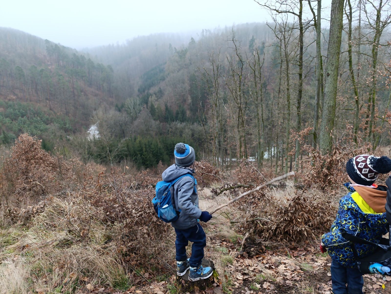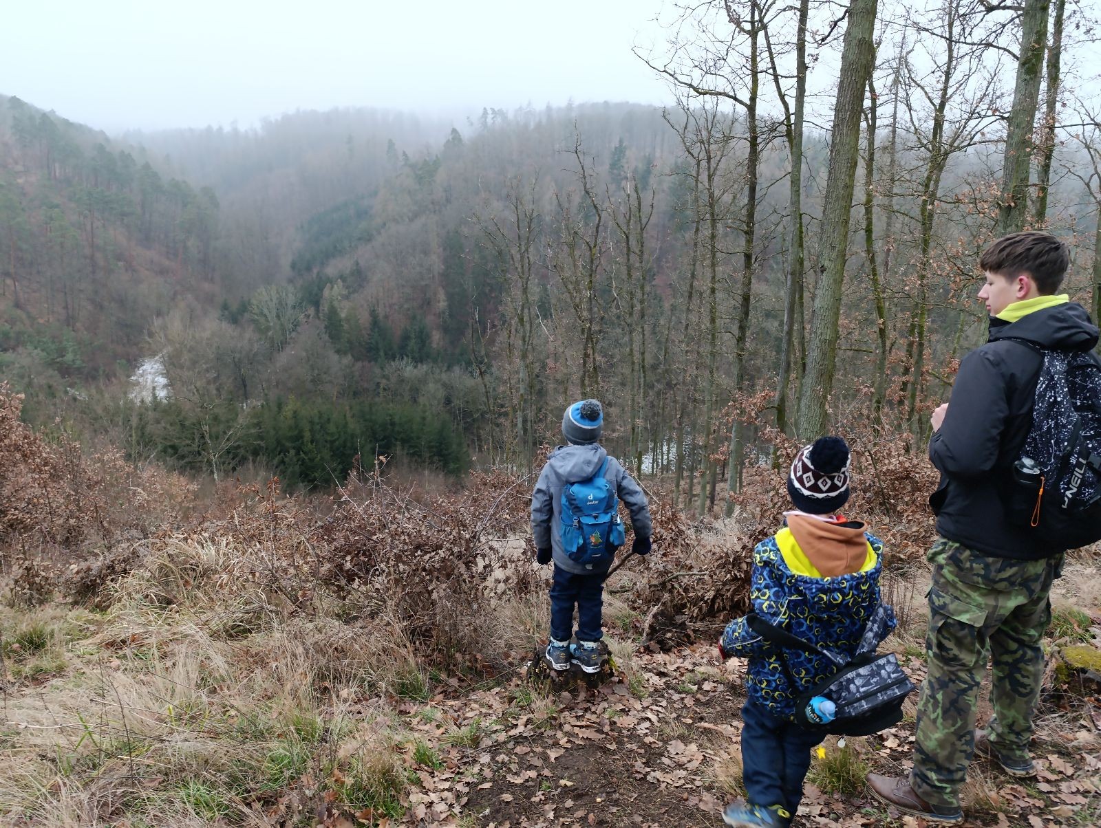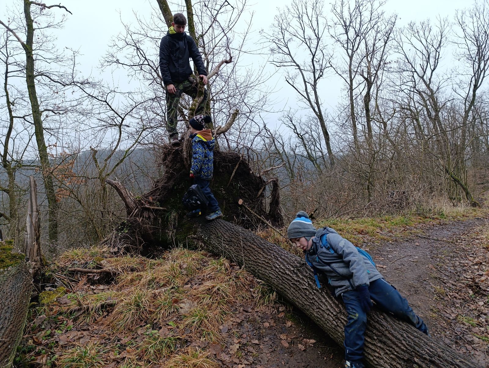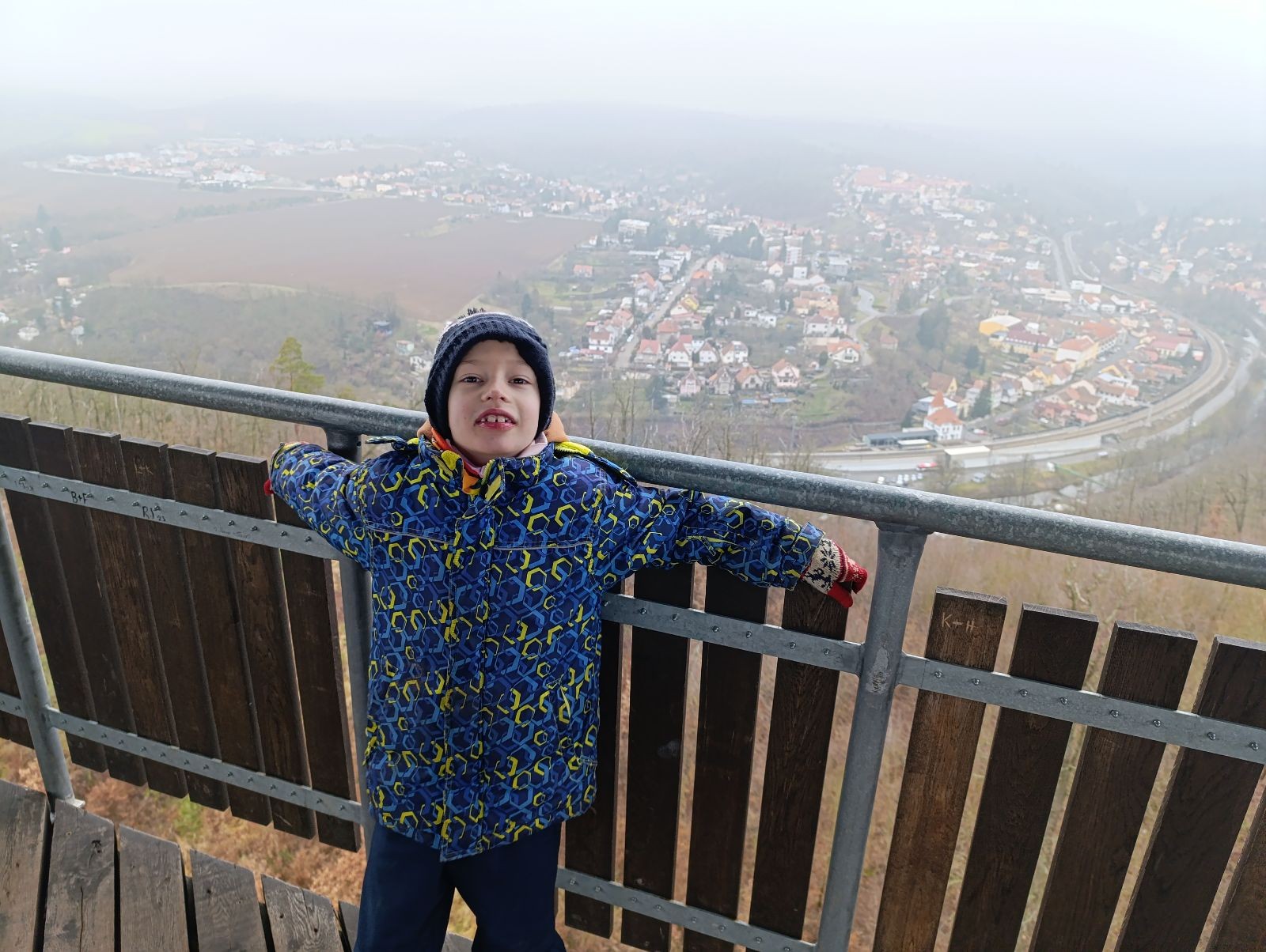 Ráno jsme se rychle sbalili, převlekli, nasnídali a vyrazili na trolejbus. Cesta trolejbusem uběhla rychle a hned jak jsme vystoupili tak jsme začali počítat, okolo kolika turistických značek projdeme. Před rozhlednou jsme měli jednu zastávku u studánky a druhou u altánku kde jsme měli svačinu. Když jsme dorazili na rozhlednu tak Ondra svižně vyběhl navrch. Jindra se ze začátku bál ale po obědě a mnoha pokusech vystoupal až do druhého patra. Jindra zdolal 46 schodů a Ondra celých 131. Na cestě zpátky nás čekala zřícenina hradu, od které kluci očekávali více, a před kterým poprvé za cestu zaznělo "bolí mě nohy". Poslední atrakce naší cesty byl vysílač Hády a poté jsme se vydali zpátky na zastávku, kde kluci záhadně zase měli plno energie. Když jsme dorazili tak jsme se sbalili a uklidili Boudu právě včas, protože zrovna přicházeli rodiče.