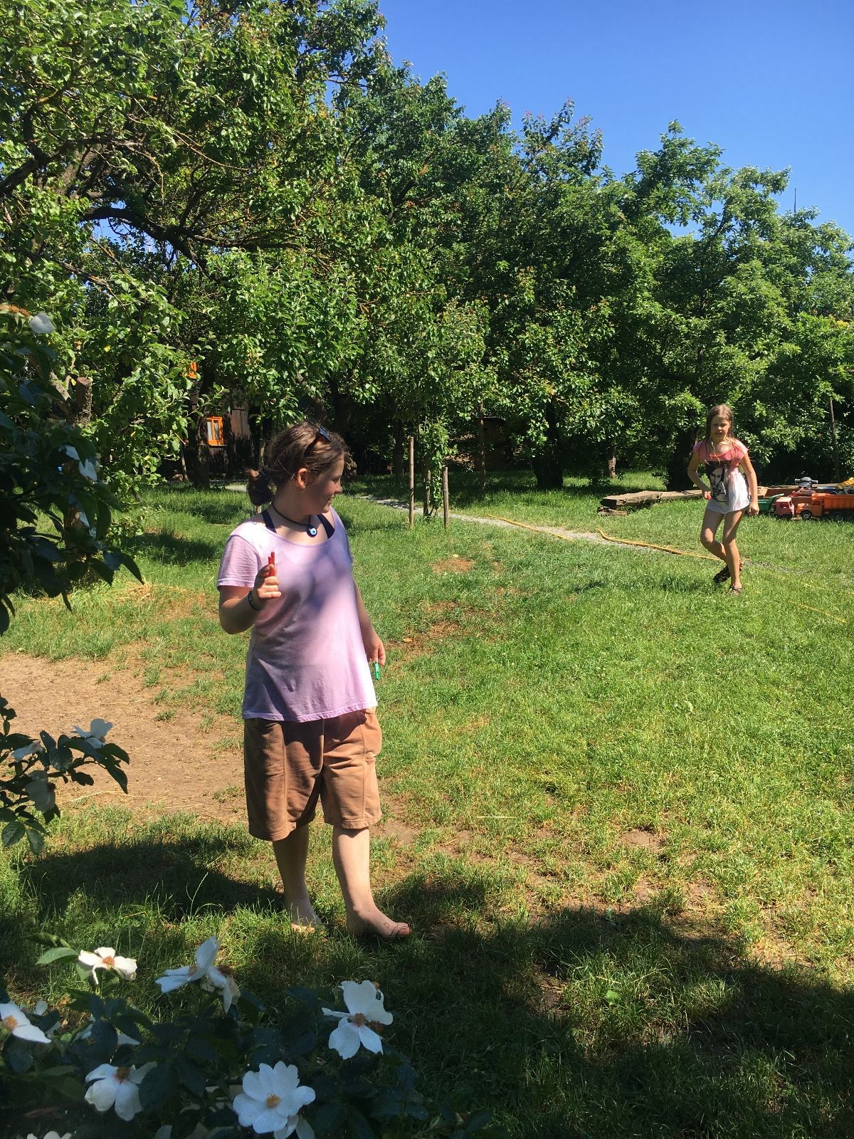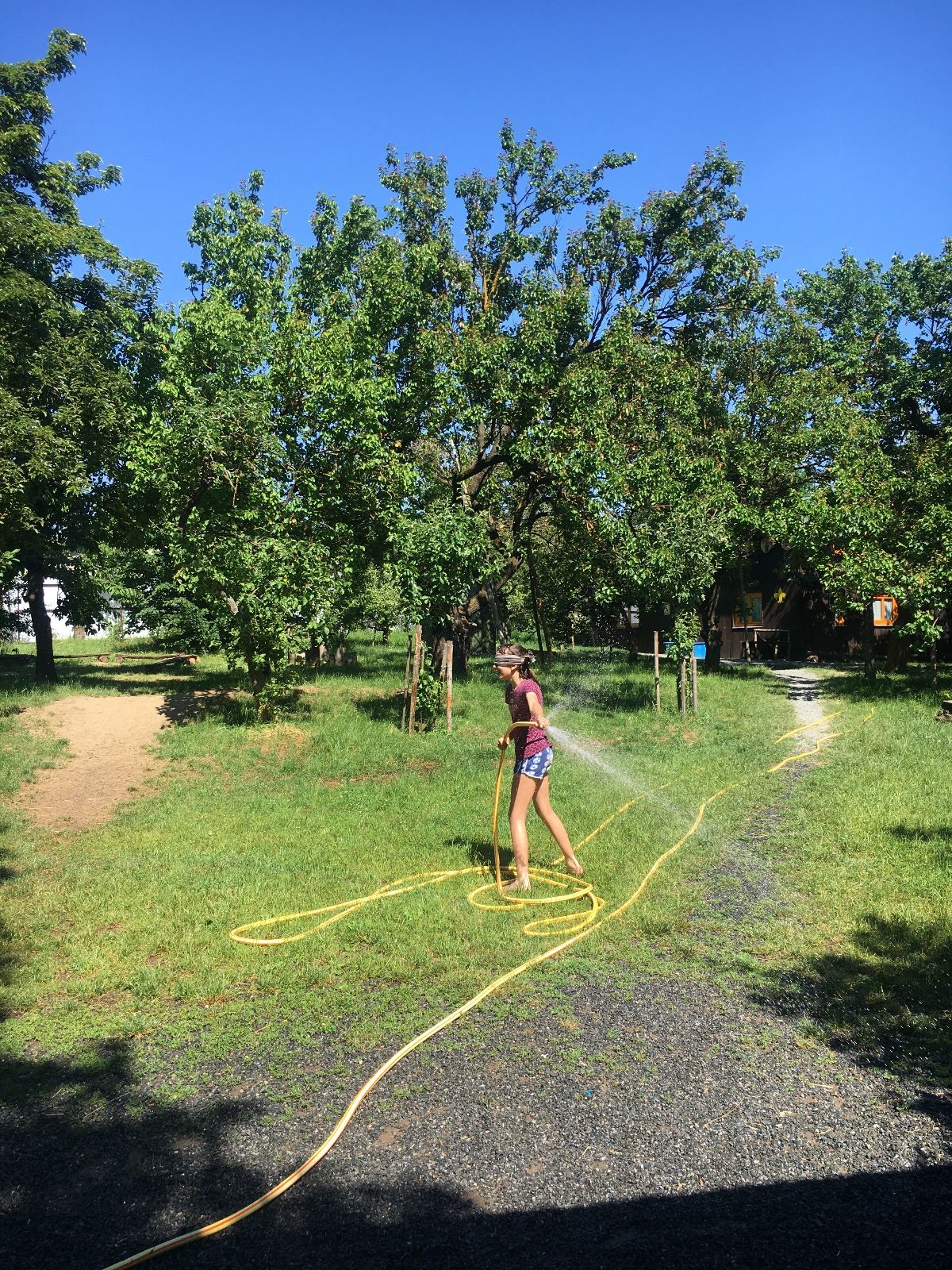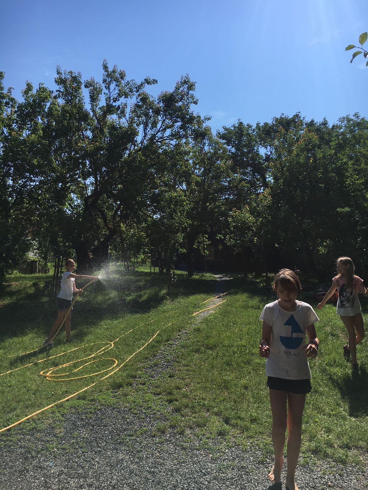 V sobotu 19.6. jsme se ve dvě hodiny odpoledne sešly v poněkud komorním počtu. Přišla Nelča, Andělka a Nikča, potom Davida a já. Původní plán byl vyjít rovnou na výlet na Stránskou skálu, ale kvůli přetrvávajícím třícítkám jsme se rozhodly strávit odpoledne na Boudě ve stínu. Vytáhly jsme hadici a průběžně se chladily studenou vodou. Byla to hrozná sranda, všechny jsme se nasmály a dokonce jsme si zahrály hru s hadicí a kolíčky. Po nějakém čase stráveném na Boudě jsme vyrazily na náměstí do cukrárny na zmrzku a cestou jsme se zastavily i v parku, kde se holky dost vyblbly. Kolem 5. hodiny jsme se vrátily zpět na Boudu a to už se k nám přidala i Julča, která dřívější sraz nestíhala. Takže nás bylo šest. Holky se dozvědely program sobotního večera - již druhý ročník soutěže Kudlanky mají talent! Asi do sedmi hodin měly čas na přípravu.