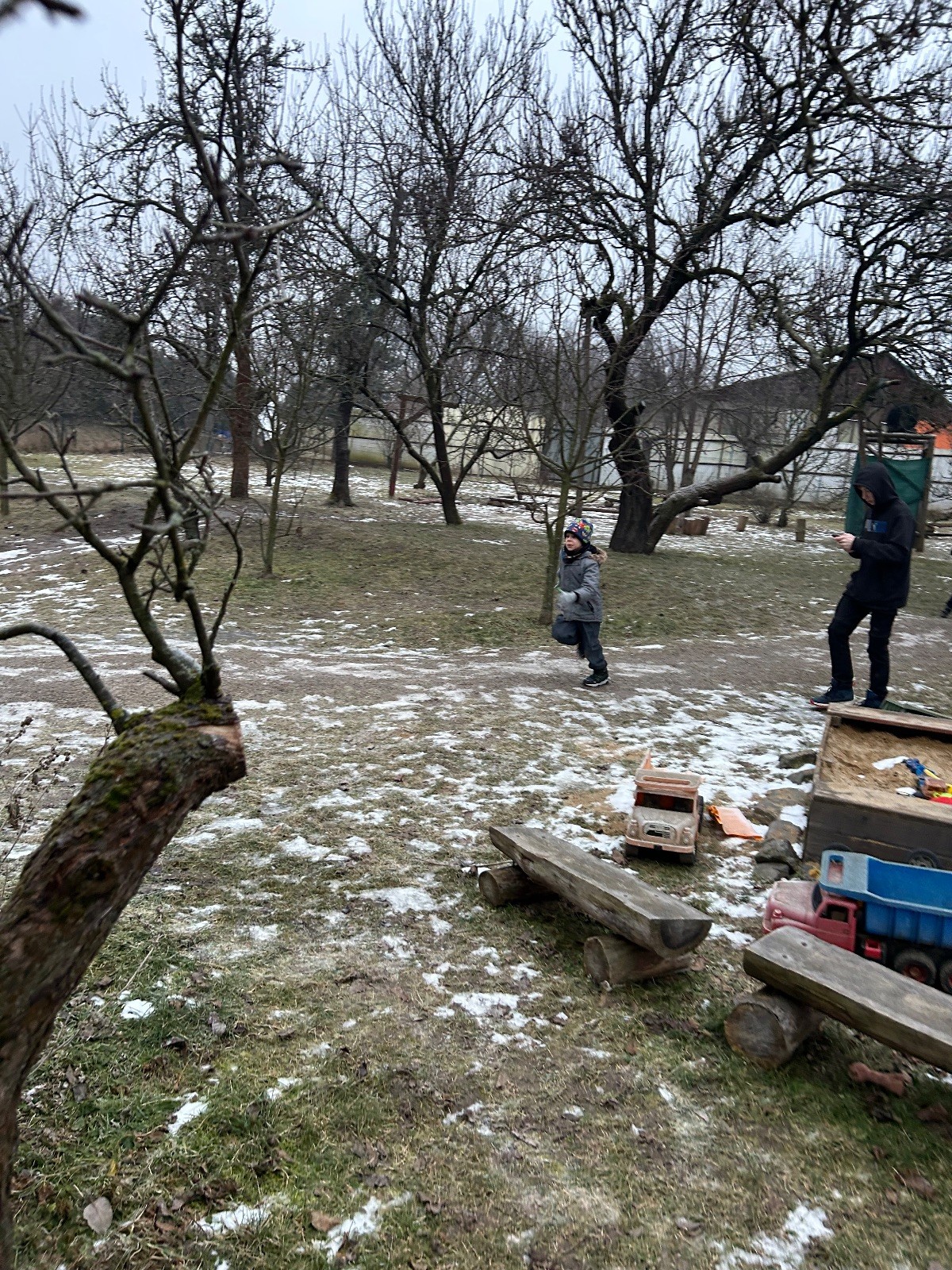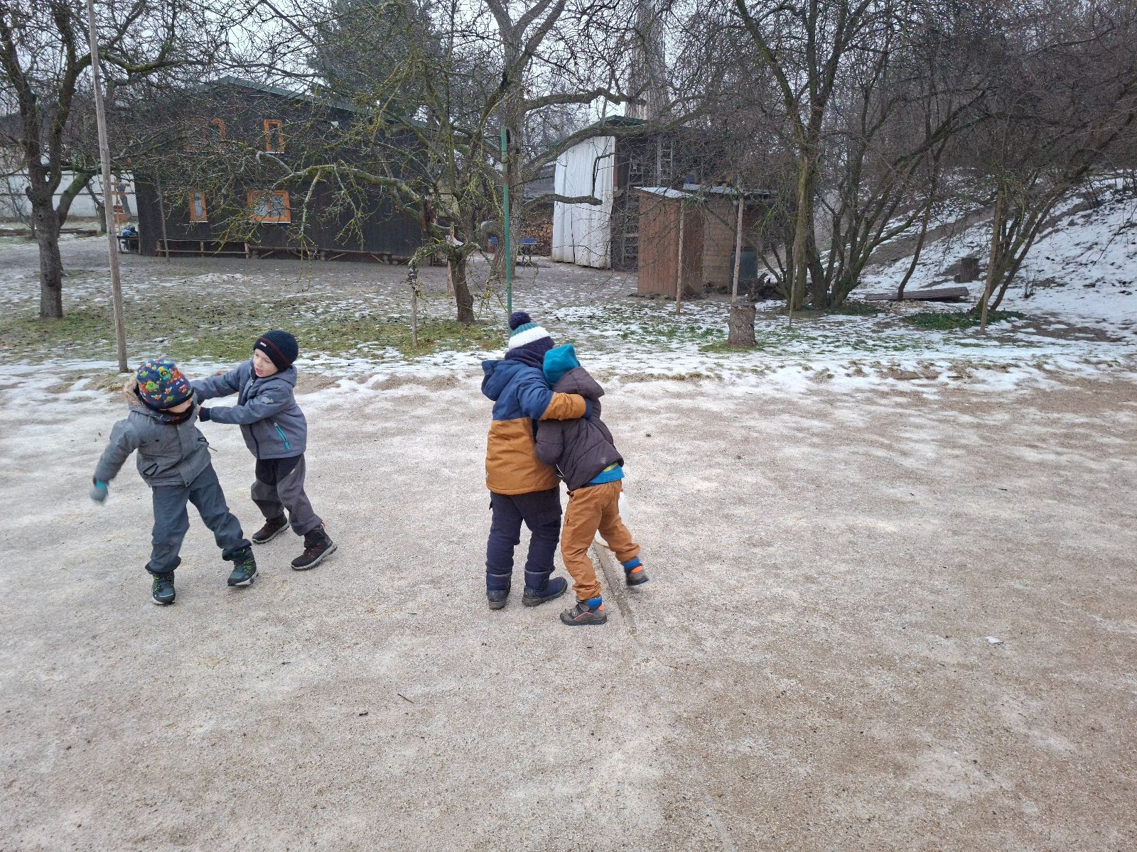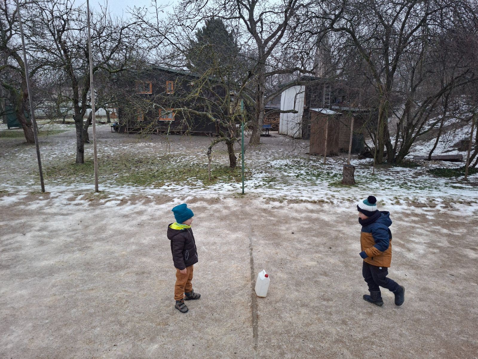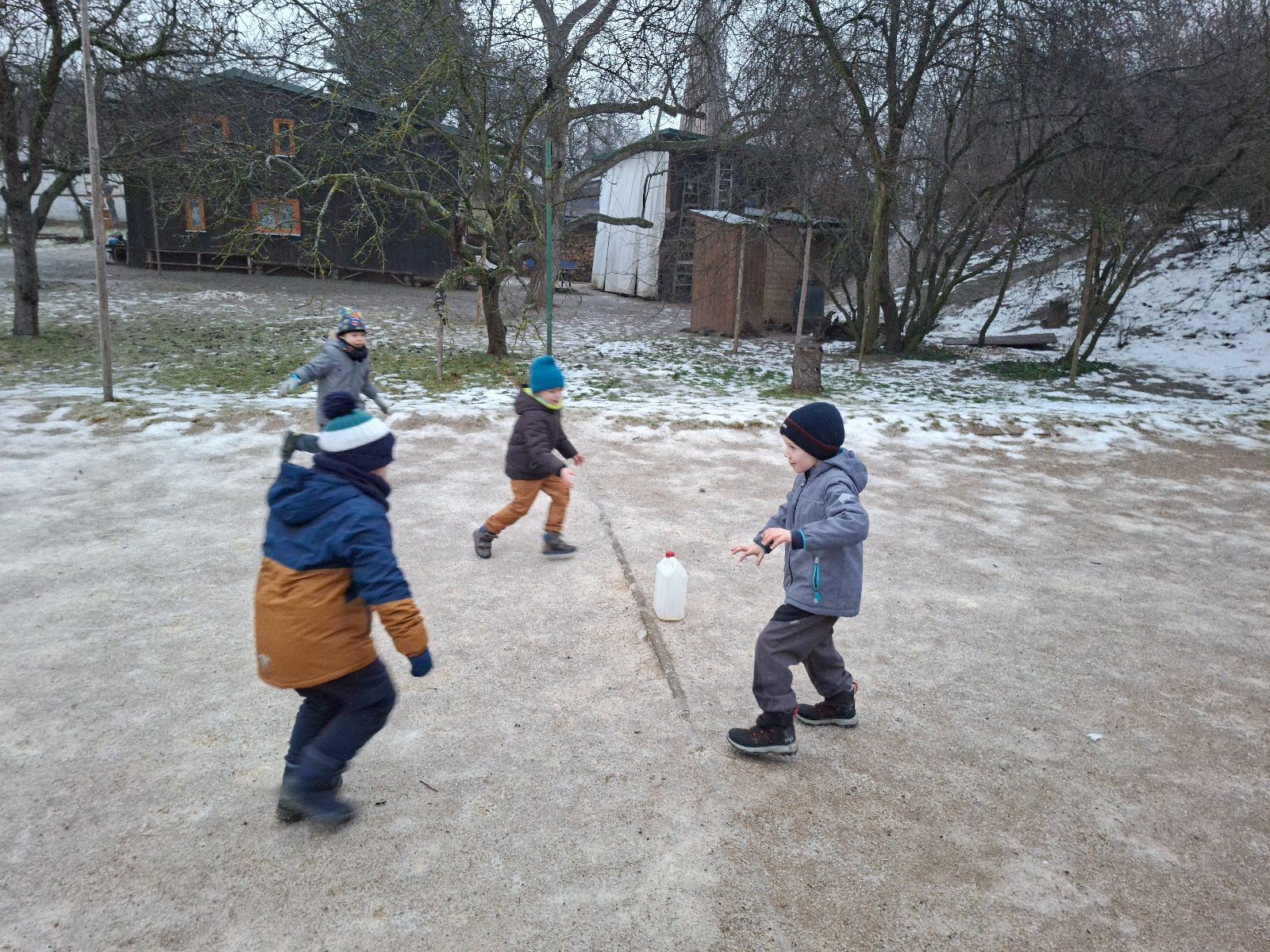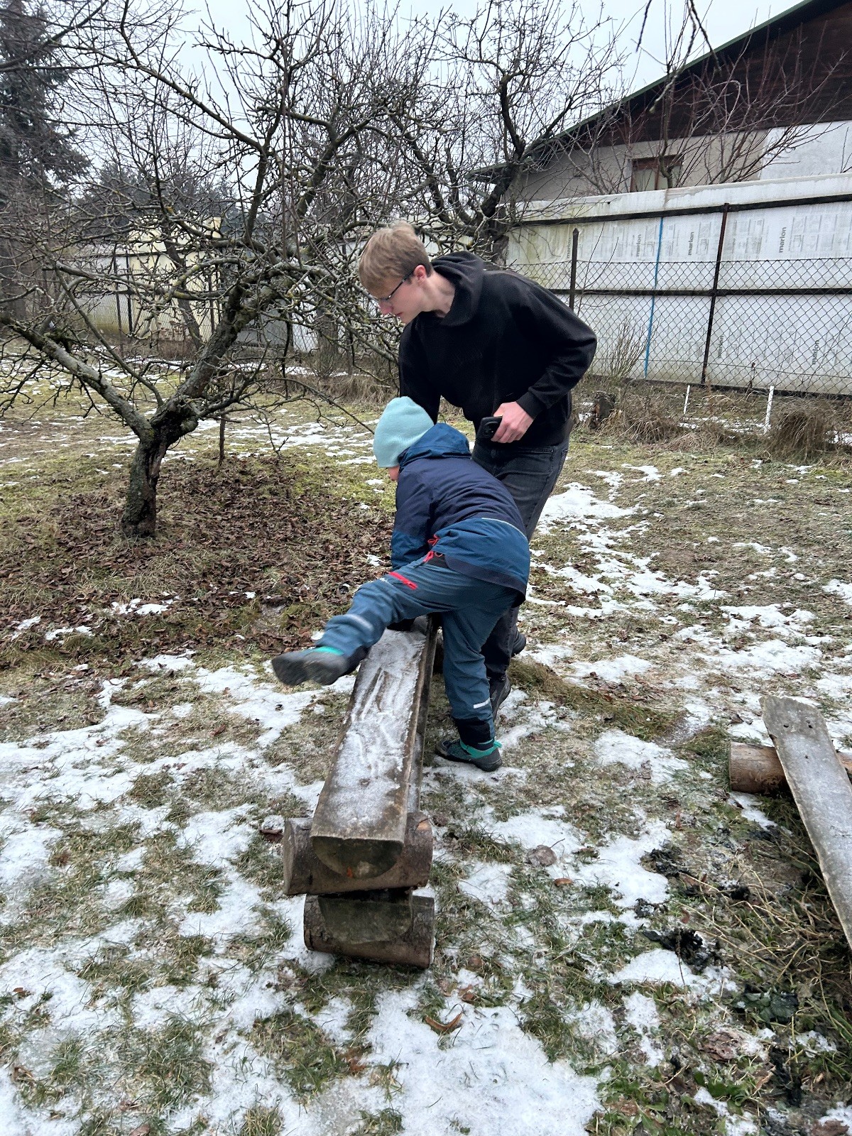 Sešli jsme se na schůzce v pěkném počtu pěti dětí a hned jsme se vrhli na první aktivitu, opičí dráhu po zahradě. Přestože bylo vše namrzlé, kluci to zvládli skvěle a obešlo se to bez jediného pádu. Poté jsme si dali svačinu a zahráli si Babylonskou věž. Jak se začalo smrákat, vydali jsme se na noční procházku Šlapanicemi. Cestou jsme hráli hru Bomba, potopa, nálet, i když větší problém než samotná hra nám dělalo náledí. I přesto jsme se všichni vrátili na boudu zdraví a v pořádku.