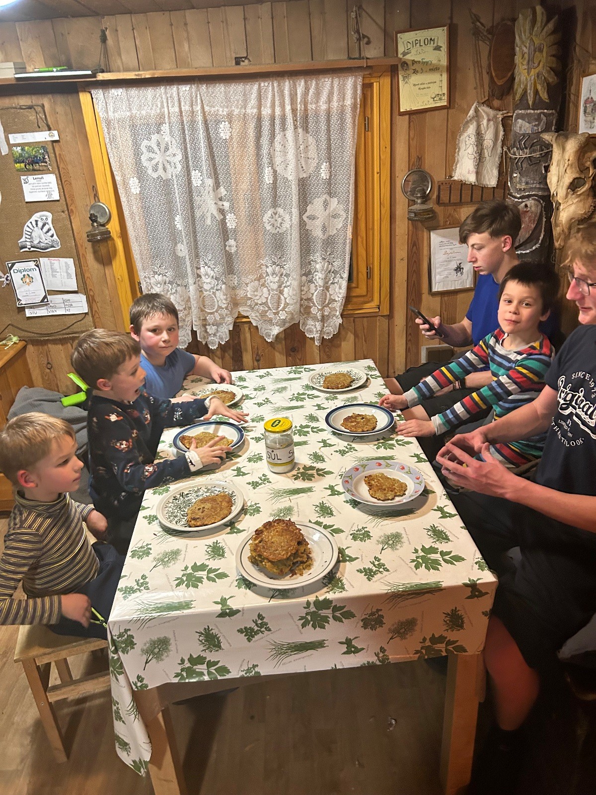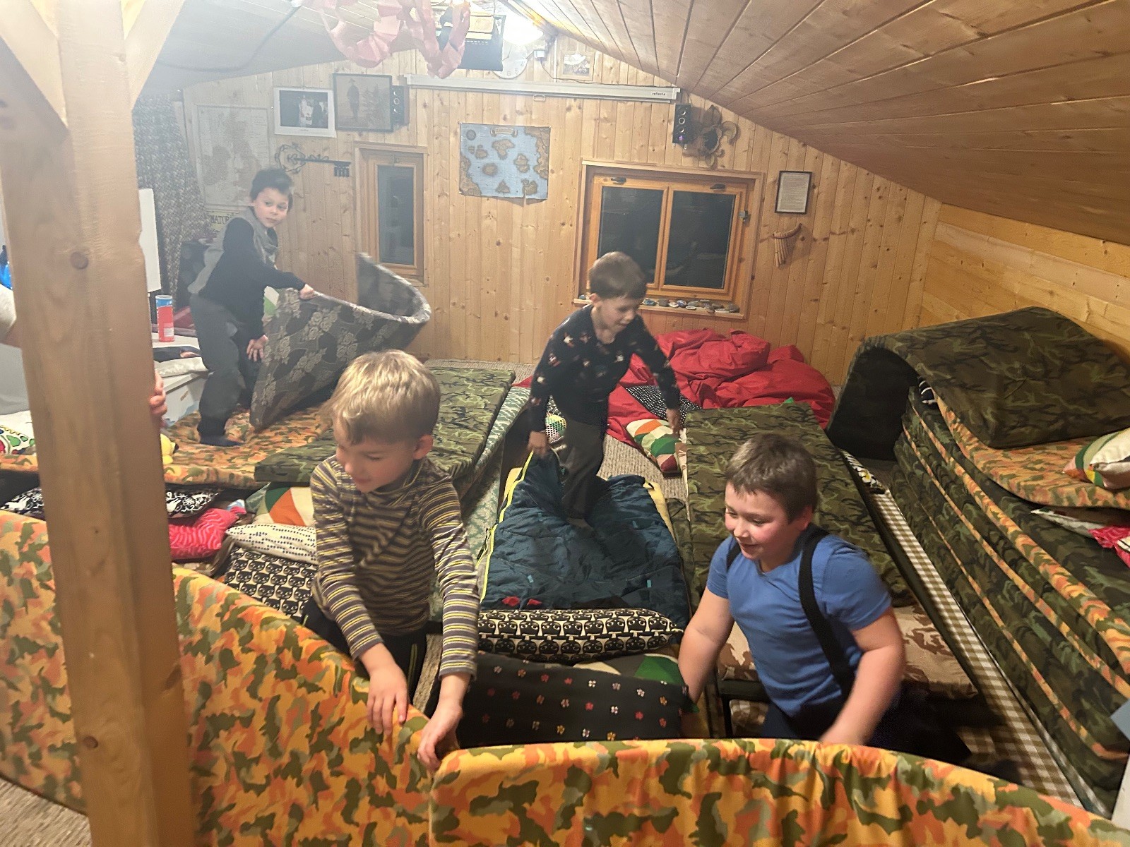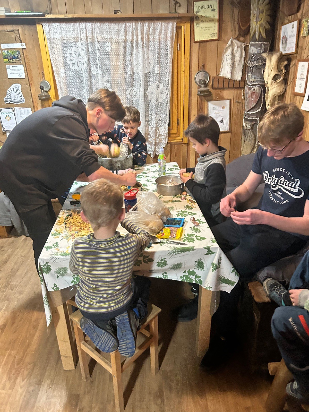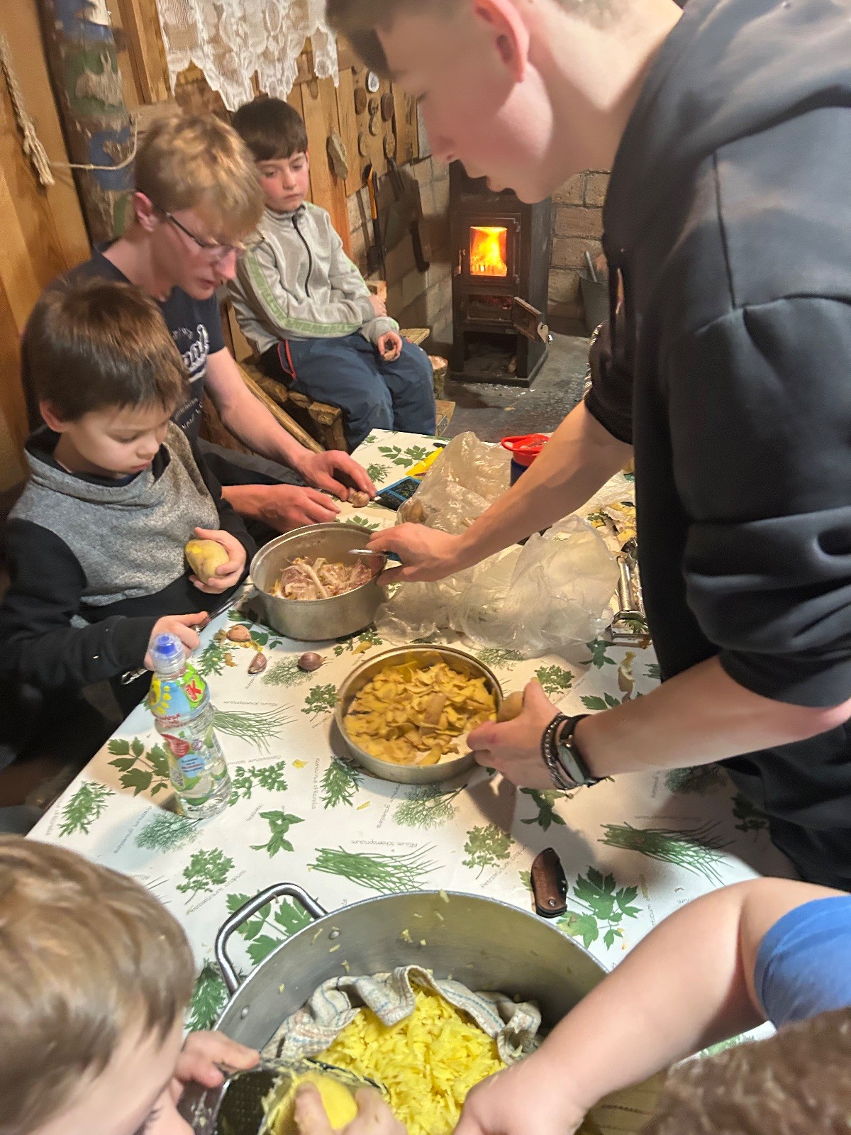 Po návratu přišel vrchol večera – příprava bramboráků. Dali jsme dohromady vše potřebné a pustili se do vaření. Kluci byli velmi šikovní a zvládli loupat i strouhat brambory. Smažení jsme si vzali na starost my, vedoucí, zatímco kluci se mezitím zabydlovali v horním patře, kde postavili obrovskou matracovou pevnost, kterou ocenili i vedoucí z vedlejší boudy. Po dosmažení jsme se pustili do jídla, bramboráky všem chutnaly, jen jsme jich připravili víc, než bylo potřeba. Večer jsme zakončili filmem, osobní hygienou a šli jsme spát.