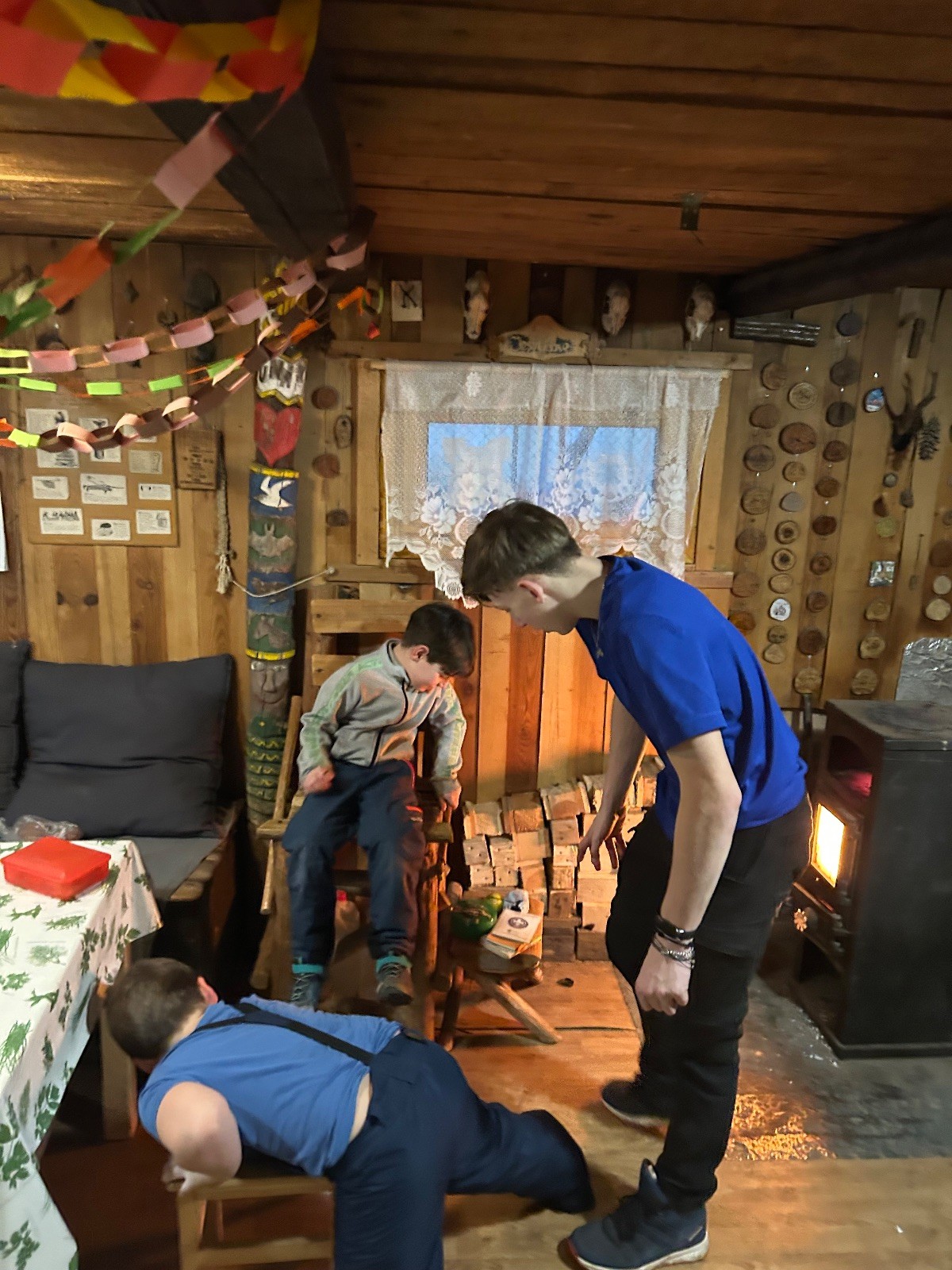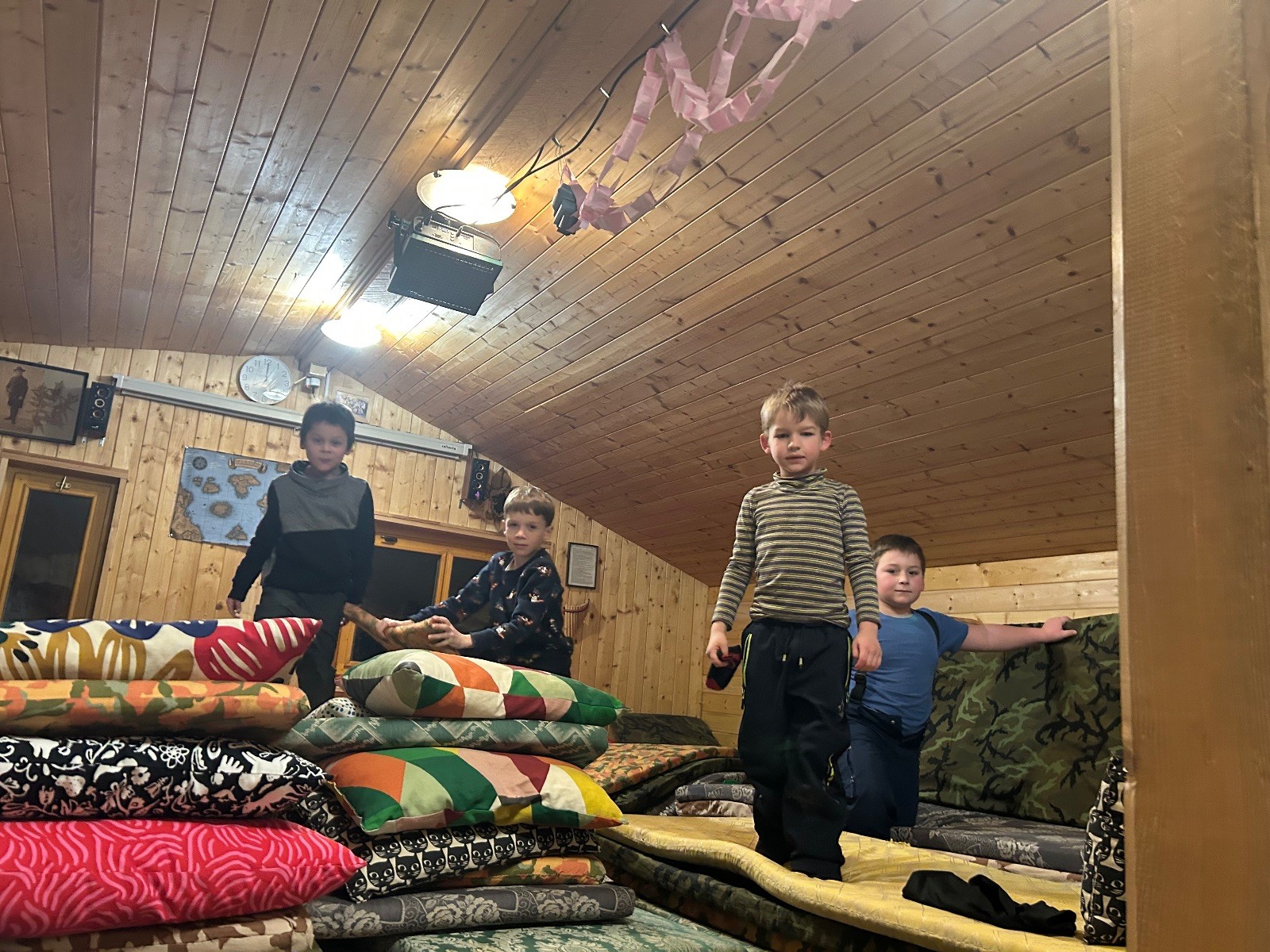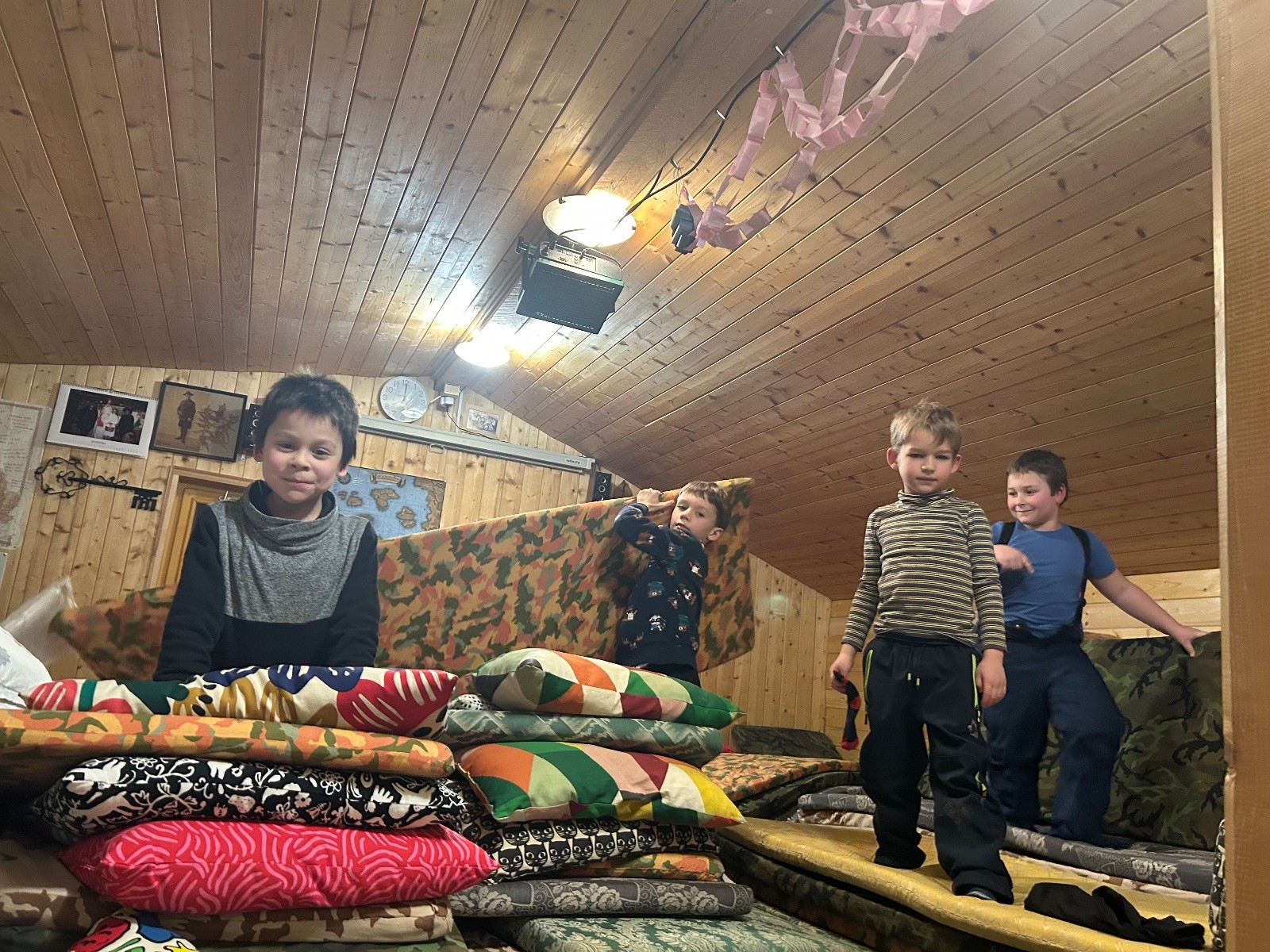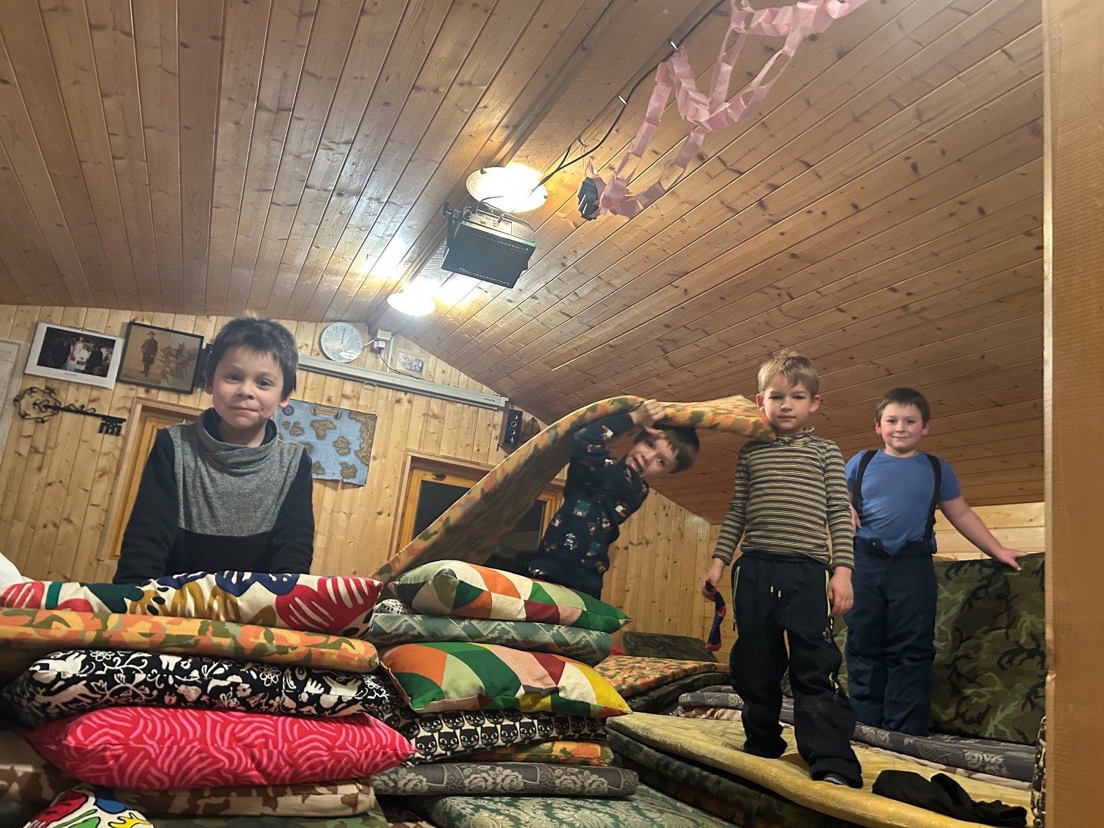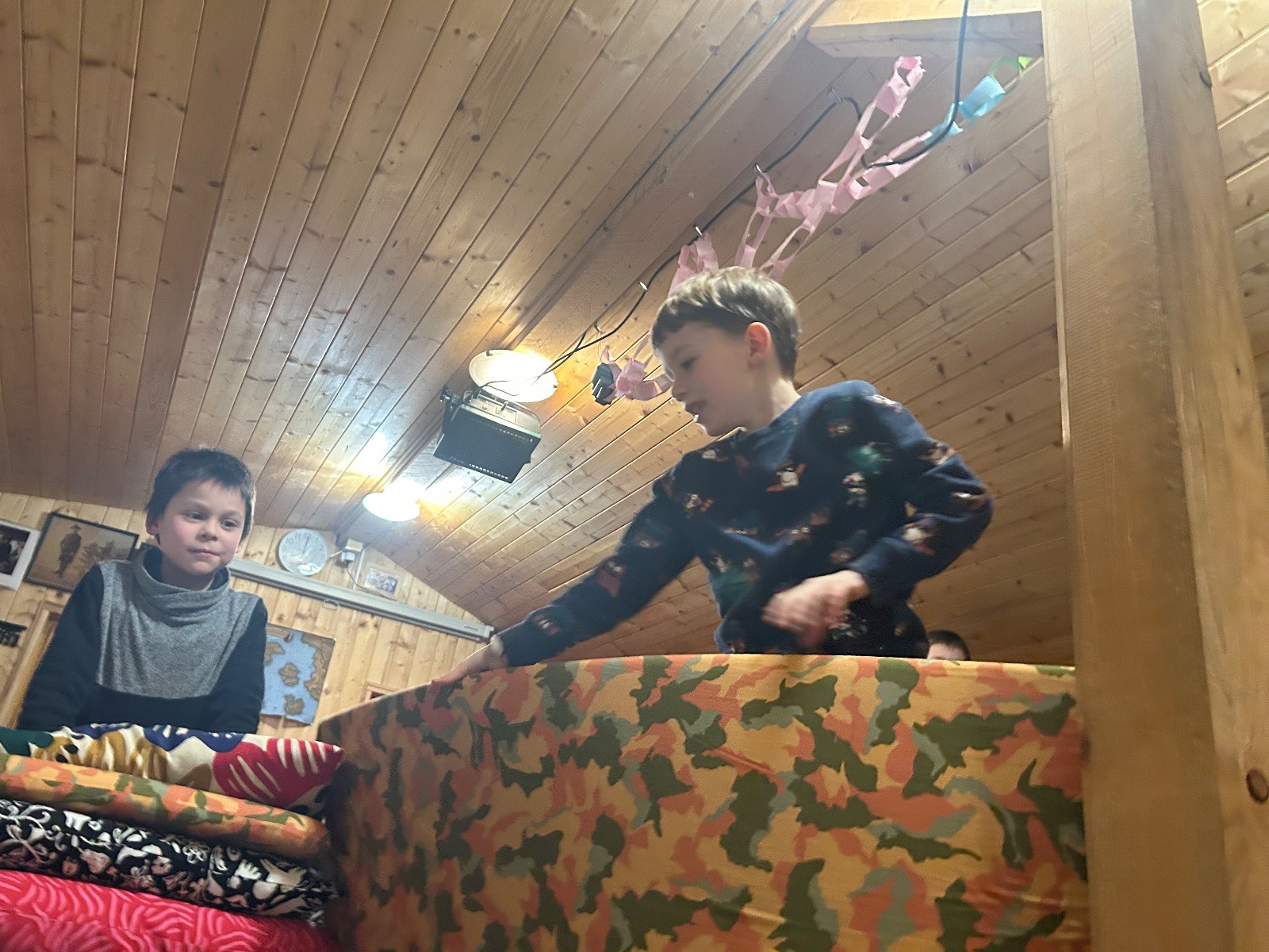 Po návratu přišel vrchol večera – příprava bramboráků. Dali jsme dohromady vše potřebné a pustili se do vaření. Kluci byli velmi šikovní a zvládli loupat i strouhat brambory. Smažení jsme si vzali na starost my, vedoucí, zatímco kluci se mezitím zabydlovali v horním patře, kde postavili obrovskou matracovou pevnost, kterou ocenili i vedoucí z vedlejší boudy. Po dosmažení jsme se pustili do jídla, bramboráky všem chutnaly, jen jsme jich připravili víc, než bylo potřeba. Večer jsme zakončili filmem, osobní hygienou a šli jsme spát.