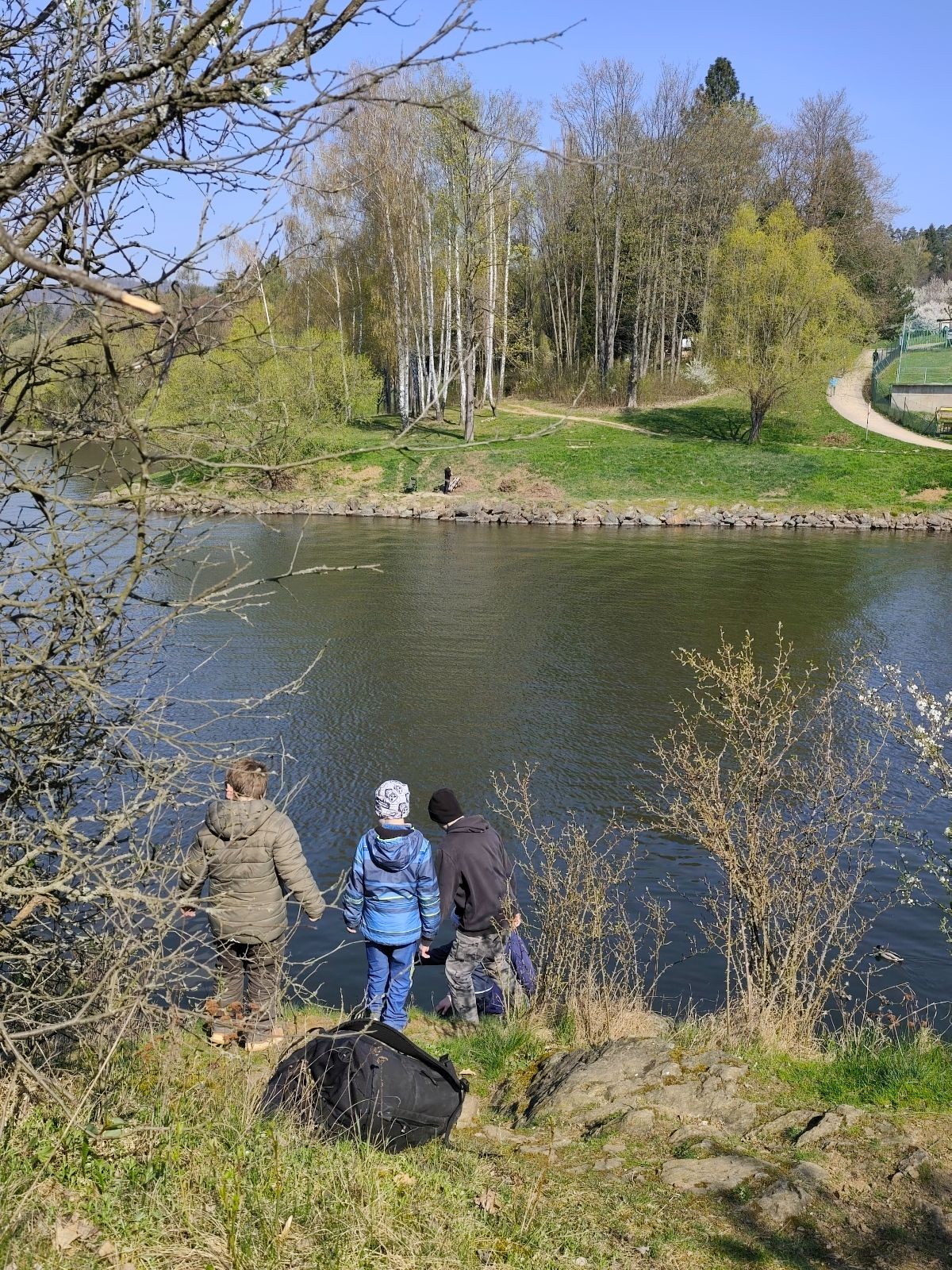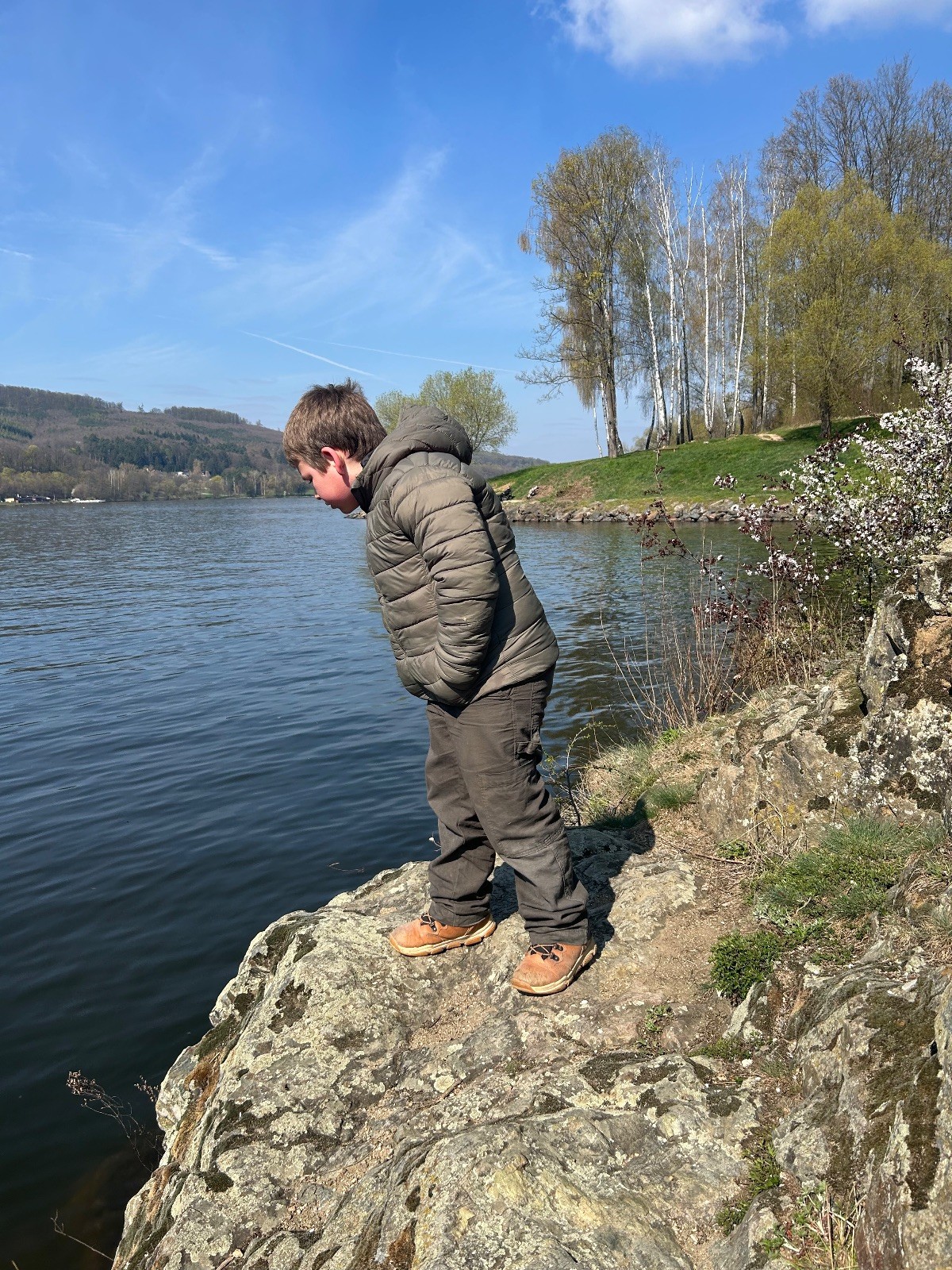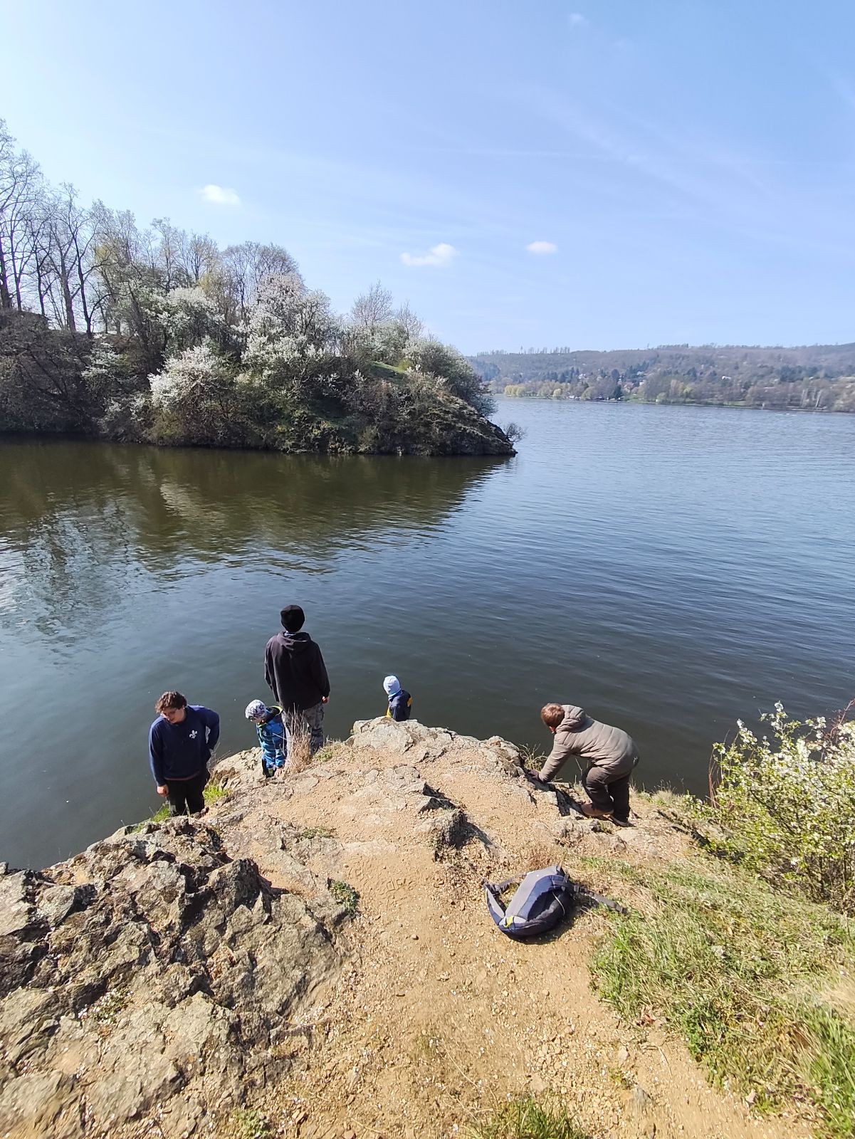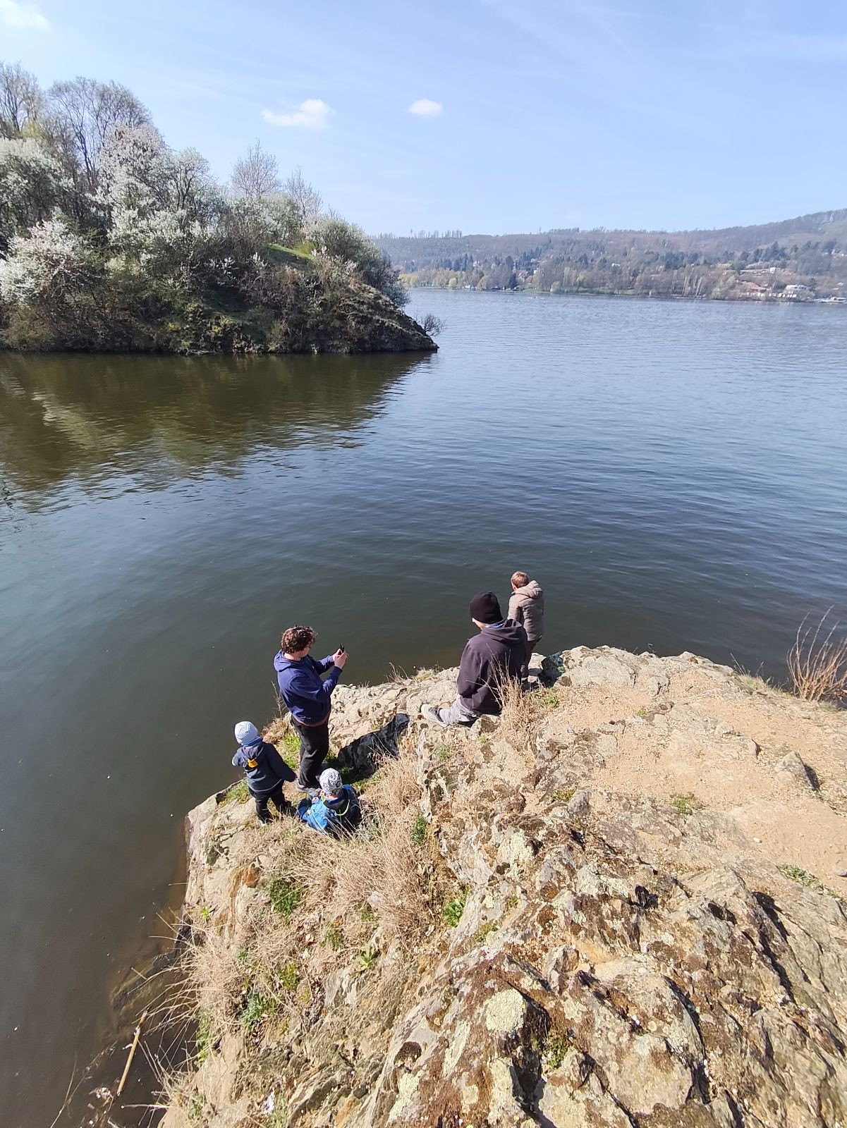 Po příjezdu jsme se odtrhli od hlavního davu, který mířil na ceremoniál, protože my jsme měli trochu jiný cíl. Udělali jsme si kratší procházku okolo přehrady, nutno podotknout, že s velkým počtem zastávek. Mezi ně patřila například hřiště nebo i nějaké lezení po kamenech pár metrů od hladiny. Při jednom z takových lezení se stalo první neštěstí, Vydrýsek nám nohou zahučel do vody, naštěstí se s tím popral, přeci jenom taky už je to vedoucí. Z malých Lemurů tam prozatím nikdo nespadl.