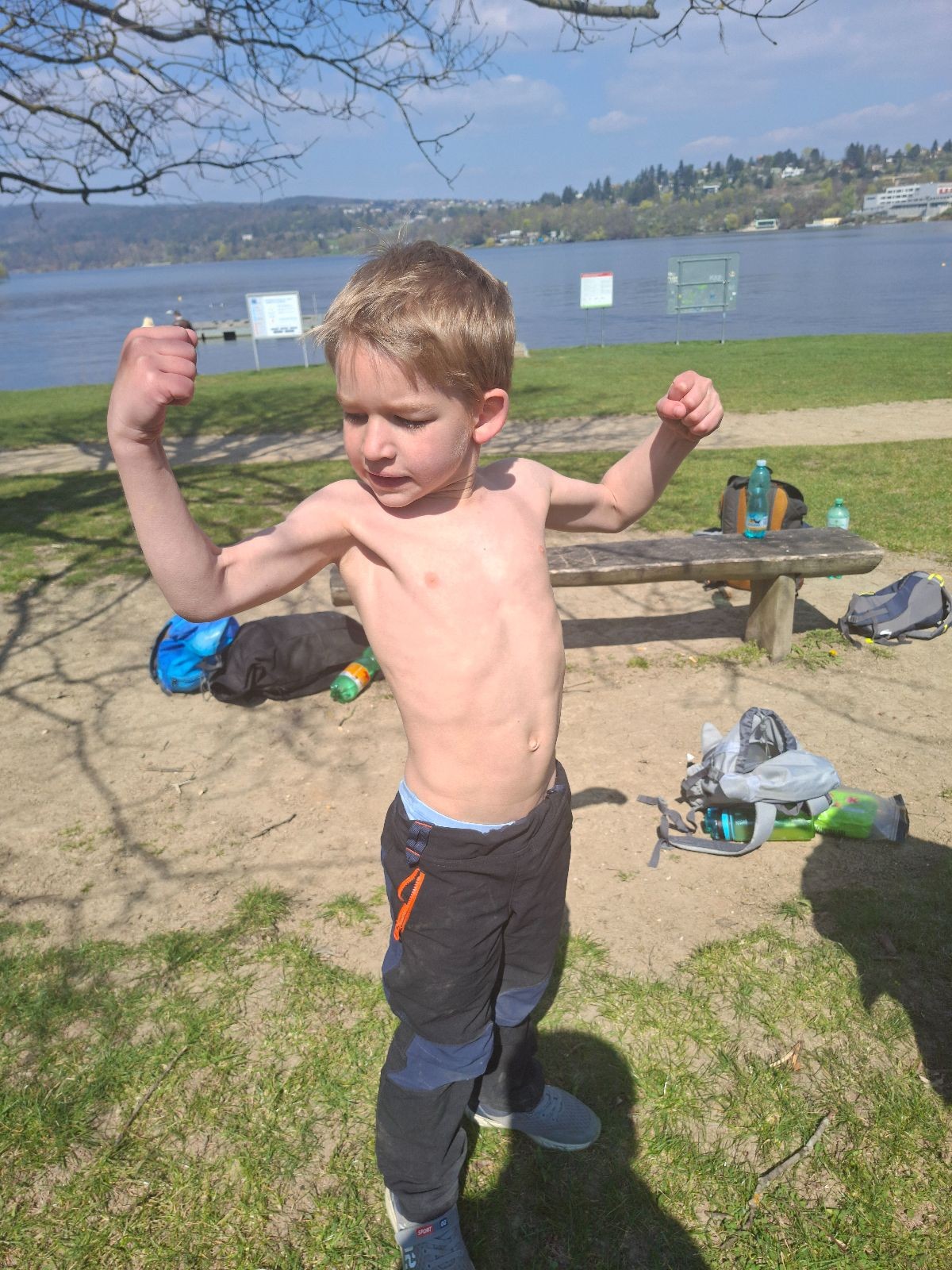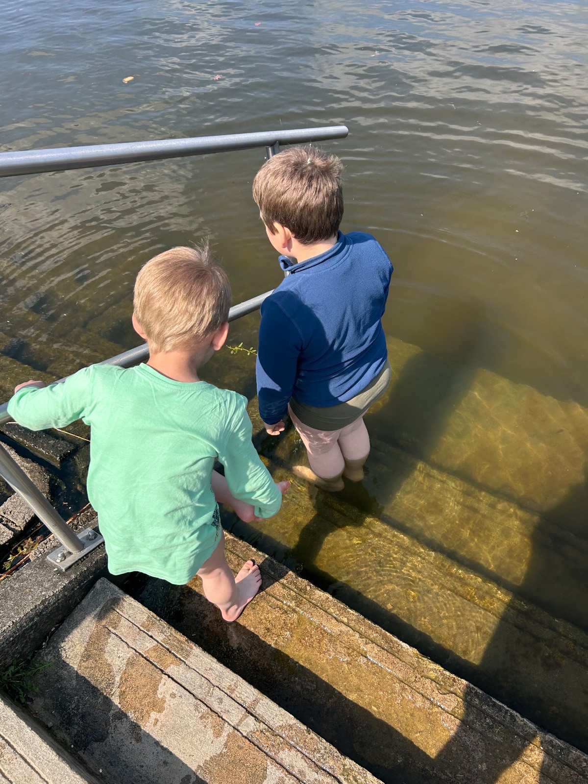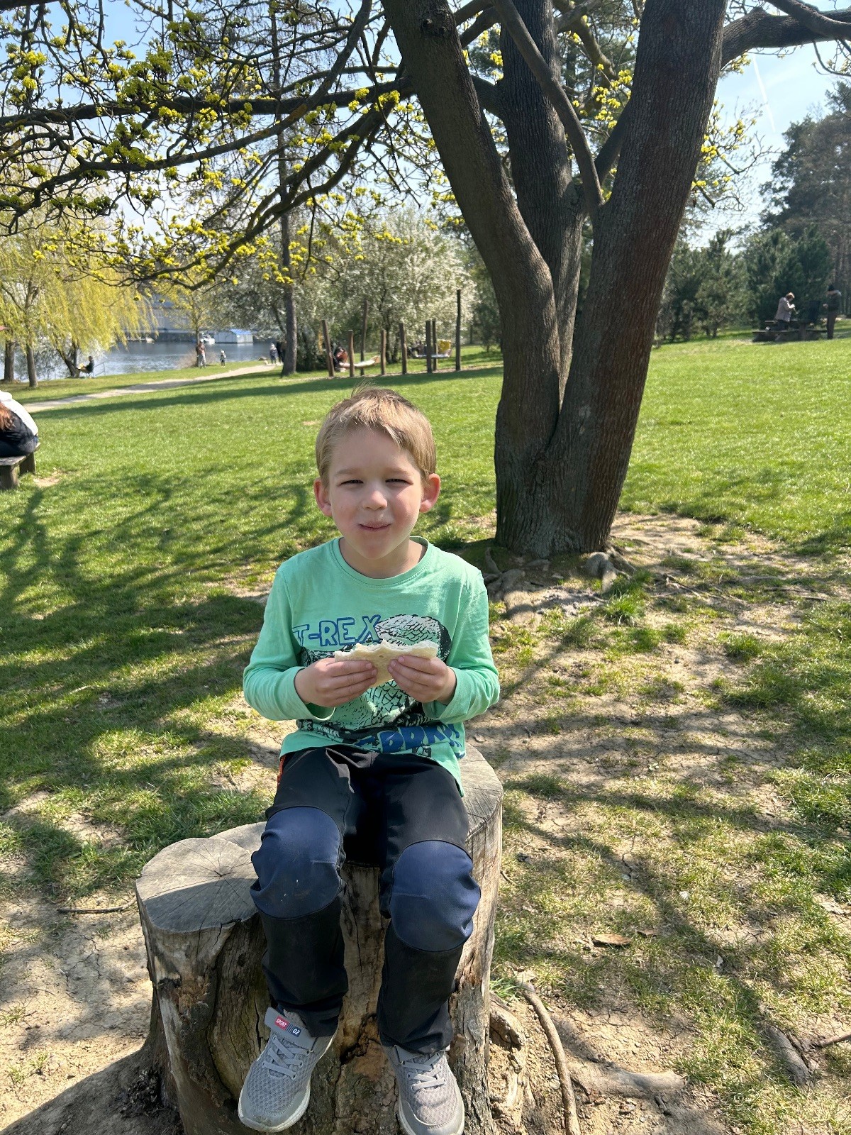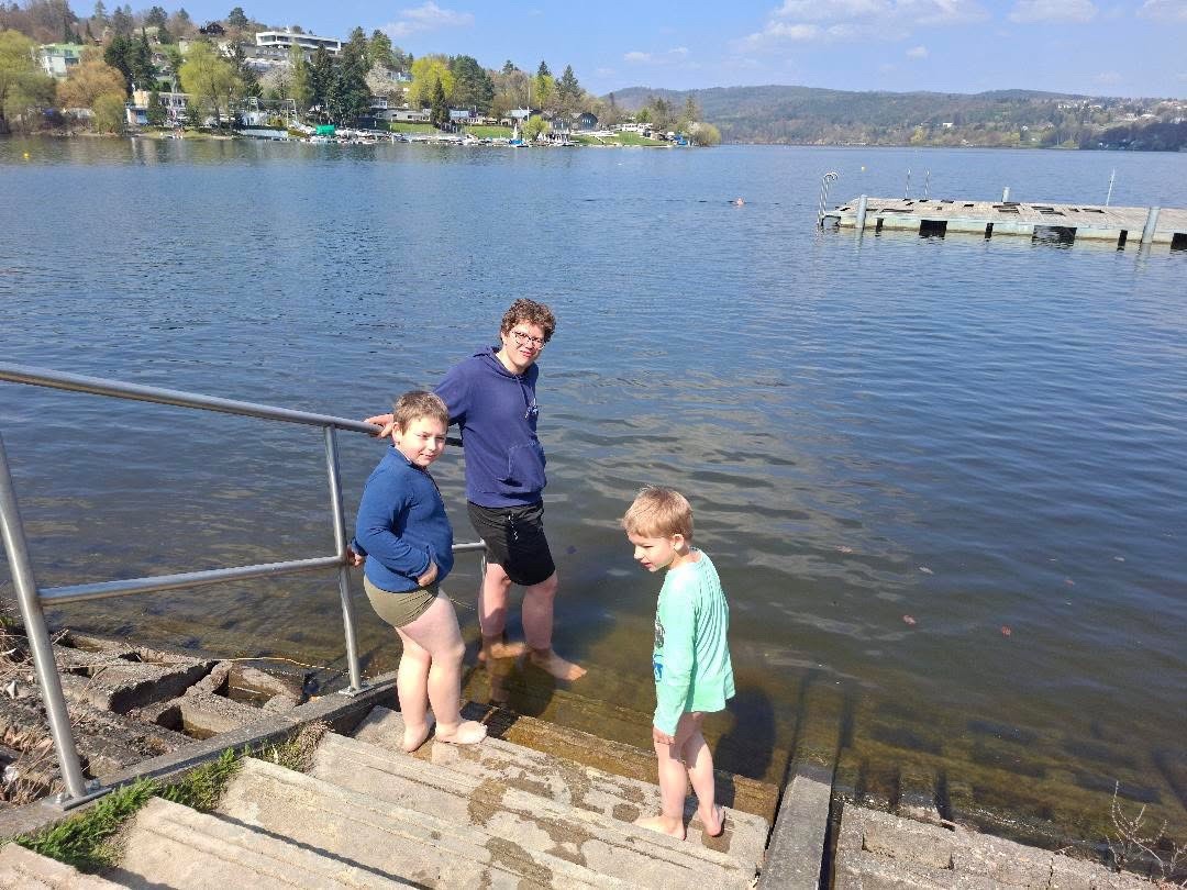 Po příjezdu do Bystrce jsme se vydali po druhém břehu směrem k plážím, kde jsme si dali oběd. Tortilly klukům docela chutnaly, avšak někteří dokonce preferovali suché nad plněnými. Během odpočinku si někteří kluci chtěli smočit nohy, a já taky. Tak jsme se vydali k břehu a zjistili jsme, že voda je dost studená. To však skauta nezastaví, a i tak jsme do ní vlezli.