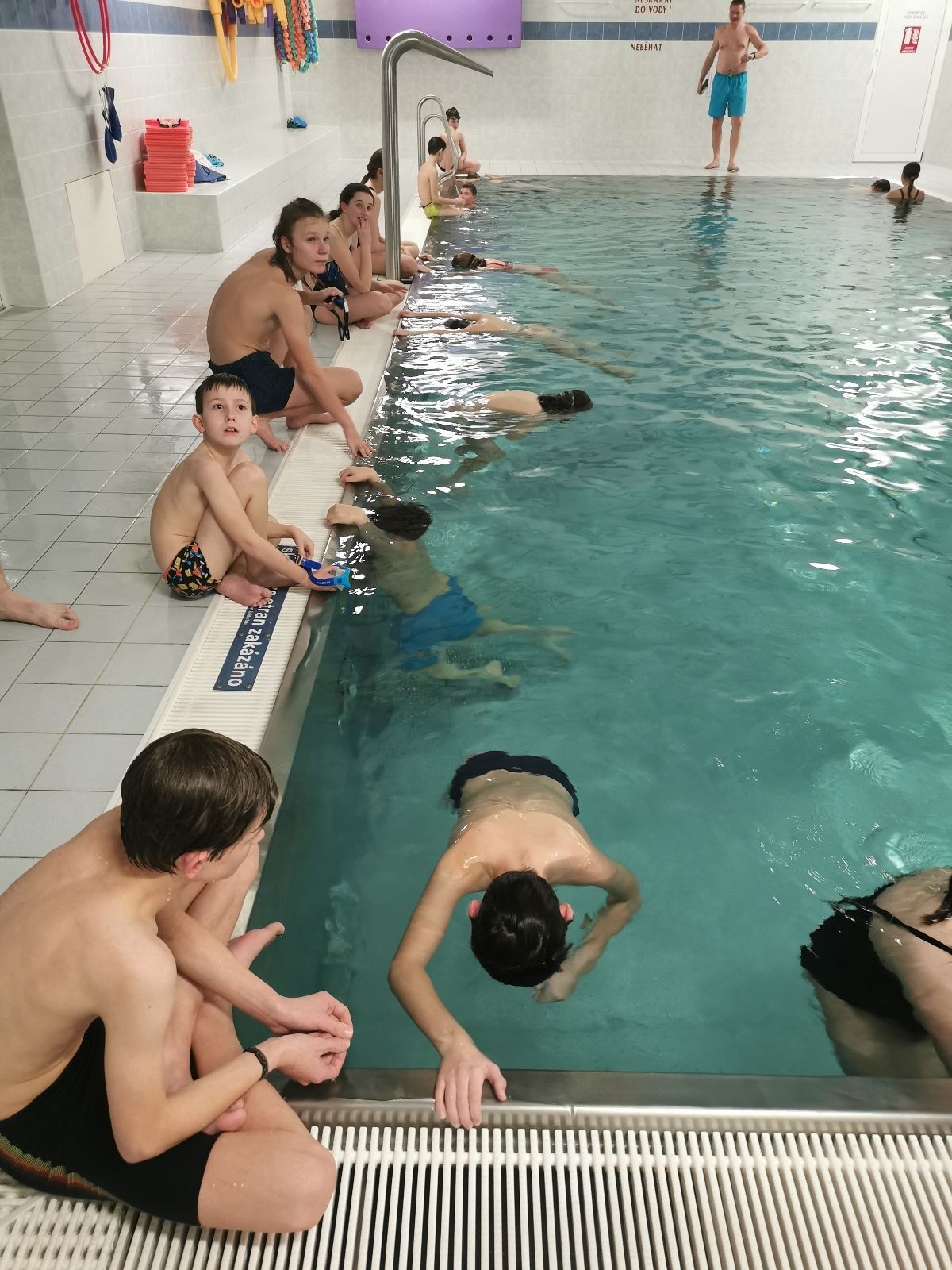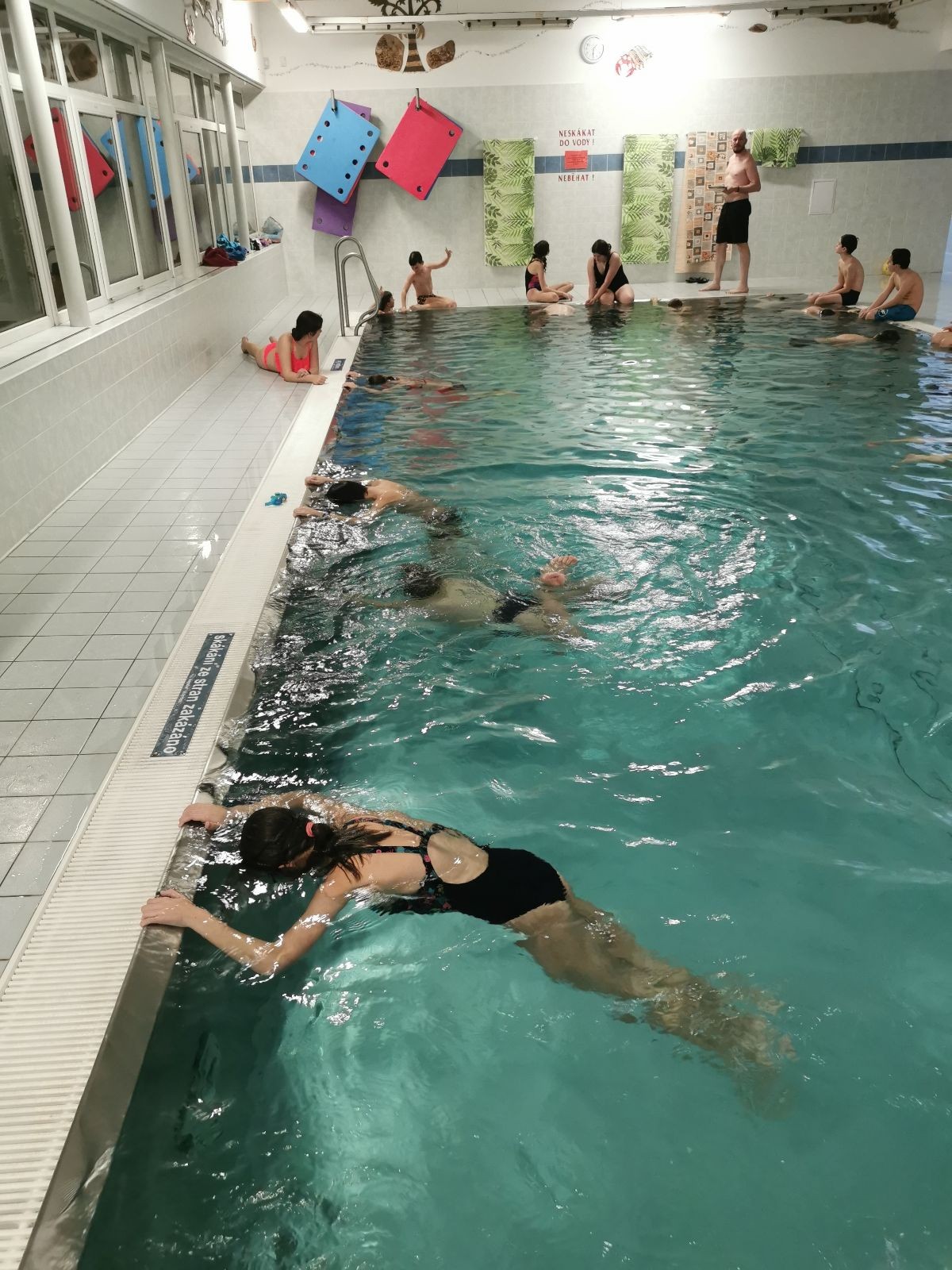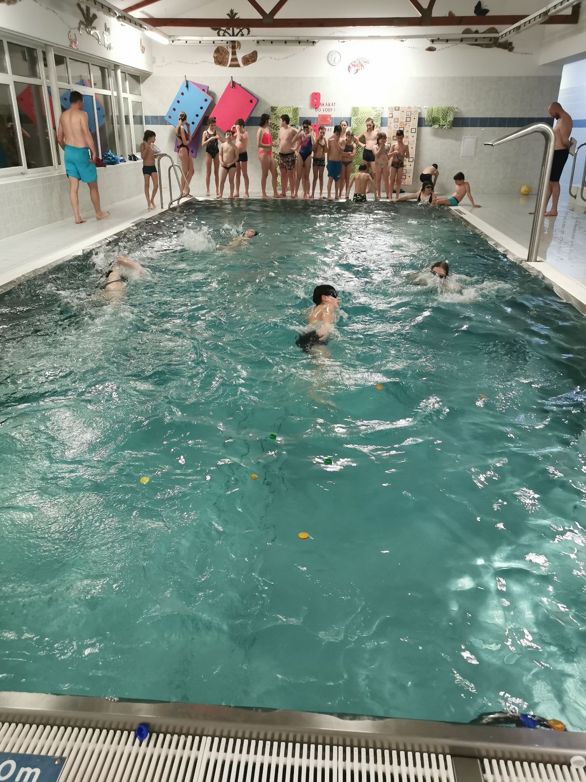 Uzel všechny svolává a rozjíždíme štafetu na rychlost. Prvně bez desky, pak s plaveckou deskou. Je docela zajímavé pozorovat, který styl je nejrychlejší. Většina jede kraulové nohy, ale nejrychlejší se mi zdála být kombinace kraulových kopů a rukou, která napadla snad jen jednoho, možná dva plavce.