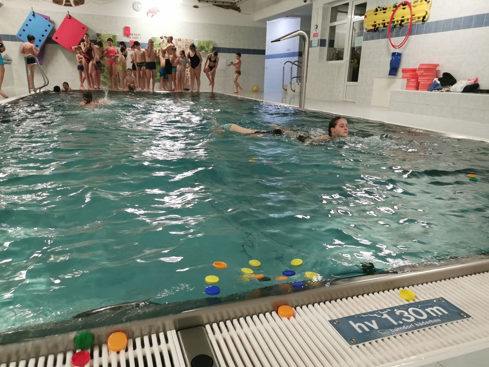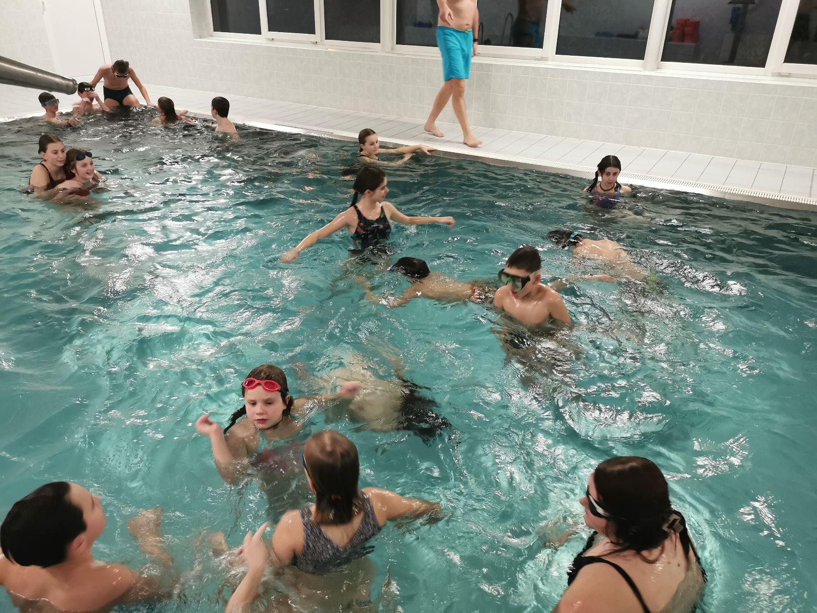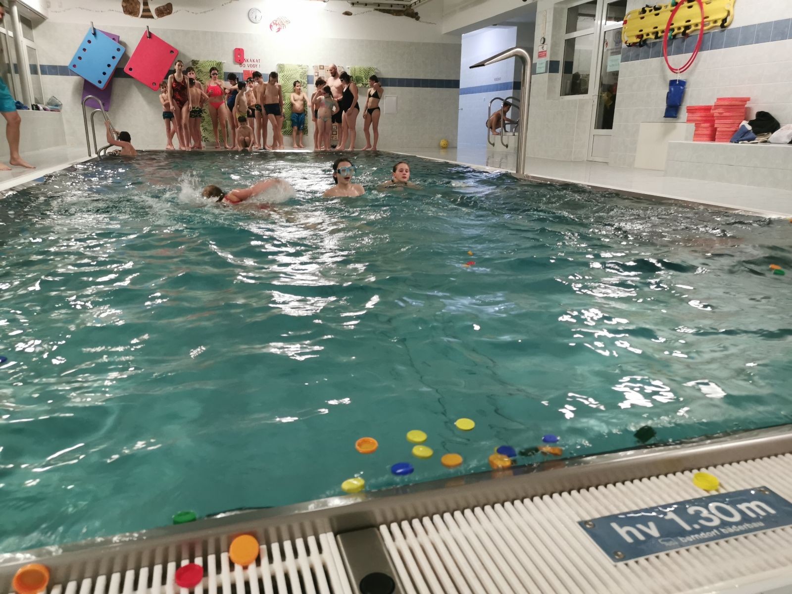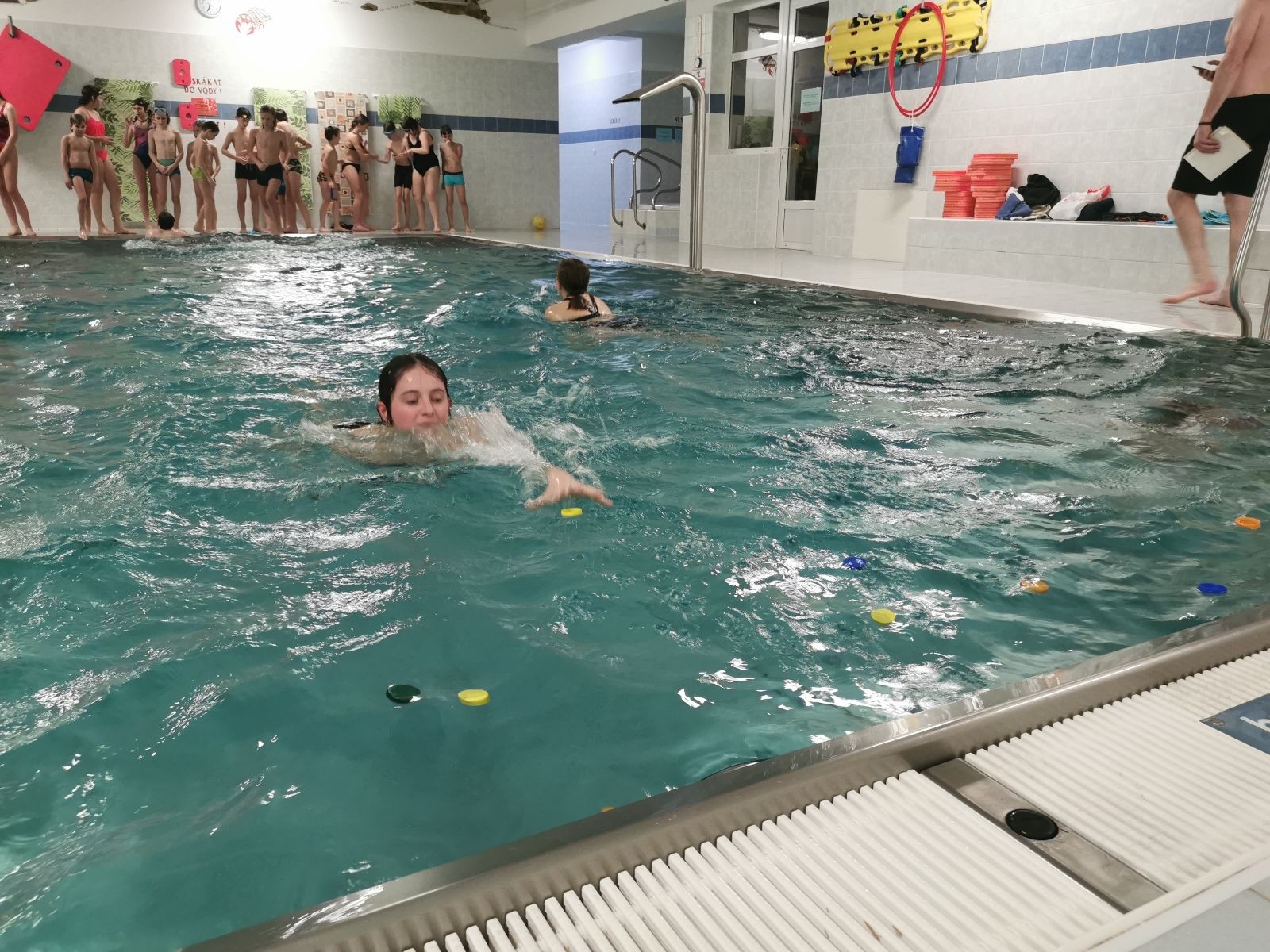 Uzel všechny svolává a rozjíždíme štafetu na rychlost. Prvně bez desky, pak s plaveckou deskou. Je docela zajímavé pozorovat, který styl je nejrychlejší. Většina jede kraulové nohy, ale nejrychlejší se mi zdála být kombinace kraulových kopů a rukou, která napadla snad jen jednoho, možná dva plavce.