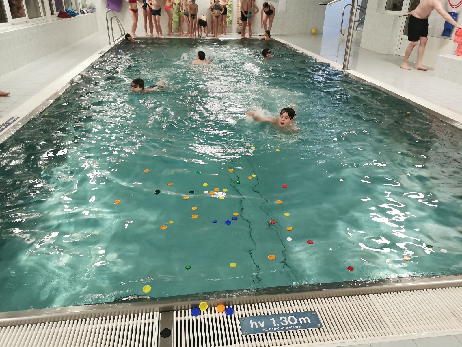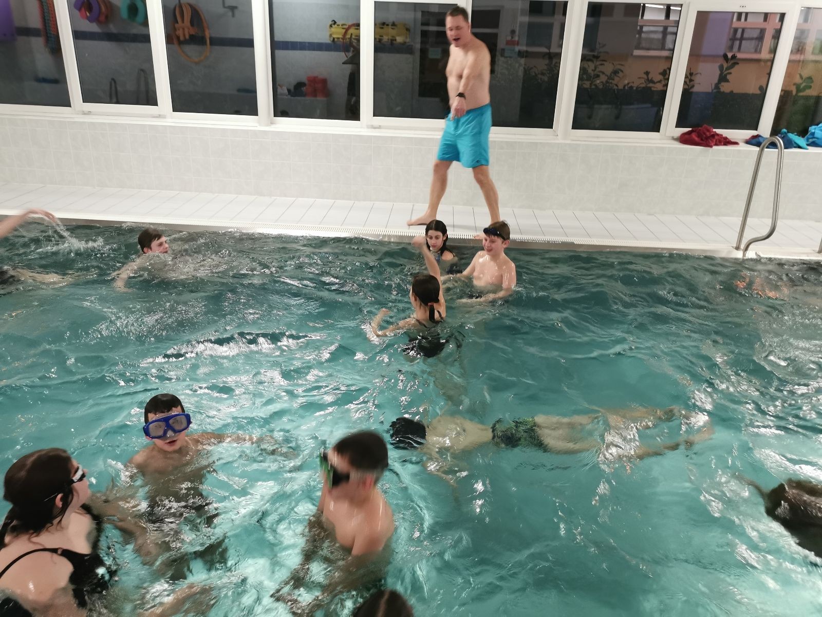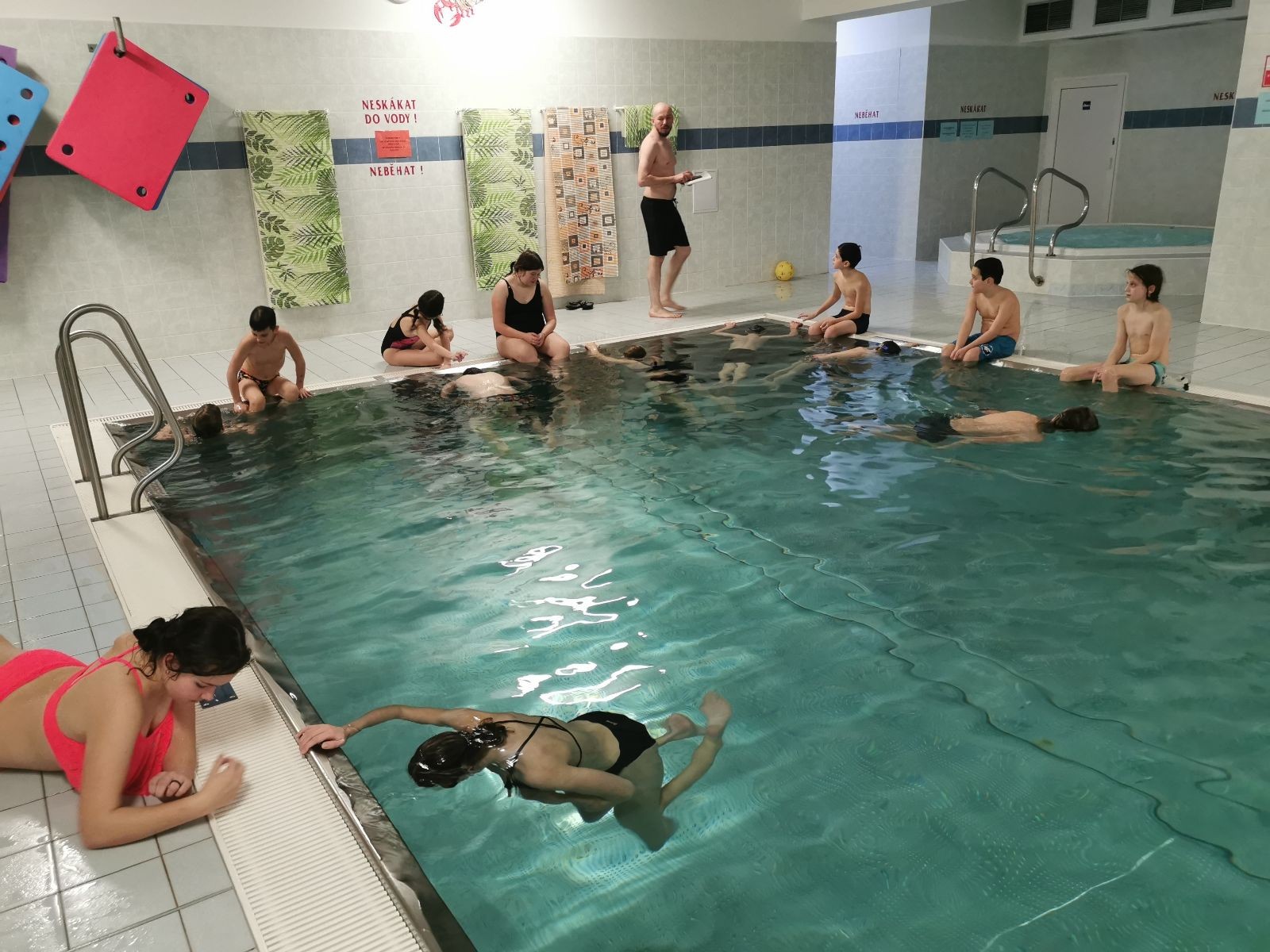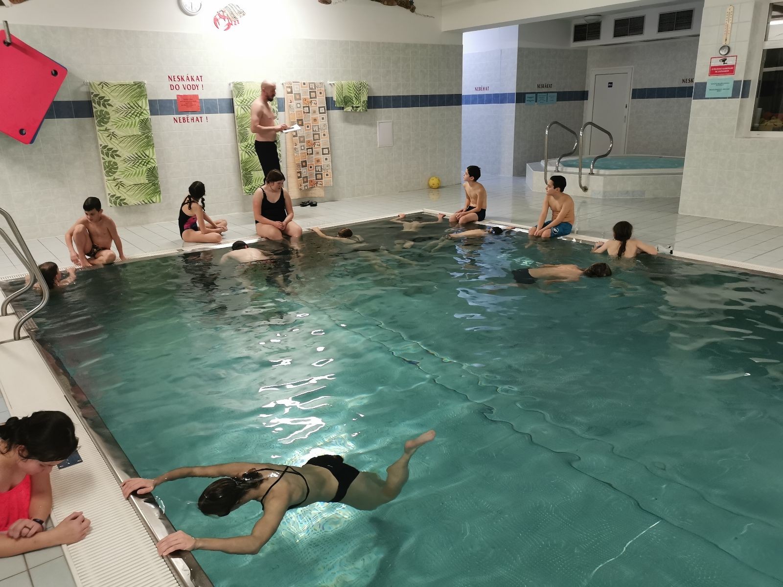 Dáváme další hry - vodní babu, hlavonožce, rybičky a rybáře, skákání do bazénu pod nápisem neskákat do bazénu (nápis pak upravujeme tak, aby lépe reflektoval naše potřeby a aktivity :-)) a lekci freedivingu. Co to je freediving už jsem popisoval v minulém bazénovém článku. Zkoušeli jsme statiku, což je prosté zadržování dechu. Výsledky jsou dost různé. Většinou to shoří na přípravě, kde je nejdůležitější být v klidu a dobře se rozdýchat… S dýcháním potíž není, ale zdá se, že pro některé je být v klidu něco jako mučení nebo zcela neznámý pojem :-) Ale máme i borce, co to zvládají. Za zmínku určitě stojí výkony Olivy (1:29), Kuby (1:35), Valči (1:37) a Janči (2:00).