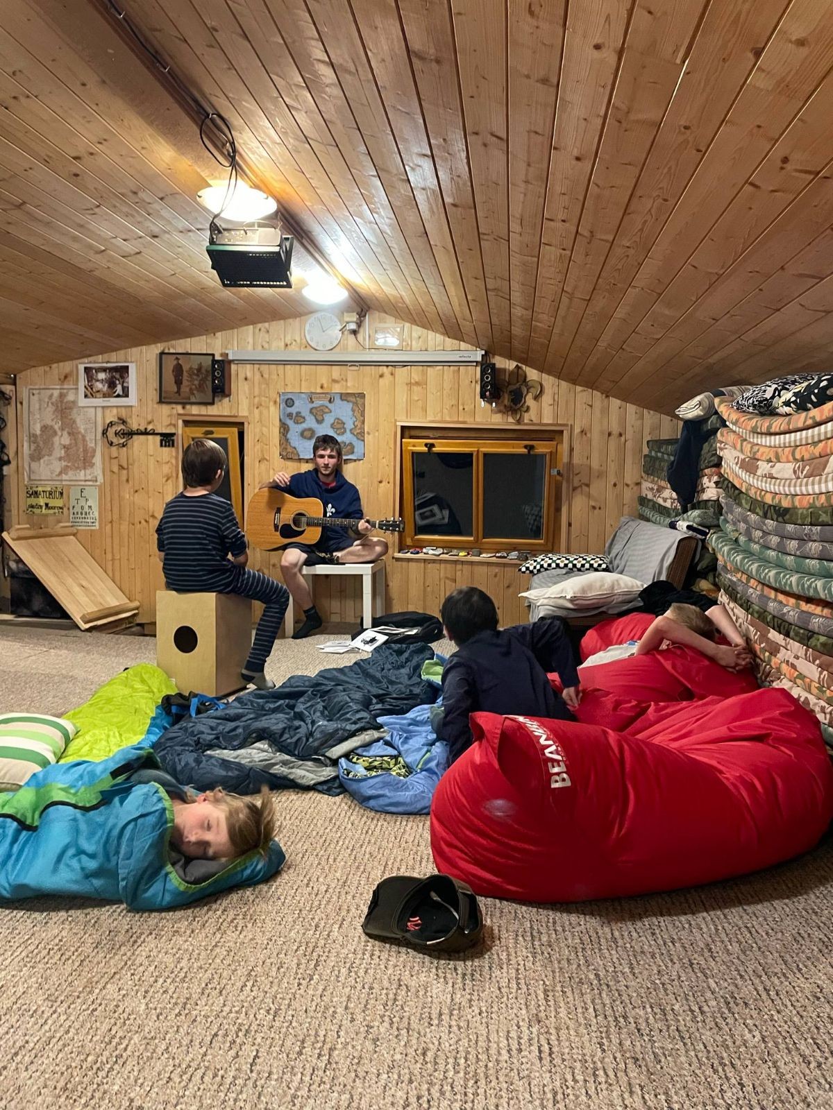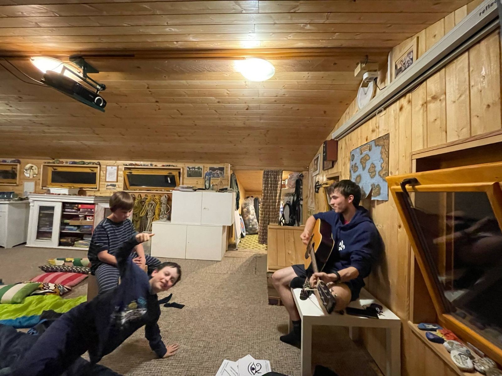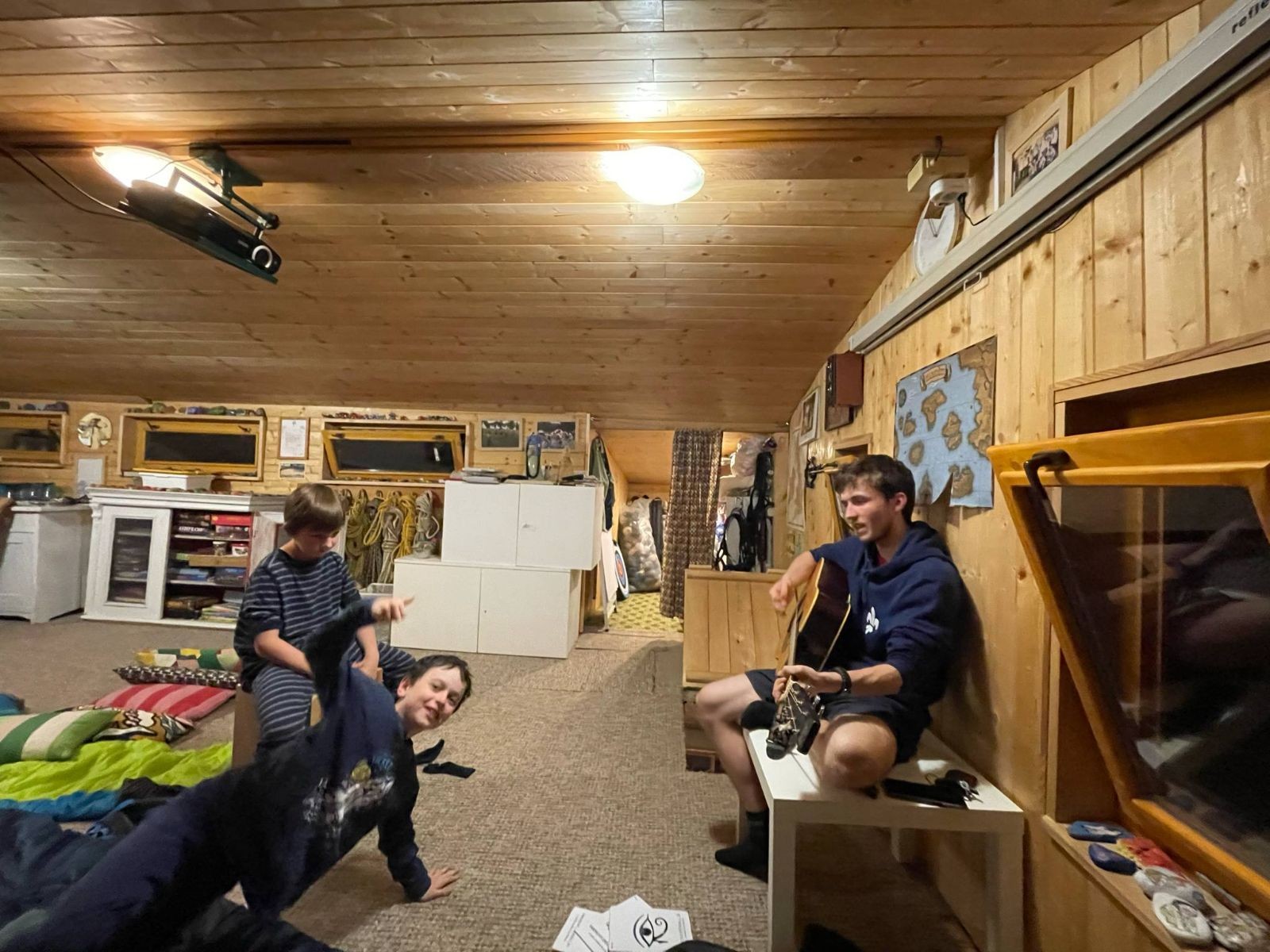 Na Boudě jsme si venku zahráli pár her a dorazil Tesák, který nás navečer poctil svou návštěvou. Společně jsme si zahráli Bang, zazněla i kytara, a pak jsme šli spát. Večer odešel Tesák, později i strejda Tom, a tím náš den definitivně skončil.
