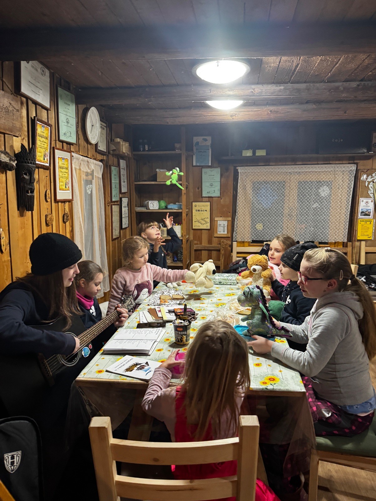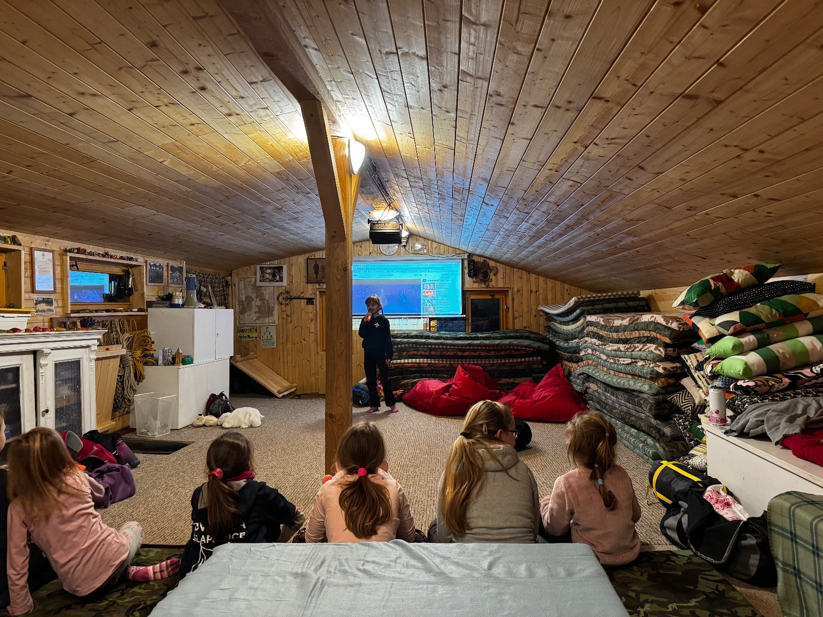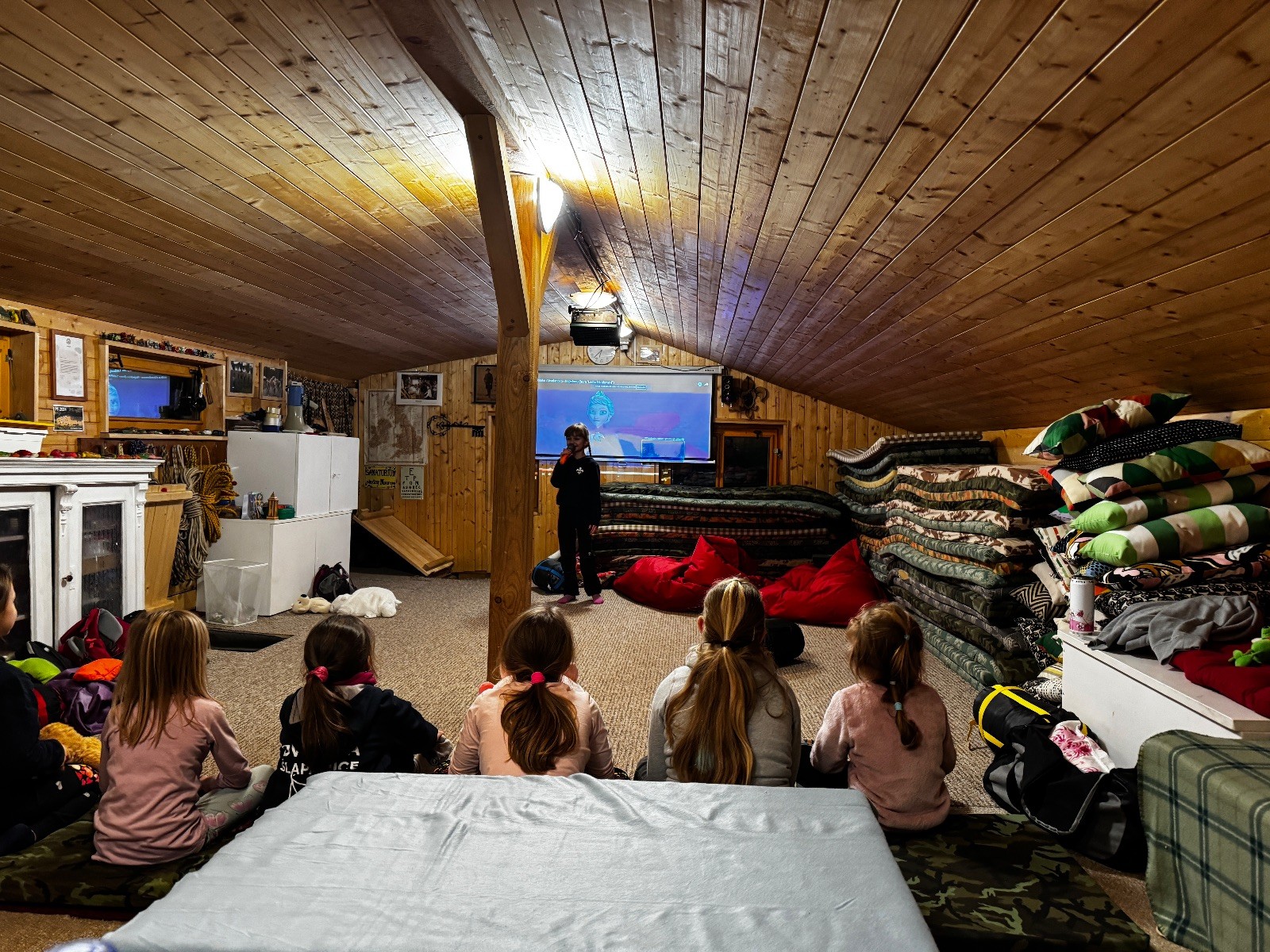 V sobotu 8.2 jsme sešly v počtu 7 + 2 na boudě, zahrály jsme pár her, zazpívaly pár písniček s kytarou a šlo se večeret. Kdo měl, tak si opekl špekáček, ostatní si daly večeře z domu, a pak se šlo na karaoke. Daly jsme asi tři kola, potom zpívaly jen tak pro radost :) Asi v devět se spustil film a holky začaly chroustat svoje dobrůtky. Skoro všechny holky si nechaly od Klády zaplést copánky a pak spokojeně ulehly zpátky k filmu. Zhruba v půlce jsme rychle odběhly na zuby a pak pokračovaly. Po skončení klasicky ještě pár dílů prasátka Peppy a na dobrou noc Pohádku.