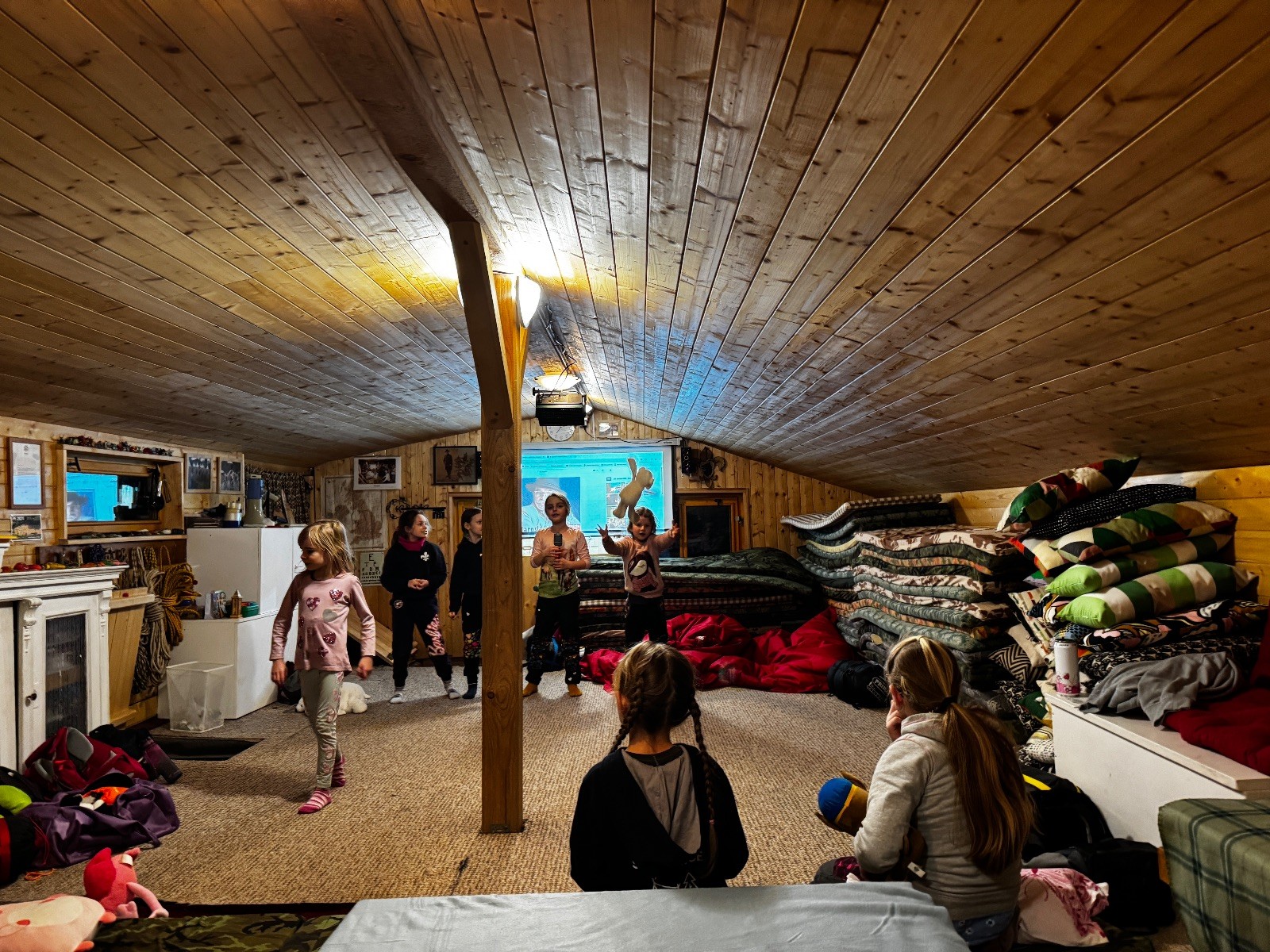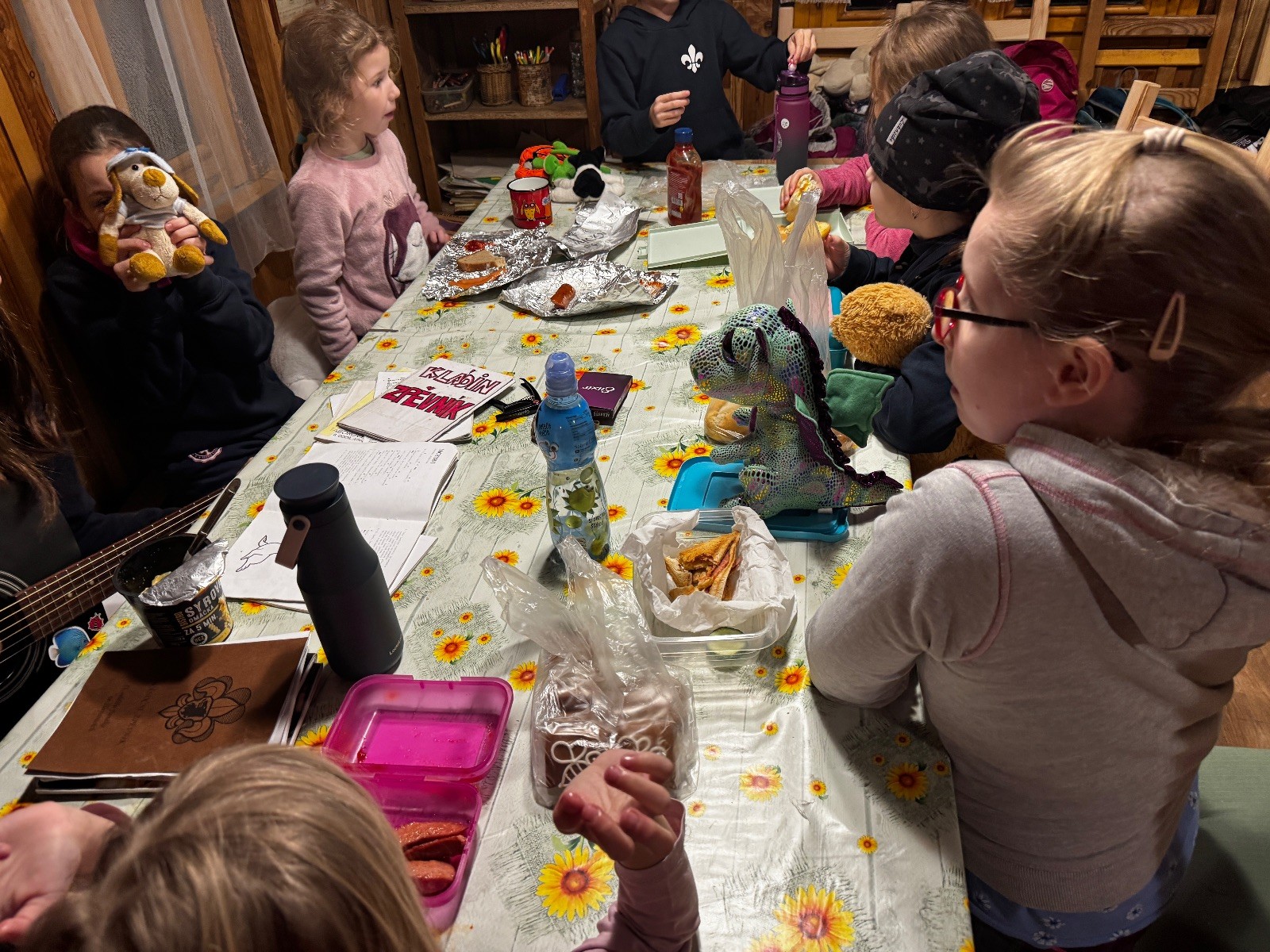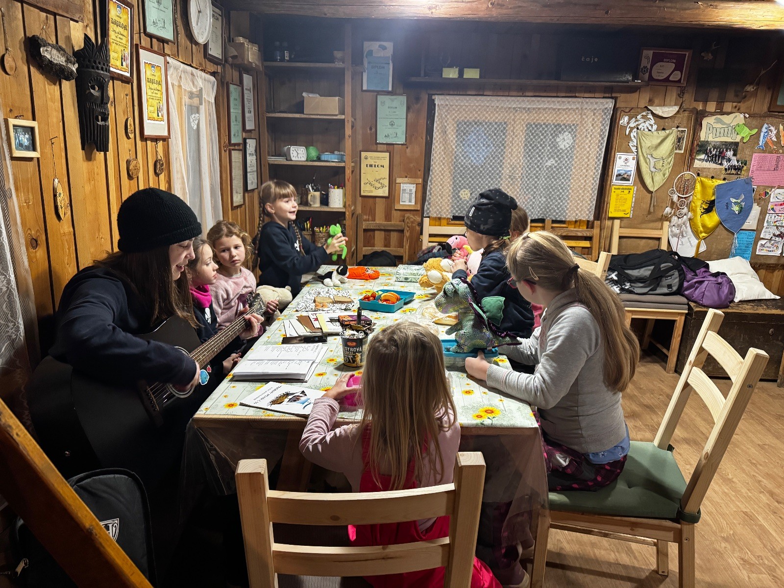 V sobotu 8.2 jsme sešly v počtu 7 + 2 na boudě, zahrály jsme pár her, zazpívaly pár písniček s kytarou a šlo se večeret. Kdo měl, tak si opekl špekáček, ostatní si daly večeře z domu, a pak se šlo na karaoke. Daly jsme asi tři kola, potom zpívaly jen tak pro radost :) Asi v devět se spustil film a holky začaly chroustat svoje dobrůtky. Skoro všechny holky si nechaly od Klády zaplést copánky a pak spokojeně ulehly zpátky k filmu. Zhruba v půlce jsme rychle odběhly na zuby a pak pokračovaly. Po skončení klasicky ještě pár dílů prasátka Peppy a na dobrou noc Pohádku.