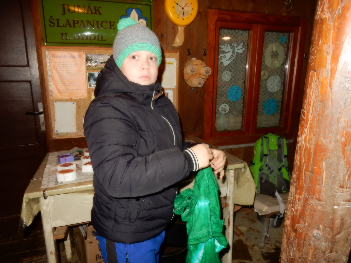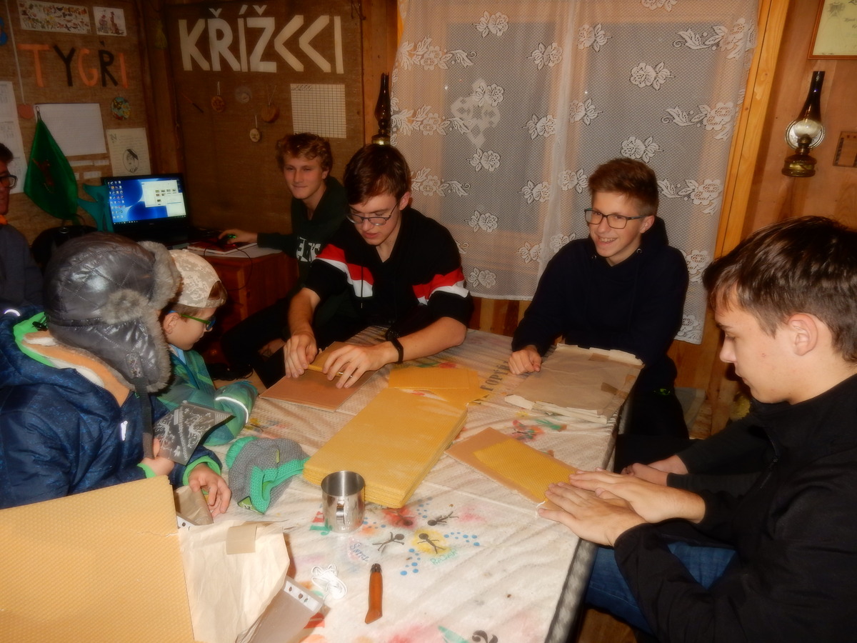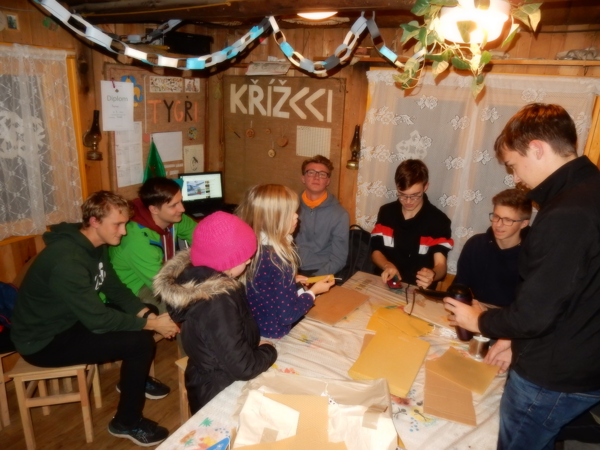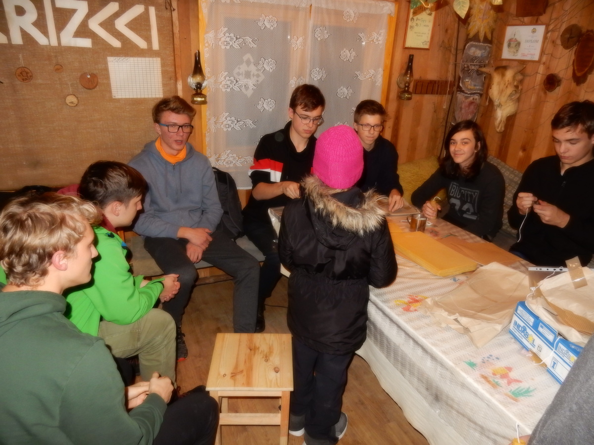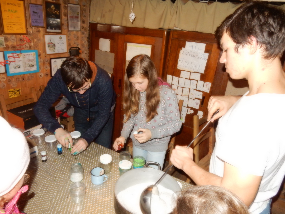 Pátek 13.12.2019. Všude řádí chřipky, šlapanická základka dokonce včera a dnes vyhlásila zavírací den, přesto se rukodělky docela povedly. Zájemců přišlo sice méně než loni, penízků se ale vybralo (a tudíž i výrobků vyrobilo) skoro stejně. A co že si mohli zájemci vyrobit? Ve Staré Boudě se usadil Honza Coufal spolu s Tygry a zájemci si zde mohli zhotovit svíčku ze včelího vosku. Hned vedle v Nové Boudě si mohli u Roxyho vyzdobit plátěnou nákupní tašku nebo u Džanyho stvořit leccos z bavlnek a korálků. Nejvíc husto bylo ve Trojce. U kamen a na lince odlévali do formiček zdobená mýdla Kloub s Krysaříkem, u vedlejšího stolu zase Filíš s Bertem barvili soli do koupele. Na dalším stole jsem já se zájemci svazoval trička k batikování a poslední dva stoly obsadila Terka s Renčou, u nichž se zdobily hrníčky a vázičky. Mladší členové se rozptýlili mezi výrobními místy, všelijak se přesouvali, mezi tím Pumy Ája se Soňou zdobily v podkroví vánoční stromeček a v koutě Staré Boudy Lost se Zubničkou stříhali film z letošního tábora. Prostě základna byla vytížena na 100%. Kolem šesté akce pomalu končila, mrňousci si s rozzářenými úsměvy odnášeli dárečky pro své blízké, vedoucí uklízeli zbylé ekvipmenty k výrobkům a osazenstvo základny se začalo měnit. Přicházeli sem nocovat starší členové, kteří zítra brzy ráno vyrazí pro Betlémské světlo do Vídně... Jura