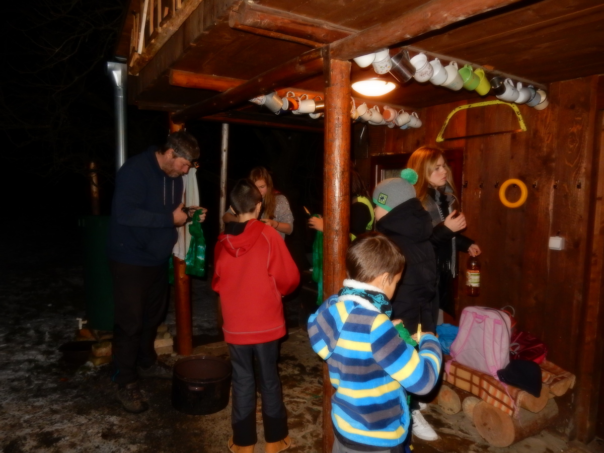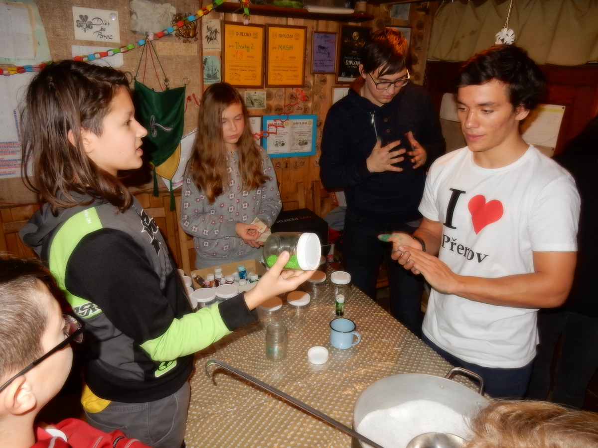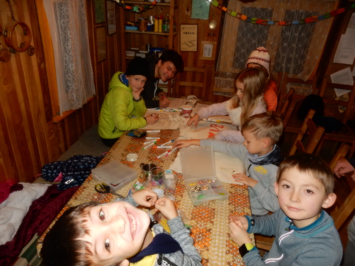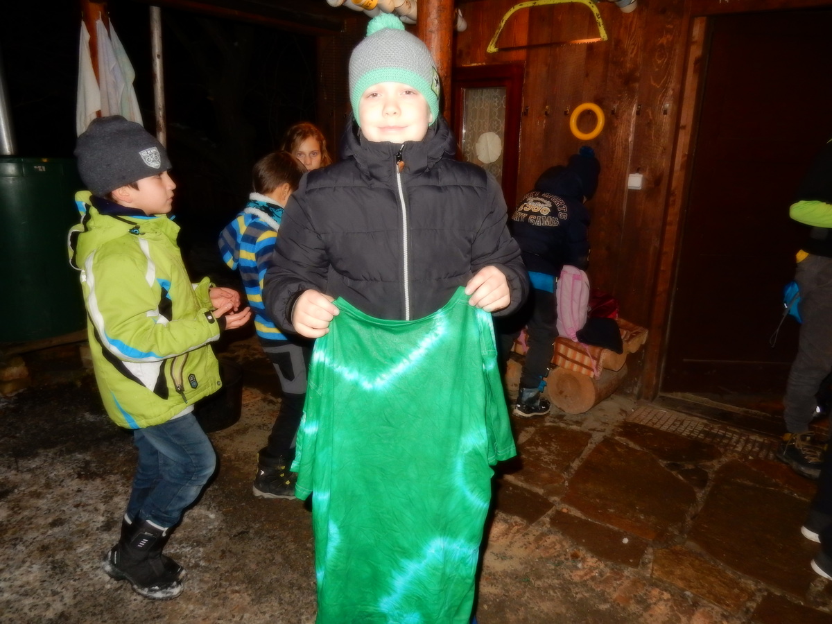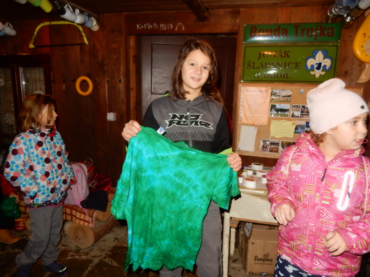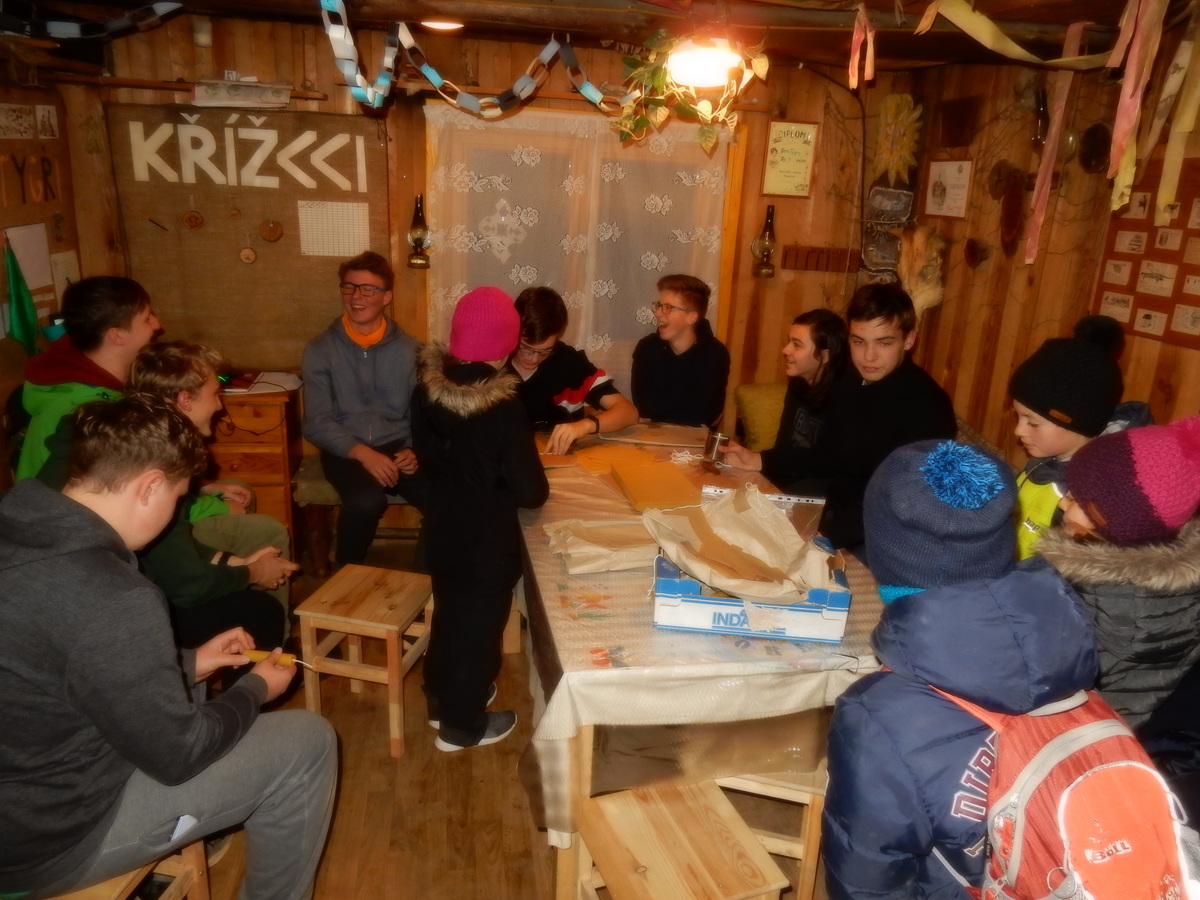 Pátek 13.12.2019. Všude řádí chřipky, šlapanická základka dokonce včera a dnes vyhlásila zavírací den, přesto se rukodělky docela povedly. Zájemců přišlo sice méně než loni, penízků se ale vybralo (a tudíž i výrobků vyrobilo) skoro stejně. A co že si mohli zájemci vyrobit? Ve Staré Boudě se usadil Honza Coufal spolu s Tygry a zájemci si zde mohli zhotovit svíčku ze včelího vosku. Hned vedle v Nové Boudě si mohli u Roxyho vyzdobit plátěnou nákupní tašku nebo u Džanyho stvořit leccos z bavlnek a korálků. Nejvíc husto bylo ve Trojce. U kamen a na lince odlévali do formiček zdobená mýdla Kloub s Krysaříkem, u vedlejšího stolu zase Filíš s Bertem barvili soli do koupele. Na dalším stole jsem já se zájemci svazoval trička k batikování a poslední dva stoly obsadila Terka s Renčou, u nichž se zdobily hrníčky a vázičky. Mladší členové se rozptýlili mezi výrobními místy, všelijak se přesouvali, mezi tím Pumy Ája se Soňou zdobily v podkroví vánoční stromeček a v koutě Staré Boudy Lost se Zubničkou stříhali film z letošního tábora. Prostě základna byla vytížena na 100%. Kolem šesté akce pomalu končila, mrňousci si s rozzářenými úsměvy odnášeli dárečky pro své blízké, vedoucí uklízeli zbylé ekvipmenty k výrobkům a osazenstvo základny se začalo měnit. Přicházeli sem nocovat starší členové, kteří zítra brzy ráno vyrazí pro Betlémské světlo do Vídně... Jura