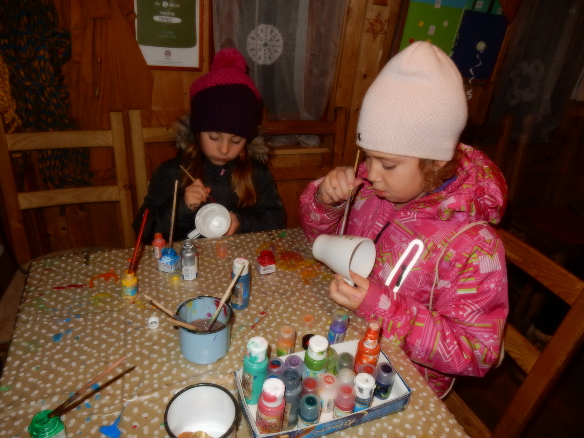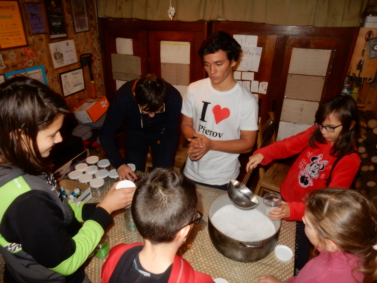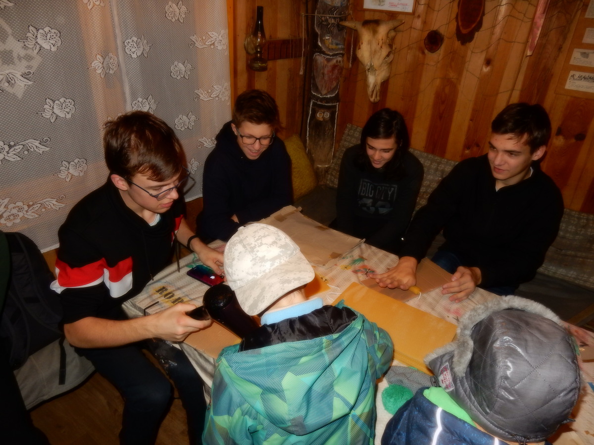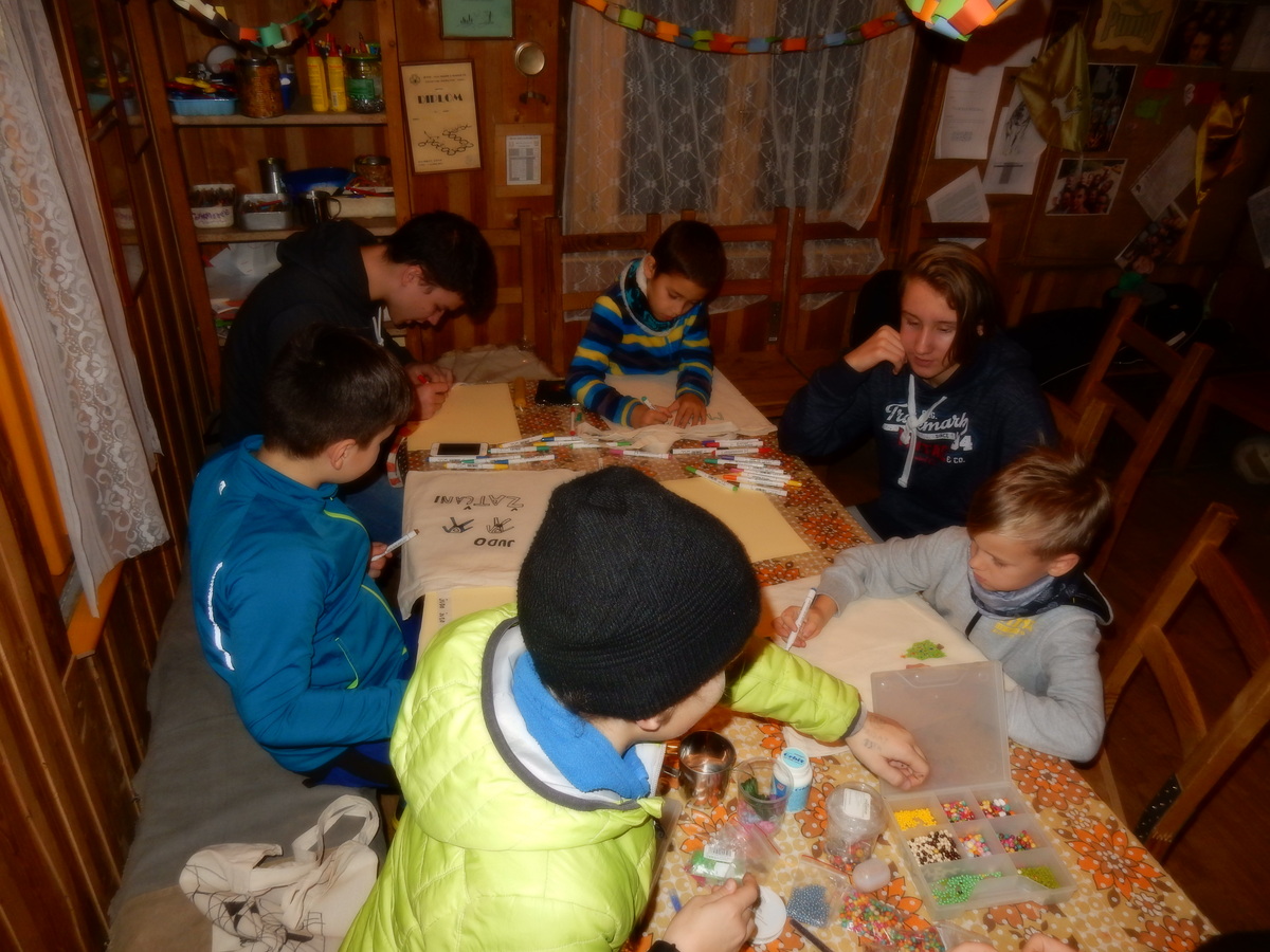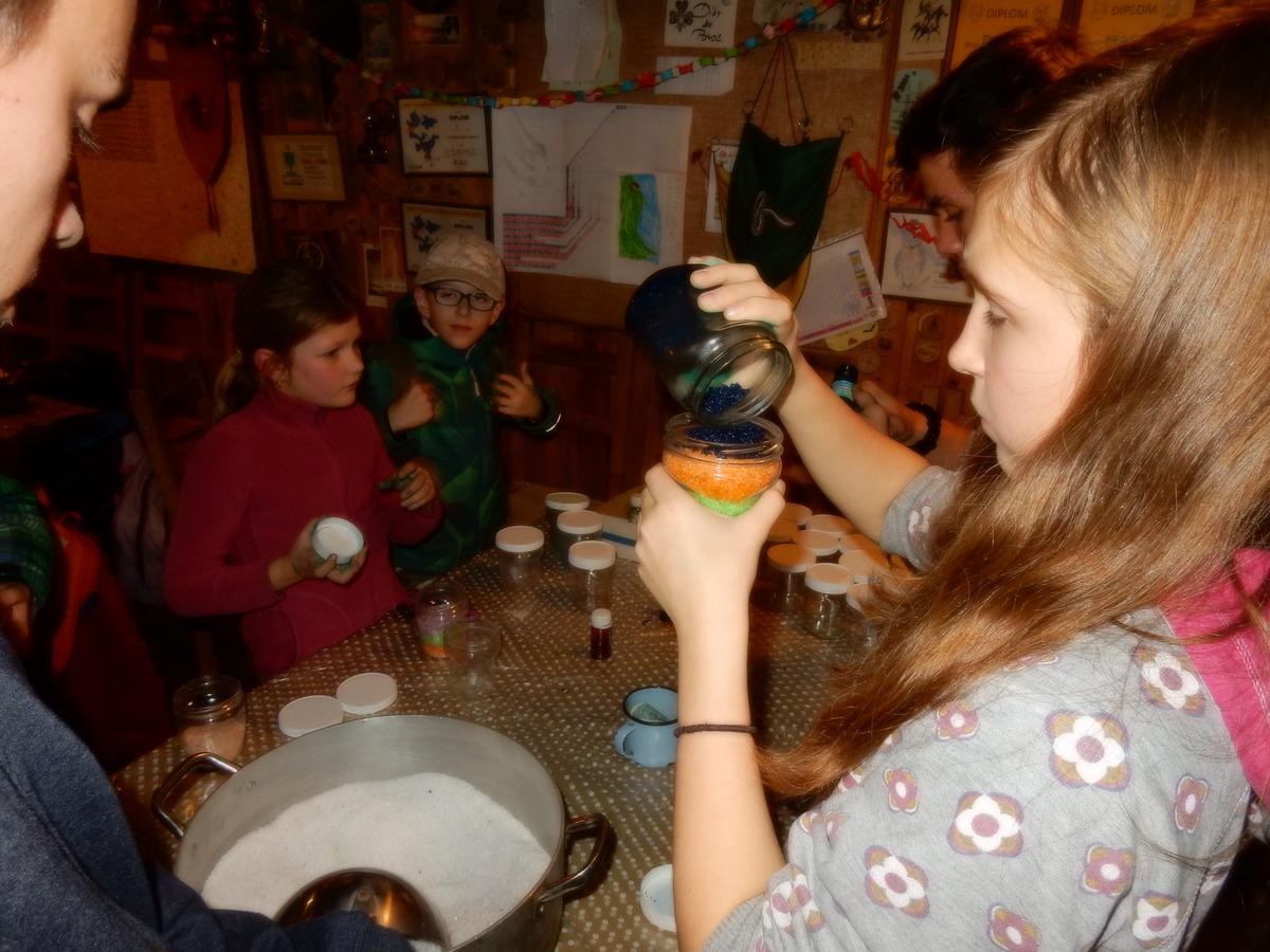 Pátek 13.12.2019. Všude řádí chřipky, šlapanická základka dokonce včera a dnes vyhlásila zavírací den, přesto se rukodělky docela povedly. Zájemců přišlo sice méně než loni, penízků se ale vybralo (a tudíž i výrobků vyrobilo) skoro stejně. A co že si mohli zájemci vyrobit? Ve Staré Boudě se usadil Honza Coufal spolu s Tygry a zájemci si zde mohli zhotovit svíčku ze včelího vosku. Hned vedle v Nové Boudě si mohli u Roxyho vyzdobit plátěnou nákupní tašku nebo u Džanyho stvořit leccos z bavlnek a korálků. Nejvíc husto bylo ve Trojce. U kamen a na lince odlévali do formiček zdobená mýdla Kloub s Krysaříkem, u vedlejšího stolu zase Filíš s Bertem barvili soli do koupele. Na dalším stole jsem já se zájemci svazoval trička k batikování a poslední dva stoly obsadila Terka s Renčou, u nichž se zdobily hrníčky a vázičky. Mladší členové se rozptýlili mezi výrobními místy, všelijak se přesouvali, mezi tím Pumy Ája se Soňou zdobily v podkroví vánoční stromeček a v koutě Staré Boudy Lost se Zubničkou stříhali film z letošního tábora. Prostě základna byla vytížena na 100%. Kolem šesté akce pomalu končila, mrňousci si s rozzářenými úsměvy odnášeli dárečky pro své blízké, vedoucí uklízeli zbylé ekvipmenty k výrobkům a osazenstvo základny se začalo měnit. Přicházeli sem nocovat starší členové, kteří zítra brzy ráno vyrazí pro Betlémské světlo do Vídně... Jura