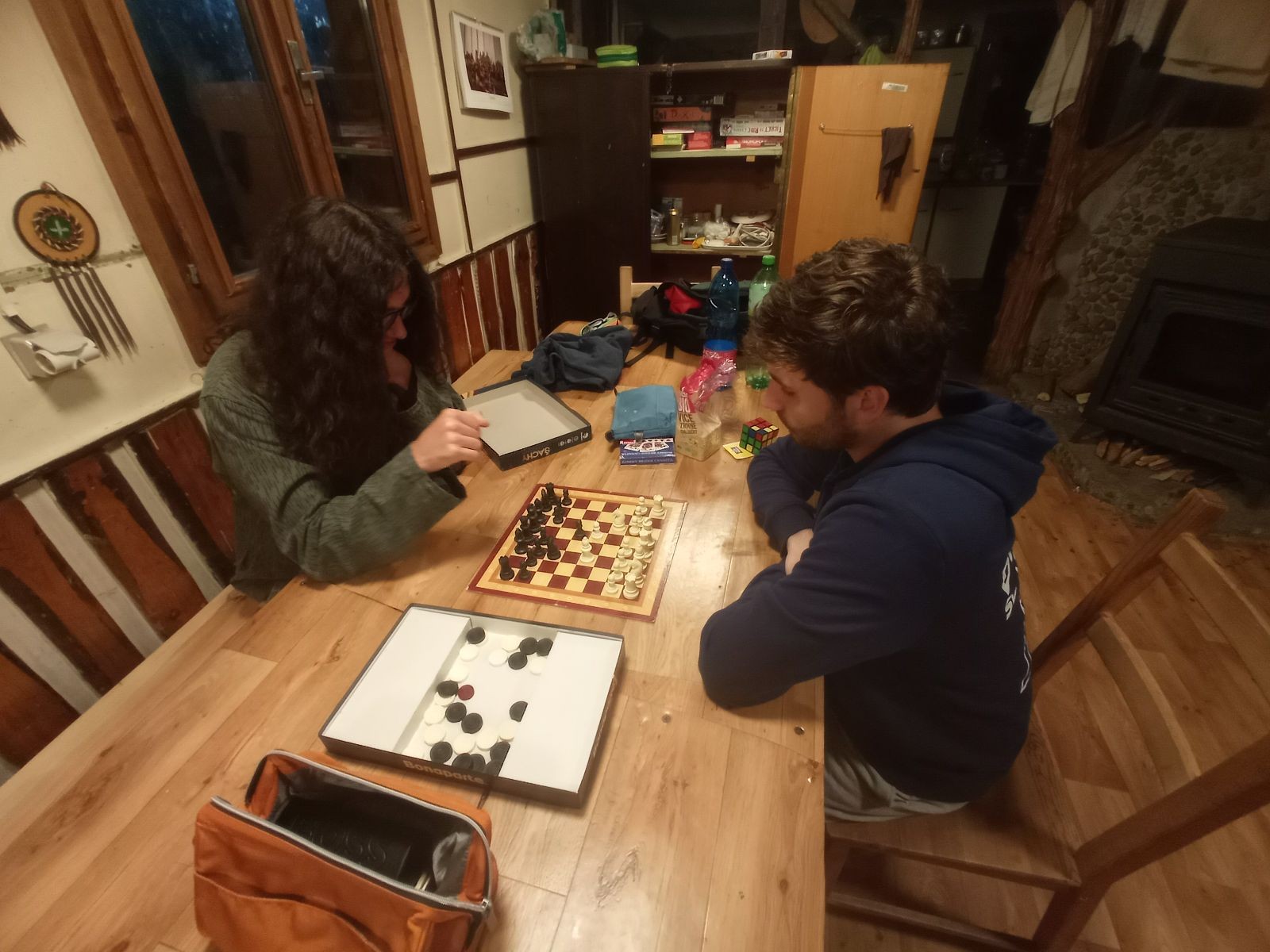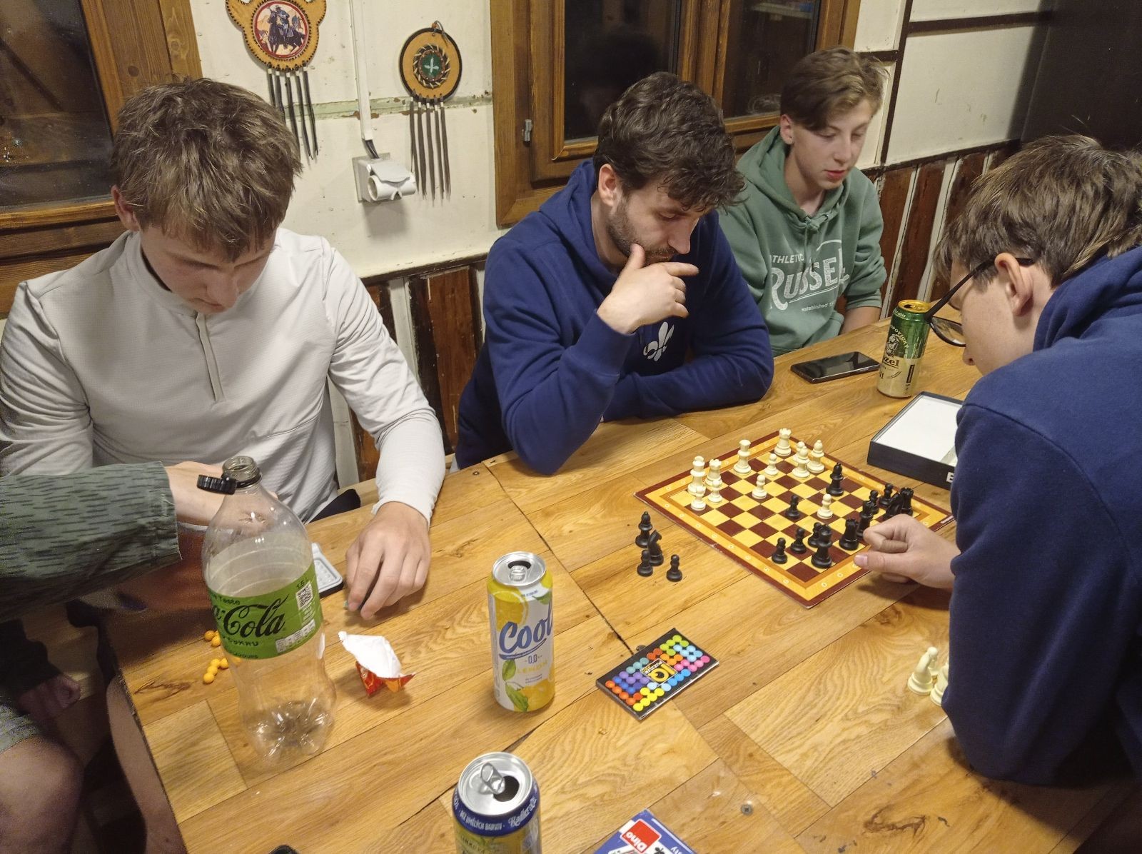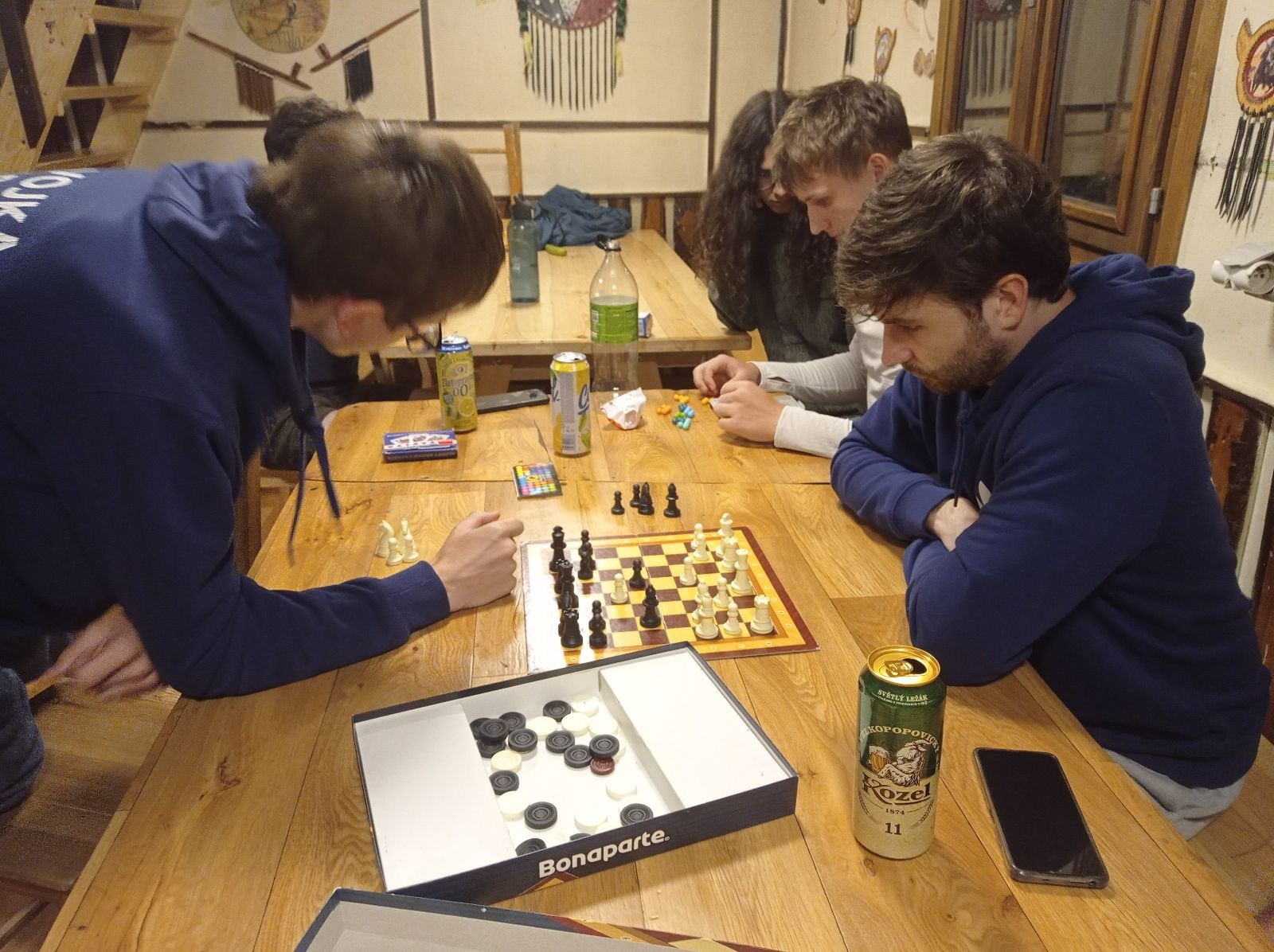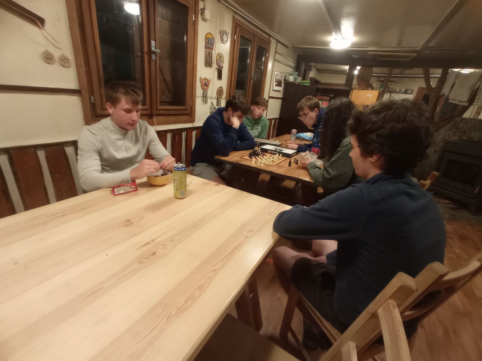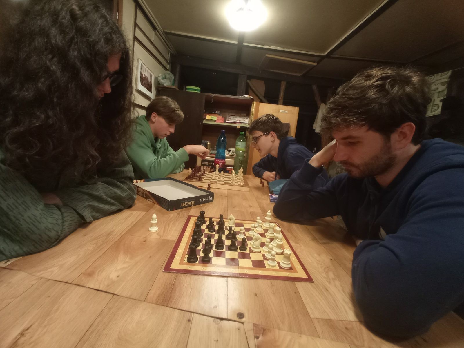 Mezi šestou a sedmou hodinou jsme rozdělali oheň a začali opékat špekáčky. Kolem půl jedenácté jsme se přesunuli do chaty a znovu hráli šachy a Bang. Tentokrát jsme to docela protáhli a šli jsme spát až o půl druhé ráno.