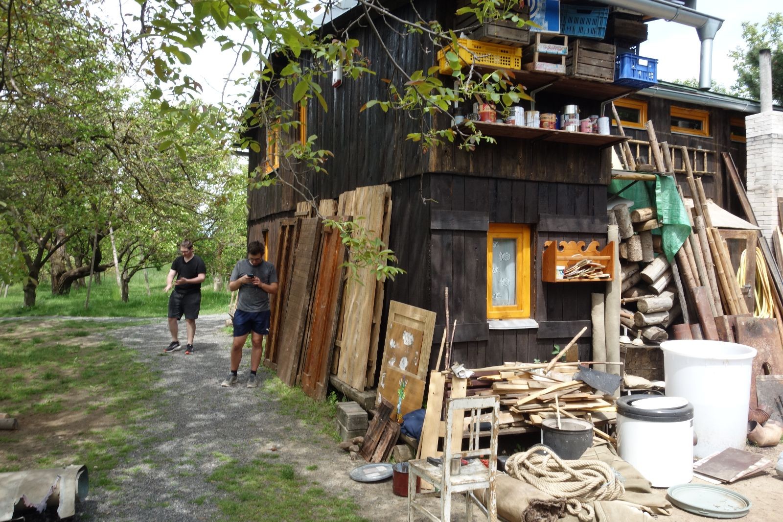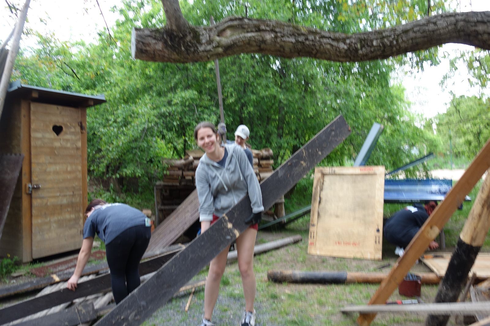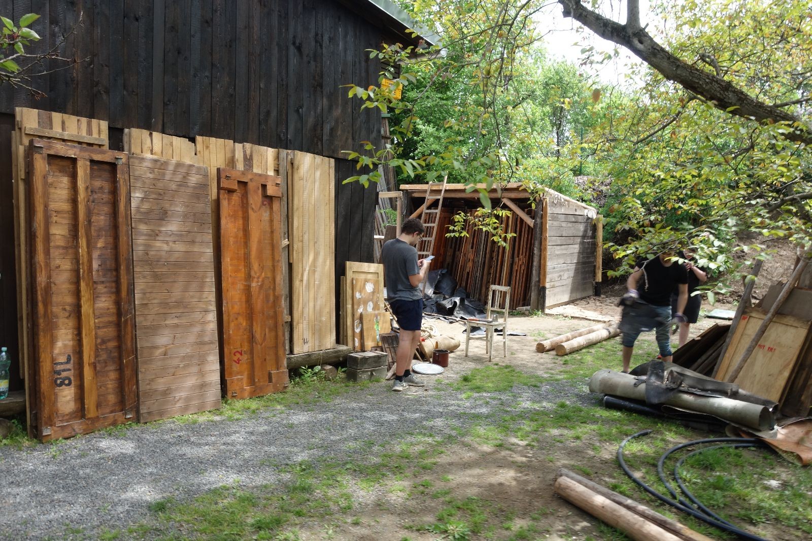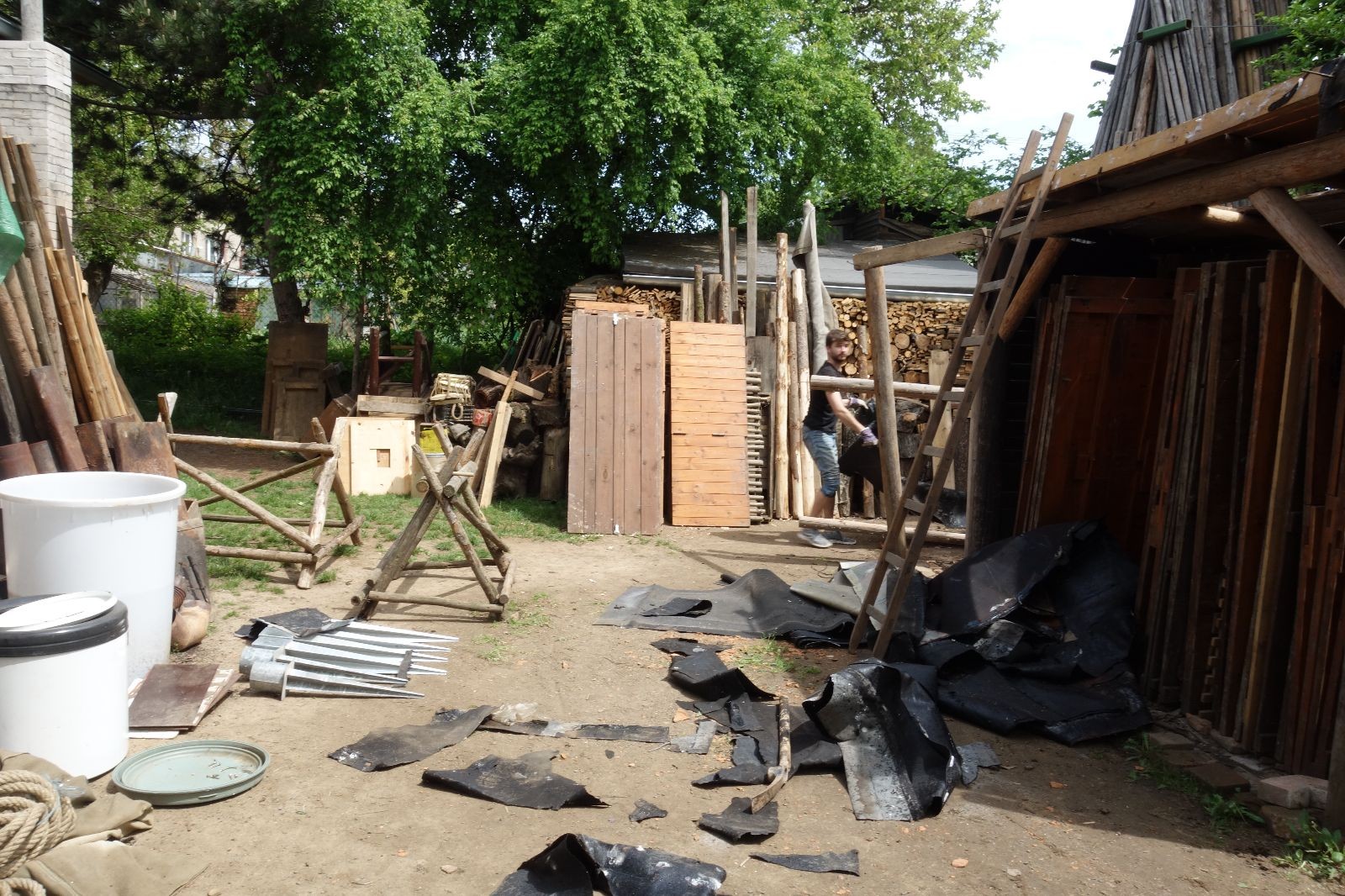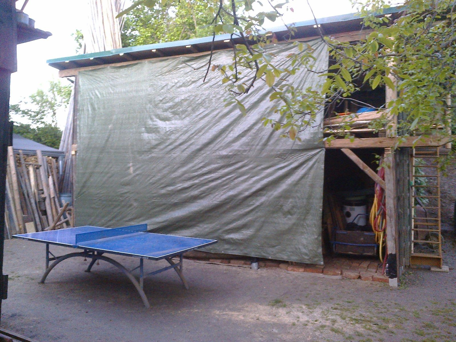 V neděli zbývalo dodělat kousíček podkroví, připevnit okap a zajistit otevřený předek plachtou. A samozřejmě nanosit do nové stavby všechno táborové vybavení, které mezi tím čekalo v klubovnách nebo přikryté venku. Lehčí věci nahoru, těžké a velké dolů. Do oběda nebylo co dělat. Zbývají dvě poslední věci: nátěr Luxolem, o který se postarají Brácha, Hihňa a Corado a nová plachta na přední stěnu – tu poptal Uzel.