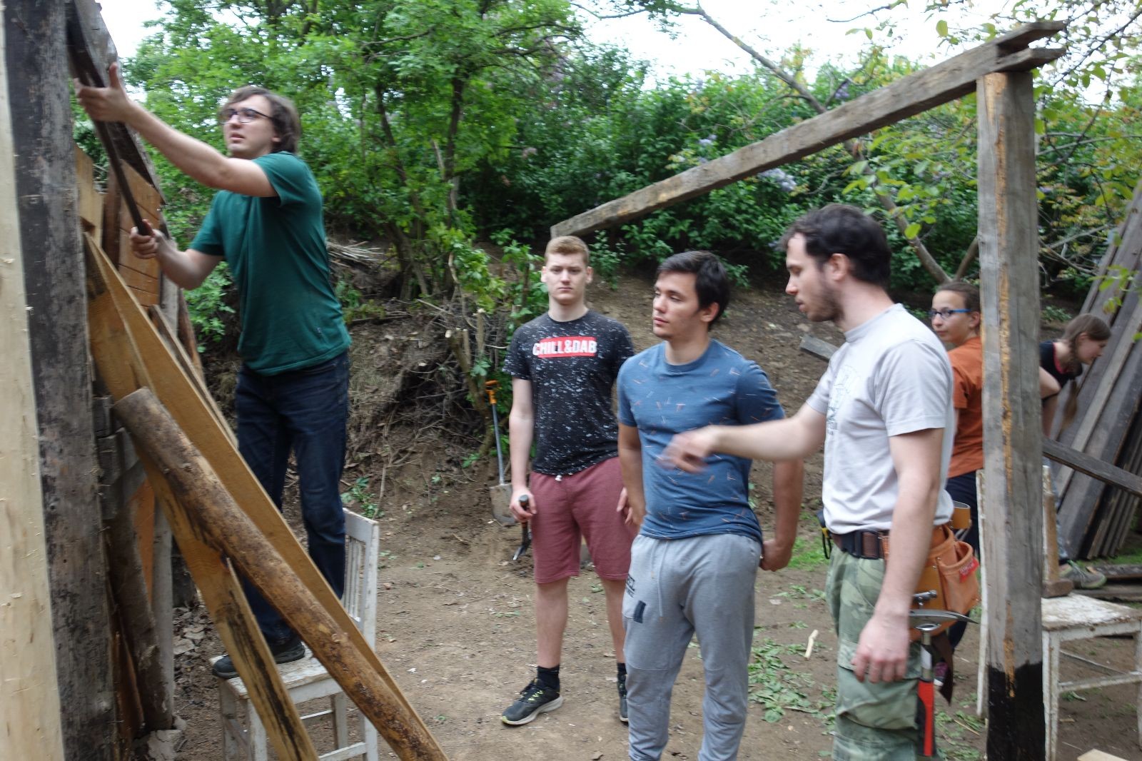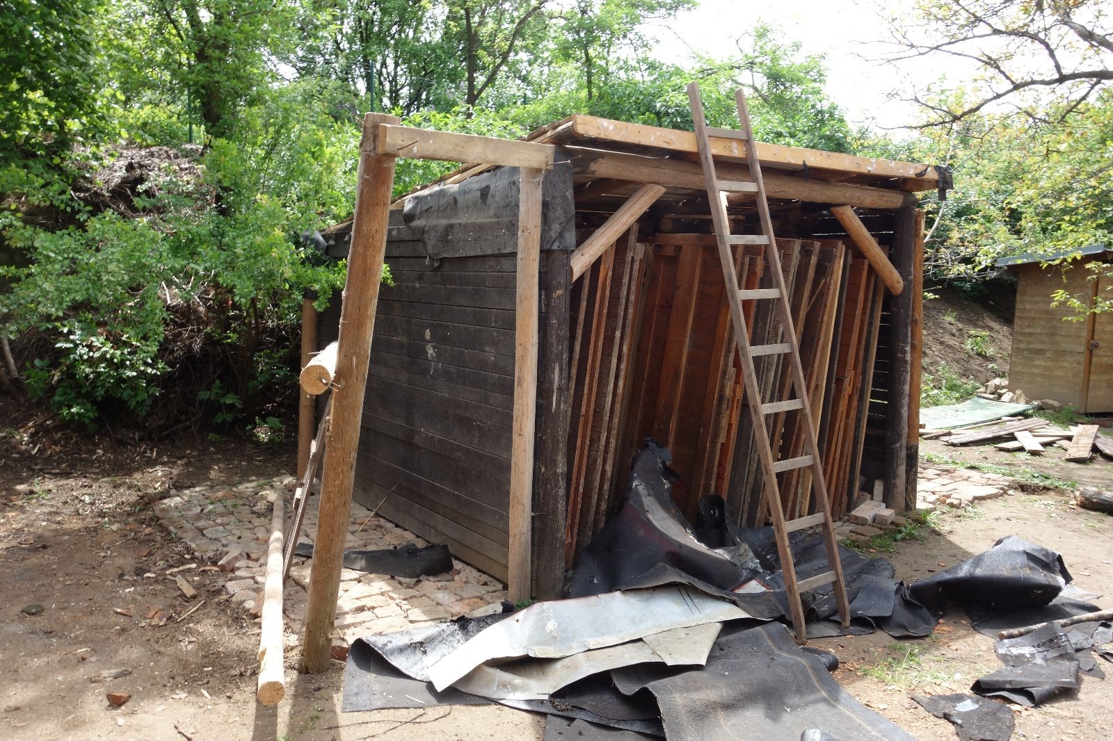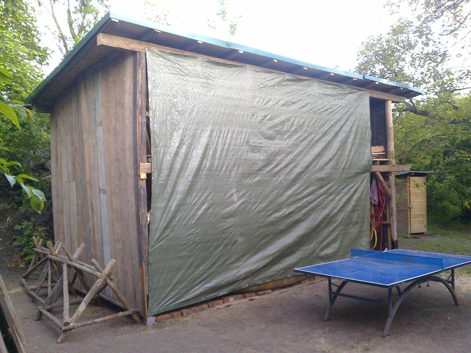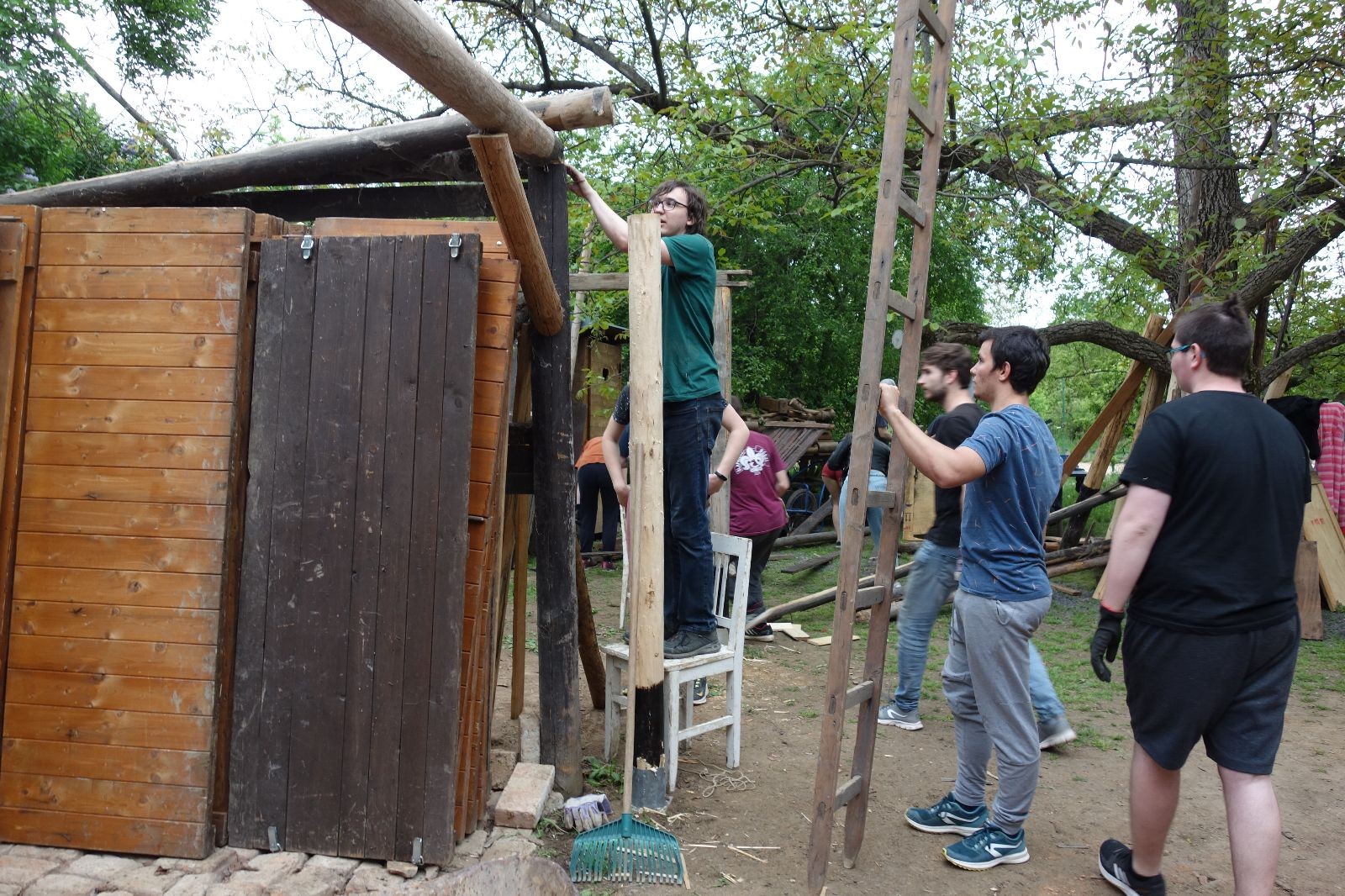 Dlouho dopředu plánovaná akce konečně proběhla. Faktem je, že starý podsadovník na půdorysu 3x3 metry se stavěl kdysi koncem 90. let. Jak přibývalo táborového vybavení, časem k němu bývalí členové Eda, Kartáček a spol. přistavěli první přílepek široký něco přes metr. Chvíli to stačilo, ale před nějakými pěti lety se přistavovalo znovu. Druhý přílepek měl něco kolem dvou metrů, smontovala ho dvojčata Hodkovic z dřevotřískových ploten, které nám věnoval kamarád Ondra Libus. Vzhledem k tomu, jak dynamicky nám roste členská základna, ani ten dlouho nestačil a vybavení se skladovalo, kde to šlo. Neúnosná situace.