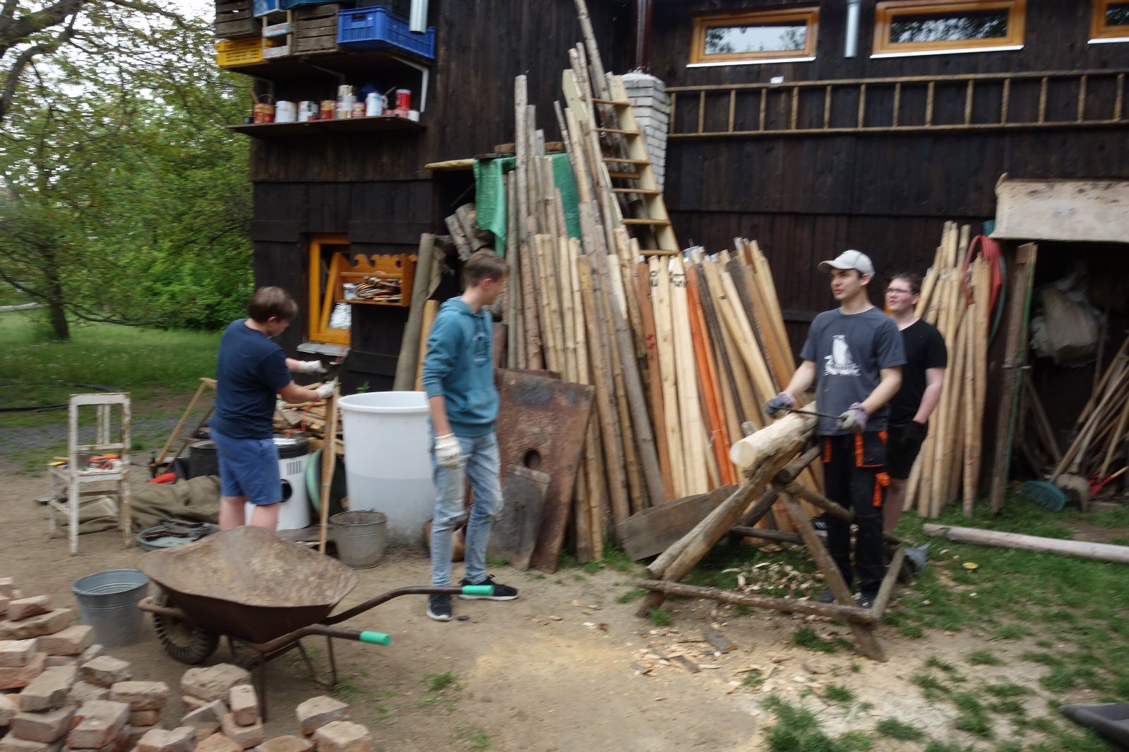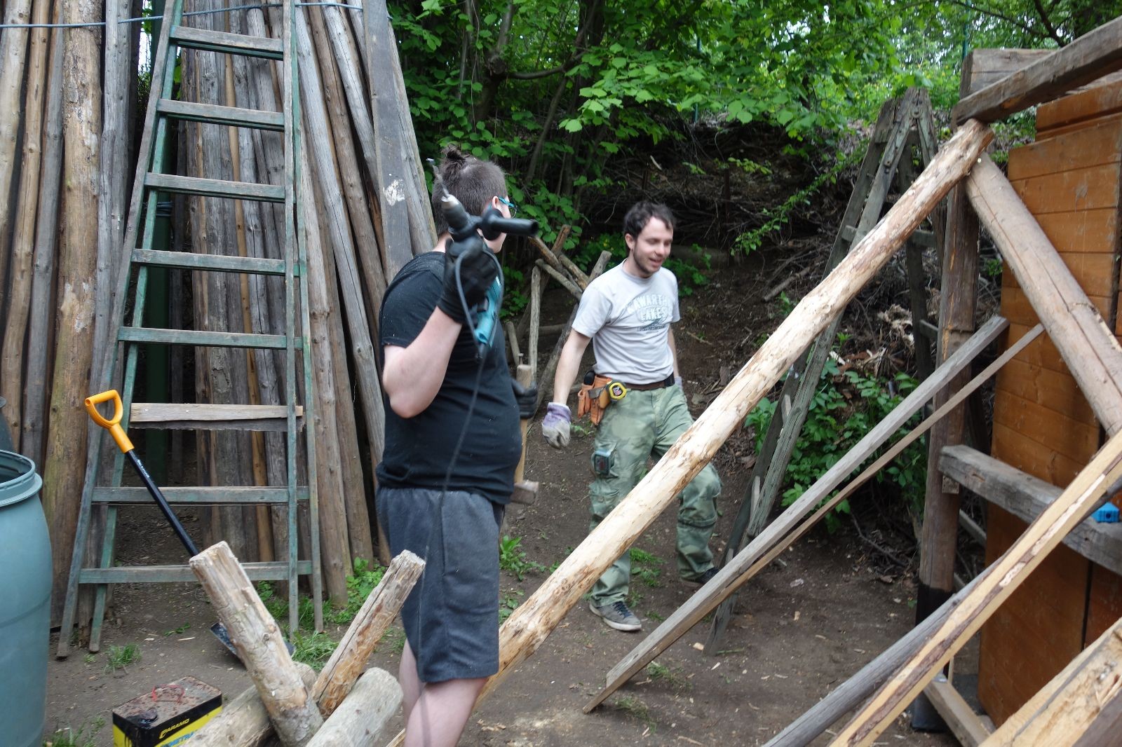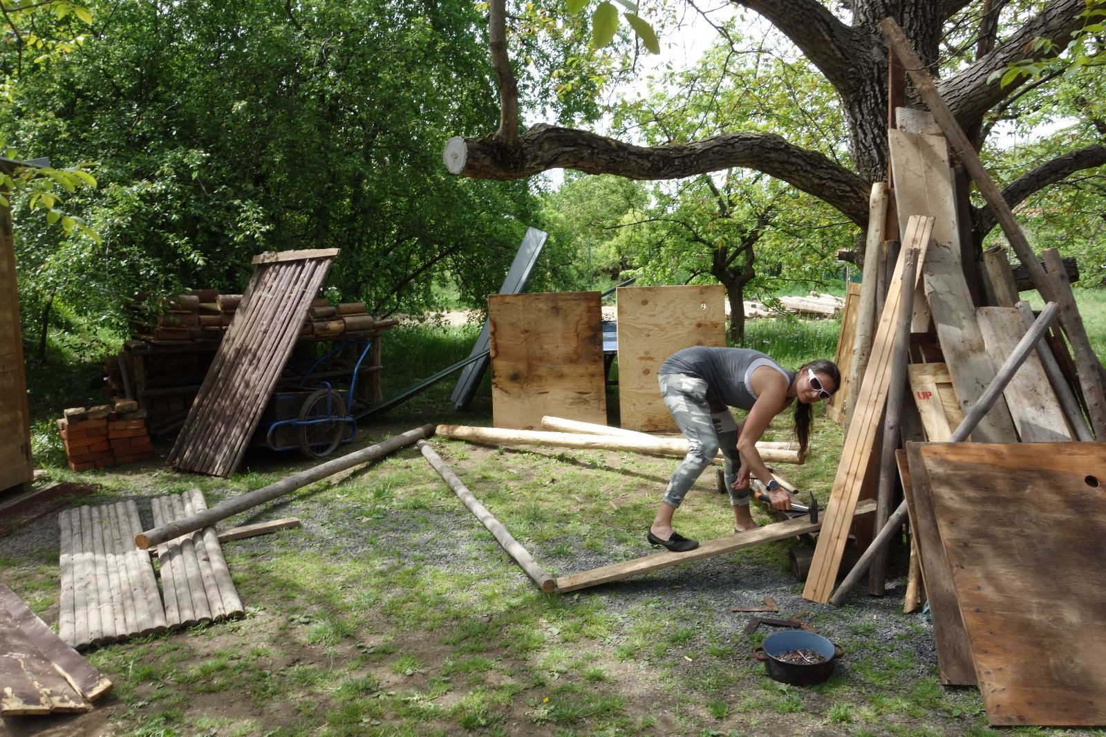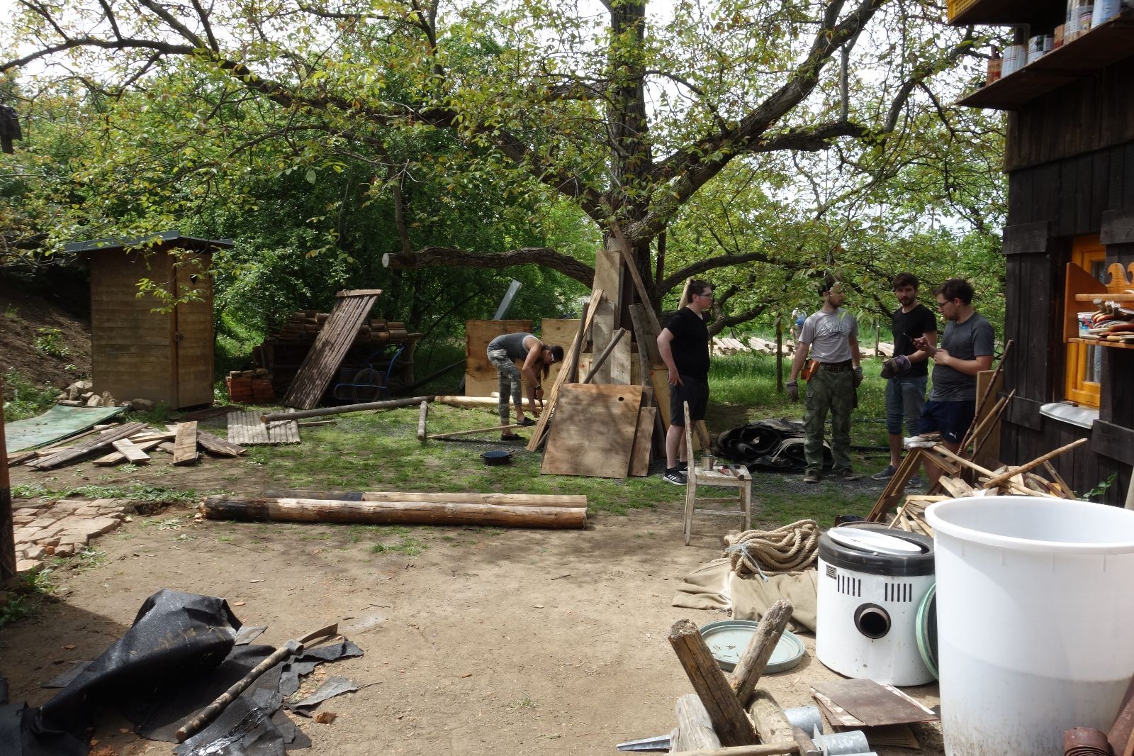 Dlouho dopředu plánovaná akce konečně proběhla. Faktem je, že starý podsadovník na půdorysu 3x3 metry se stavěl kdysi koncem 90. let. Jak přibývalo táborového vybavení, časem k němu bývalí členové Eda, Kartáček a spol. přistavěli první přílepek široký něco přes metr. Chvíli to stačilo, ale před nějakými pěti lety se přistavovalo znovu. Druhý přílepek měl něco kolem dvou metrů, smontovala ho dvojčata Hodkovic z dřevotřískových ploten, které nám věnoval kamarád Ondra Libus. Vzhledem k tomu, jak dynamicky nám roste členská základna, ani ten dlouho nestačil a vybavení se skladovalo, kde to šlo. Neúnosná situace.