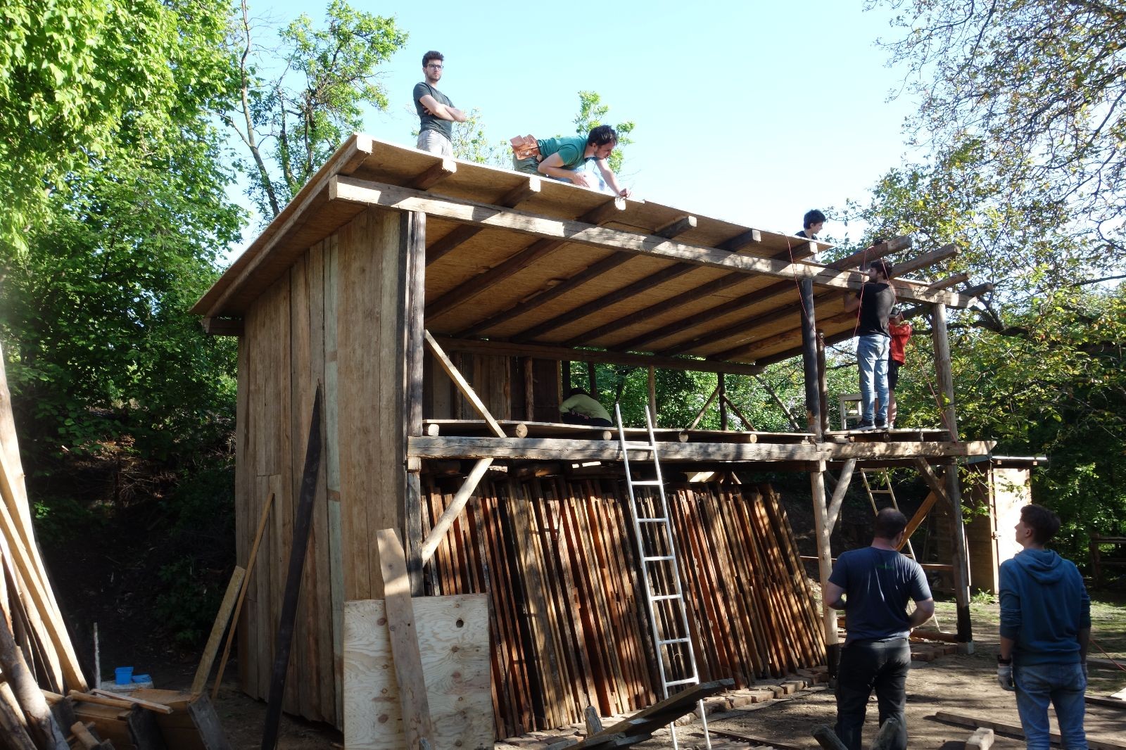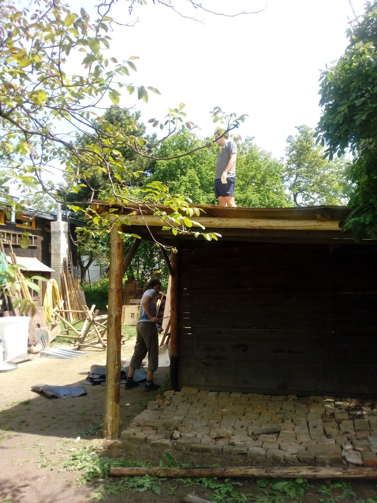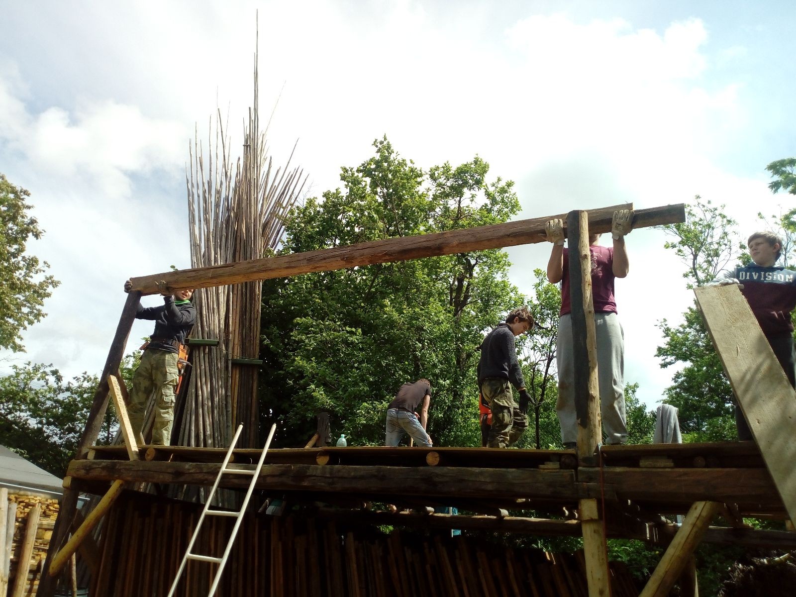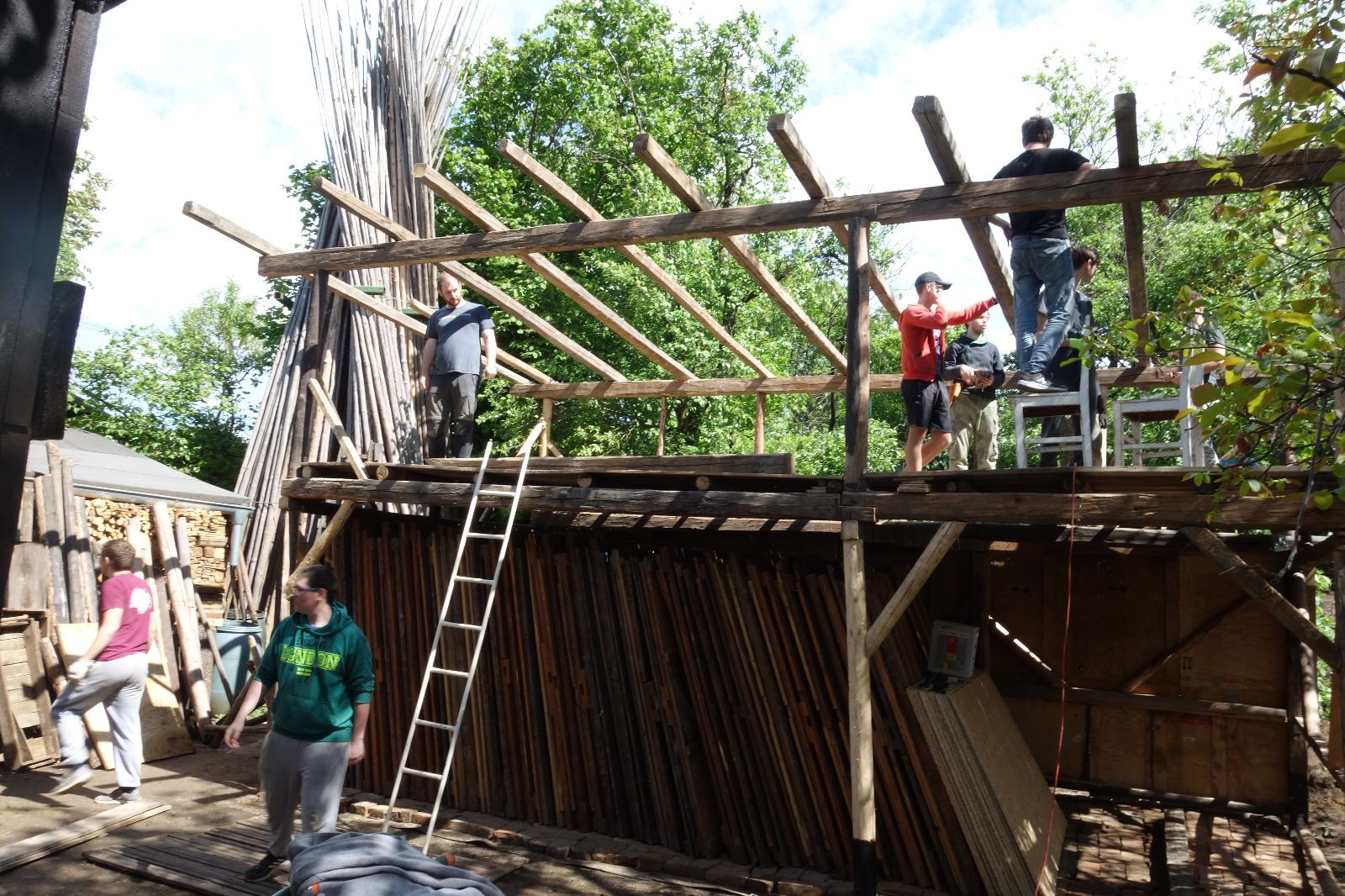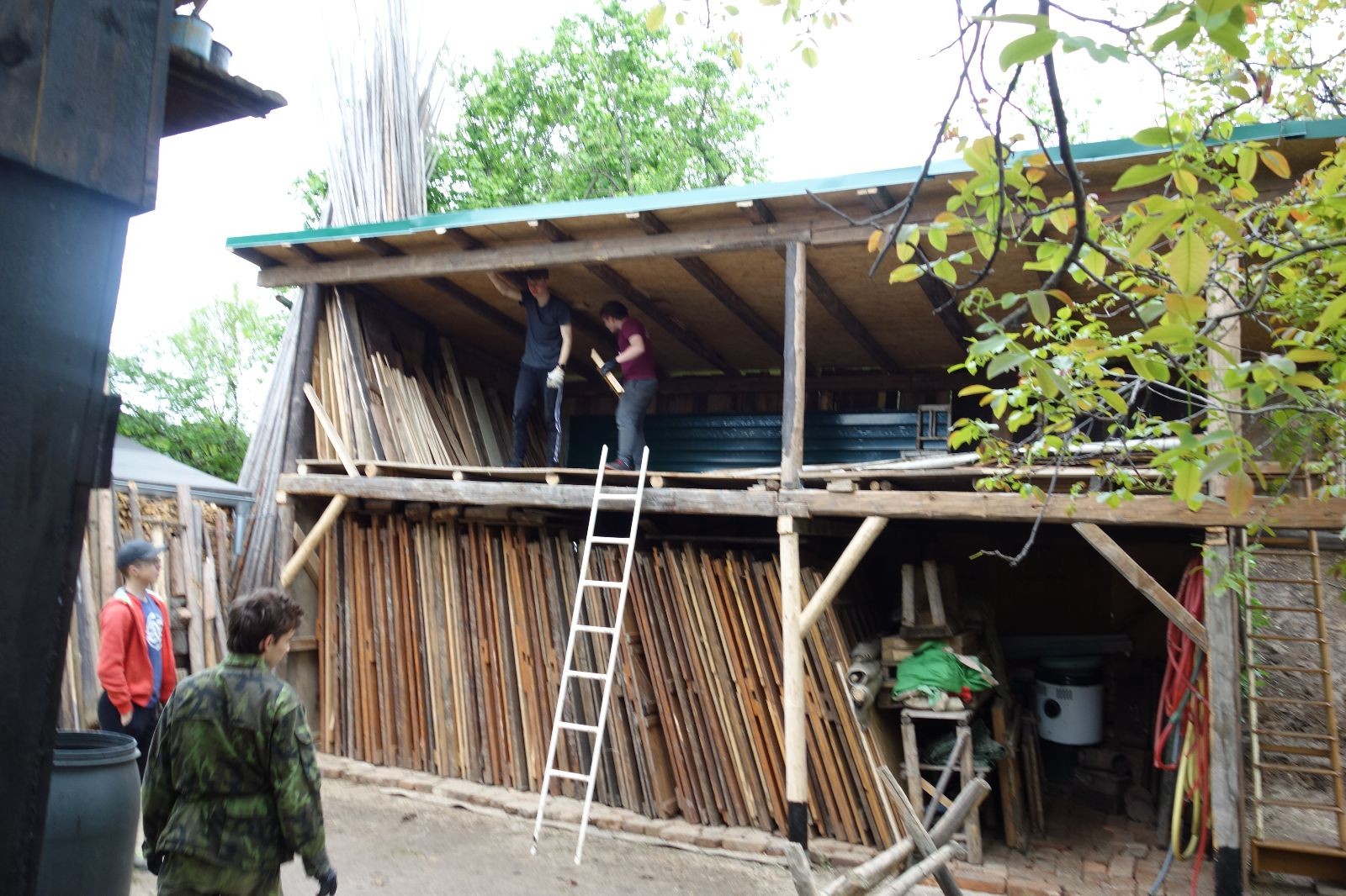 Původní představa byla, že nad stávajícím podsadovníkem nadstavíme nové patro. Zběžná prohlídka nosných trámů a střešních desek nás však přesvědčila, že to není dobrý nápad. Trámy byly zapuštěny do země natřené penetrákem a po letech už se jejich nosnost i kvalita limitně blížila nule. Podobně některé desky v místech, kde zatékalo, ztratily nosnost a druhé patro by určitě „nedaly“. Padlo tedy rozhodnutí vše vystěhovat, postavit stavbu plus mínus na stávajícím půdorysu znovu a rozšířit ji o podkroví. Projekt vypracoval Džany. Po plánování tábora o víkendu 15.-16. 5. jsme navozili trámy a stropní desky. No a v pátek 21.5. se mohlo začít. Nejprve bylo potřeba vše vystěhovat. Poté jsme zajeli nakoupit OSB desky, spojovací materiál a hlavně kovové patky, na které postavíme nosné trámy. Sešlo se nás ráno asi 10, ale jak šel čas, pracovitých rukou přibývalo a tak pátek končil prakticky hotovou konstrukcí dolní části. V sobotu nás nemile překvapil déšť, pršelo prakticky od pátečního večera. Naštěstí rozpracovaná konstrukce byla přikrytá velkou plachtou. Pokračovat v práci se dalo až někdy po desáté, zato lidiček se sešlo přes 30. Kromě vedoucích přišlo i několik Vlků, Pum a Tygrů. Práce šla pěkně od ruky a večer bylo prakticky hotovo. Konstrukce z trámů měla strop ze silných desek, podkroví pak střechu z OSB a krytinu z plechů od firmy Bravo Europa (sponzorský dar). K obití pak posloužily desky ze stávající stavby. Navíc jsme nový podsadovník opatřili schůdky do podkroví.