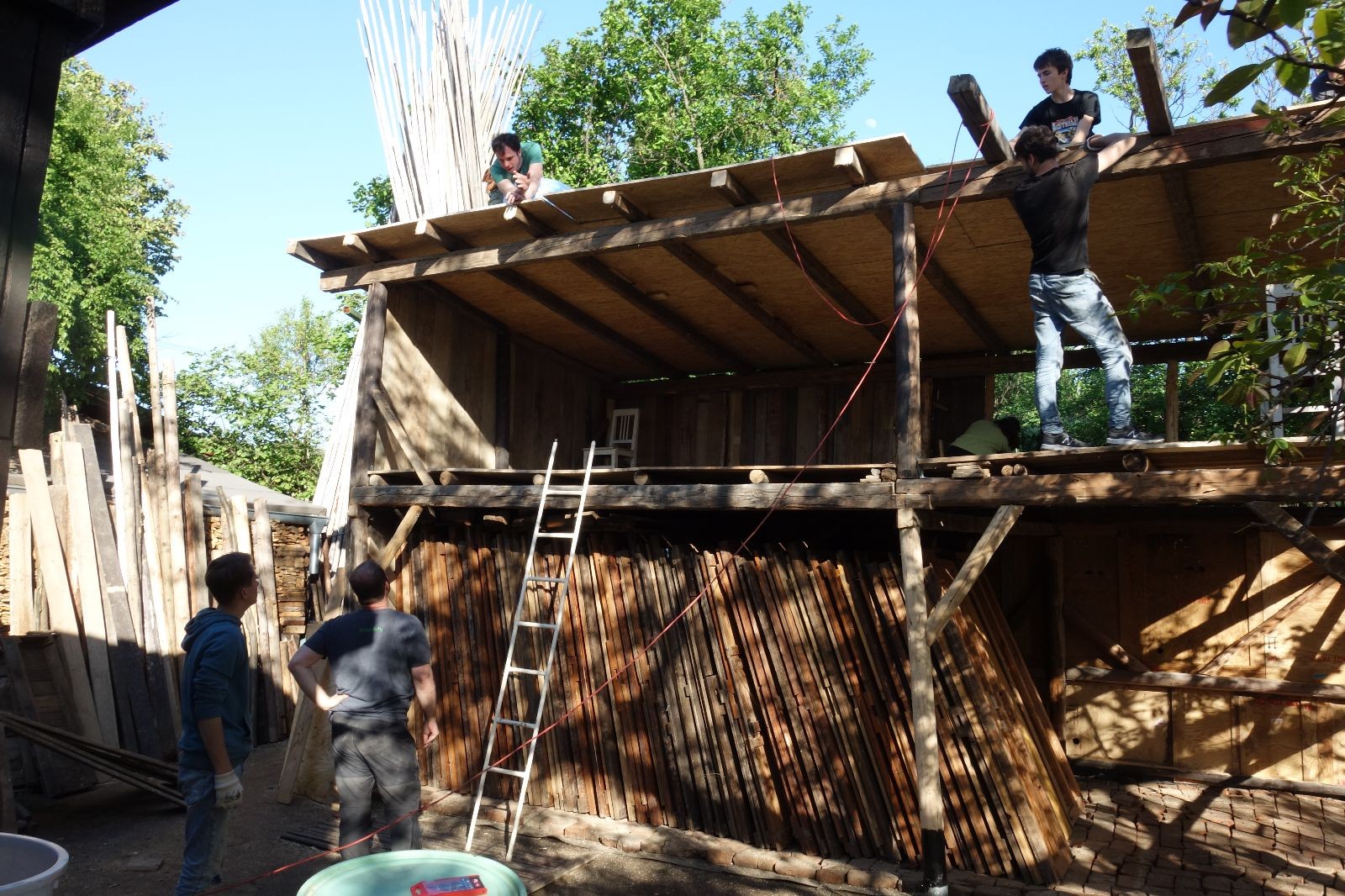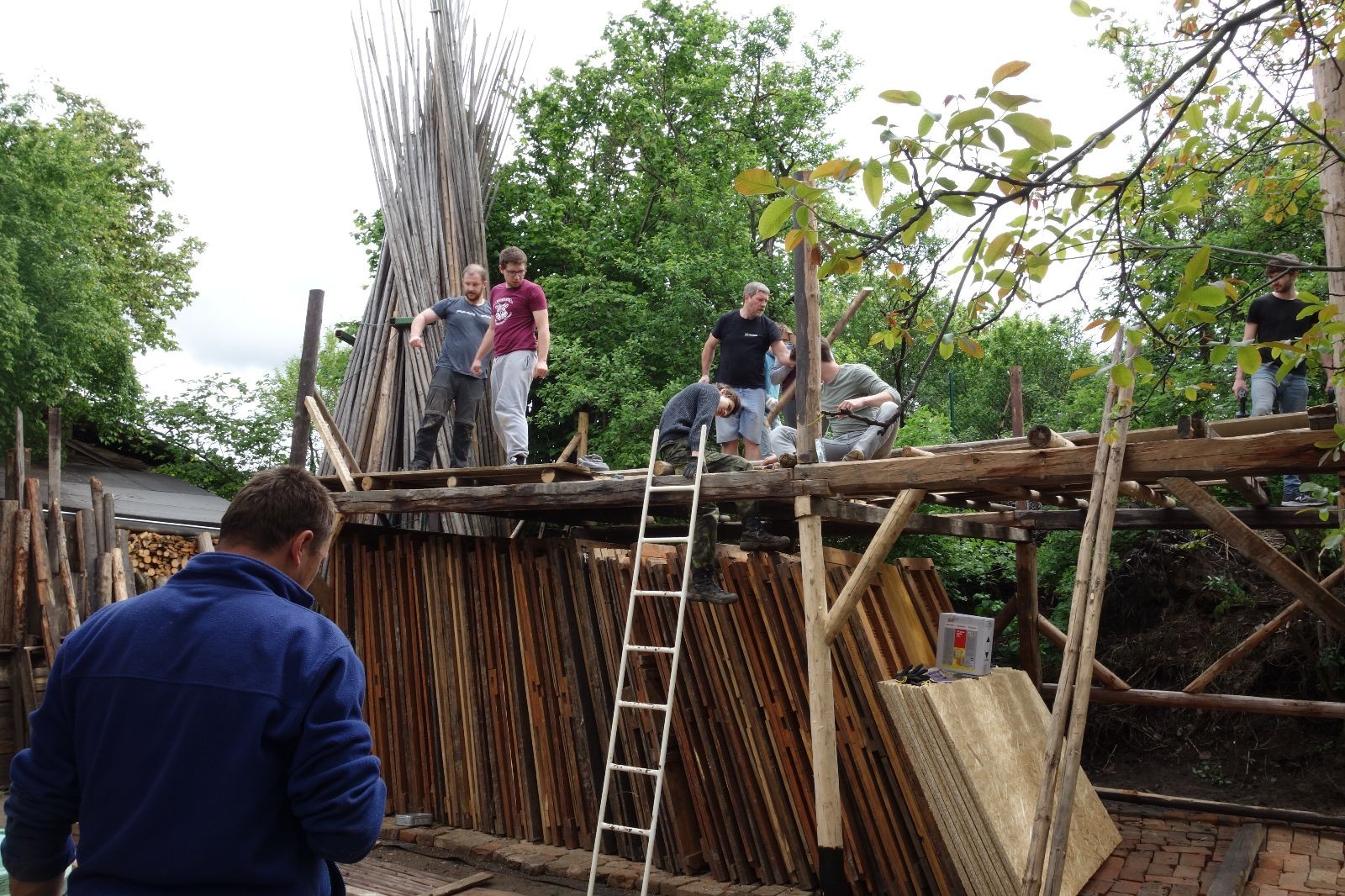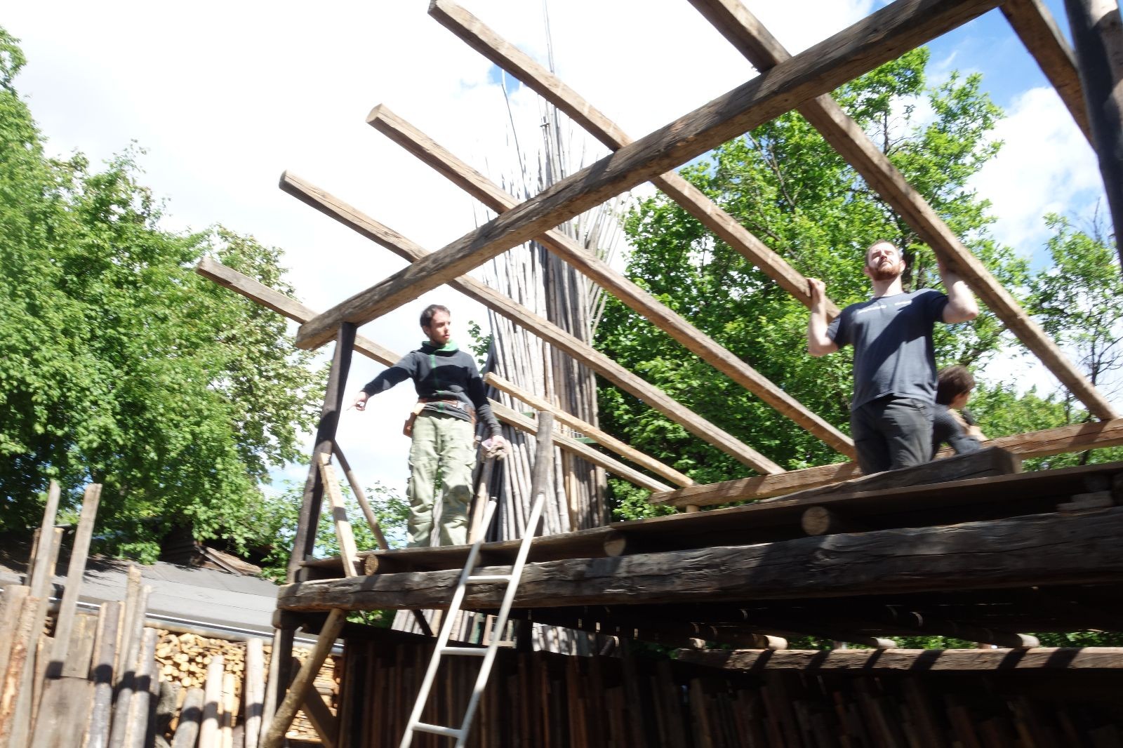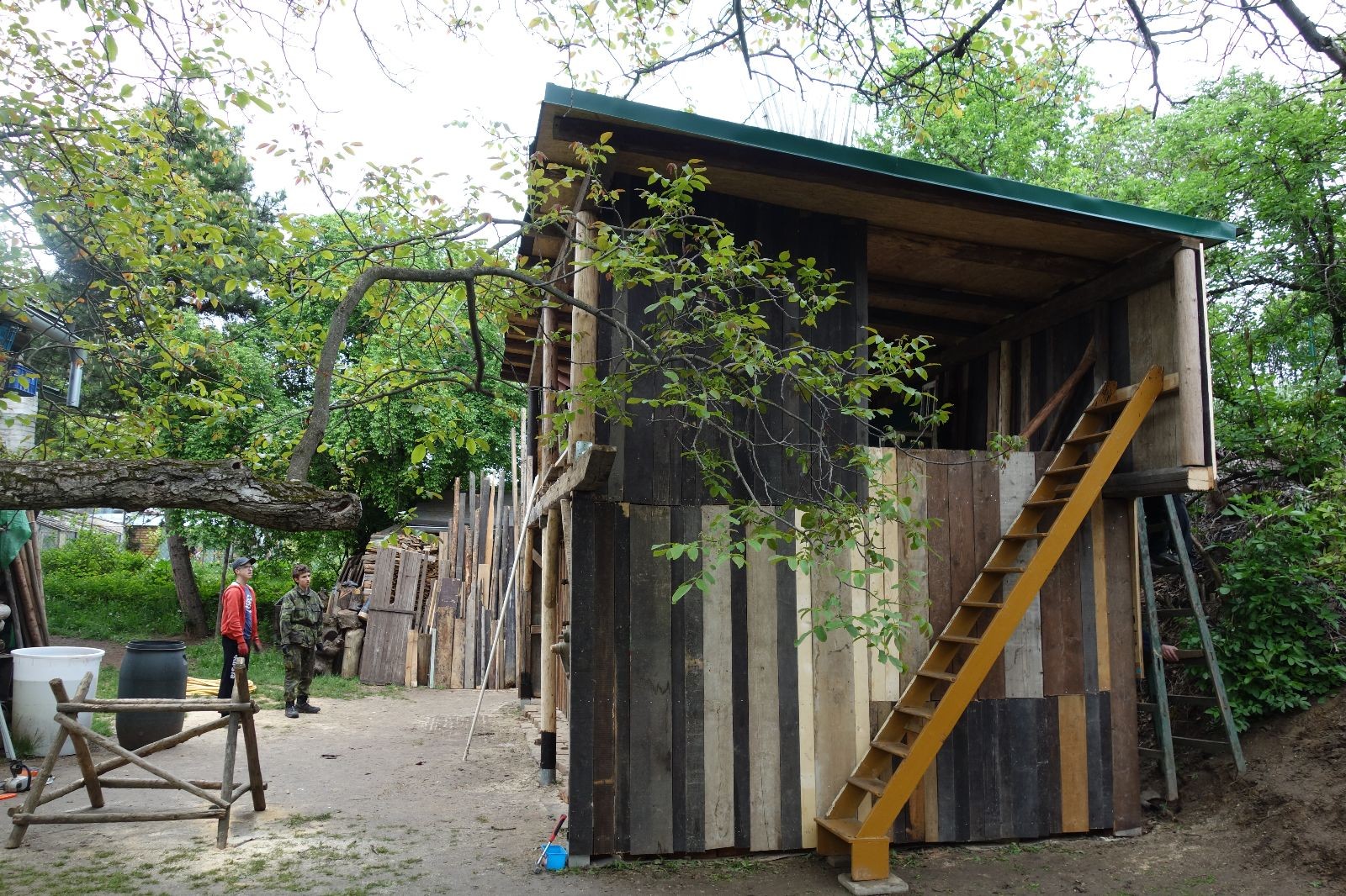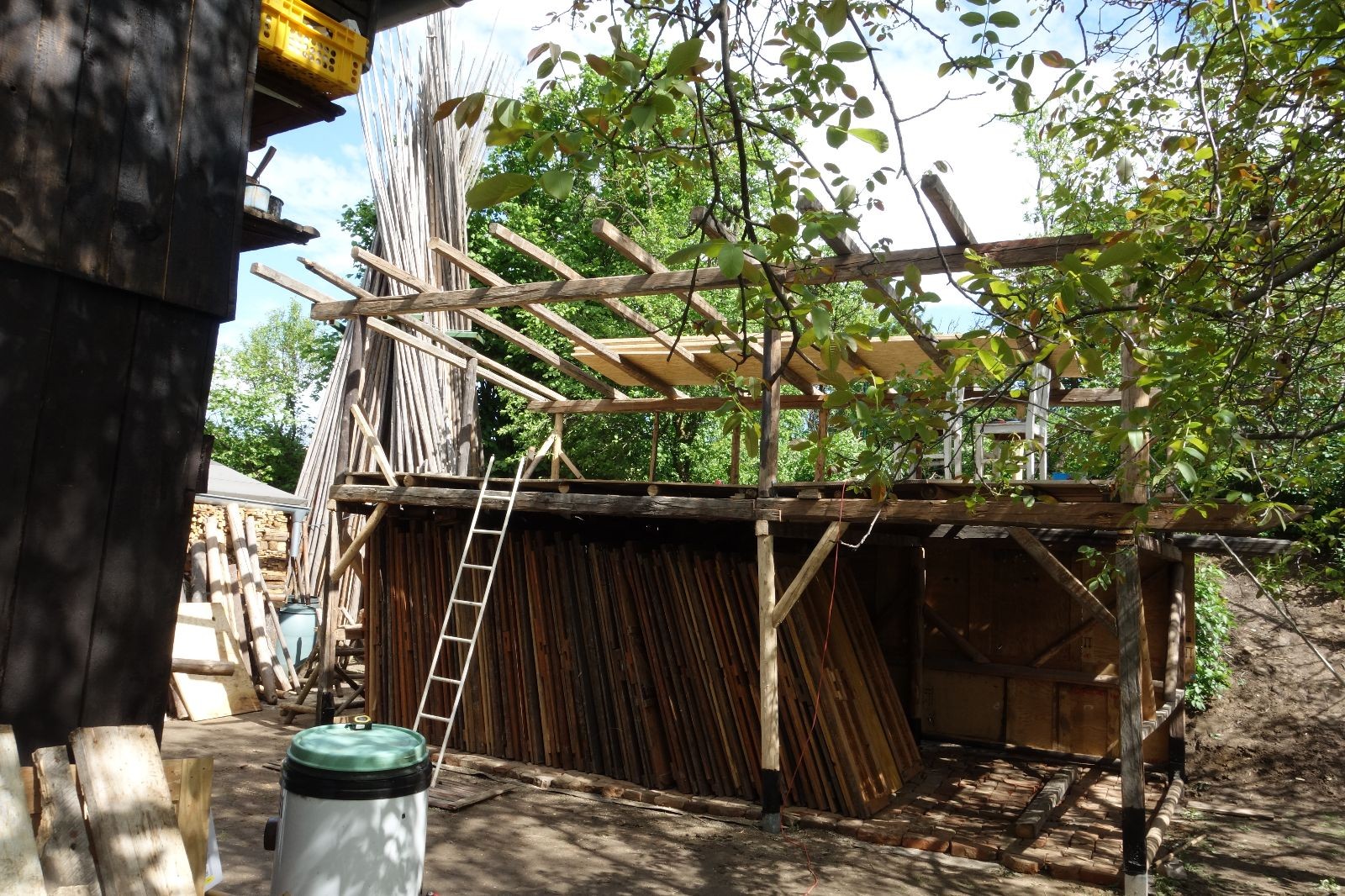 Původní představa byla, že nad stávajícím podsadovníkem nadstavíme nové patro. Zběžná prohlídka nosných trámů a střešních desek nás však přesvědčila, že to není dobrý nápad. Trámy byly zapuštěny do země natřené penetrákem a po letech už se jejich nosnost i kvalita limitně blížila nule. Podobně některé desky v místech, kde zatékalo, ztratily nosnost a druhé patro by určitě „nedaly“. Padlo tedy rozhodnutí vše vystěhovat, postavit stavbu plus mínus na stávajícím půdorysu znovu a rozšířit ji o podkroví. Projekt vypracoval Džany. Po plánování tábora o víkendu 15.-16. 5. jsme navozili trámy a stropní desky. No a v pátek 21.5. se mohlo začít. Nejprve bylo potřeba vše vystěhovat. Poté jsme zajeli nakoupit OSB desky, spojovací materiál a hlavně kovové patky, na které postavíme nosné trámy. Sešlo se nás ráno asi 10, ale jak šel čas, pracovitých rukou přibývalo a tak pátek končil prakticky hotovou konstrukcí dolní části. V sobotu nás nemile překvapil déšť, pršelo prakticky od pátečního večera. Naštěstí rozpracovaná konstrukce byla přikrytá velkou plachtou. Pokračovat v práci se dalo až někdy po desáté, zato lidiček se sešlo přes 30. Kromě vedoucích přišlo i několik Vlků, Pum a Tygrů. Práce šla pěkně od ruky a večer bylo prakticky hotovo. Konstrukce z trámů měla strop ze silných desek, podkroví pak střechu z OSB a krytinu z plechů od firmy Bravo Europa (sponzorský dar). K obití pak posloužily desky ze stávající stavby. Navíc jsme nový podsadovník opatřili schůdky do podkroví.