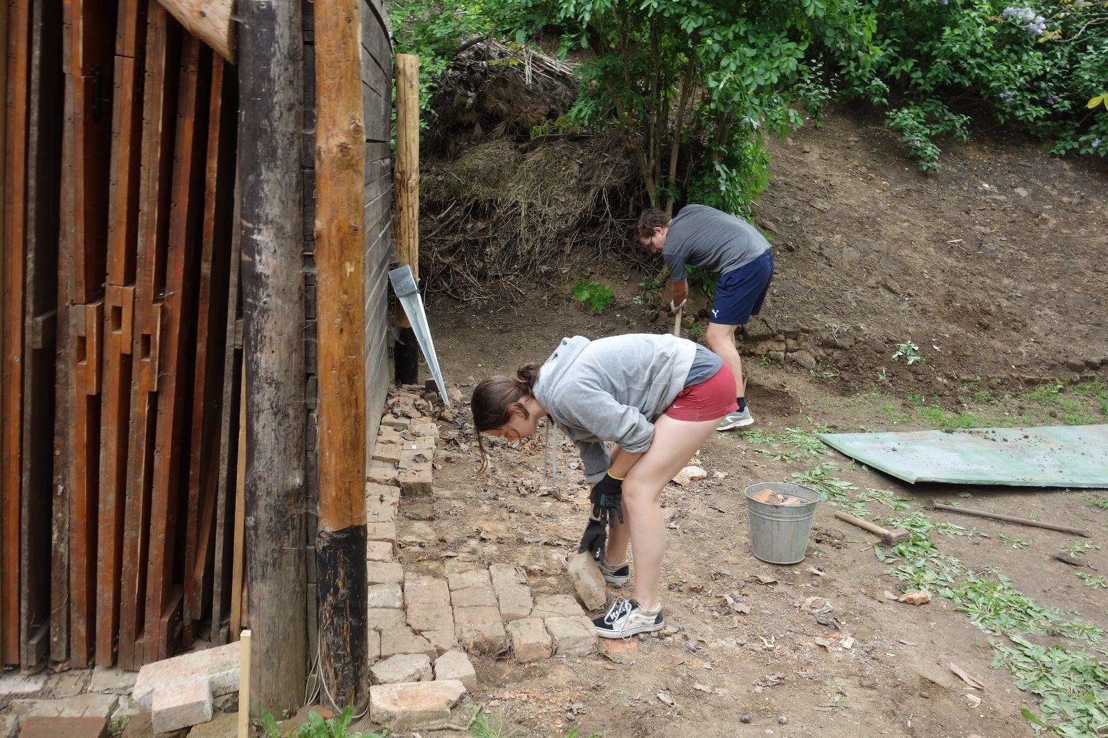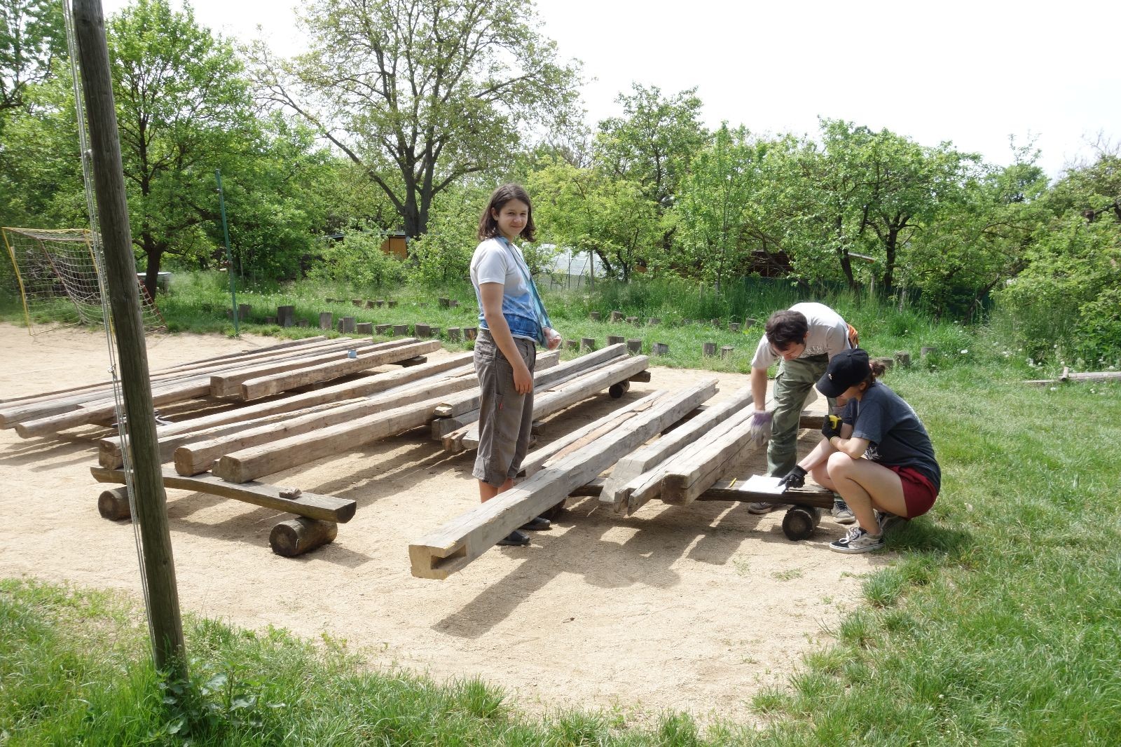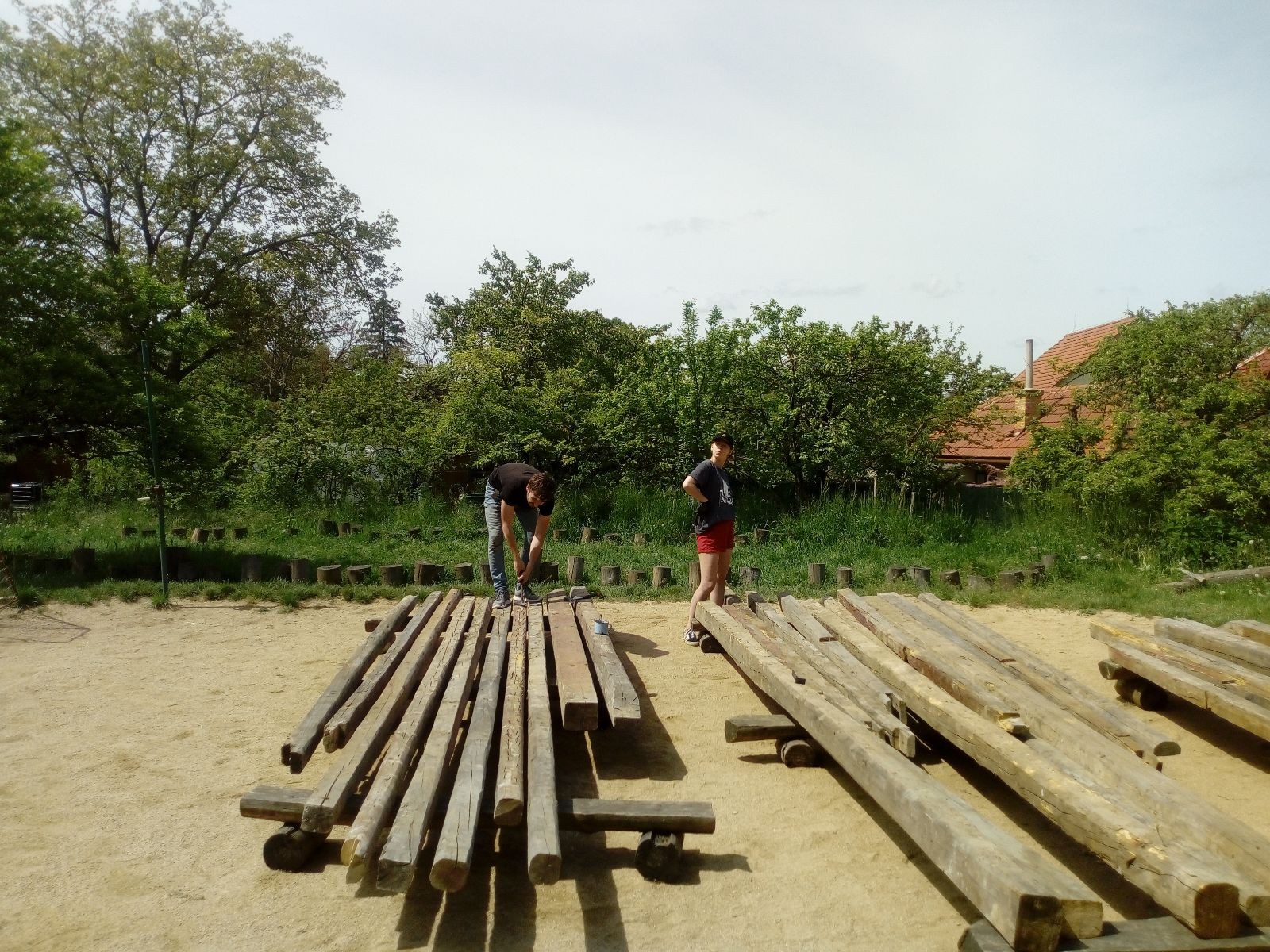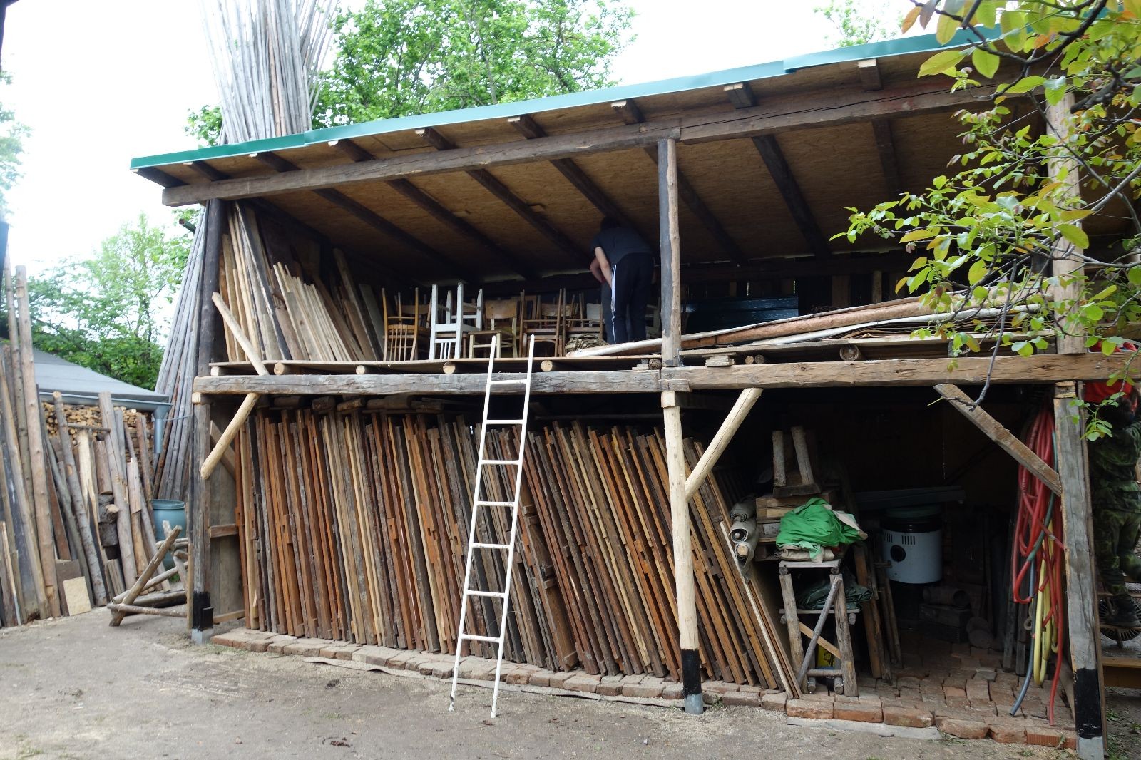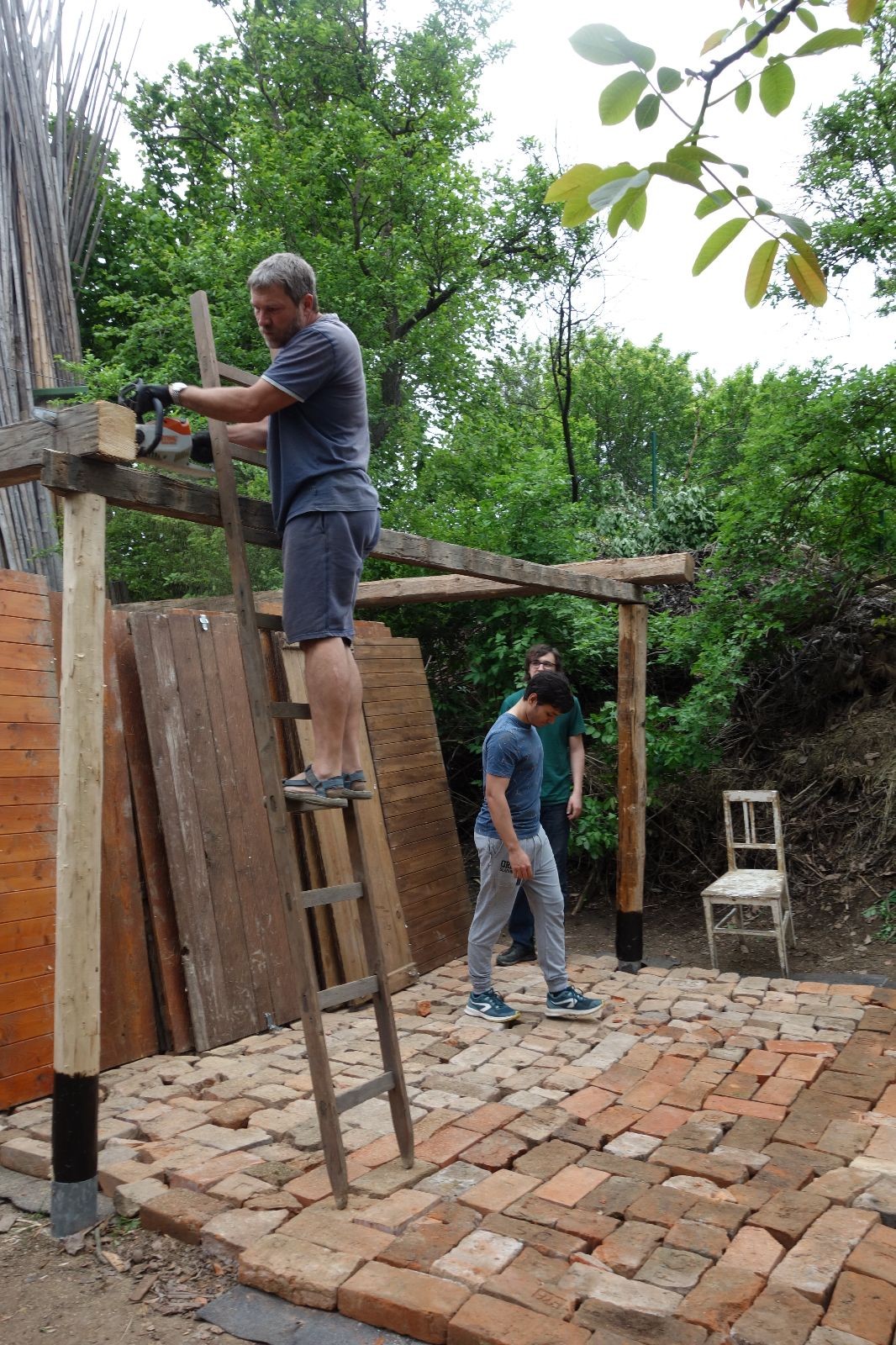 Původní představa byla, že nad stávajícím podsadovníkem nadstavíme nové patro. Zběžná prohlídka nosných trámů a střešních desek nás však přesvědčila, že to není dobrý nápad. Trámy byly zapuštěny do země natřené penetrákem a po letech už se jejich nosnost i kvalita limitně blížila nule. Podobně některé desky v místech, kde zatékalo, ztratily nosnost a druhé patro by určitě „nedaly“. Padlo tedy rozhodnutí vše vystěhovat, postavit stavbu plus mínus na stávajícím půdorysu znovu a rozšířit ji o podkroví. Projekt vypracoval Džany. Po plánování tábora o víkendu 15.-16. 5. jsme navozili trámy a stropní desky. No a v pátek 21.5. se mohlo začít. Nejprve bylo potřeba vše vystěhovat. Poté jsme zajeli nakoupit OSB desky, spojovací materiál a hlavně kovové patky, na které postavíme nosné trámy. Sešlo se nás ráno asi 10, ale jak šel čas, pracovitých rukou přibývalo a tak pátek končil prakticky hotovou konstrukcí dolní části. V sobotu nás nemile překvapil déšť, pršelo prakticky od pátečního večera. Naštěstí rozpracovaná konstrukce byla přikrytá velkou plachtou. Pokračovat v práci se dalo až někdy po desáté, zato lidiček se sešlo přes 30. Kromě vedoucích přišlo i několik Vlků, Pum a Tygrů. Práce šla pěkně od ruky a večer bylo prakticky hotovo. Konstrukce z trámů měla strop ze silných desek, podkroví pak střechu z OSB a krytinu z plechů od firmy Bravo Europa (sponzorský dar). K obití pak posloužily desky ze stávající stavby. Navíc jsme nový podsadovník opatřili schůdky do podkroví.
