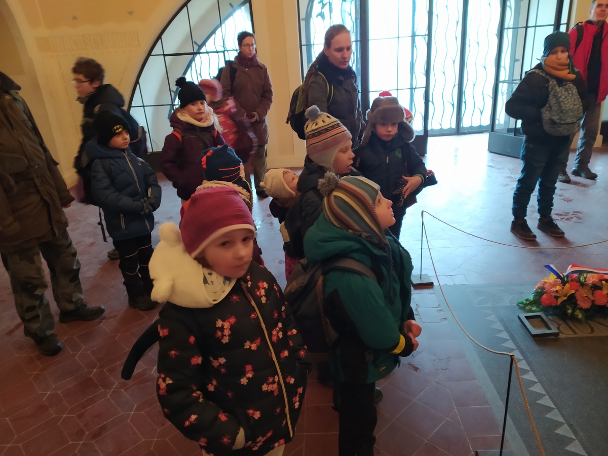 Na Mohylu Míru jsme došli všichni celý. Tady si nás přebral šikovný průvodce a odvedl nás do místnosti, kde bylo teplo a my si mohli složit kostky a puzzle s obrázky Mohyly Míru a u stolečku čekaly pastelky a obrázky vojáků na vybarvení. Tady jsme si pěkně v teple odpočinuly, nasvačili se a trochu si pohráli. Taky jsme se na mapě podívali, kudy jsme jeli a následně šli. Taky jsme si ukázali, kudy půjdeme dál.