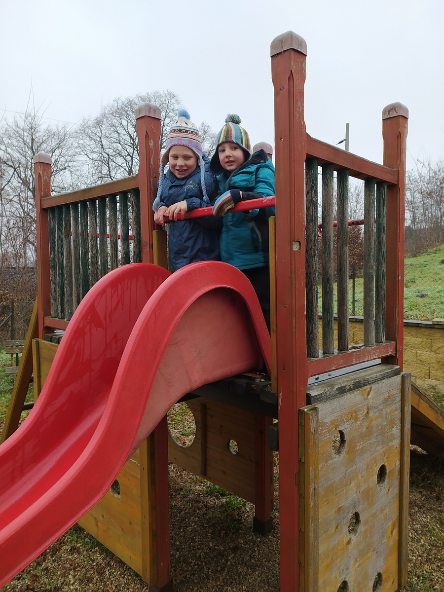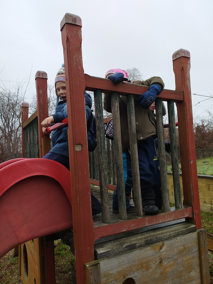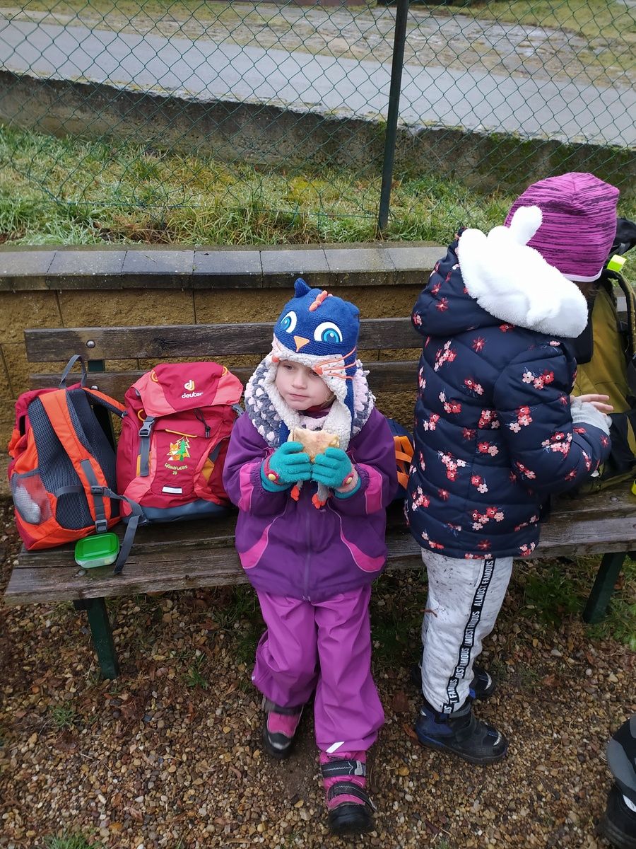 Pak už jsme se vydali na cestu na vlak, V zamrzlém blátě jsme si prohlédli stopu divokého prasete. V Hostěrádkách jsme byli celkem brzo, tak jsme využili místní hřiště. Tady jsme vrátili Zuzanku mamince, protože to měly potom blíž domů než ze Šlapanic. Kdo měl hlad, najedl se, ale hlavně jsme si pohráli.