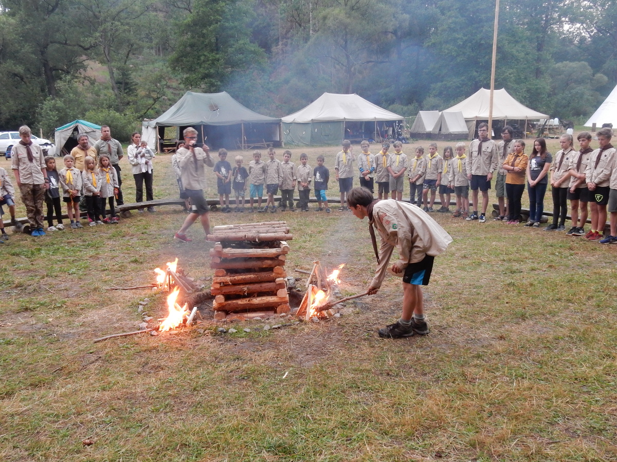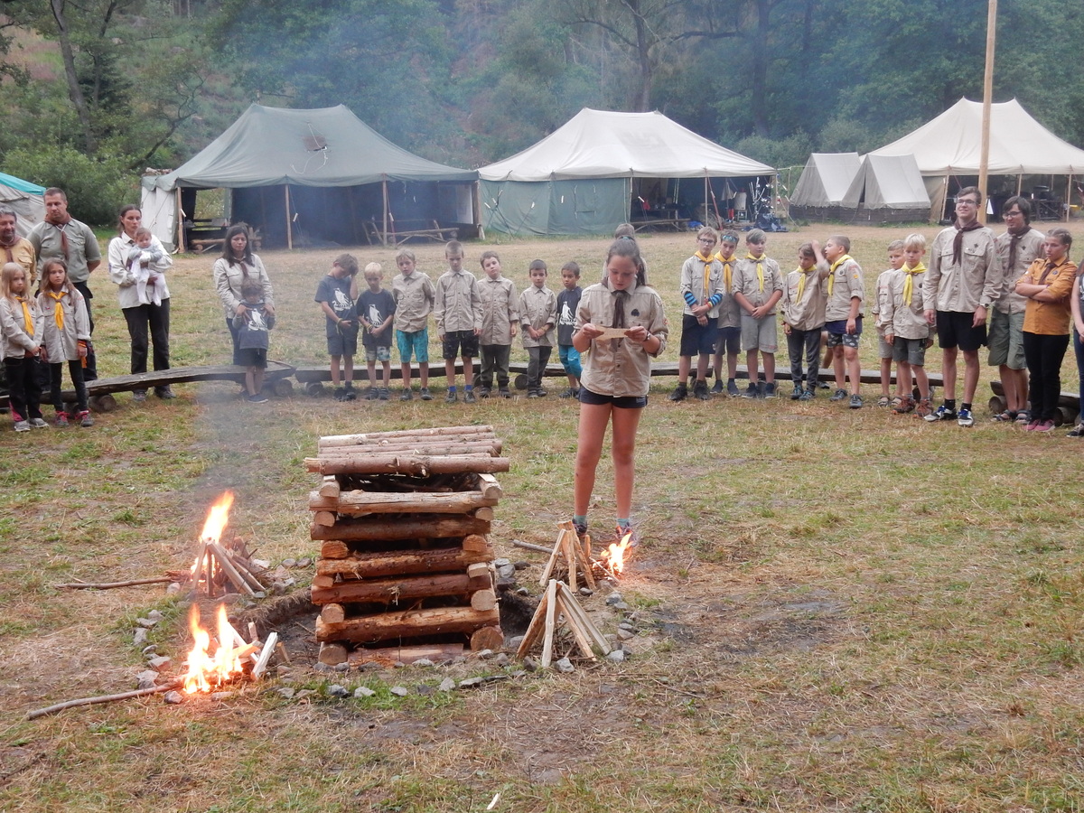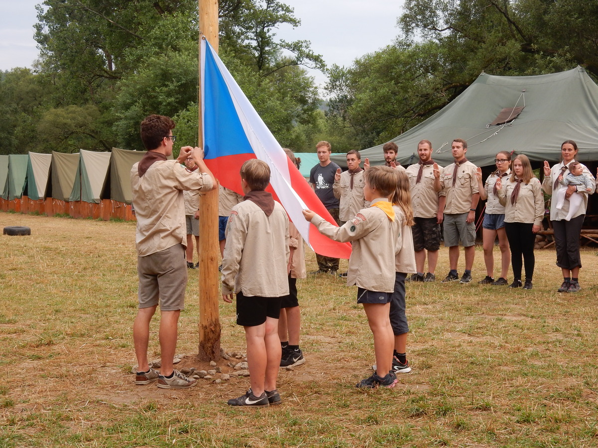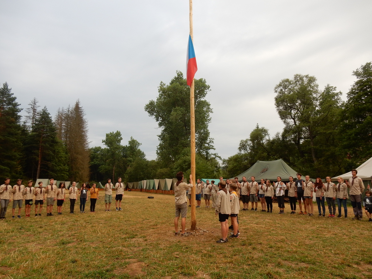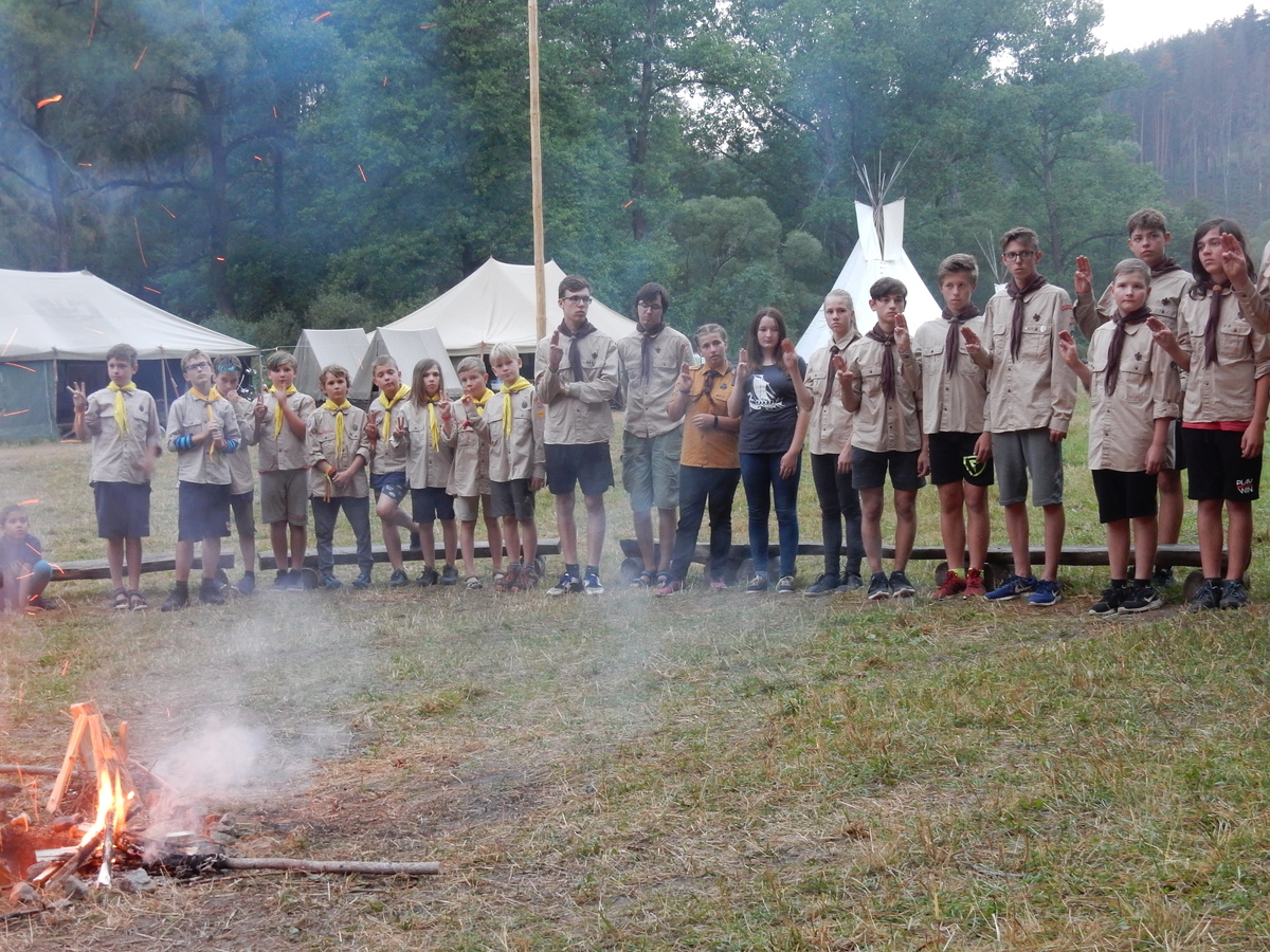 Den programem doslova nabitý. Dopoledne družinky grilují - někdo kýtu, jiný sýr, další třeba hamburgerové maso. Při tom se zpívá a pomalu se bourají týpka. V poledním klidu pak pořádá výprodejovou dražbu Žid, odpoledne se hraje Boj o totem. Při večerním nástupu svěšujeme státní vlajku a u slavnostního ohně skládá slib 12 členů oddílu. Dalších 7 zvládlo těžkou skautskou zkoušku 3 orlí pera a 4 mladší zase 3 bílé tesáky. Taky se hodnotí úklid ve stanech a dlouho do noci zpívá. Poprvé a naposledy není na táboře vyhlášena večerka :-)...