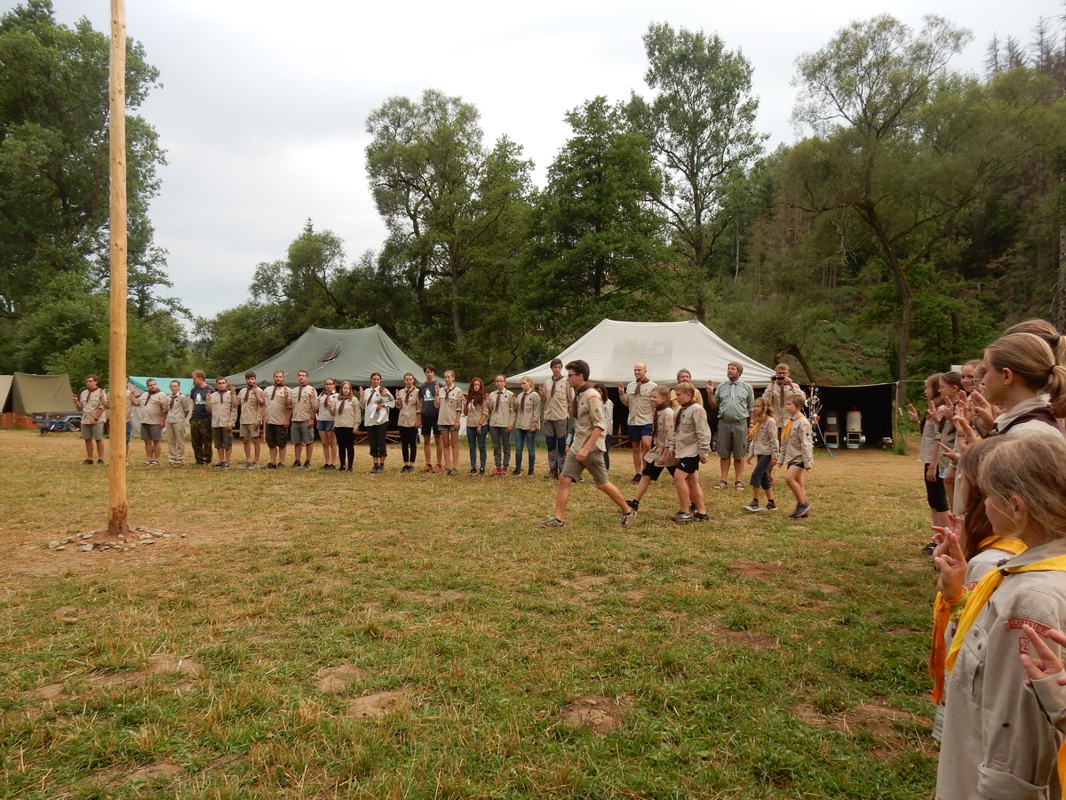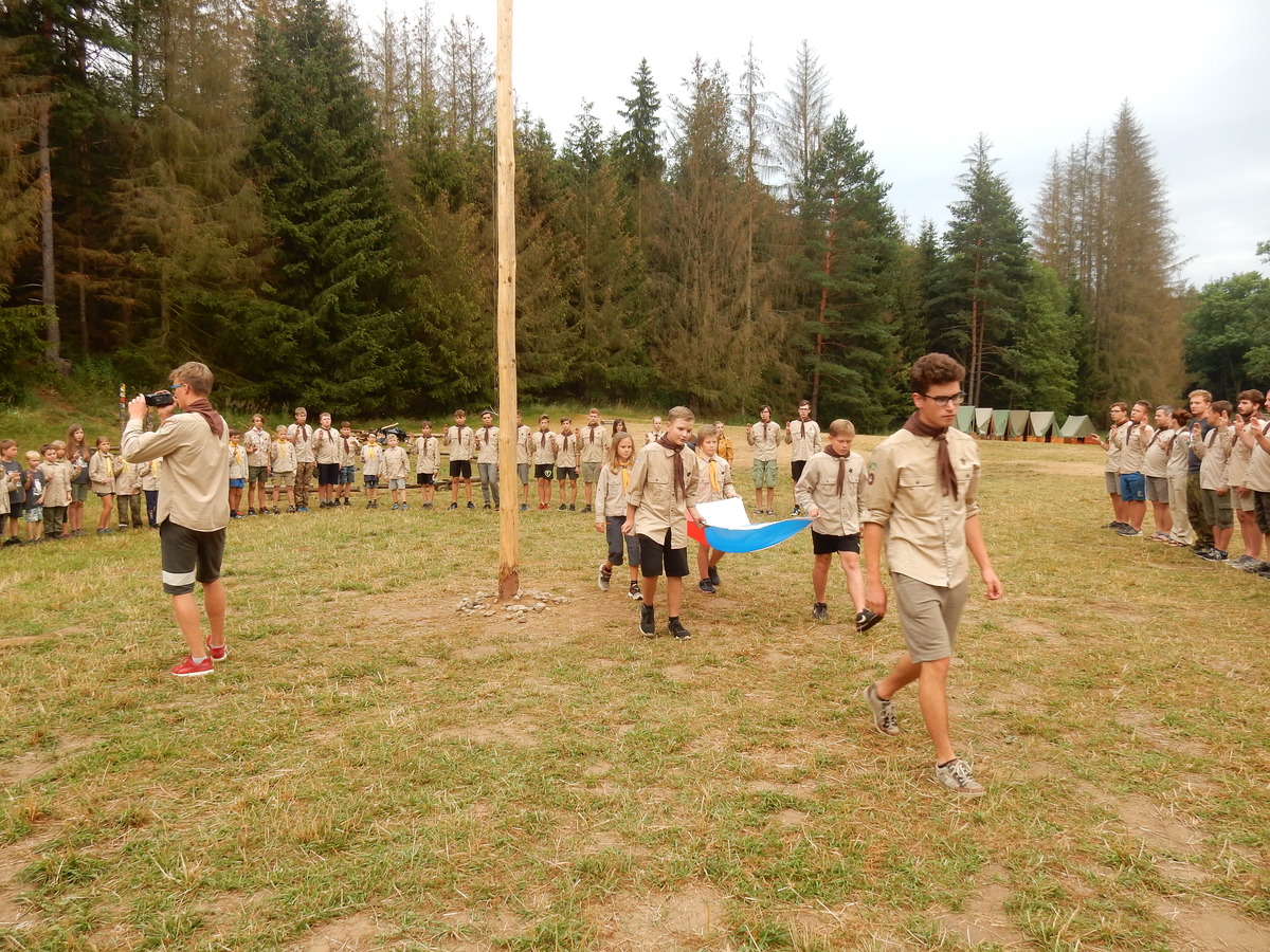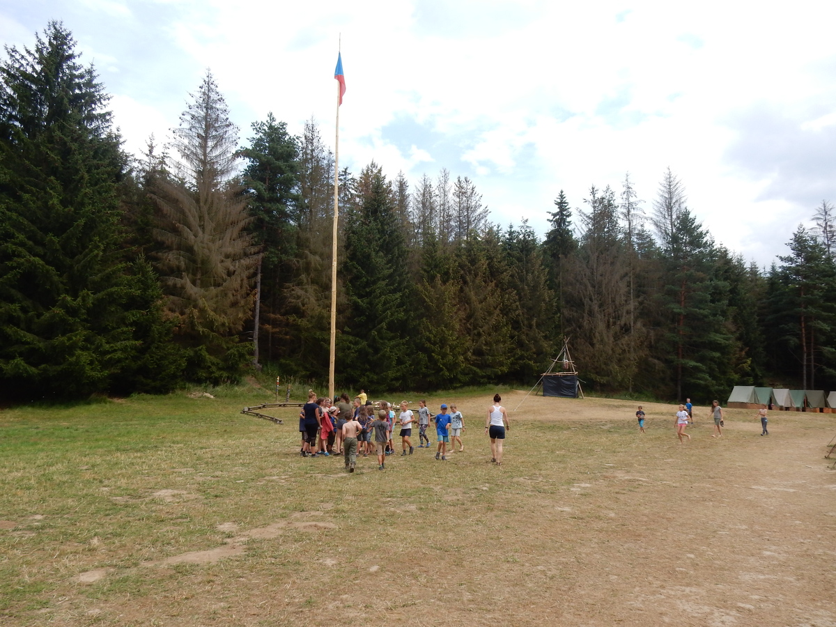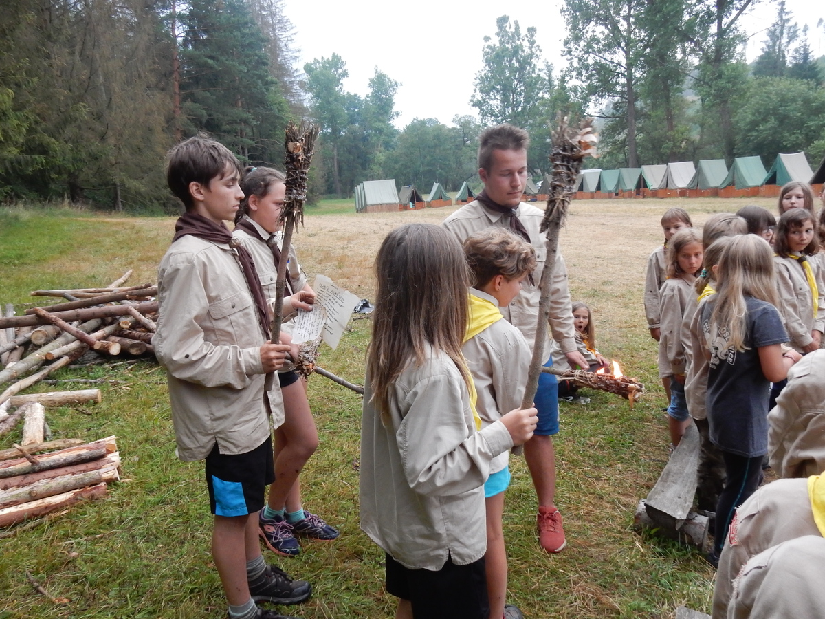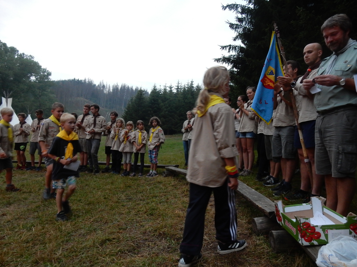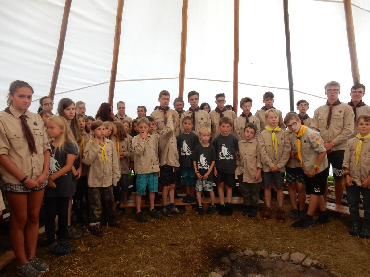 Den programem doslova nabitý. Dopoledne družinky grilují - někdo kýtu, jiný sýr, další třeba hamburgerové maso. Při tom se zpívá a pomalu se bourají týpka. V poledním klidu pak pořádá výprodejovou dražbu Žid, odpoledne se hraje Boj o totem. Při večerním nástupu svěšujeme státní vlajku a u slavnostního ohně skládá slib 12 členů oddílu. Dalších 7 zvládlo těžkou skautskou zkoušku 3 orlí pera a 4 mladší zase 3 bílé tesáky. Taky se hodnotí úklid ve stanech a dlouho do noci zpívá. Poprvé a naposledy není na táboře vyhlášena večerka :-)...