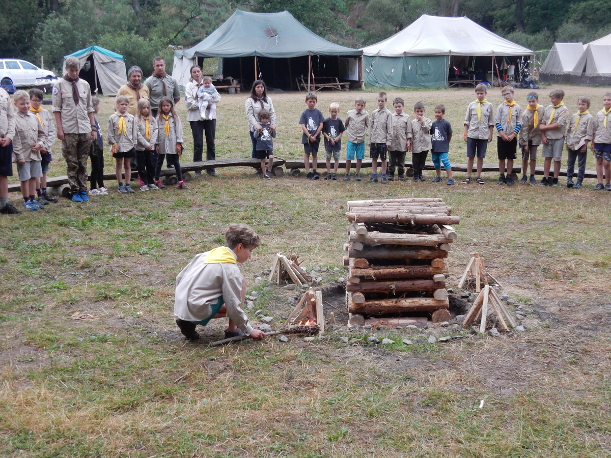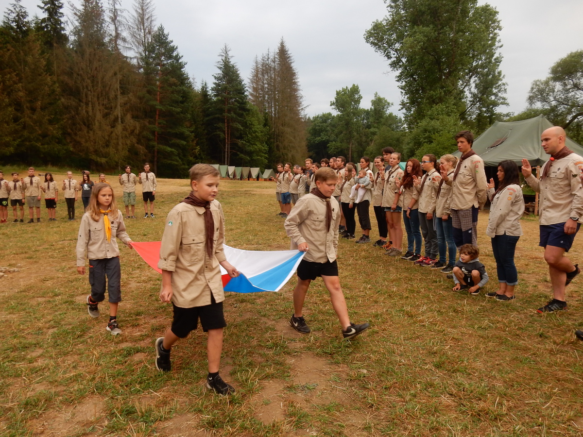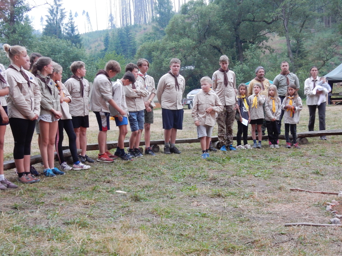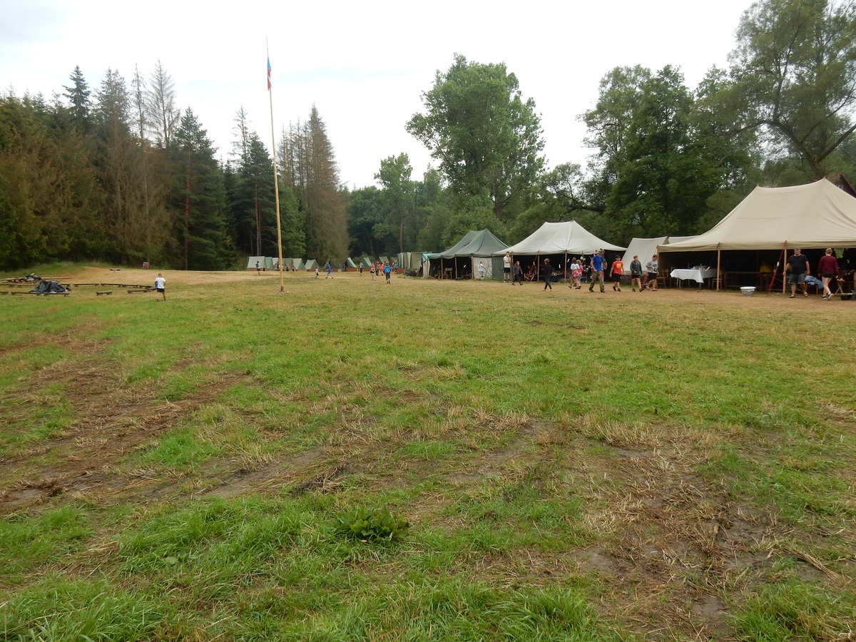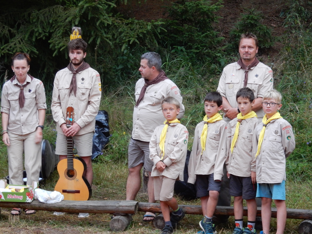 Den programem doslova nabitý. Dopoledne družinky grilují - někdo kýtu, jiný sýr, další třeba hamburgerové maso. Při tom se zpívá a pomalu se bourají týpka. V poledním klidu pak pořádá výprodejovou dražbu Žid, odpoledne se hraje Boj o totem. Při večerním nástupu svěšujeme státní vlajku a u slavnostního ohně skládá slib 12 členů oddílu. Dalších 7 zvládlo těžkou skautskou zkoušku 3 orlí pera a 4 mladší zase 3 bílé tesáky. Taky se hodnotí úklid ve stanech a dlouho do noci zpívá. Poprvé a naposledy není na táboře vyhlášena večerka :-)...