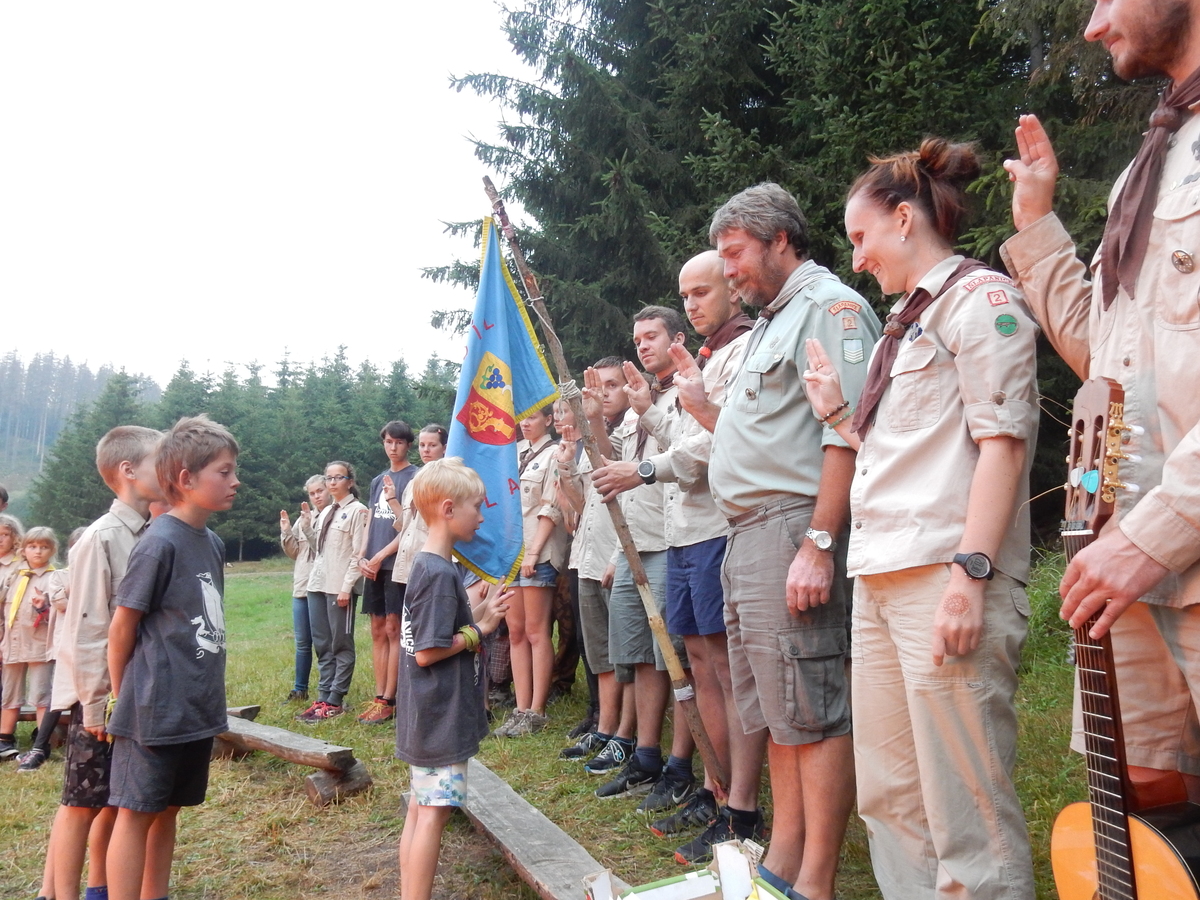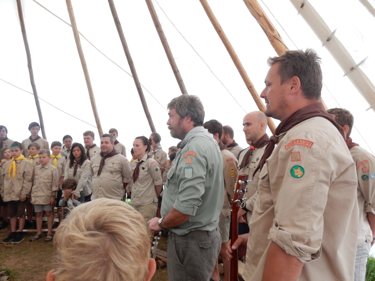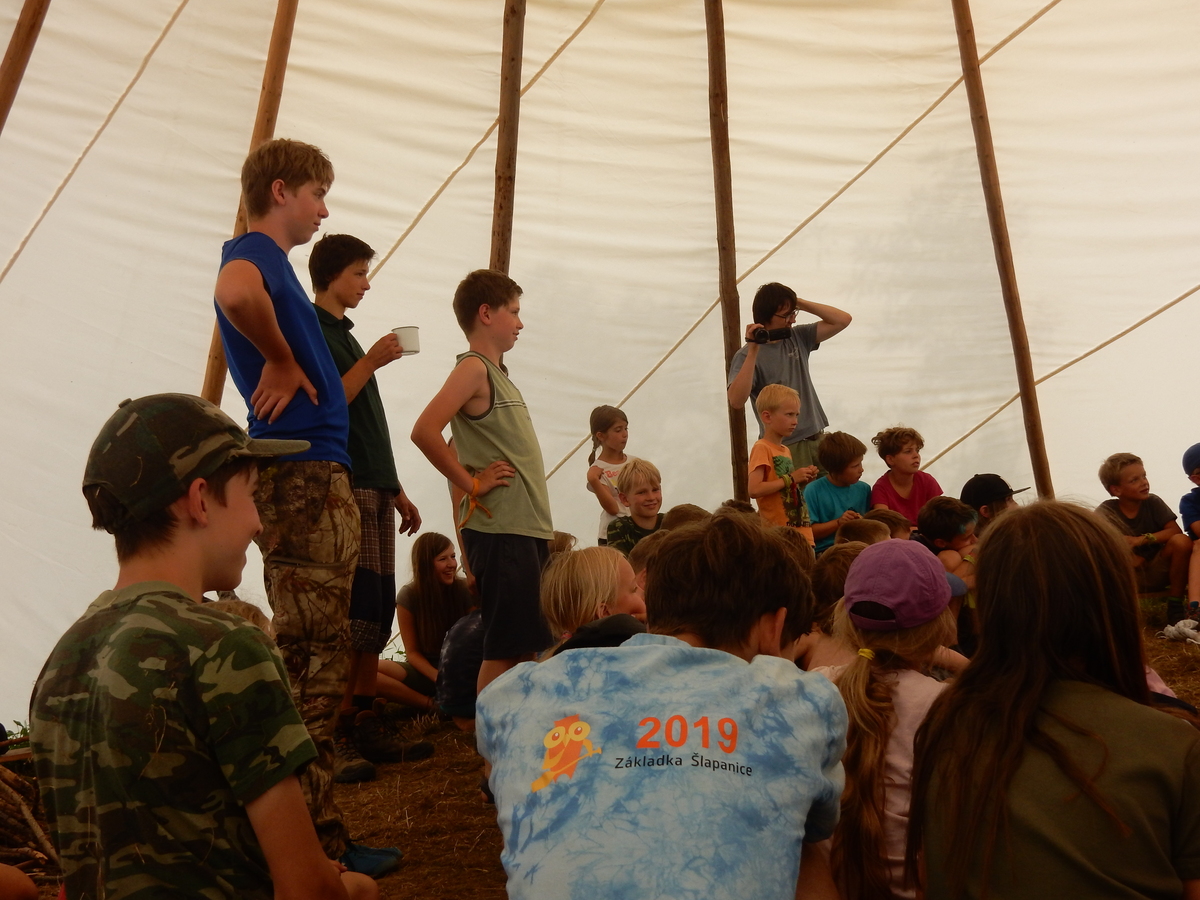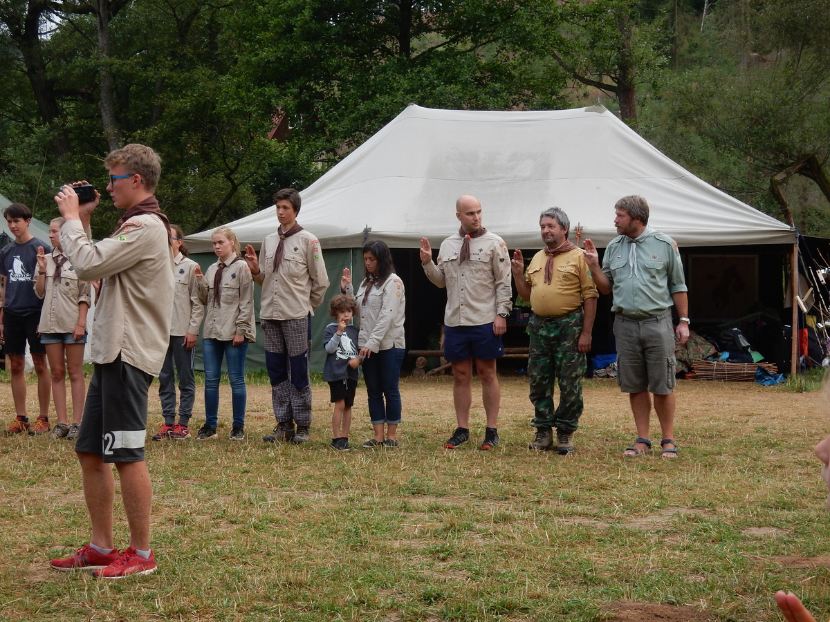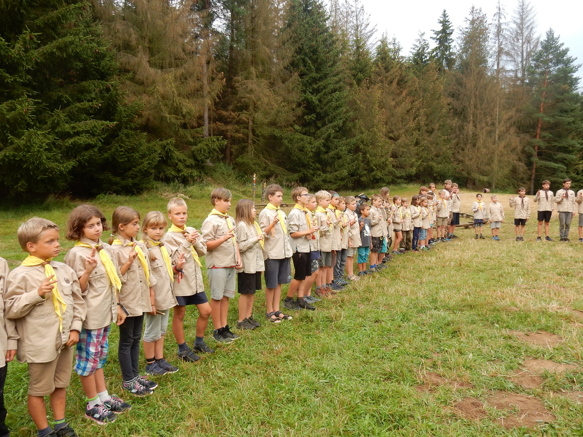 Den programem doslova nabitý. Dopoledne družinky grilují - někdo kýtu, jiný sýr, další třeba hamburgerové maso. Při tom se zpívá a pomalu se bourají týpka. V poledním klidu pak pořádá výprodejovou dražbu Žid, odpoledne se hraje Boj o totem. Při večerním nástupu svěšujeme státní vlajku a u slavnostního ohně skládá slib 12 členů oddílu. Dalších 7 zvládlo těžkou skautskou zkoušku 3 orlí pera a 4 mladší zase 3 bílé tesáky. Taky se hodnotí úklid ve stanech a dlouho do noci zpívá. Poprvé a naposledy není na táboře vyhlášena večerka :-)...