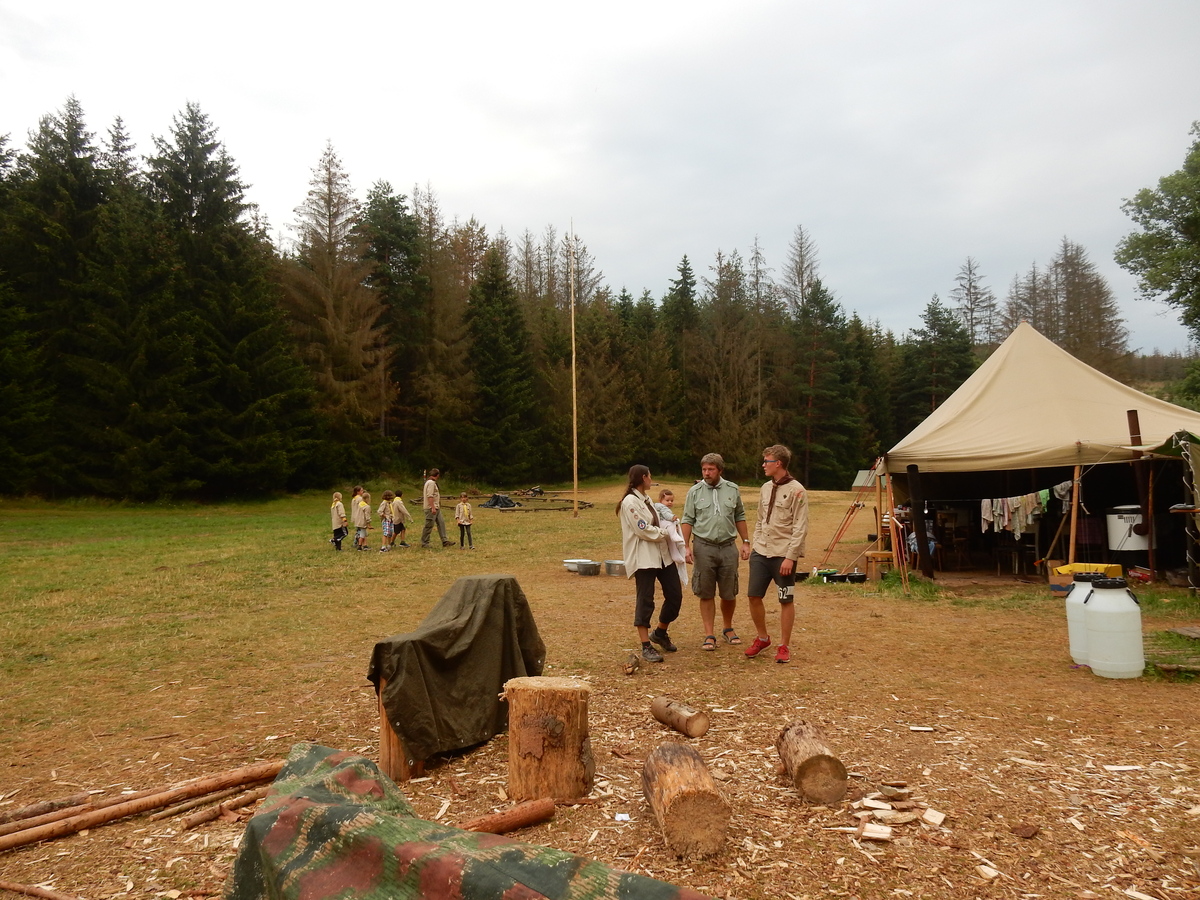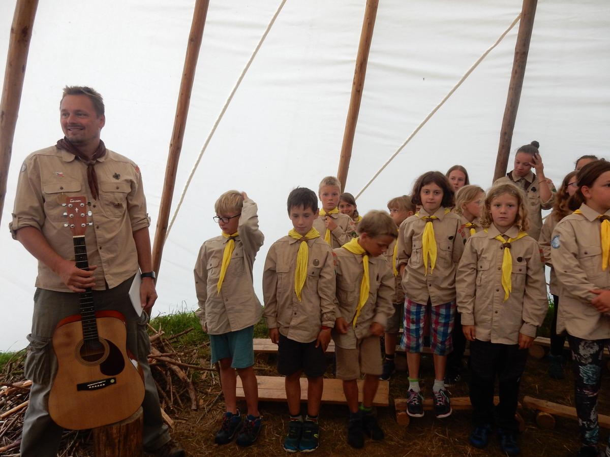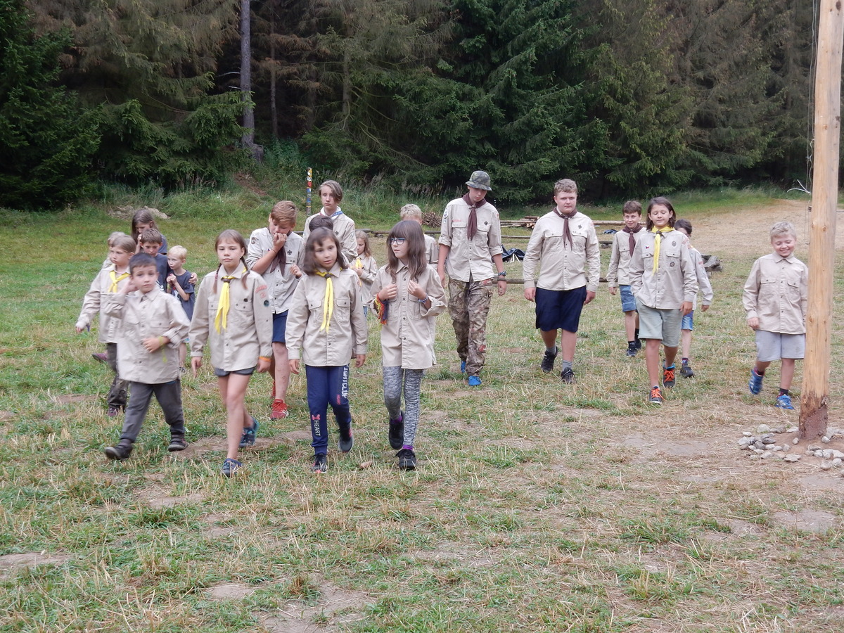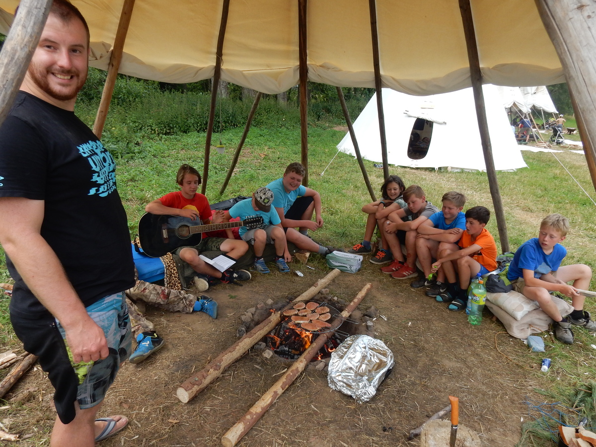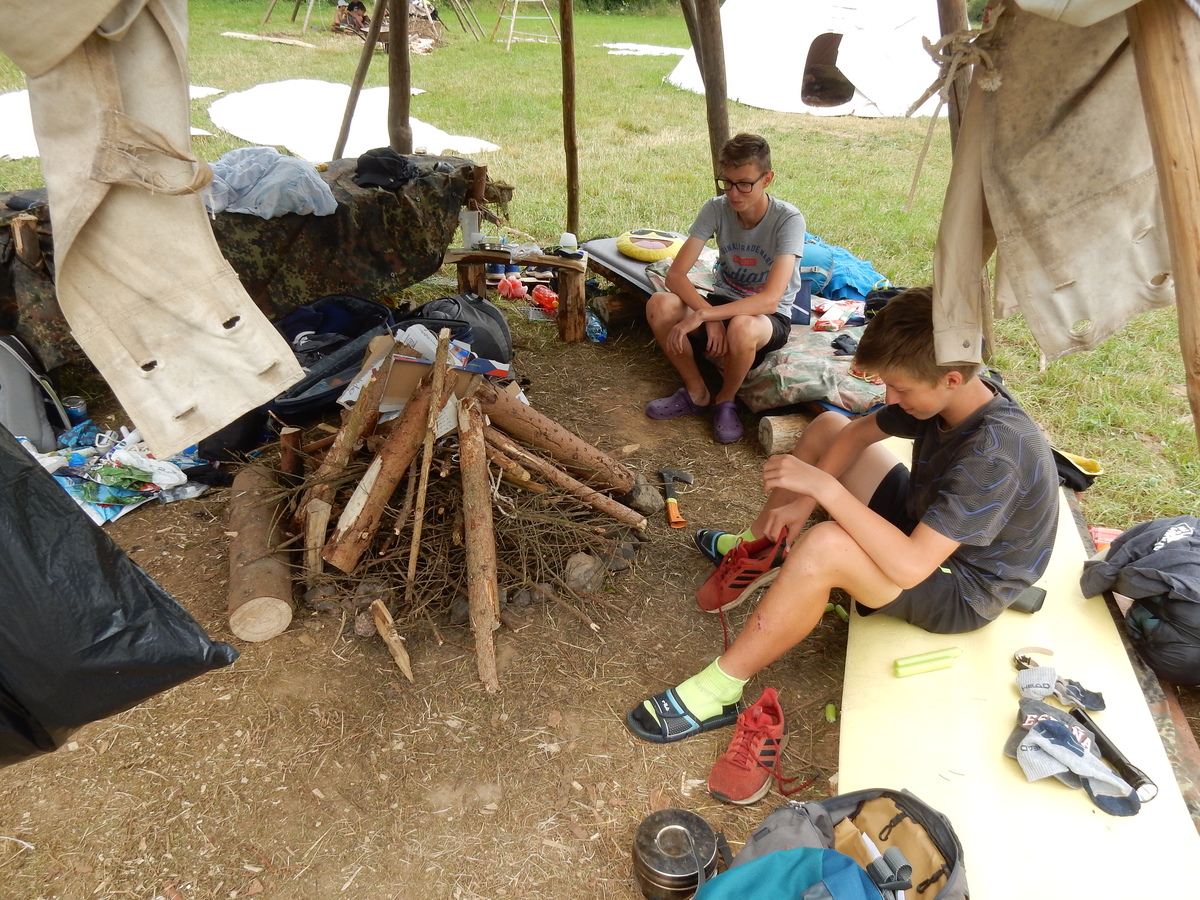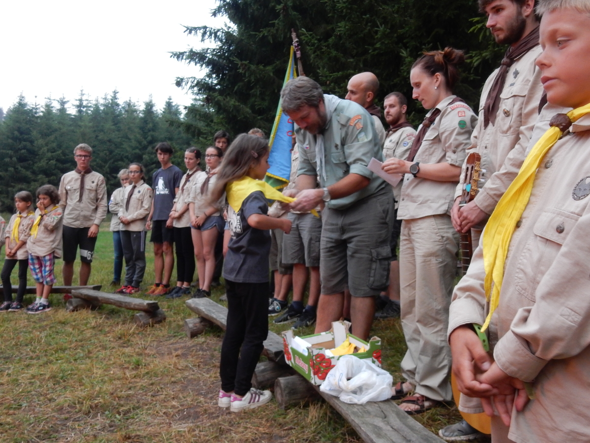 Den programem doslova nabitý. Dopoledne družinky grilují - někdo kýtu, jiný sýr, další třeba hamburgerové maso. Při tom se zpívá a pomalu se bourají týpka. V poledním klidu pak pořádá výprodejovou dražbu Žid, odpoledne se hraje Boj o totem. Při večerním nástupu svěšujeme státní vlajku a u slavnostního ohně skládá slib 12 členů oddílu. Dalších 7 zvládlo těžkou skautskou zkoušku 3 orlí pera a 4 mladší zase 3 bílé tesáky. Taky se hodnotí úklid ve stanech a dlouho do noci zpívá. Poprvé a naposledy není na táboře vyhlášena večerka :-)...