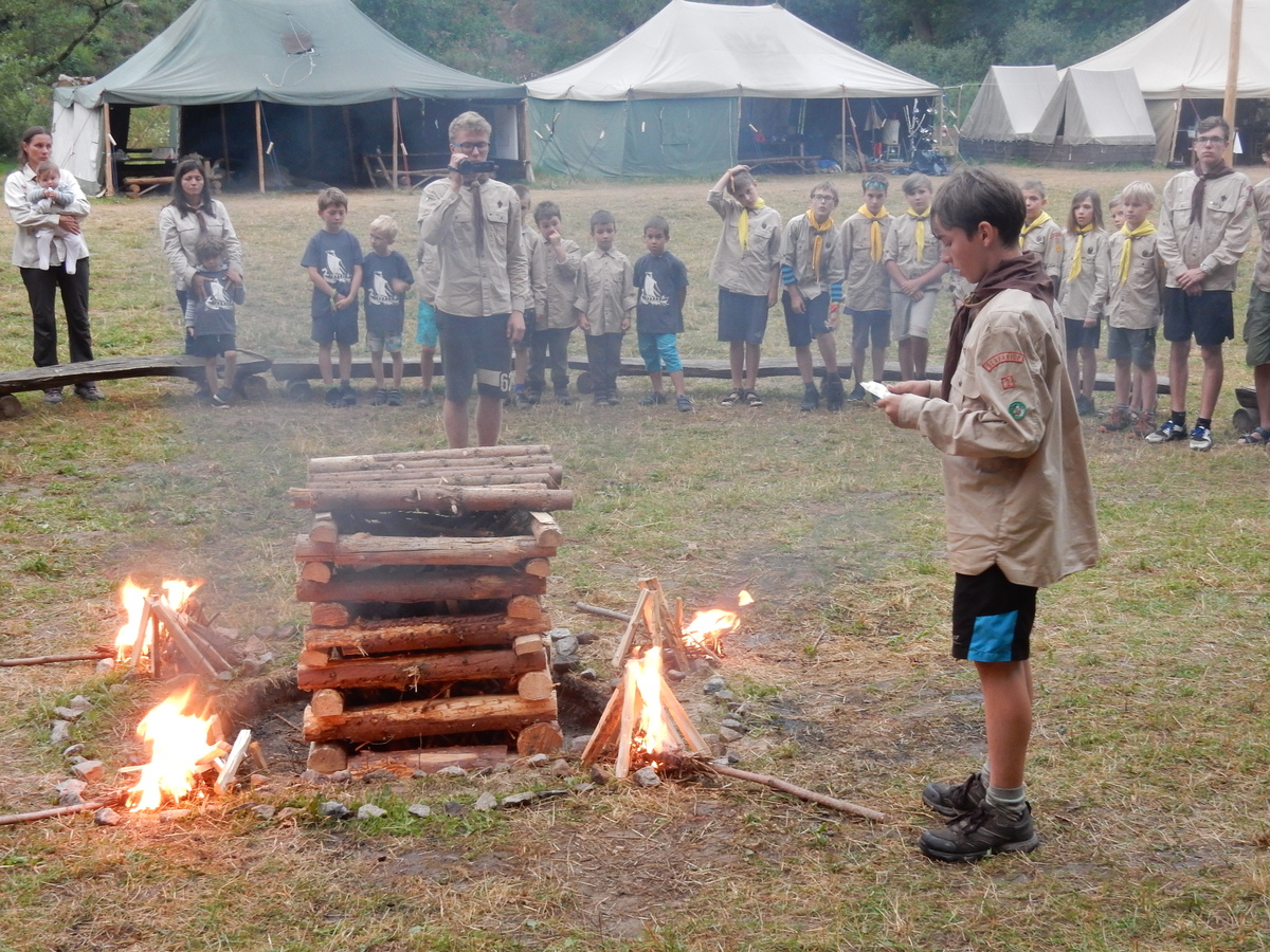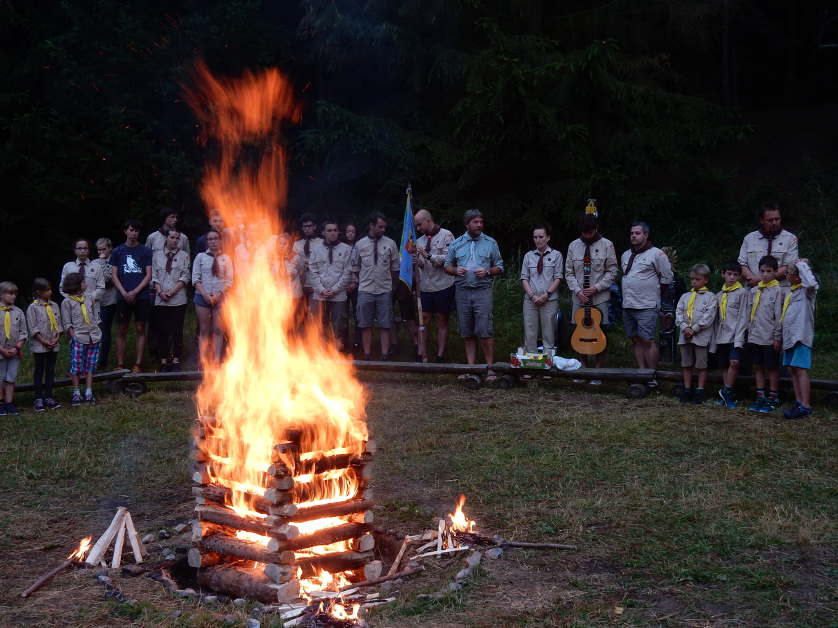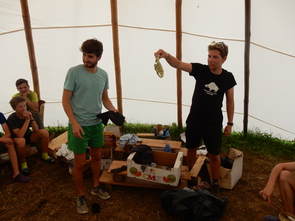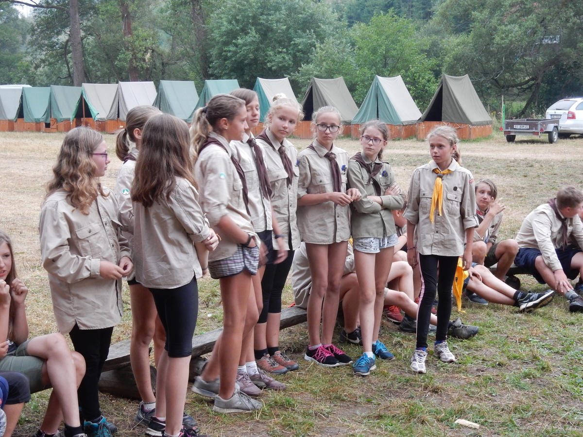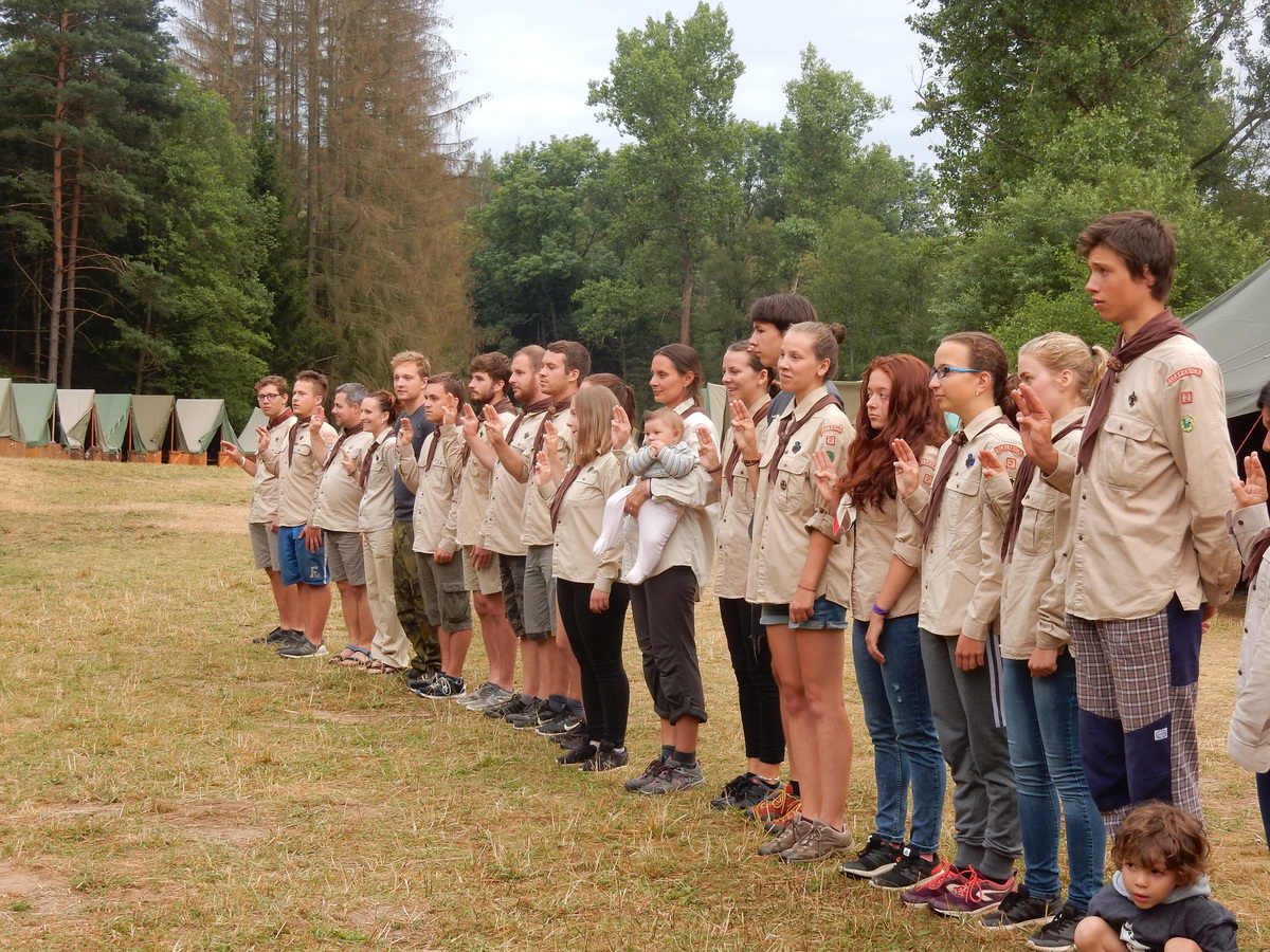 Den programem doslova nabitý. Dopoledne družinky grilují - někdo kýtu, jiný sýr, další třeba hamburgerové maso. Při tom se zpívá a pomalu se bourají týpka. V poledním klidu pak pořádá výprodejovou dražbu Žid, odpoledne se hraje Boj o totem. Při večerním nástupu svěšujeme státní vlajku a u slavnostního ohně skládá slib 12 členů oddílu. Dalších 7 zvládlo těžkou skautskou zkoušku 3 orlí pera a 4 mladší zase 3 bílé tesáky. Taky se hodnotí úklid ve stanech a dlouho do noci zpívá. Poprvé a naposledy není na táboře vyhlášena večerka :-)...